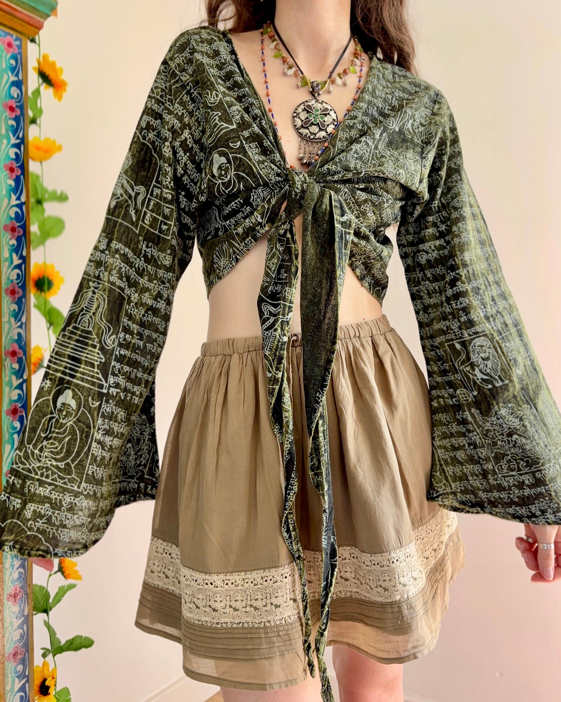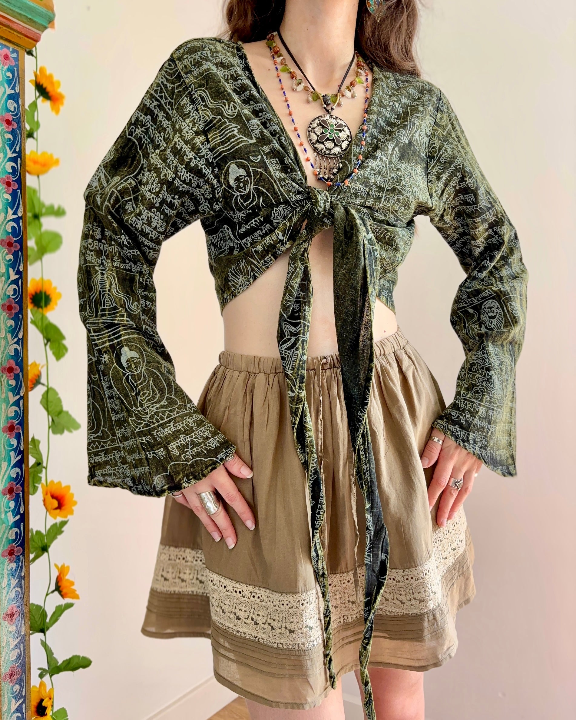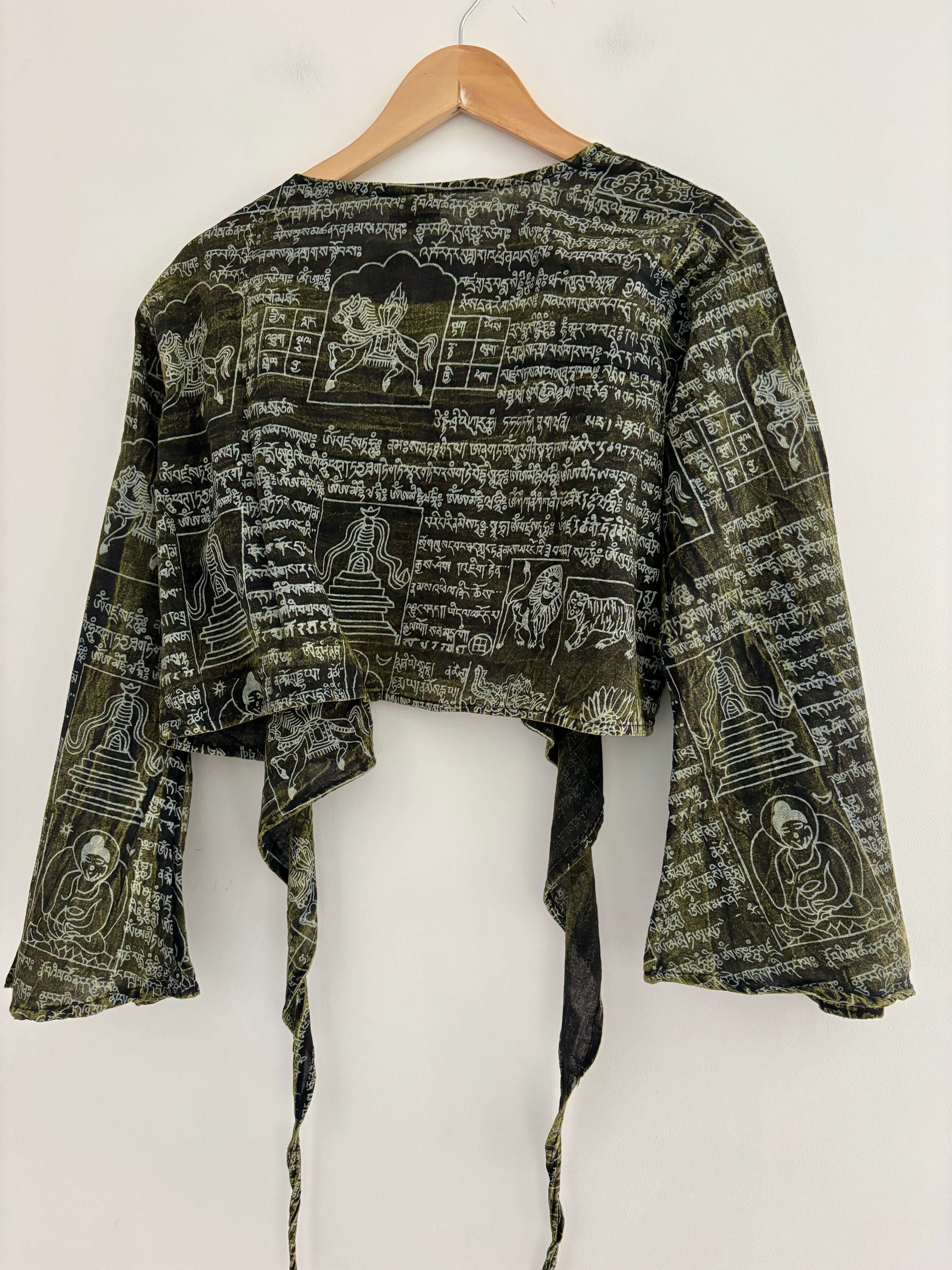 These beautiful tops are made from earthy green fabric decorated in the style of a Nepalese prayer flag. With long sleeves & ties at the front, they can be worn in a variety of ways.