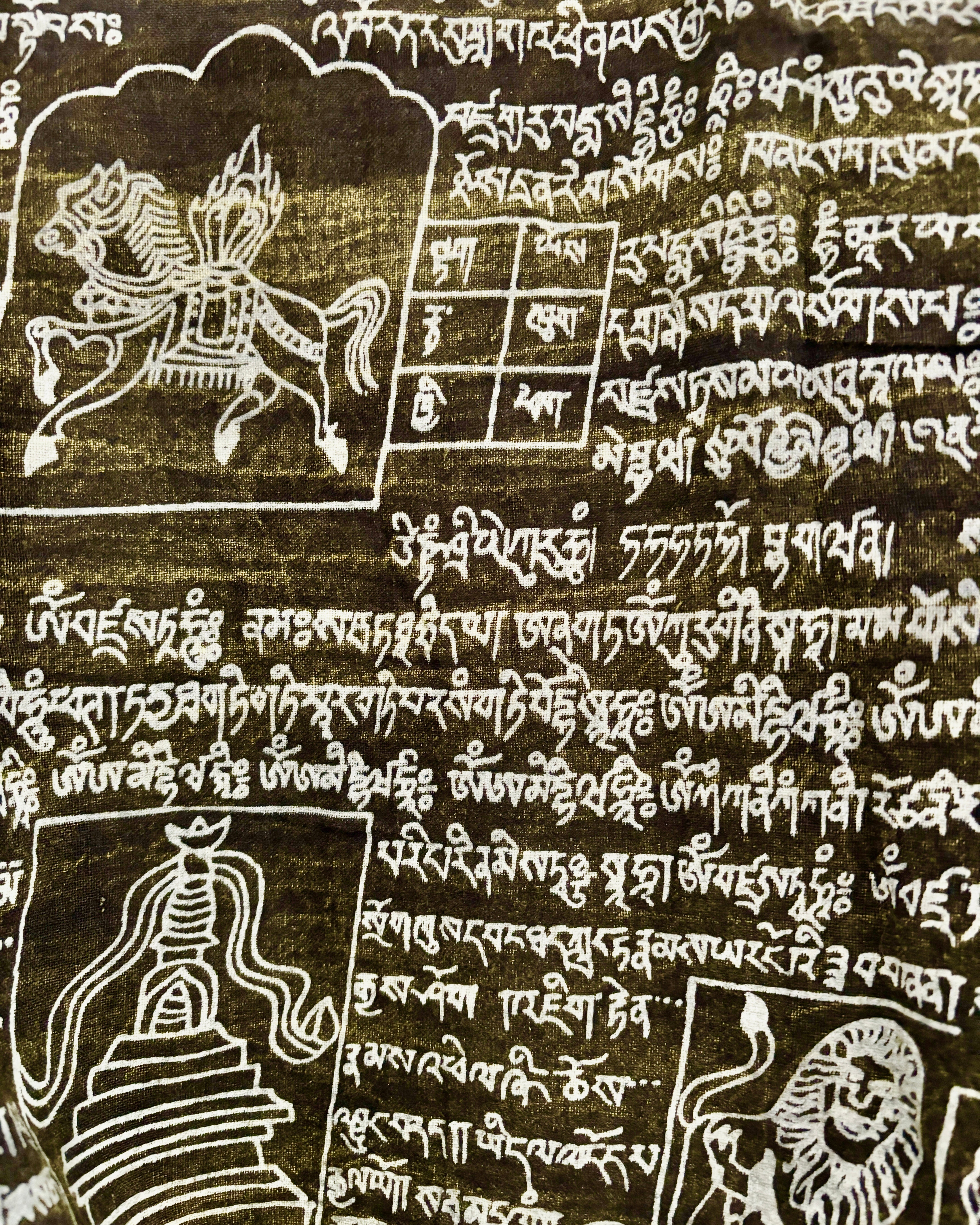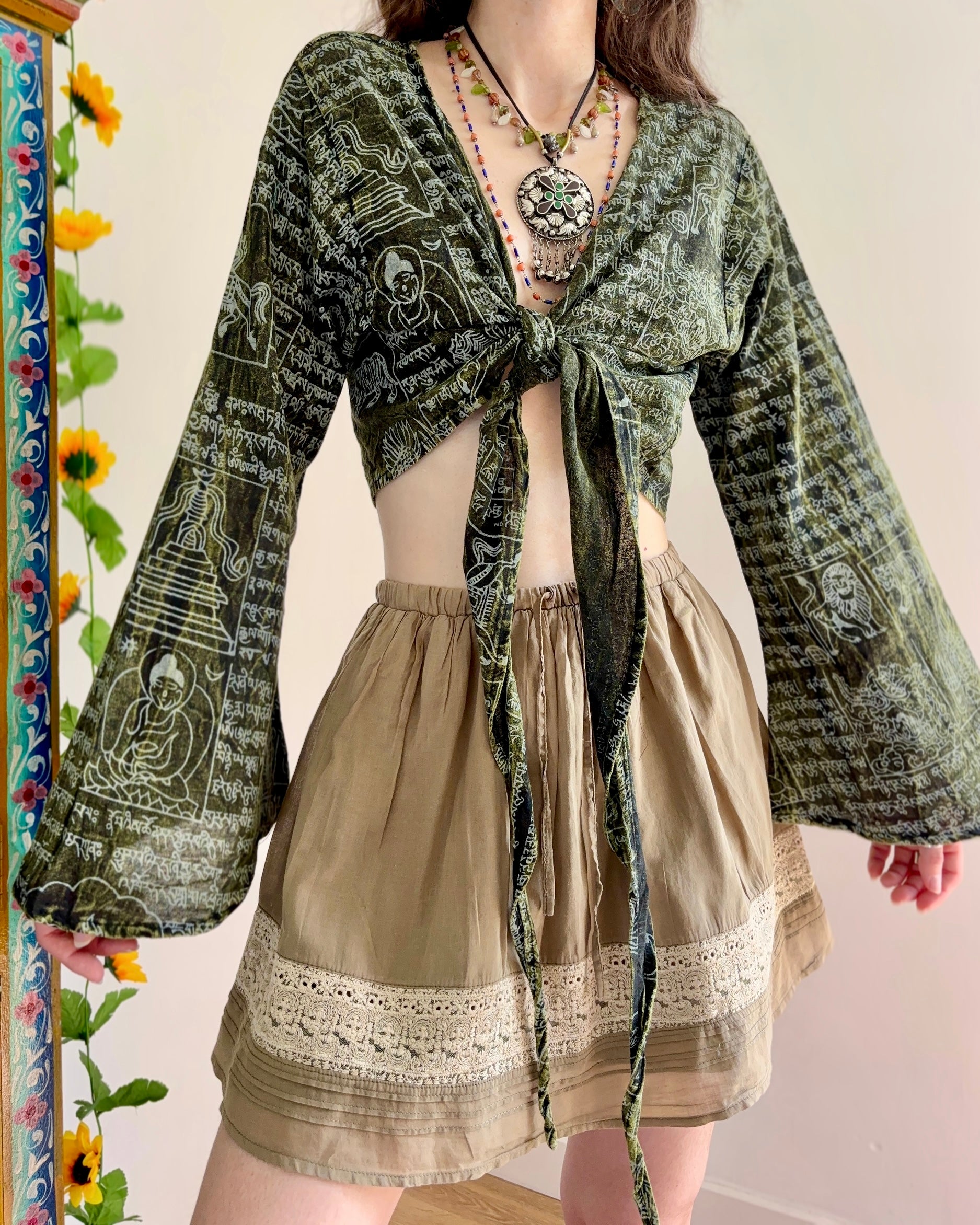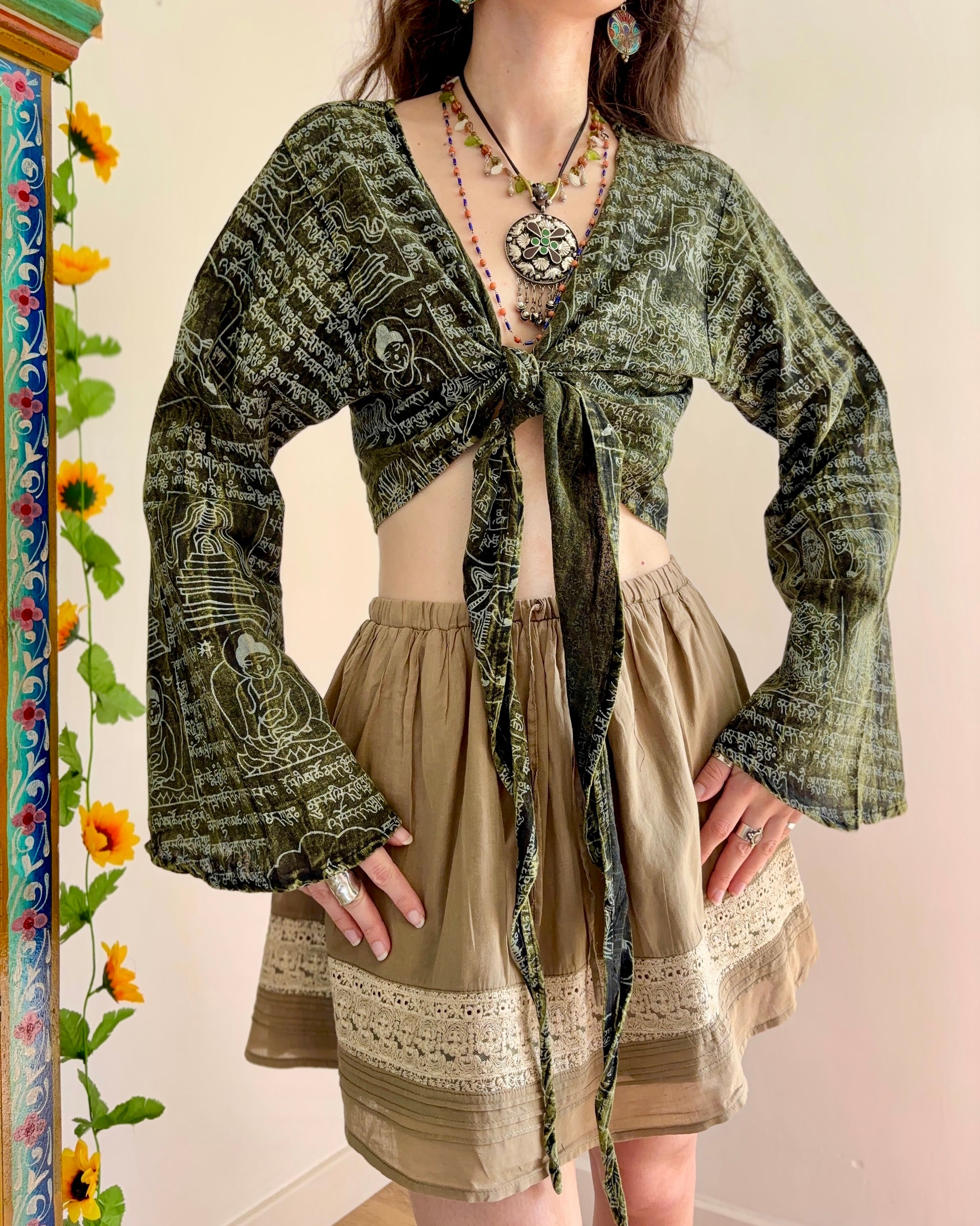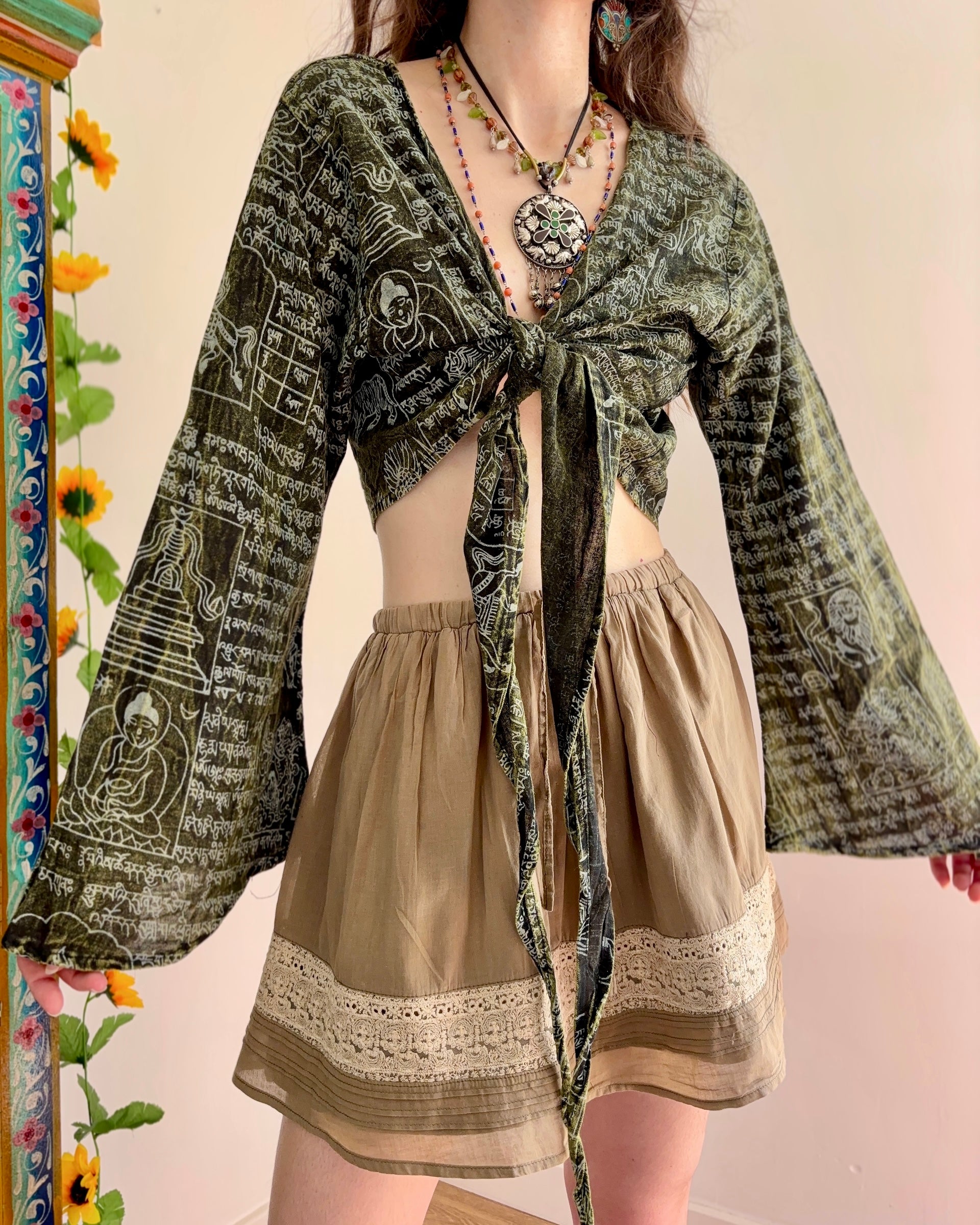 These beautiful tops are made from earthy green fabric decorated in the style of a Nepalese prayer flag. With long sleeves & ties at the front, they can be worn in a variety of ways.