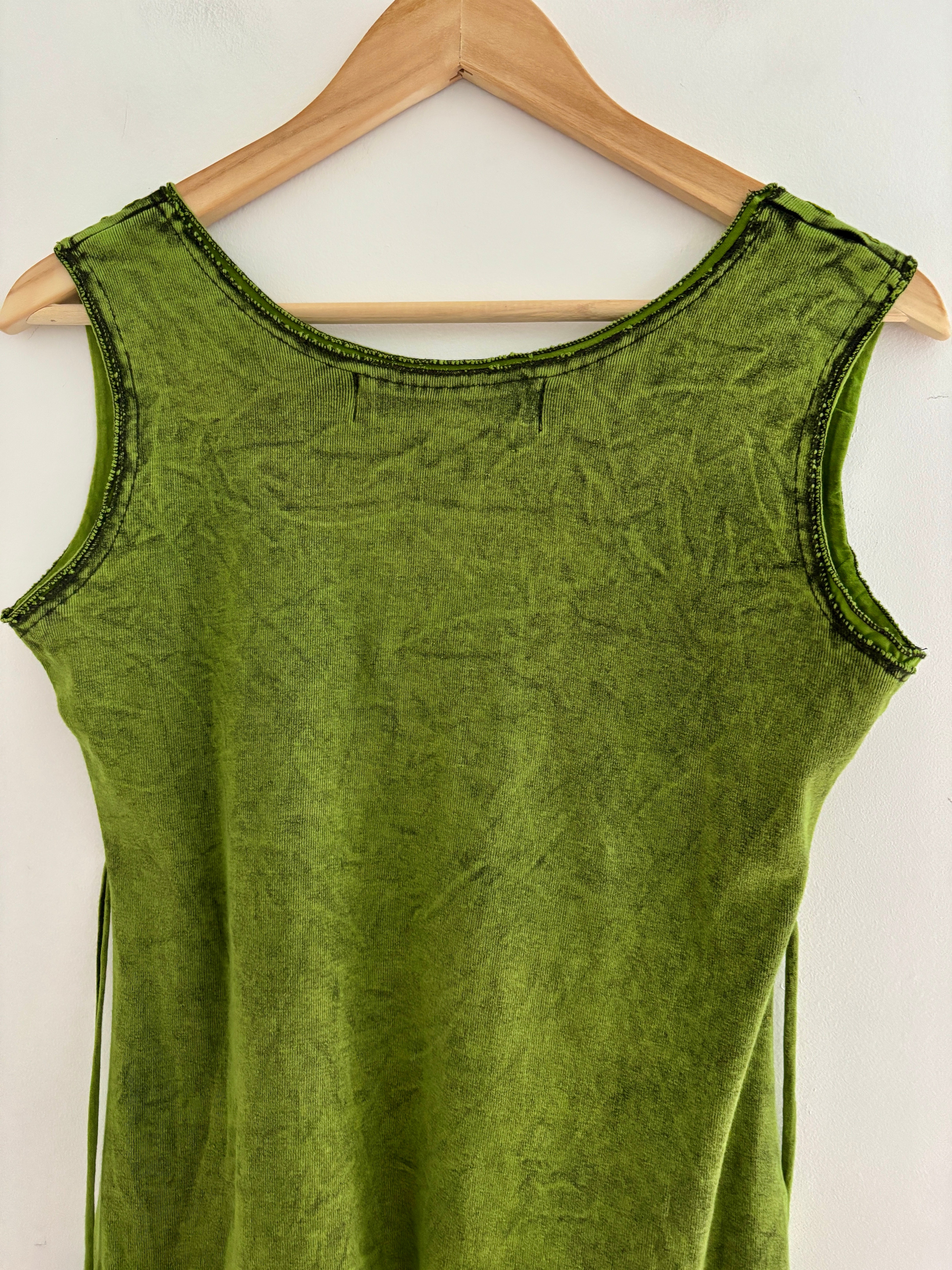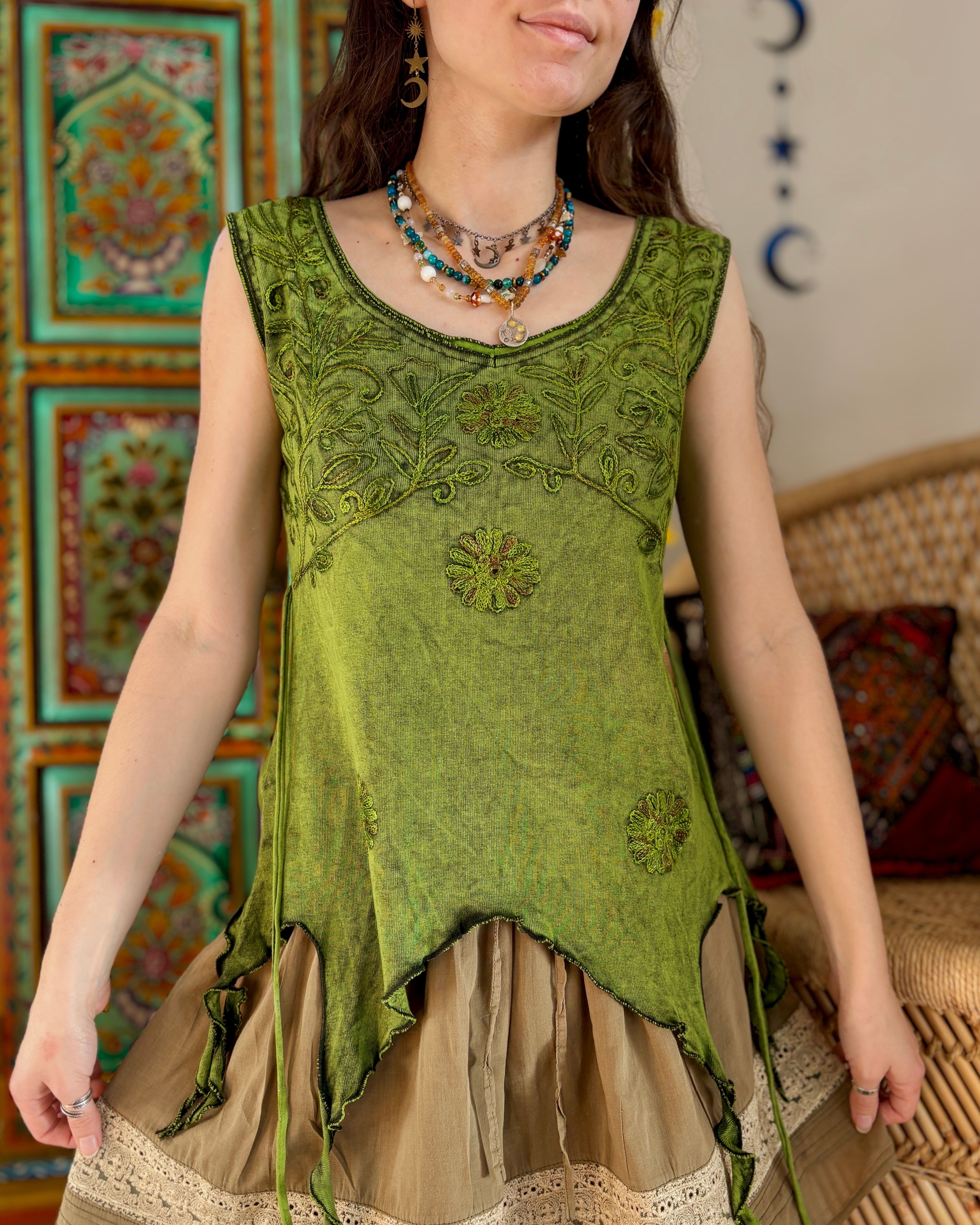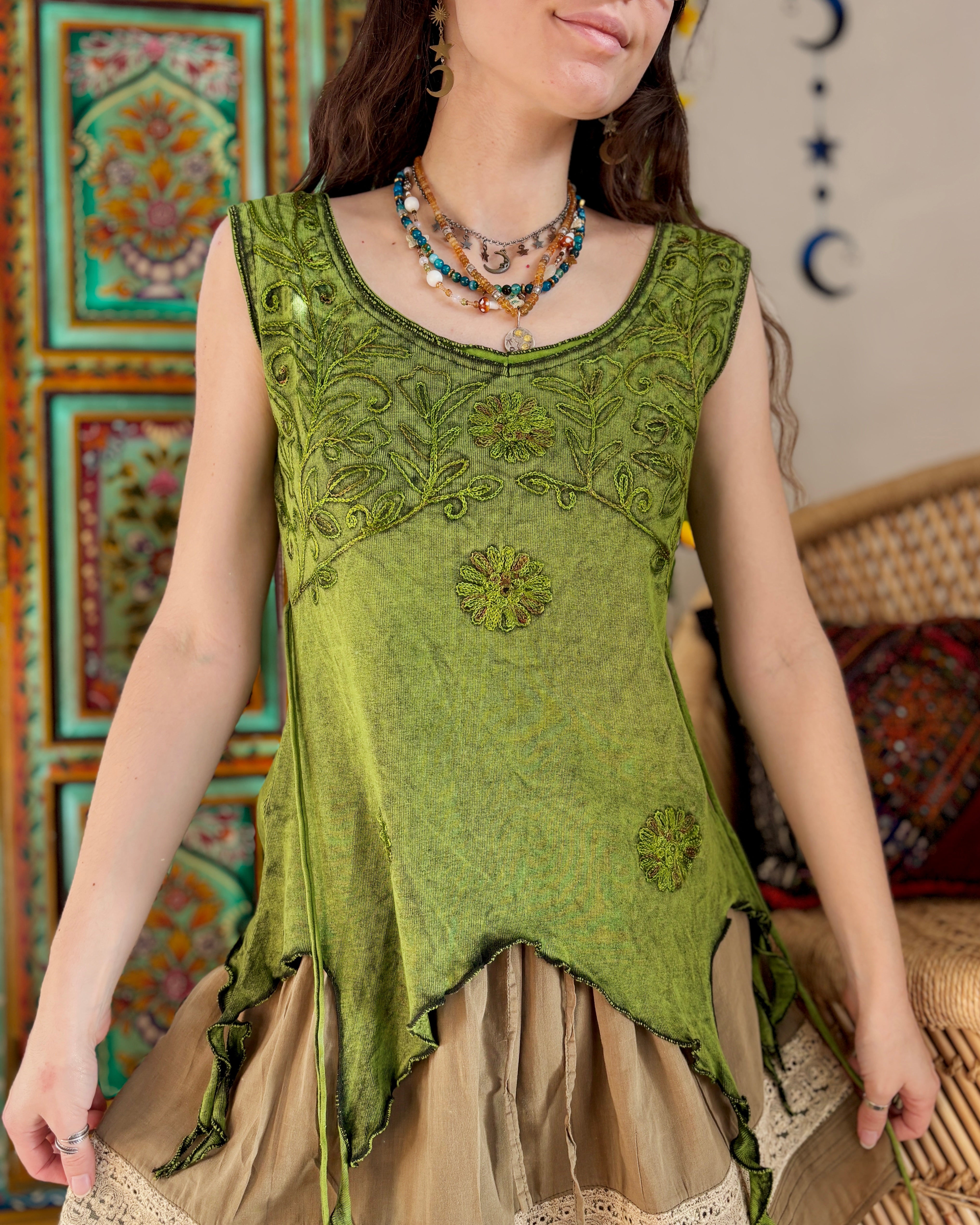 These beautiful sleeveless tops are made from green fabric, featuring embroidery and a pointed bottom to give a whimsical fairy look.