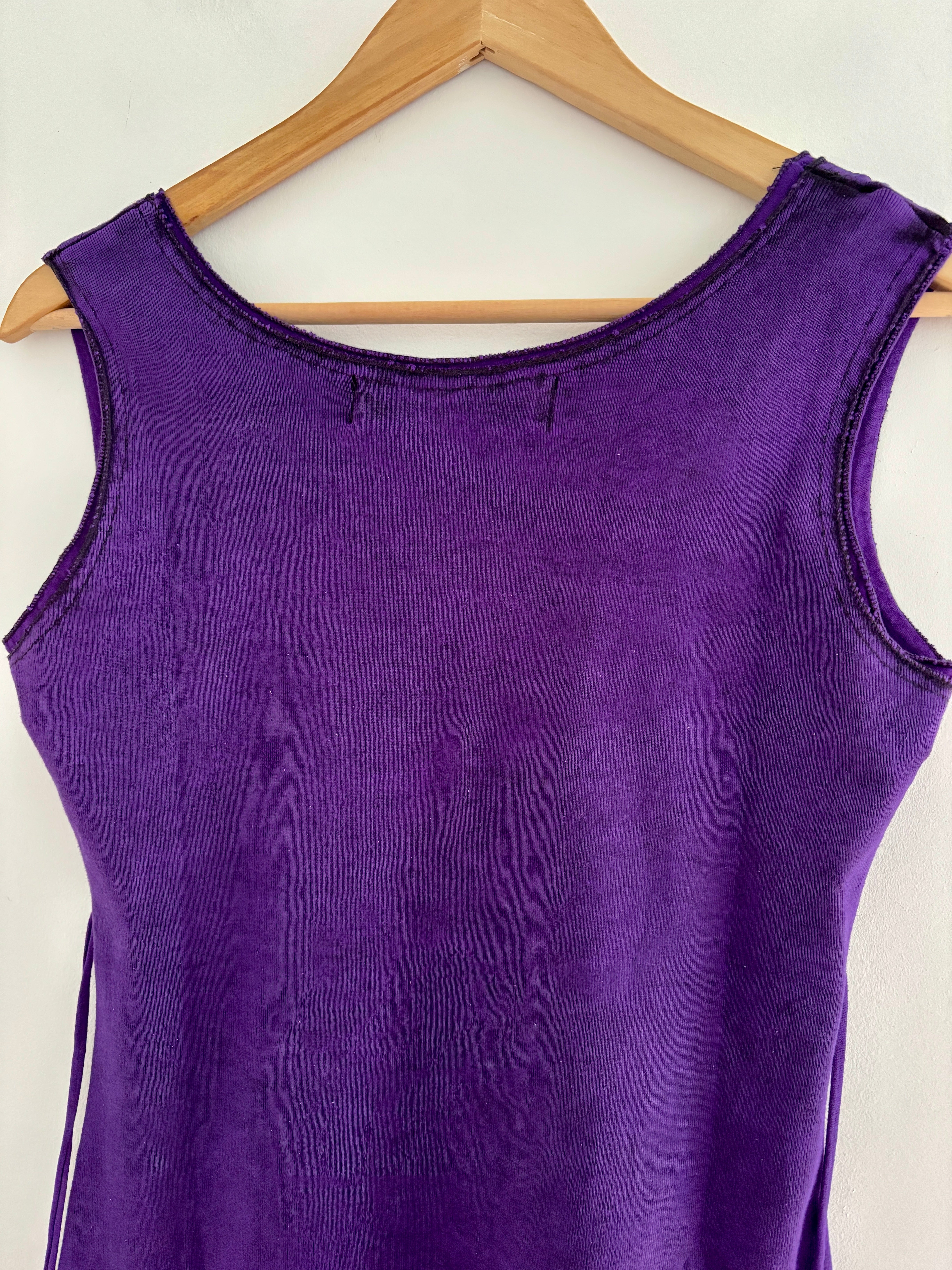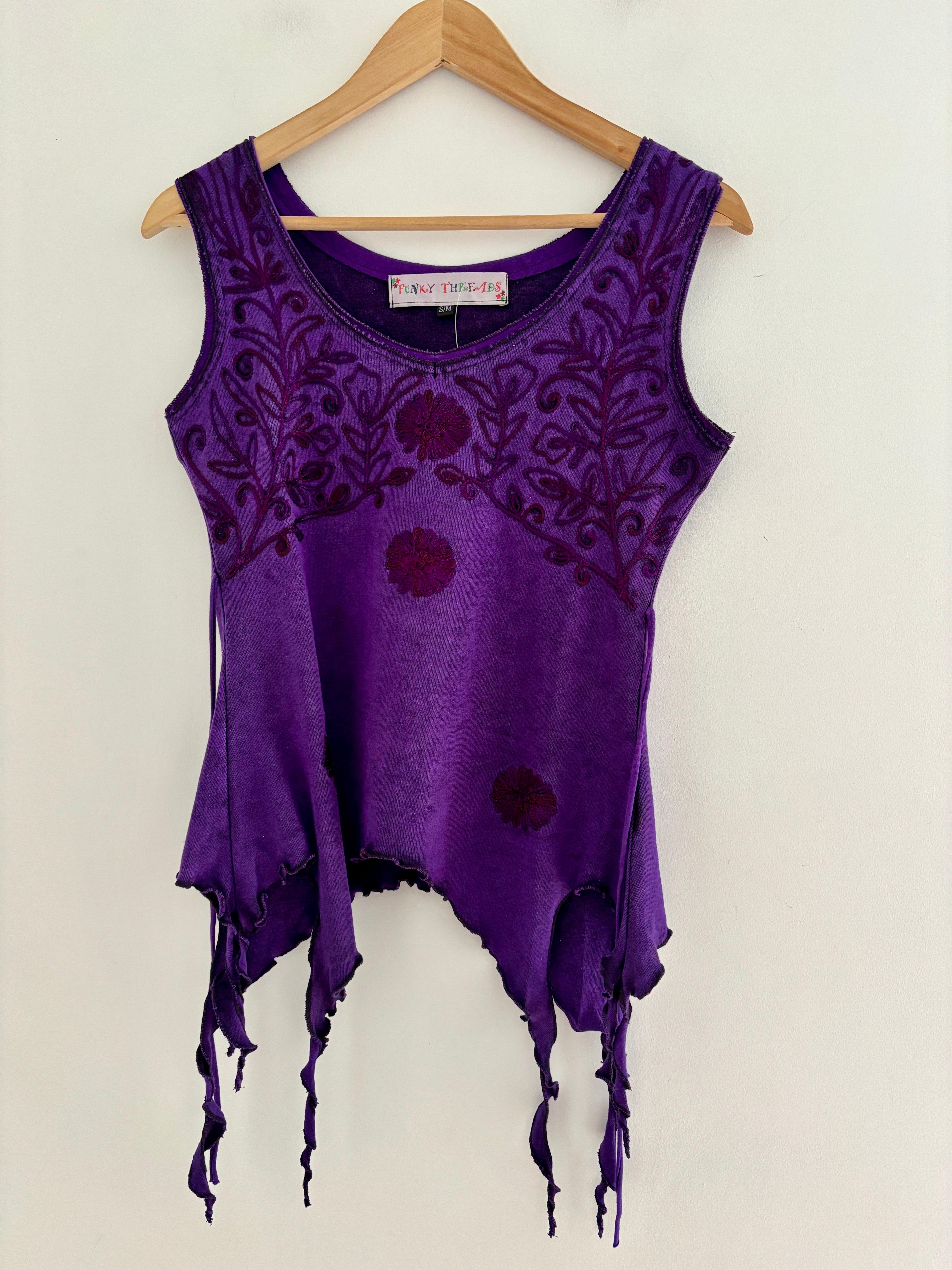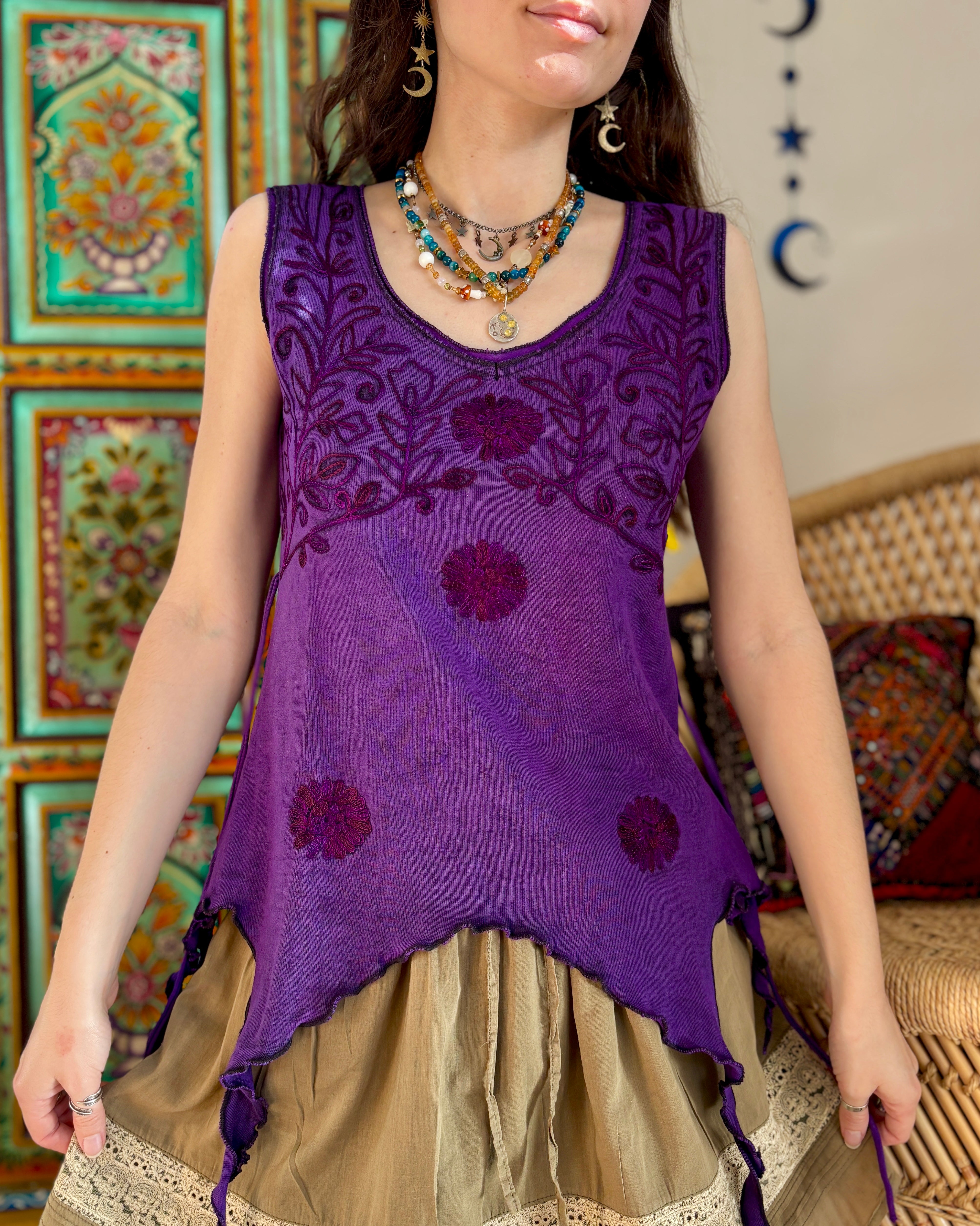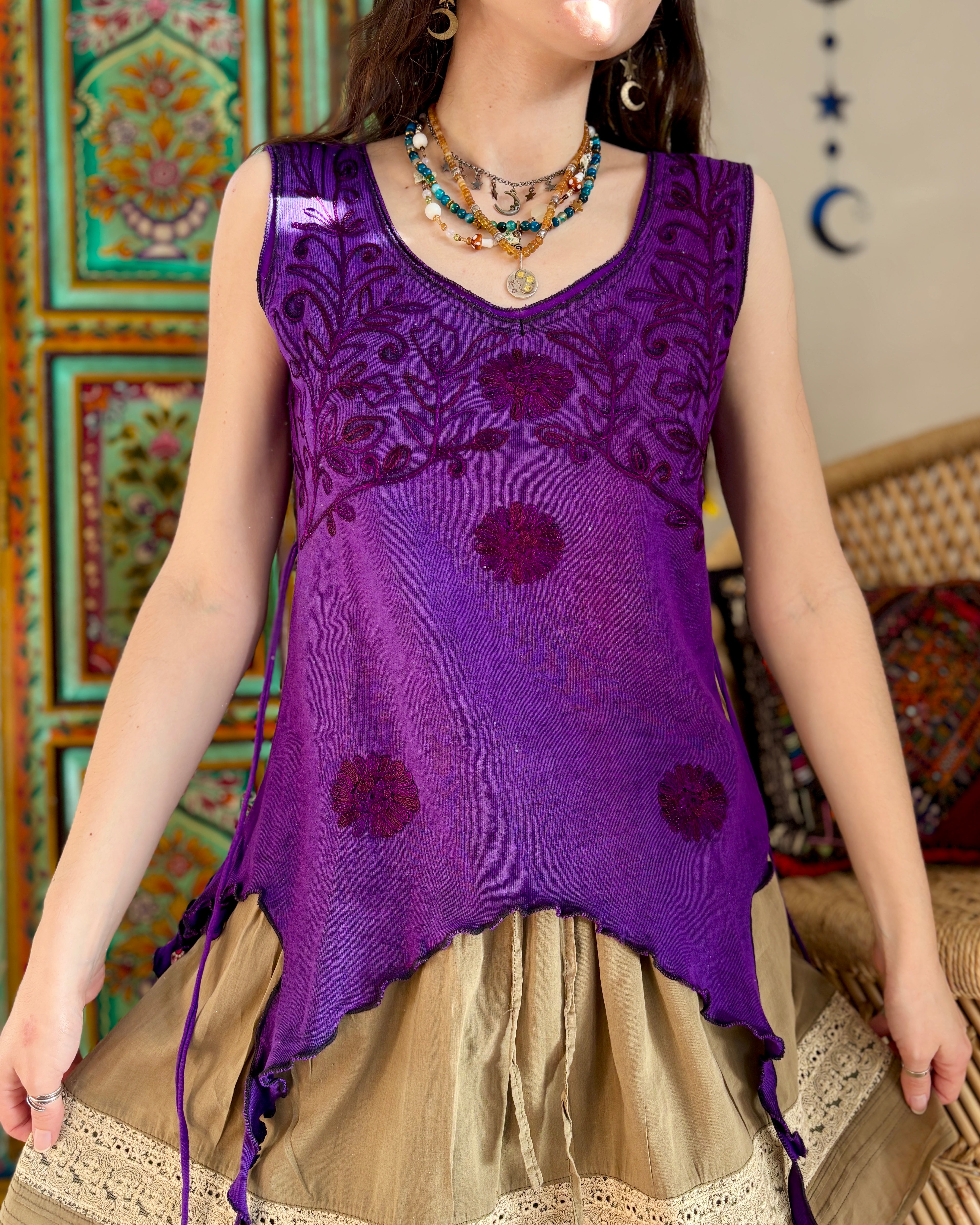 These beautiful sleeveless tops are made from purple fabric, featuring embroidery and a pointed bottom to give a whimsical fairy look.