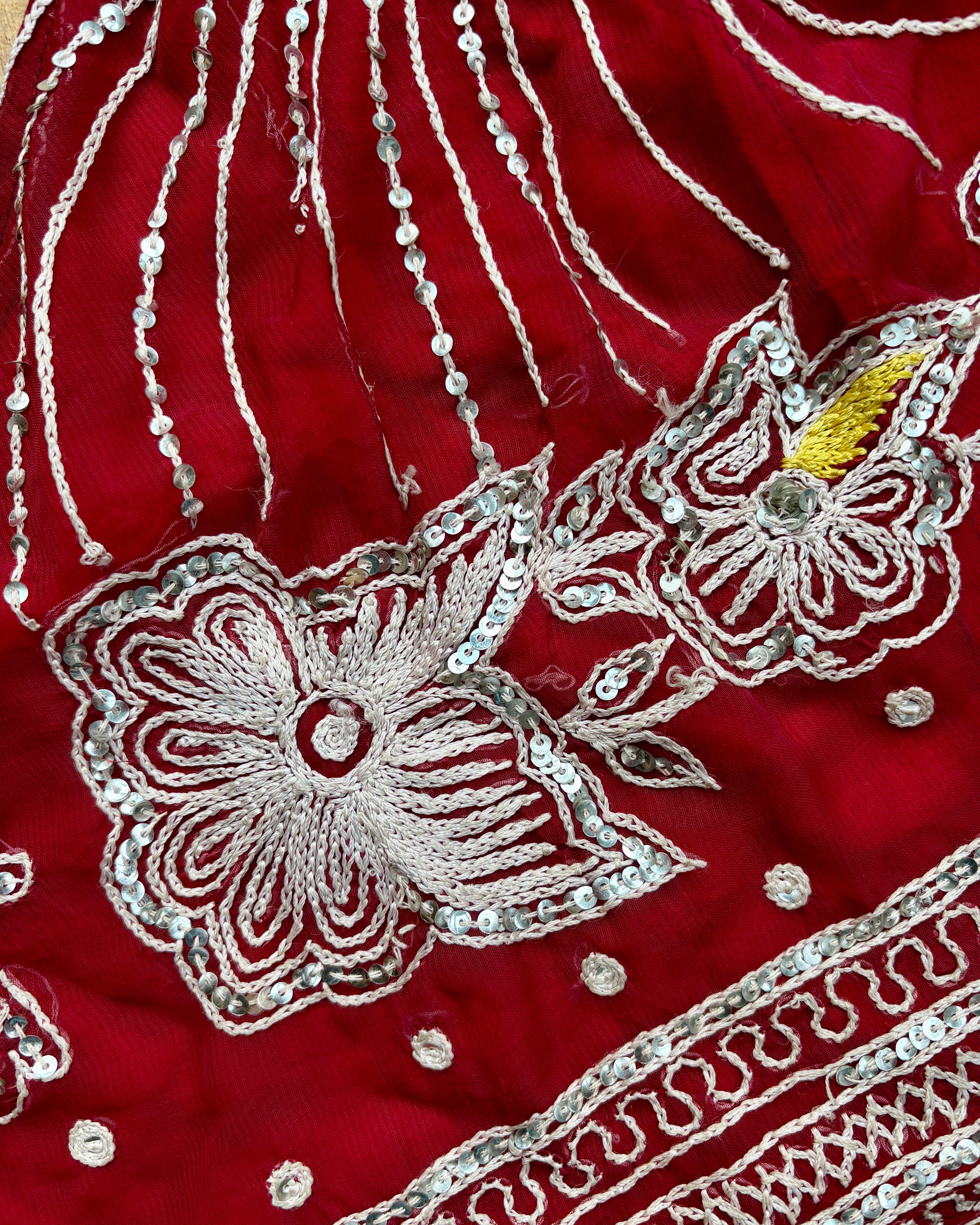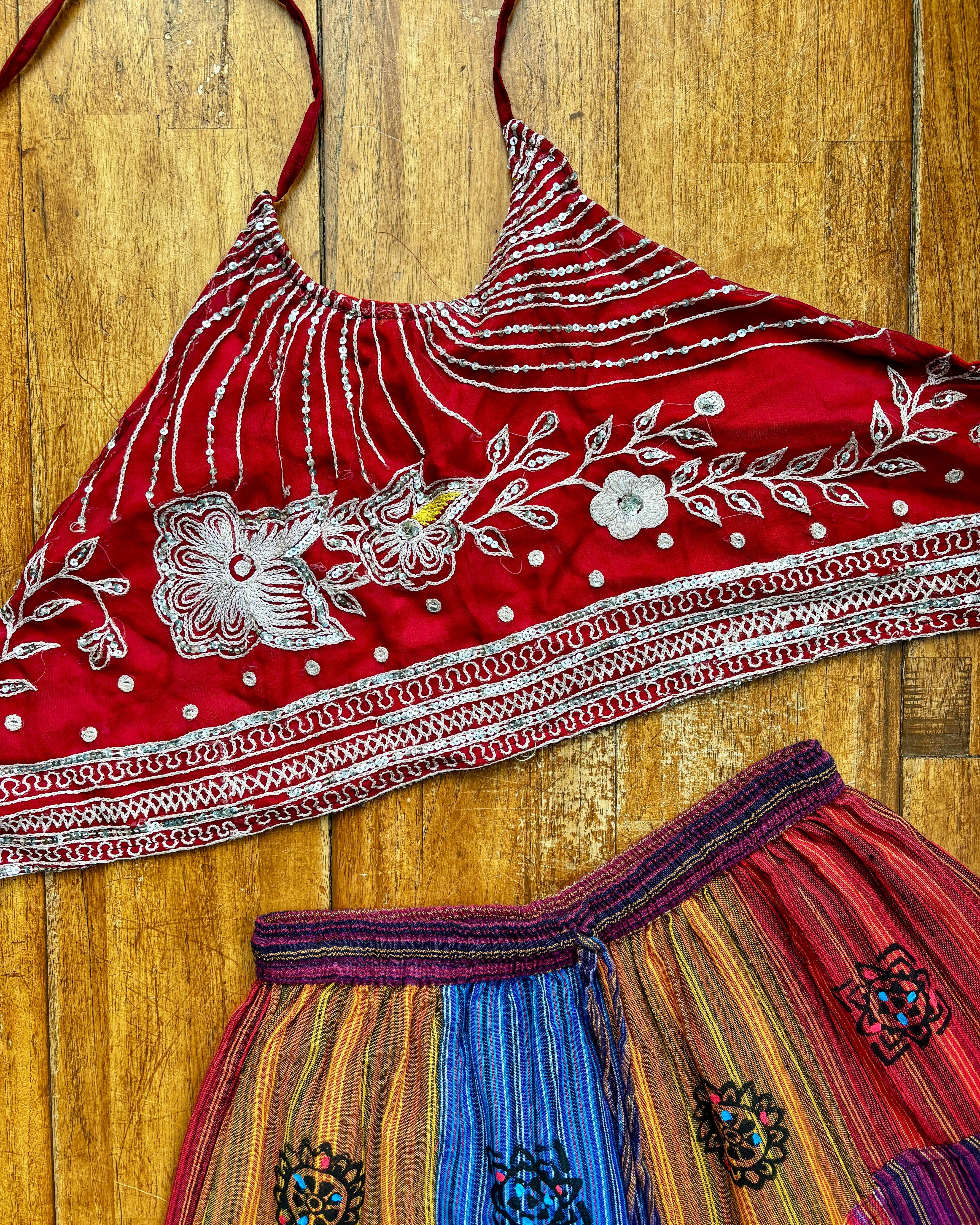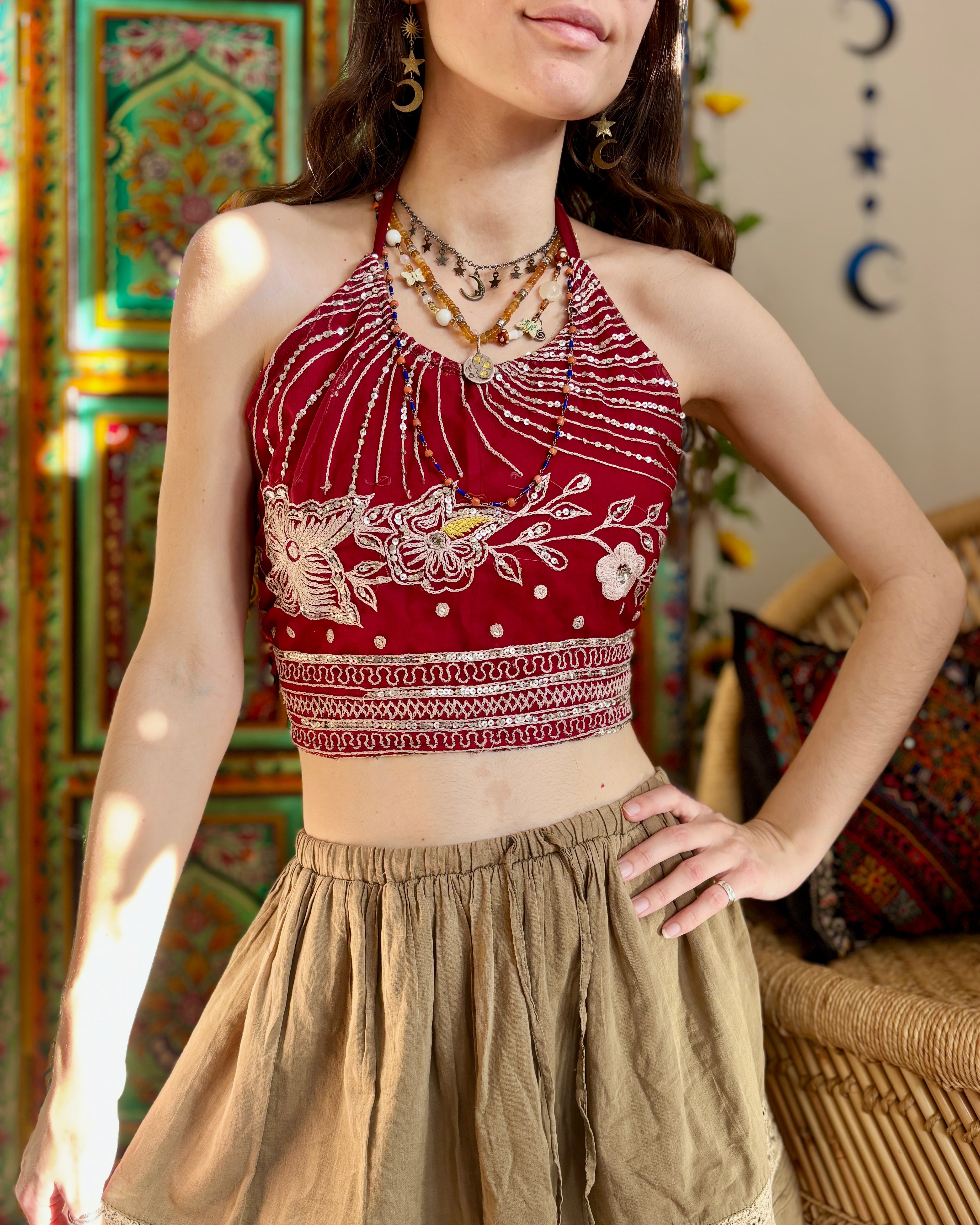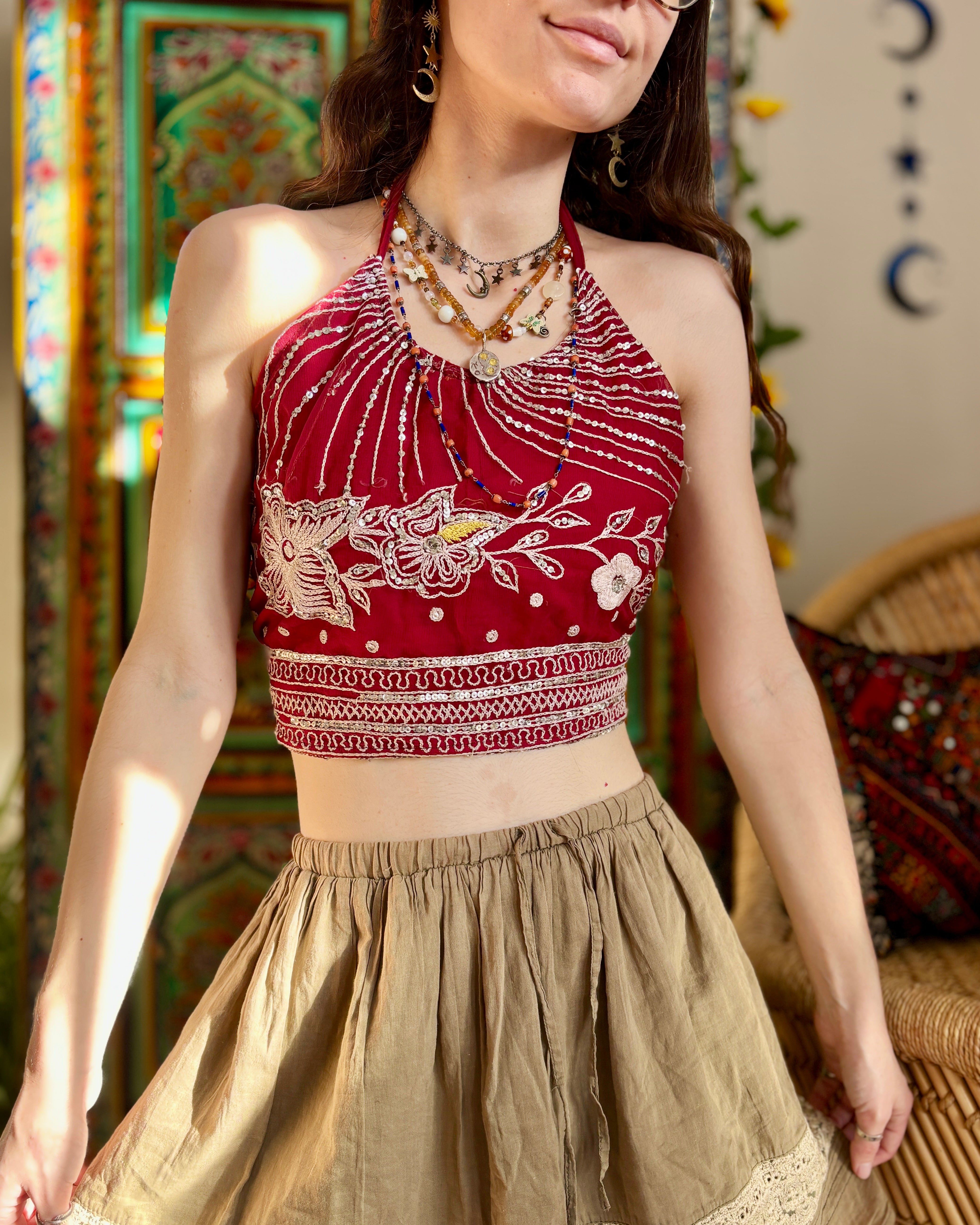 These beautiful tops are made from recycled Sari silk, that would have otherwise gone to waste! They are embellished with intricate embroidery, beads, and sequins. They have ties around the neck and back to adjust the fit.