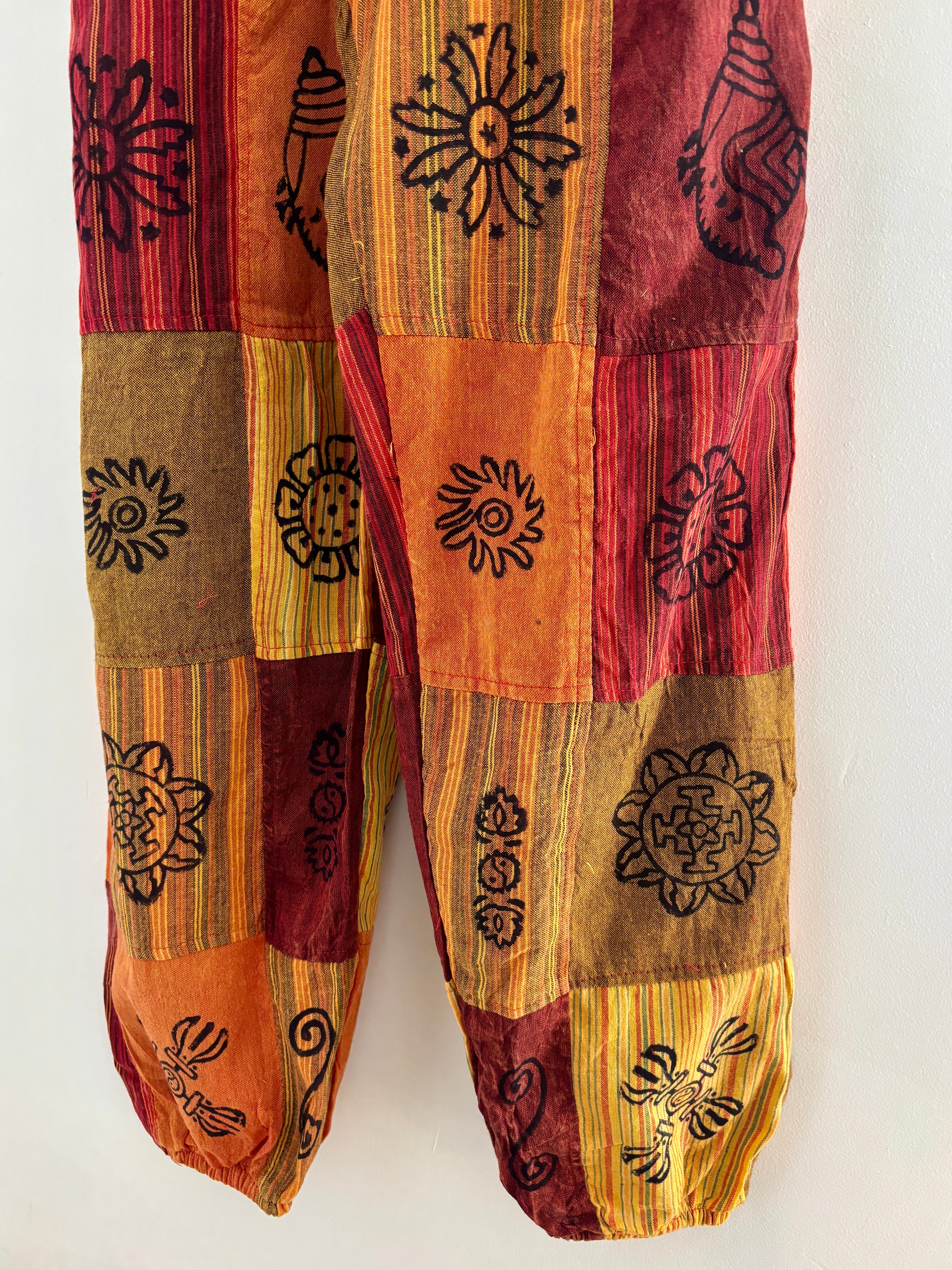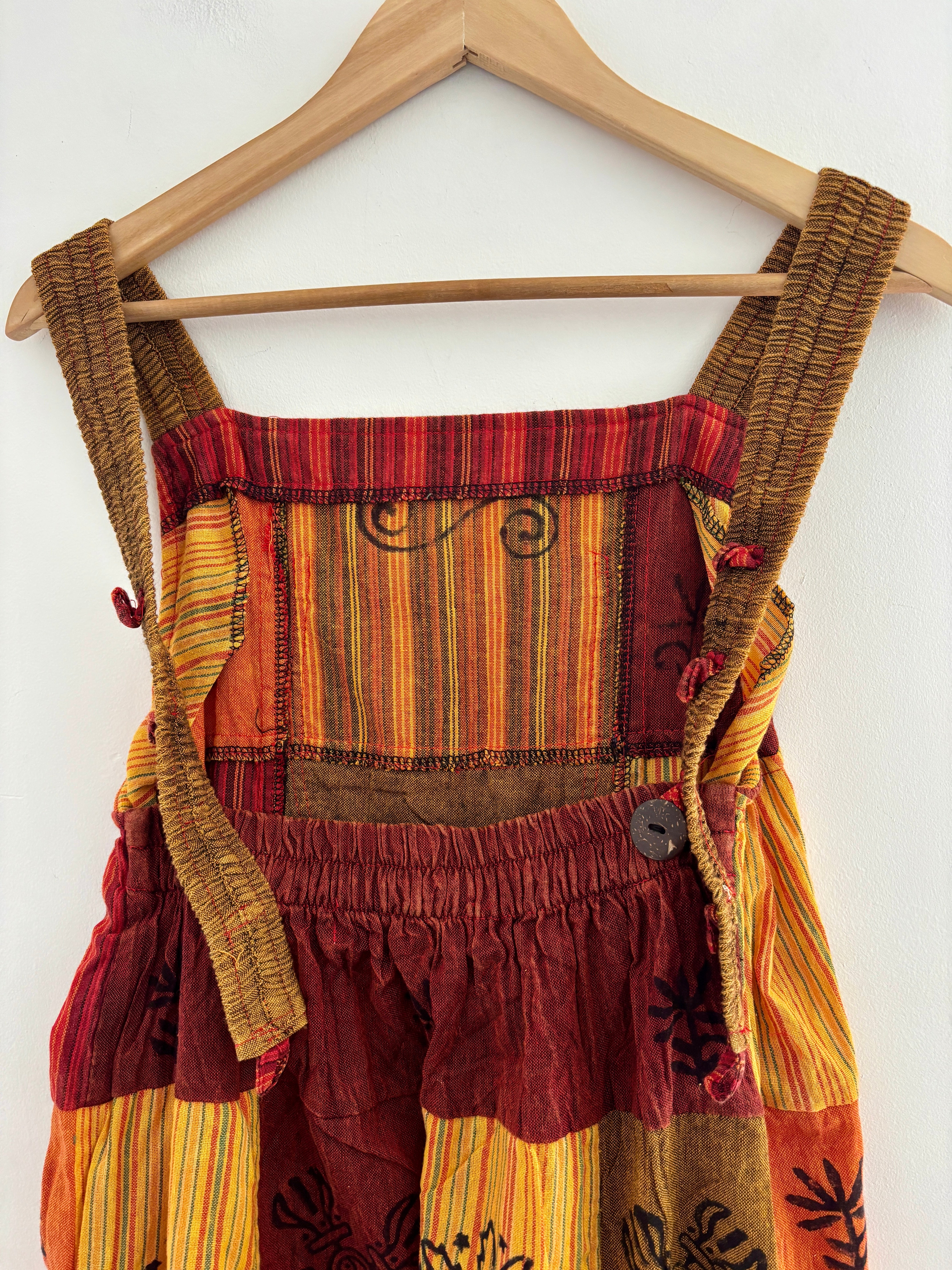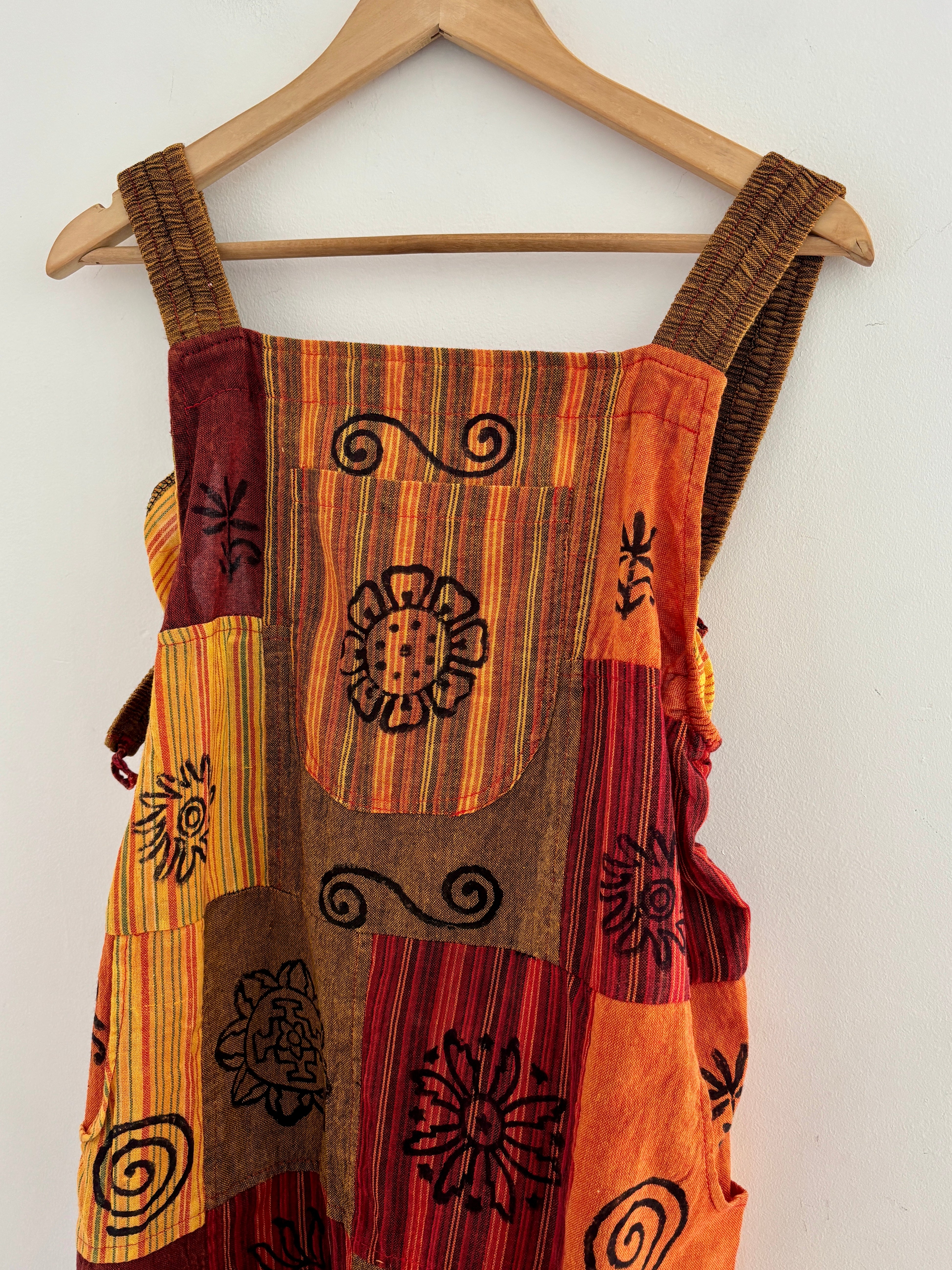 These beautiful harem dungarees are made from patches of cotton fabric in earthy colours, decorated with block-printed symbols. They have side pockets and adjustable straps.