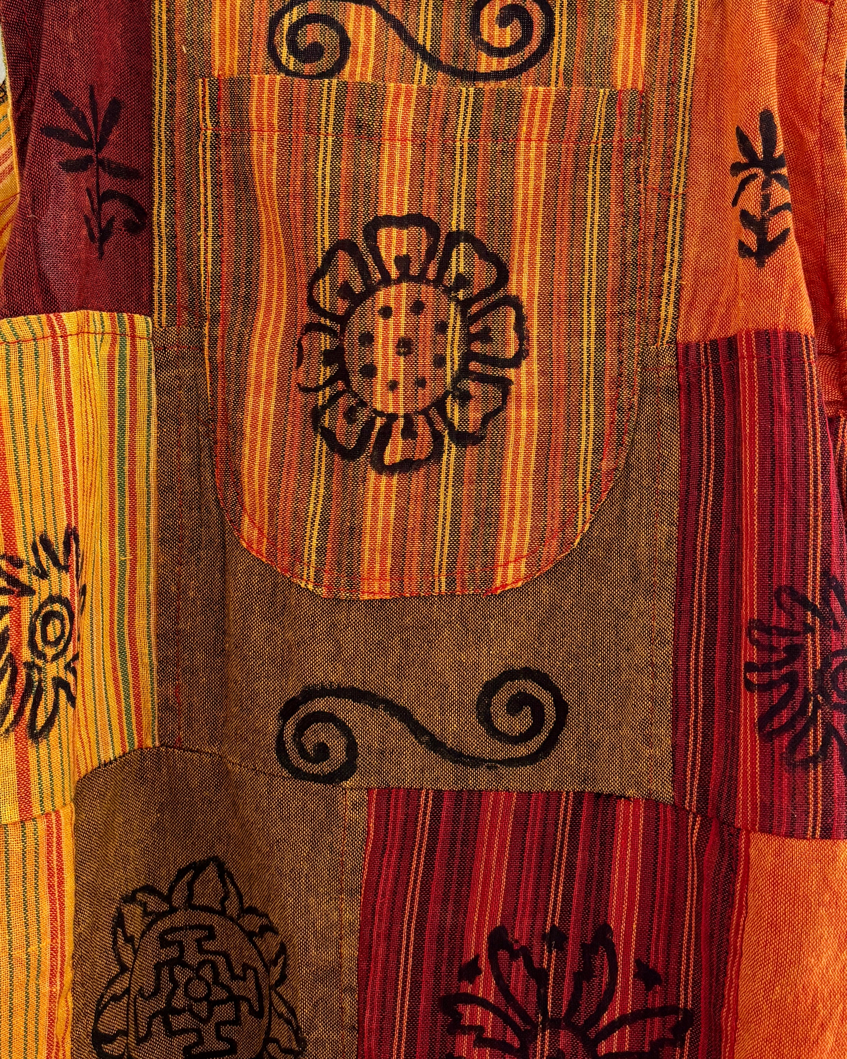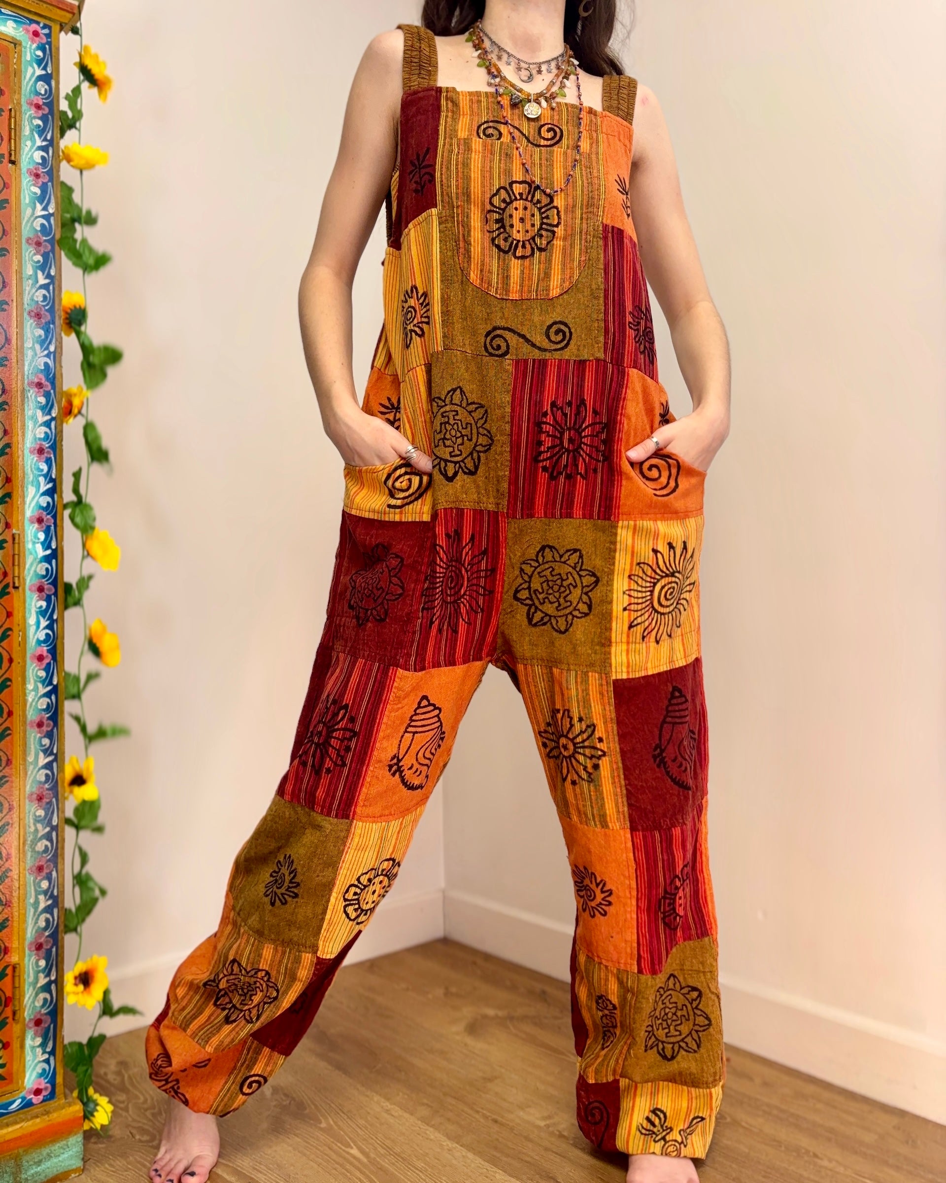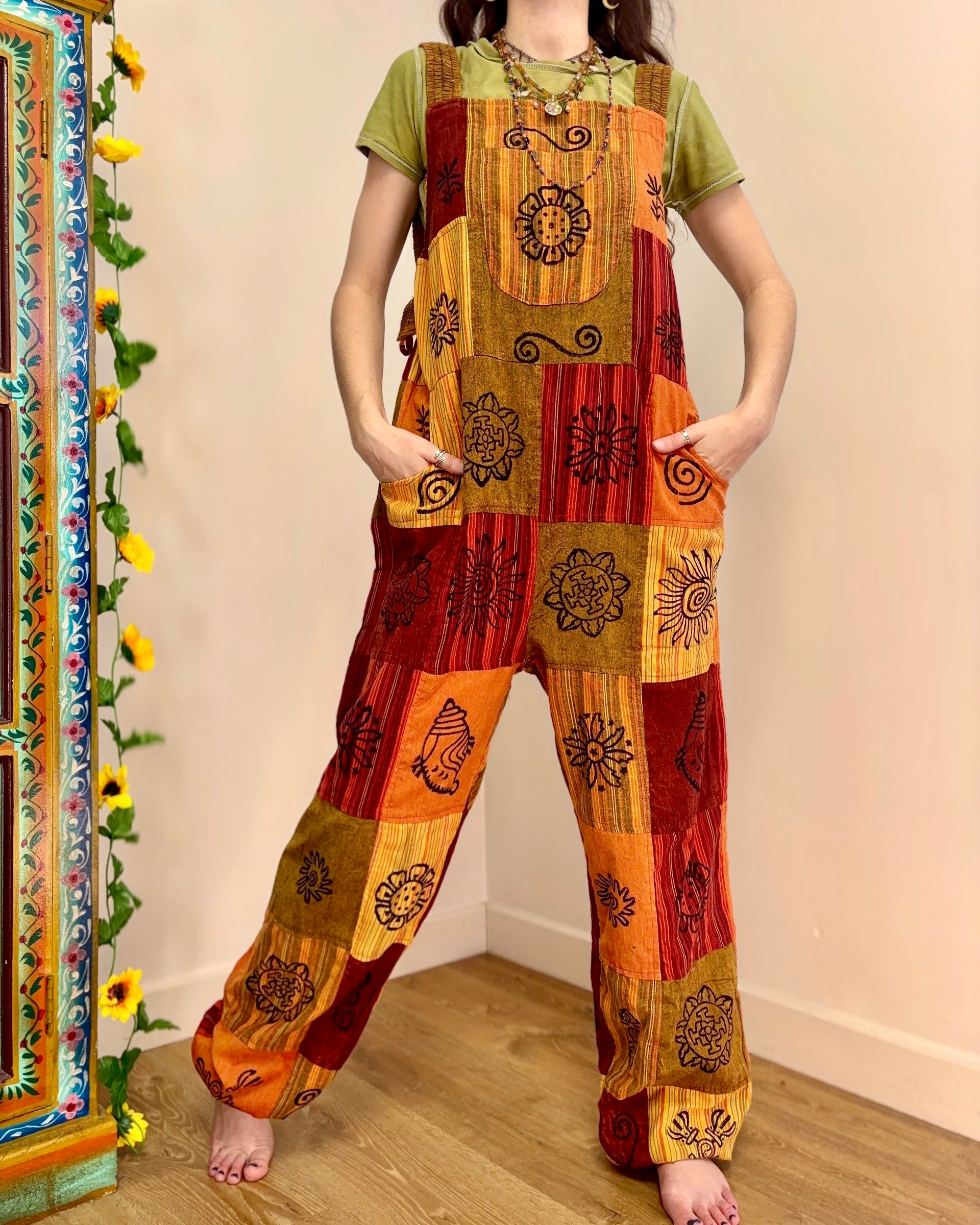 These beautiful harem dungarees are made from patches of cotton fabric in earthy colours, decorated with block-printed symbols. They have side pockets and adjustable straps.
