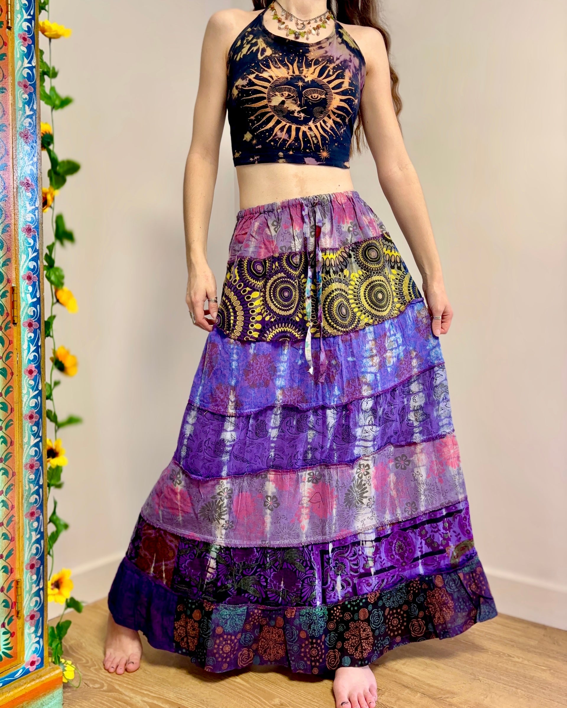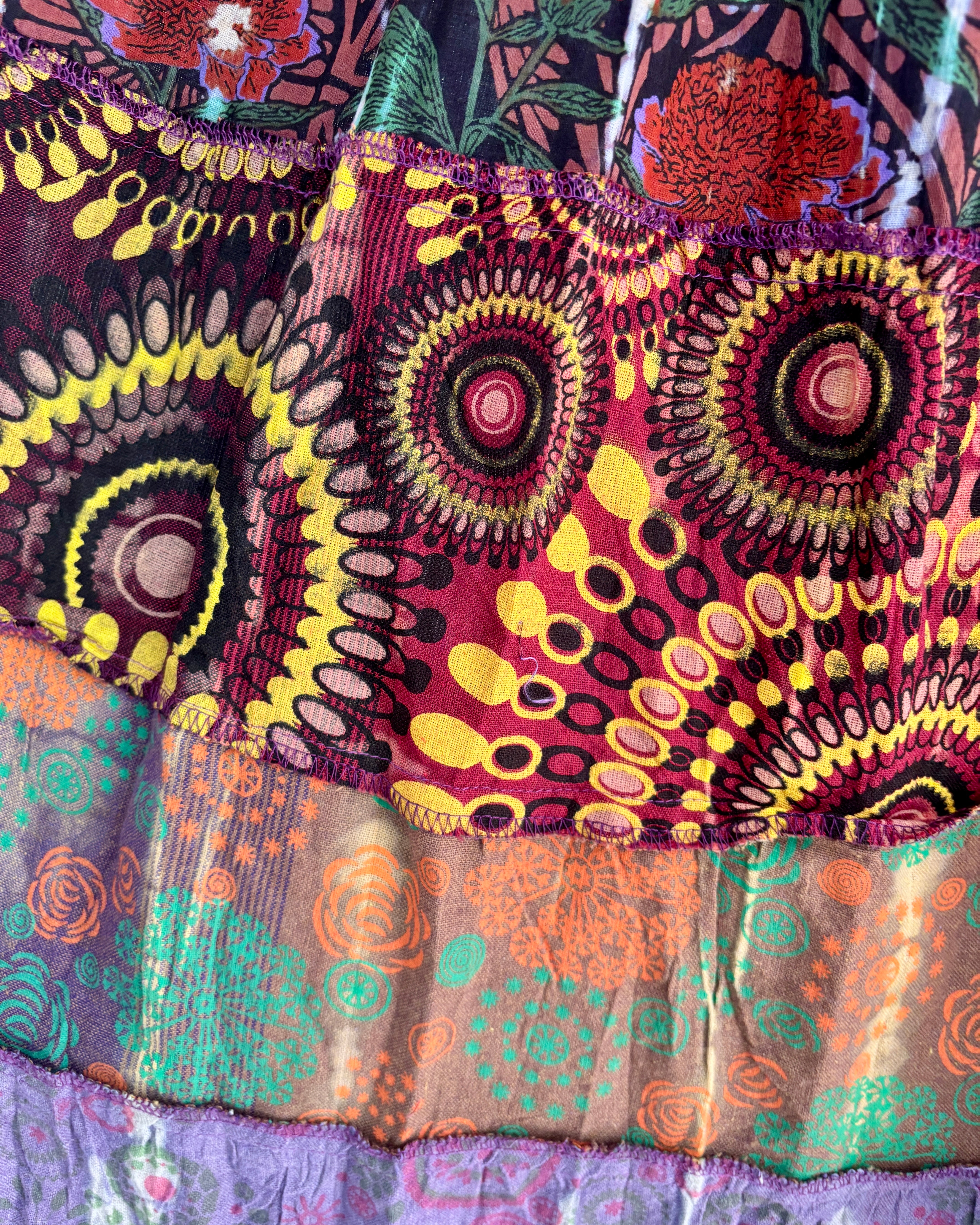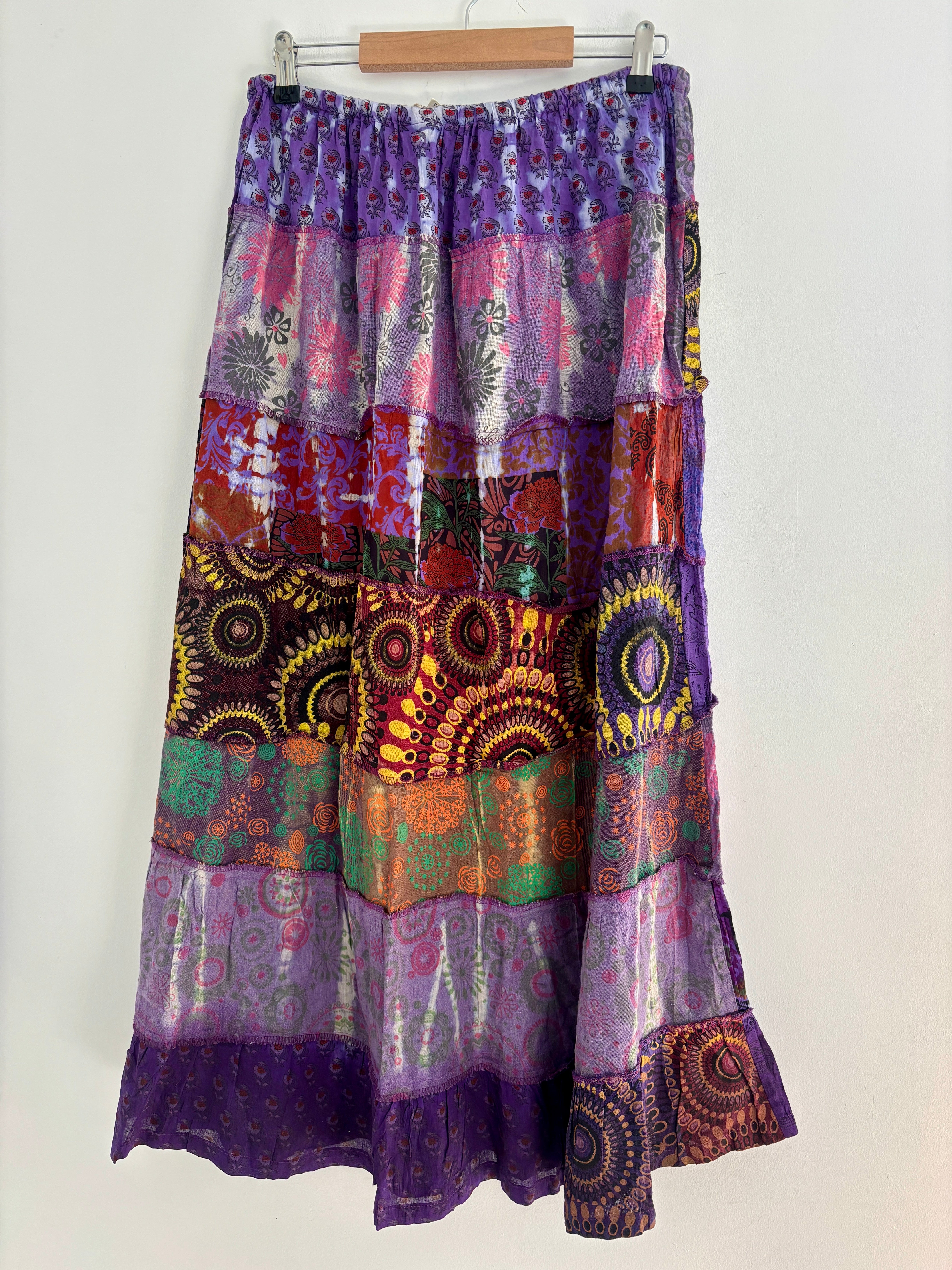 These beautiful skirts are made from patches of green earthy fabric made in a variety of designs and using different dye techniques.