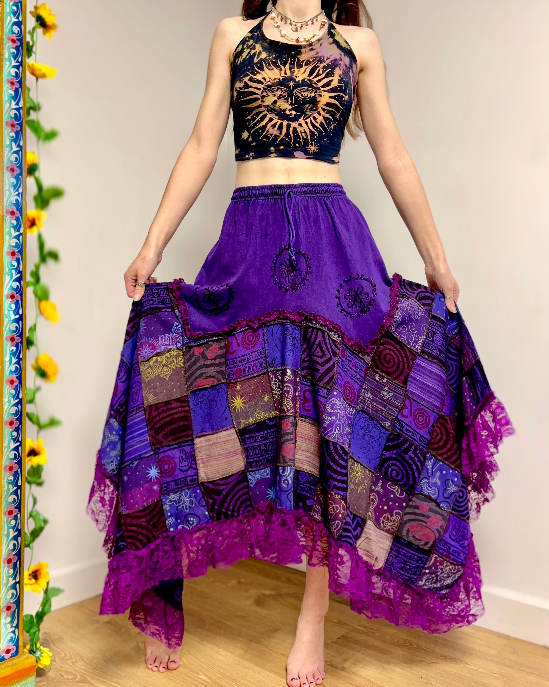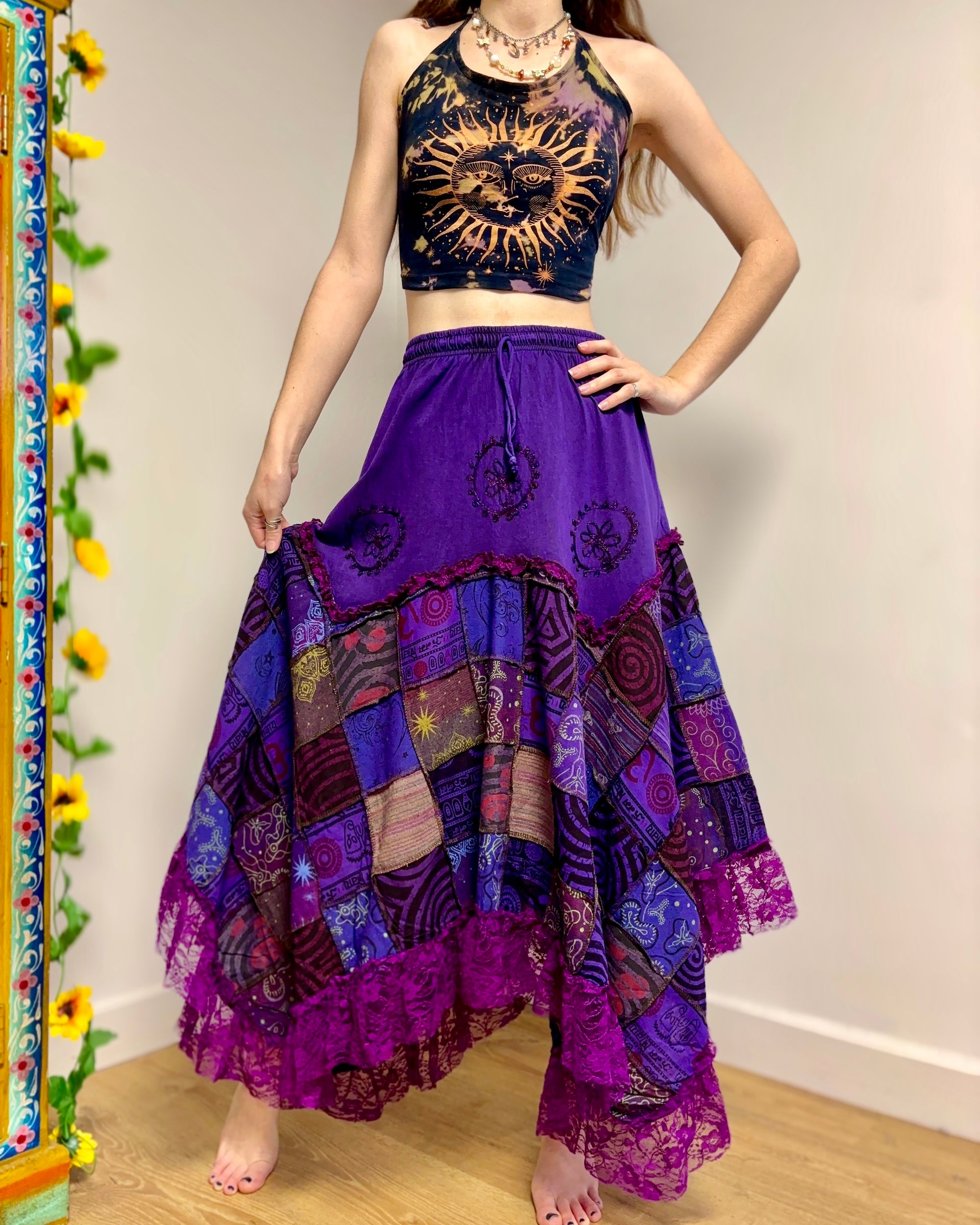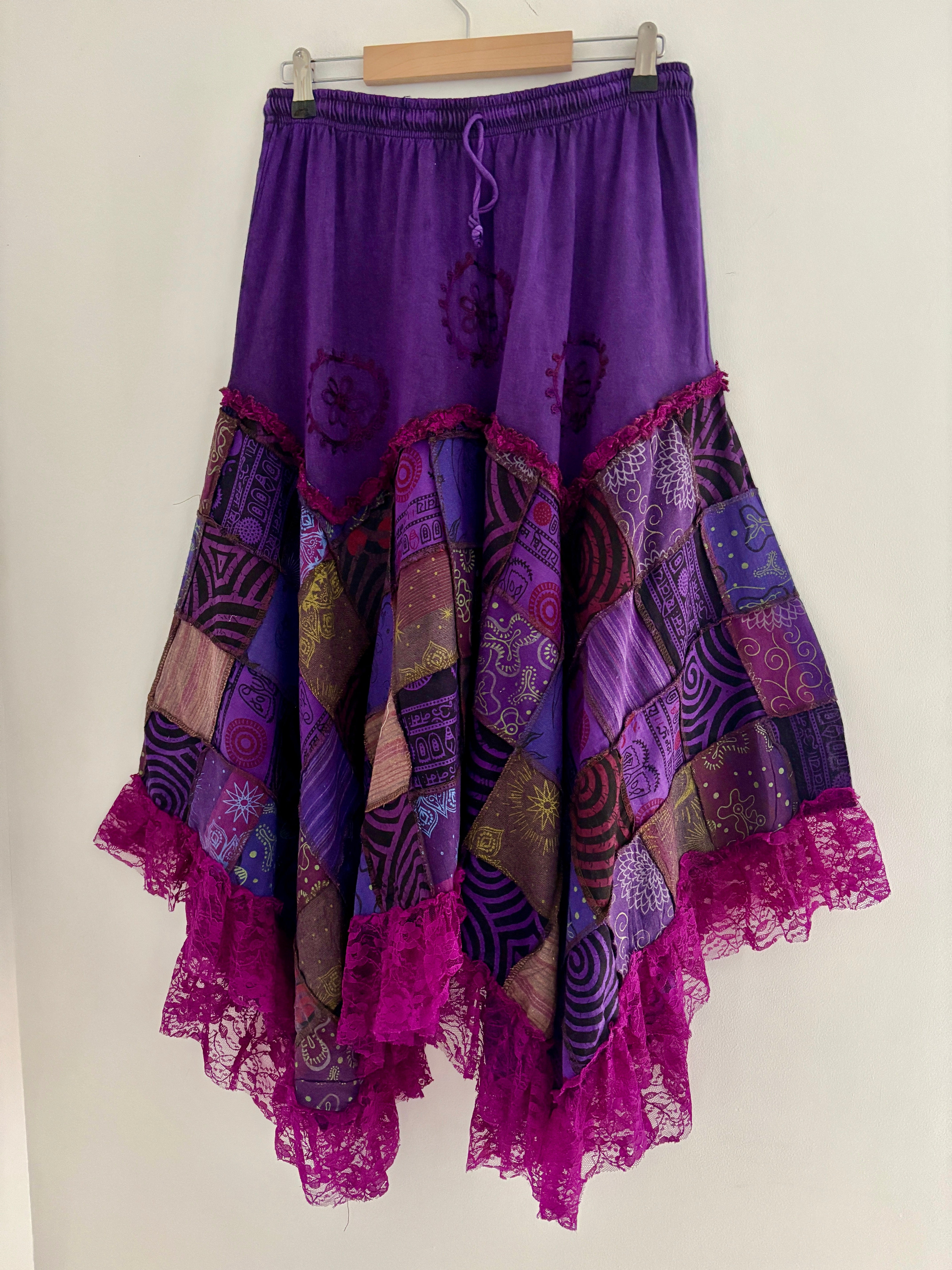 This magical purple skirt features patchwork and lace, with an asymmetric style bottom giving a fairy hippie look.