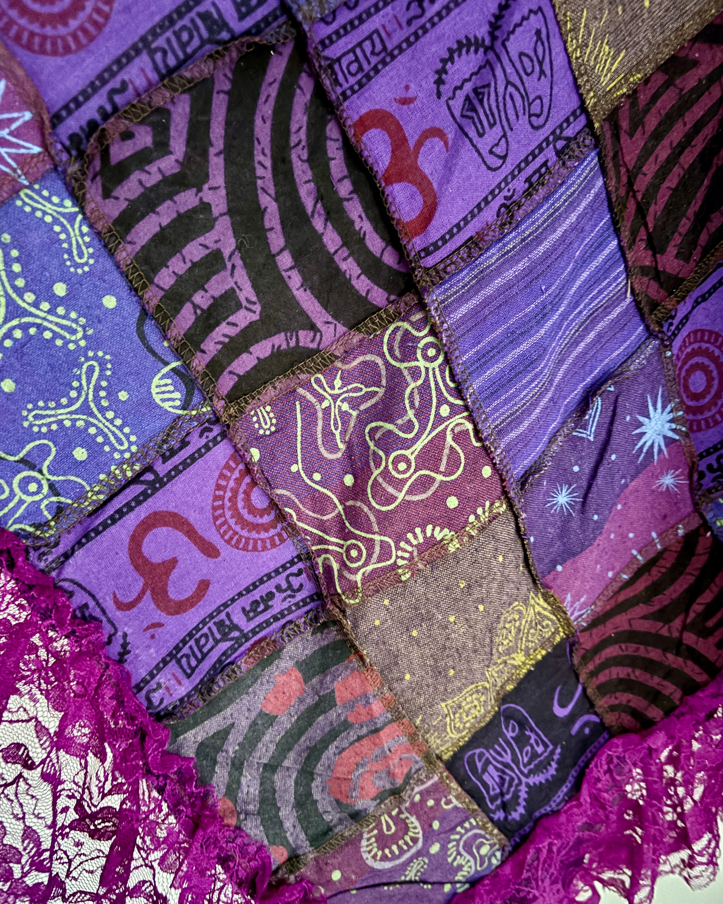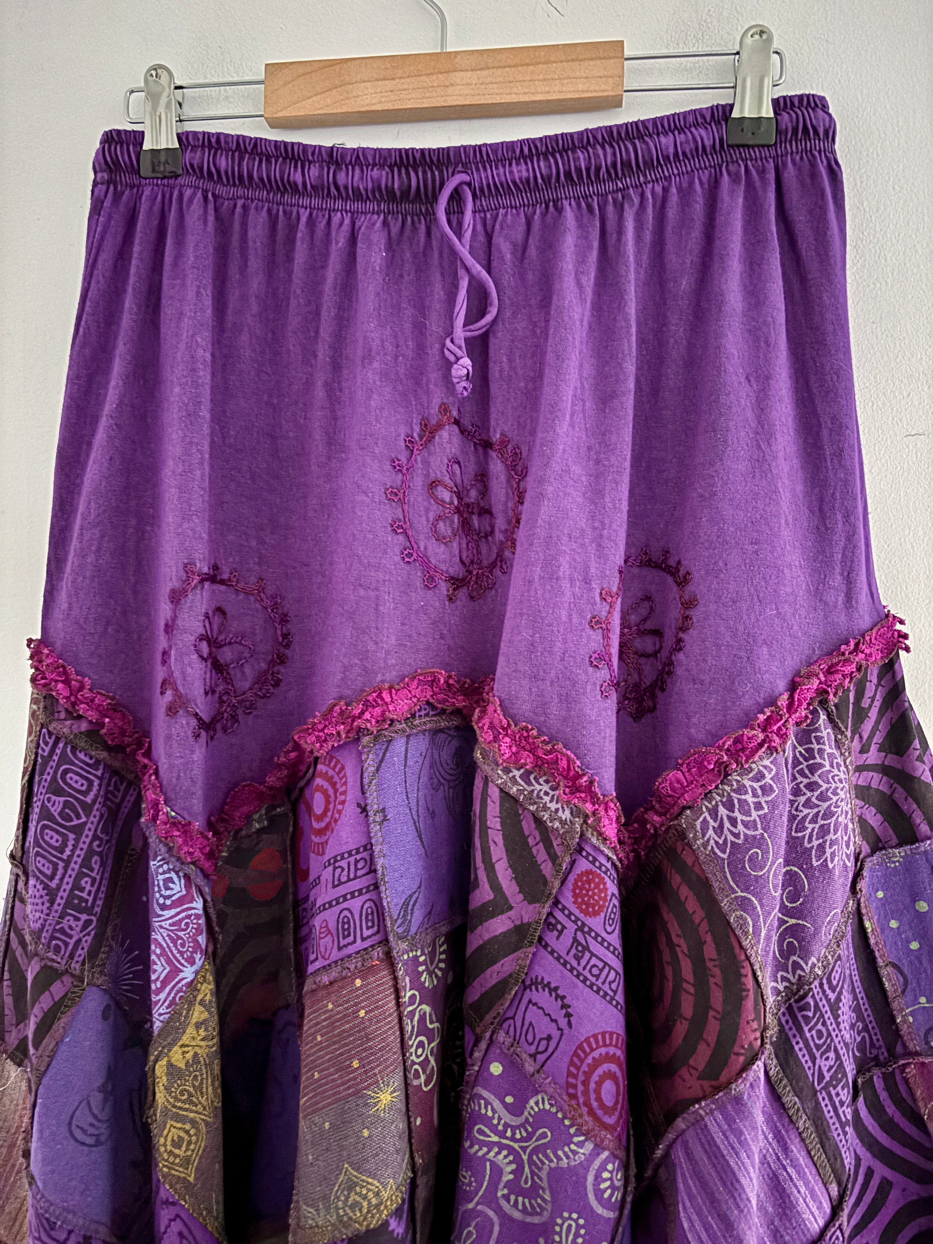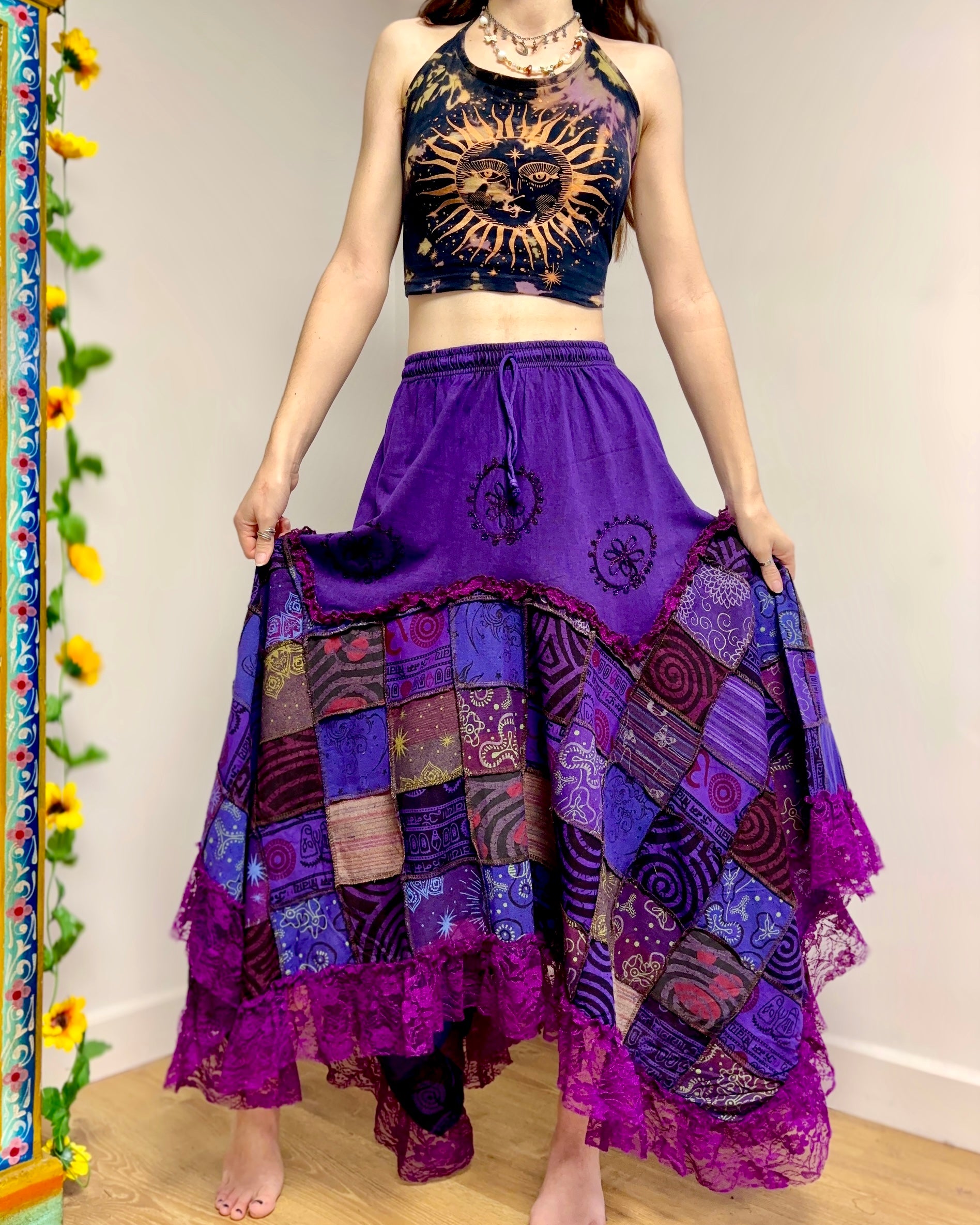 This magical purple skirt features patchwork and lace, with an asymmetric style bottom giving a fairy hippie look.