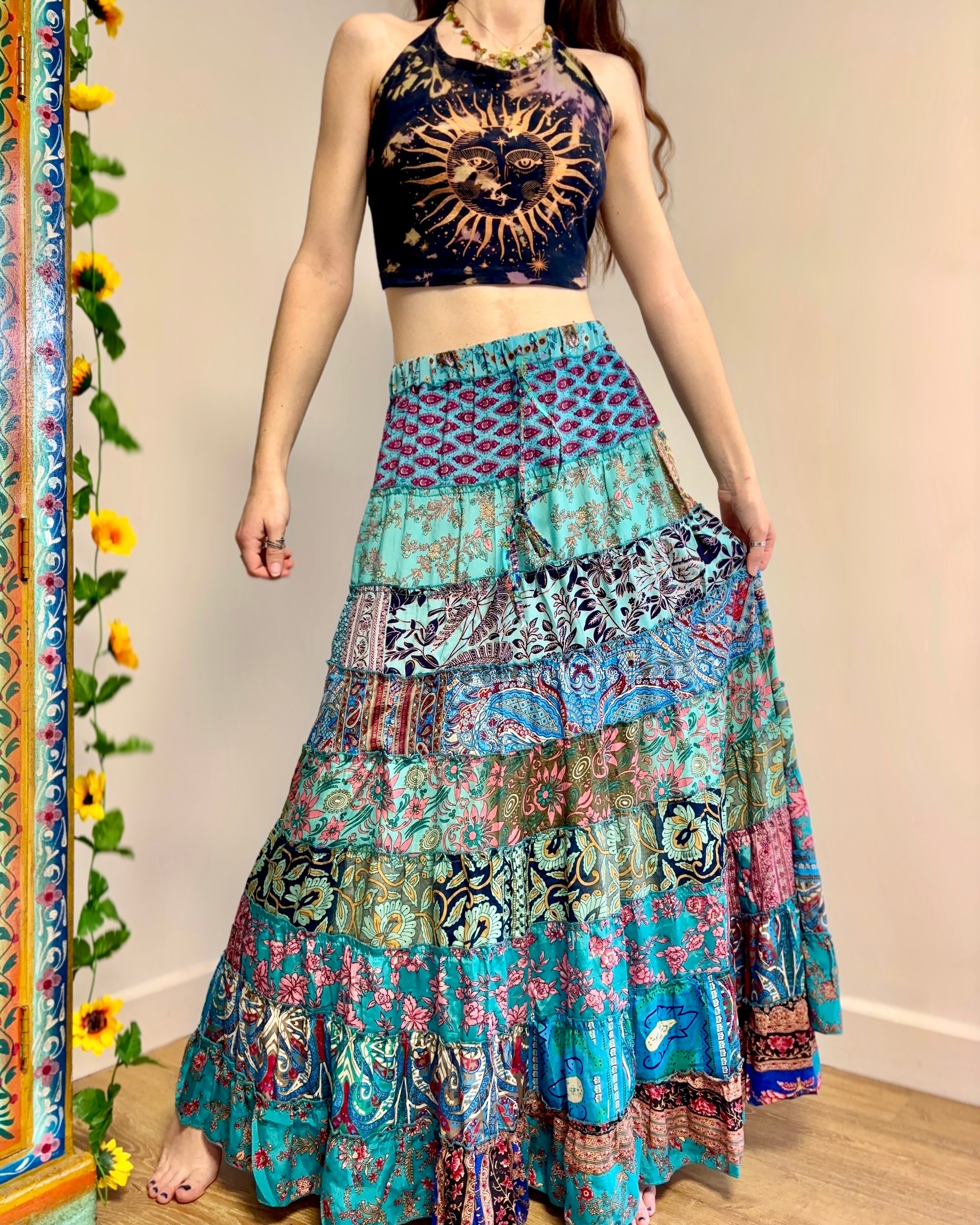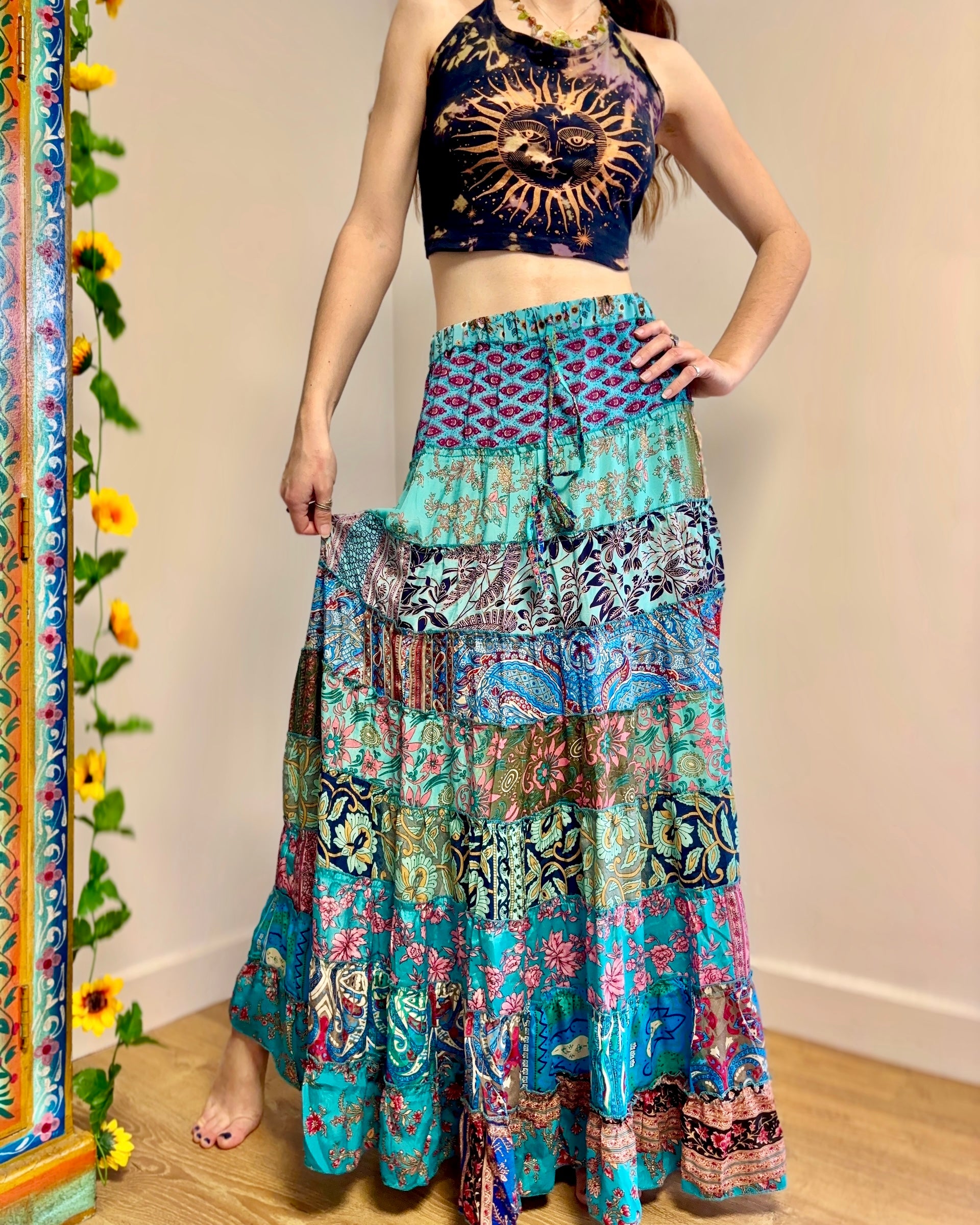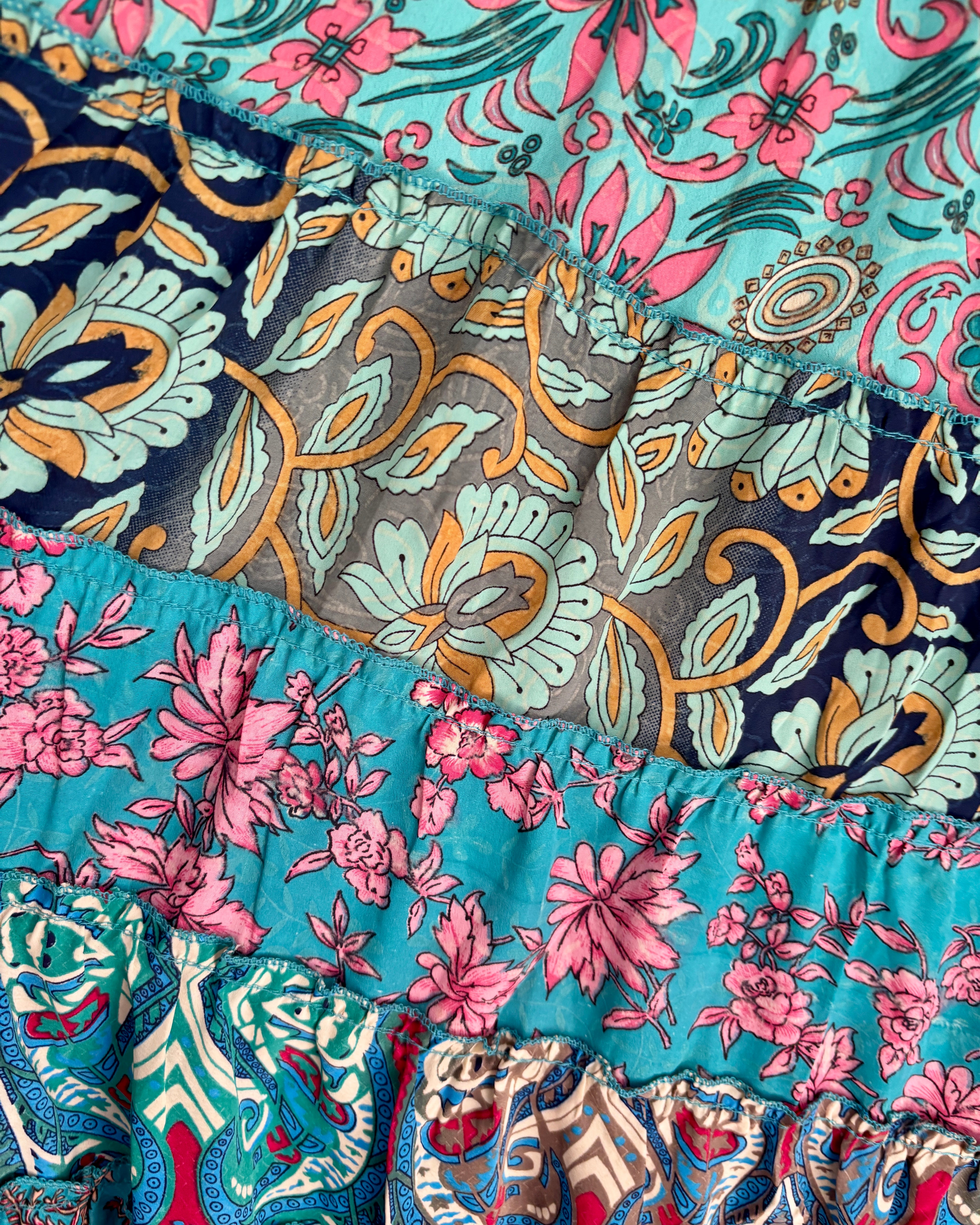 This piece is made from patches of beautiful recycled sari fabric that would otherwise have gone to waste. They are so magical and floaty, perfect for a festival hippie look!