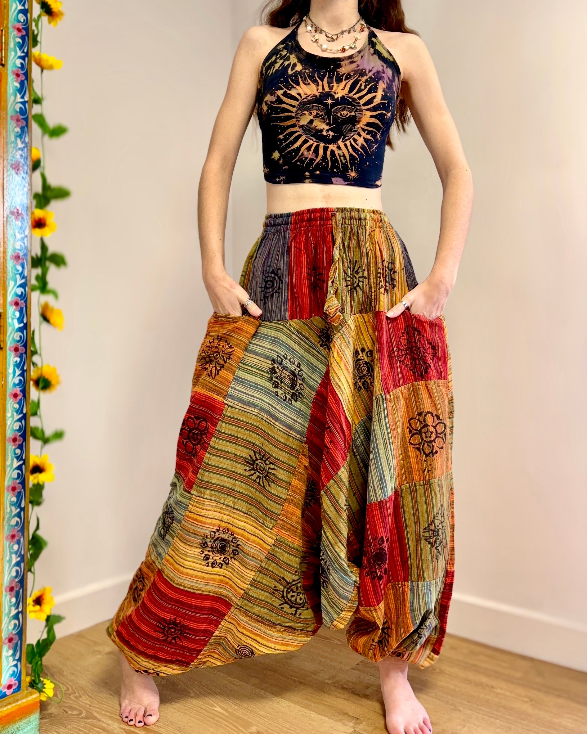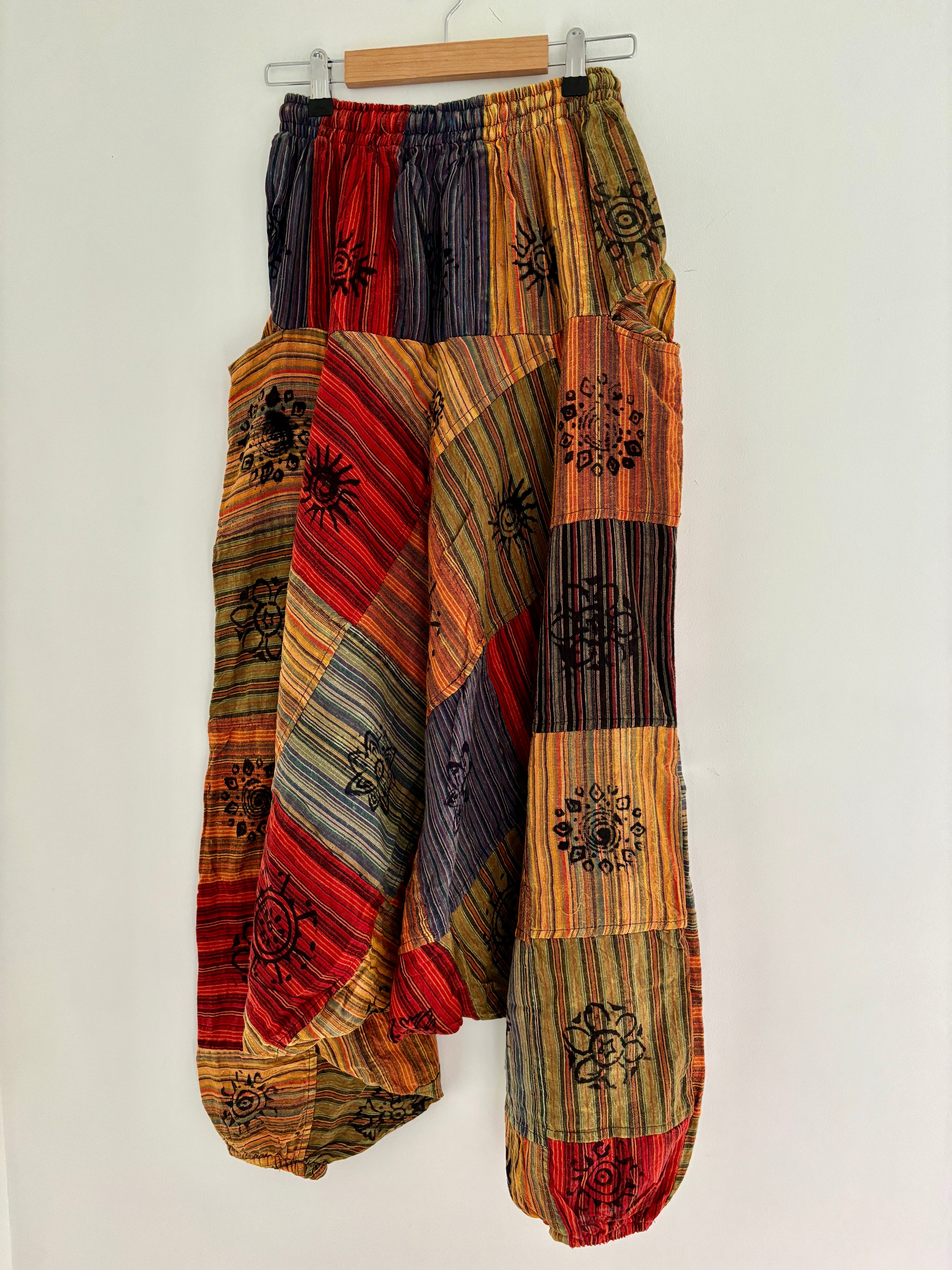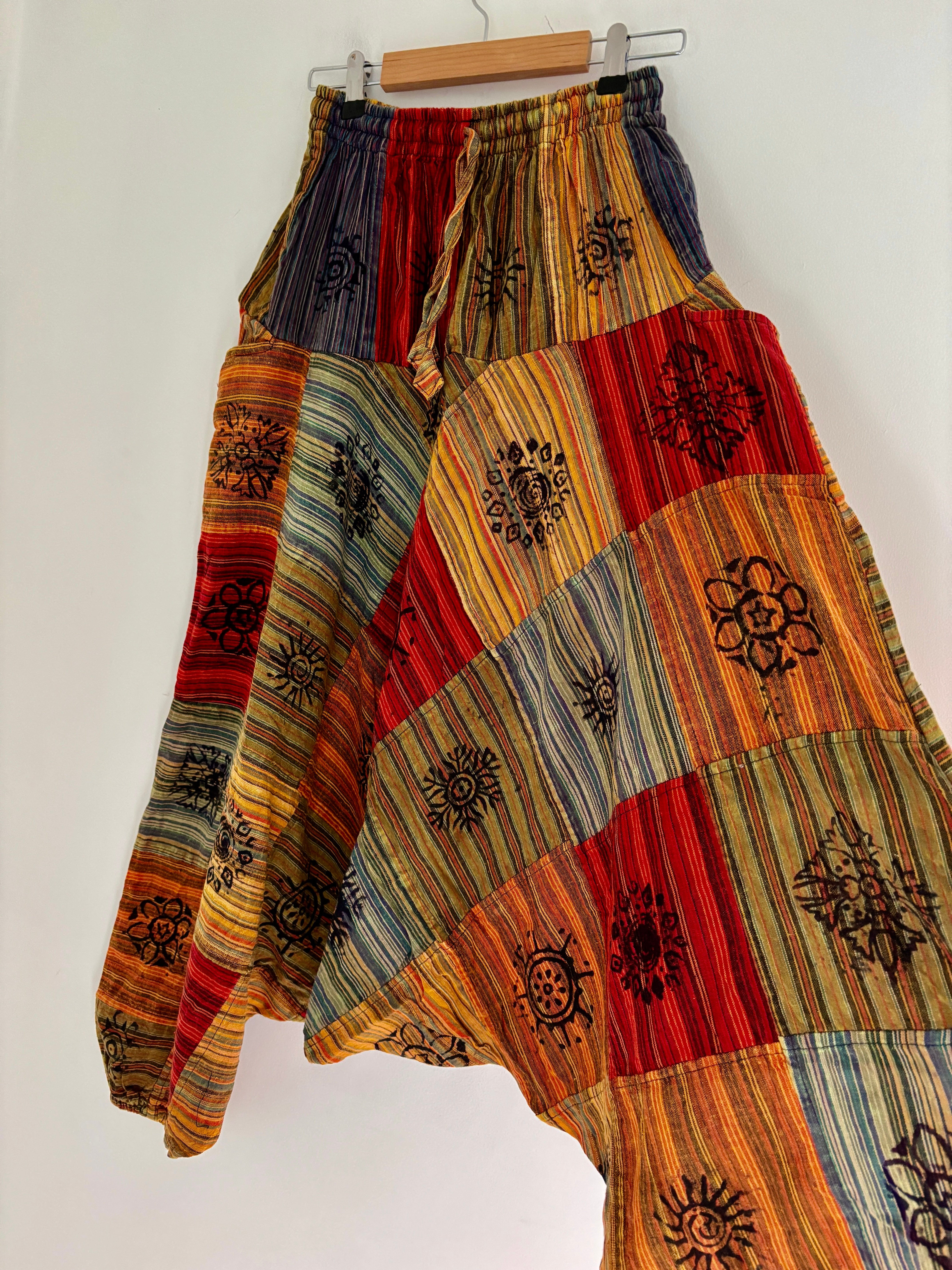 These beautiful Afghani-style harem pants are made from patches of fabric in warm earthy colours, and decorated with block-printed symbols.