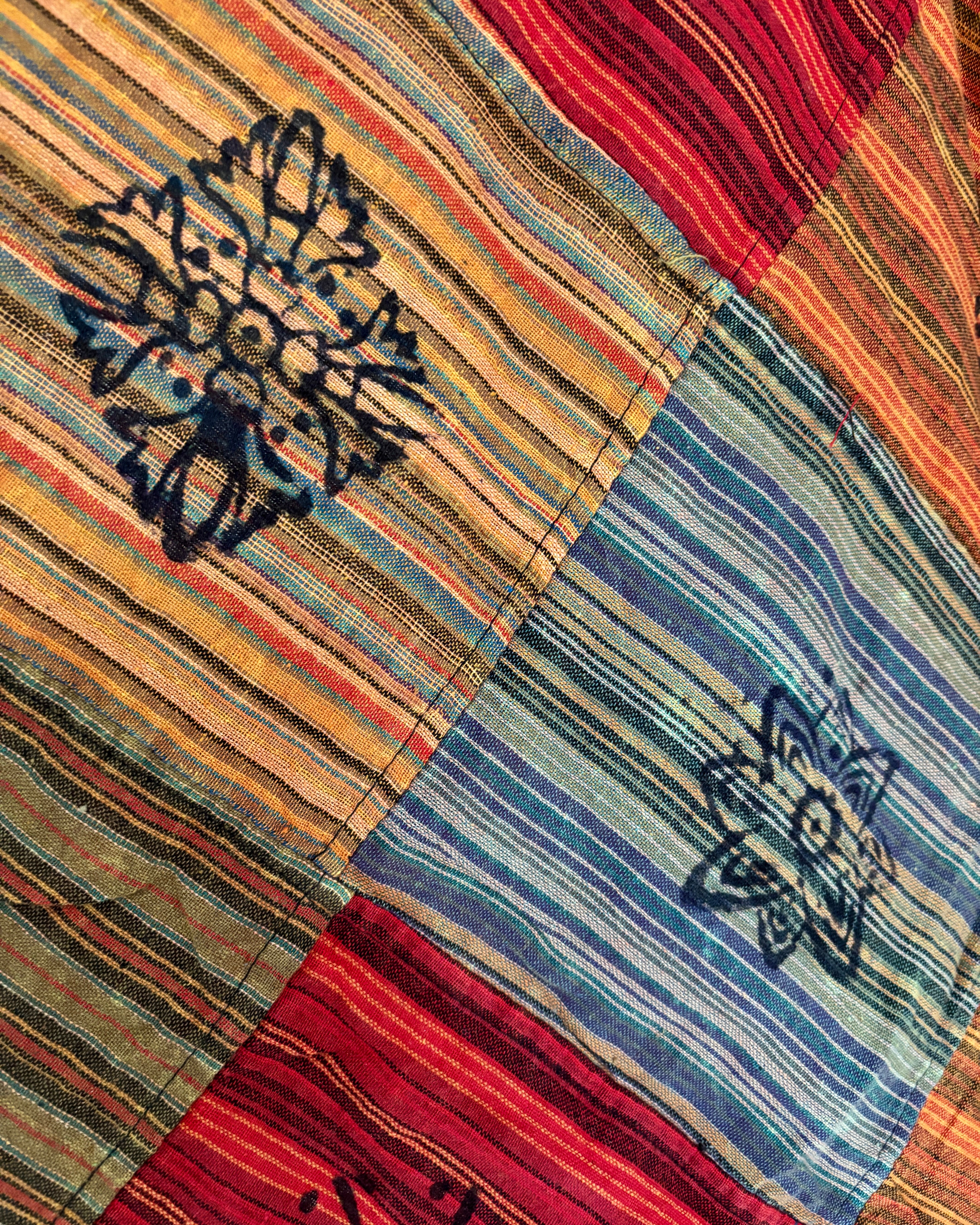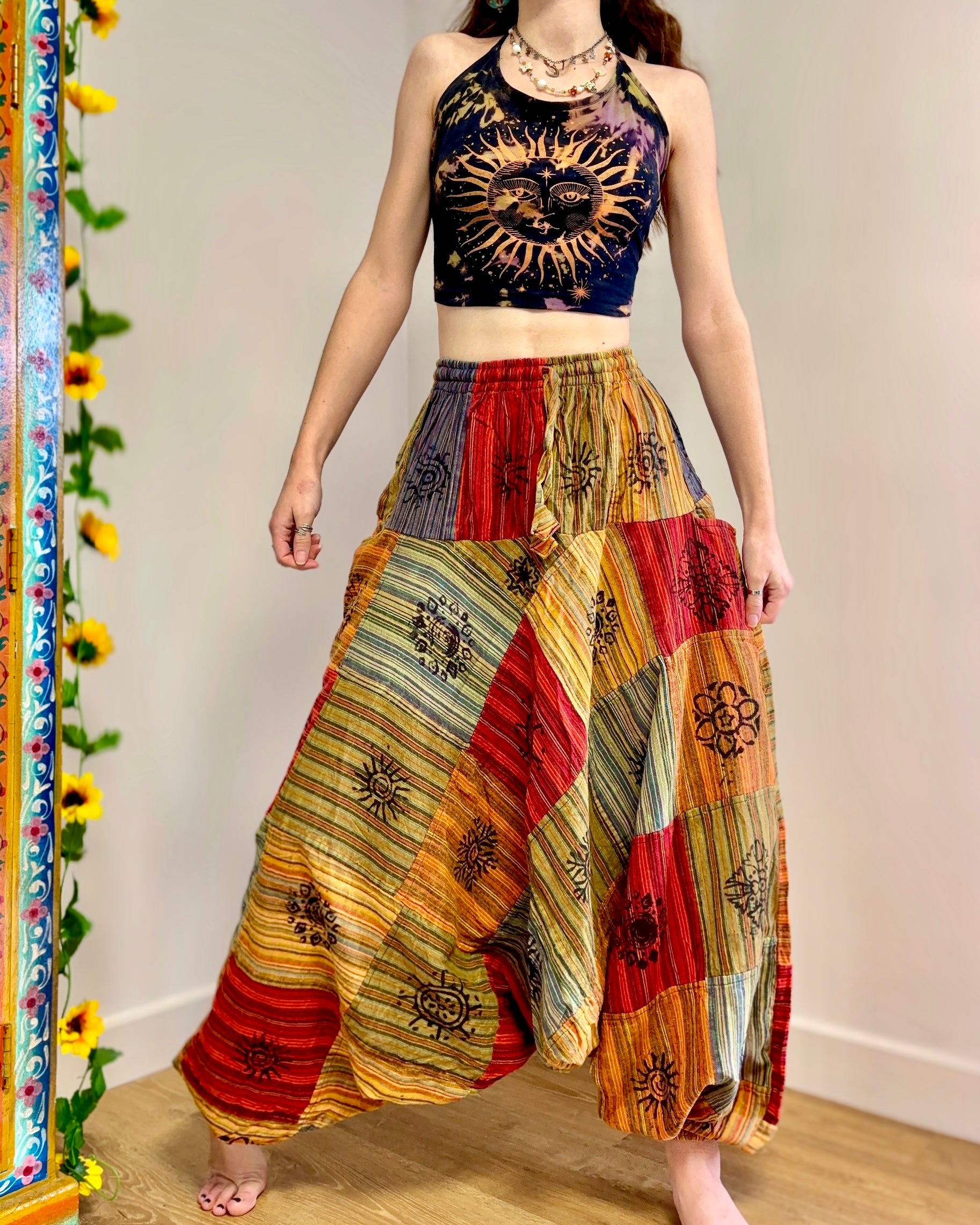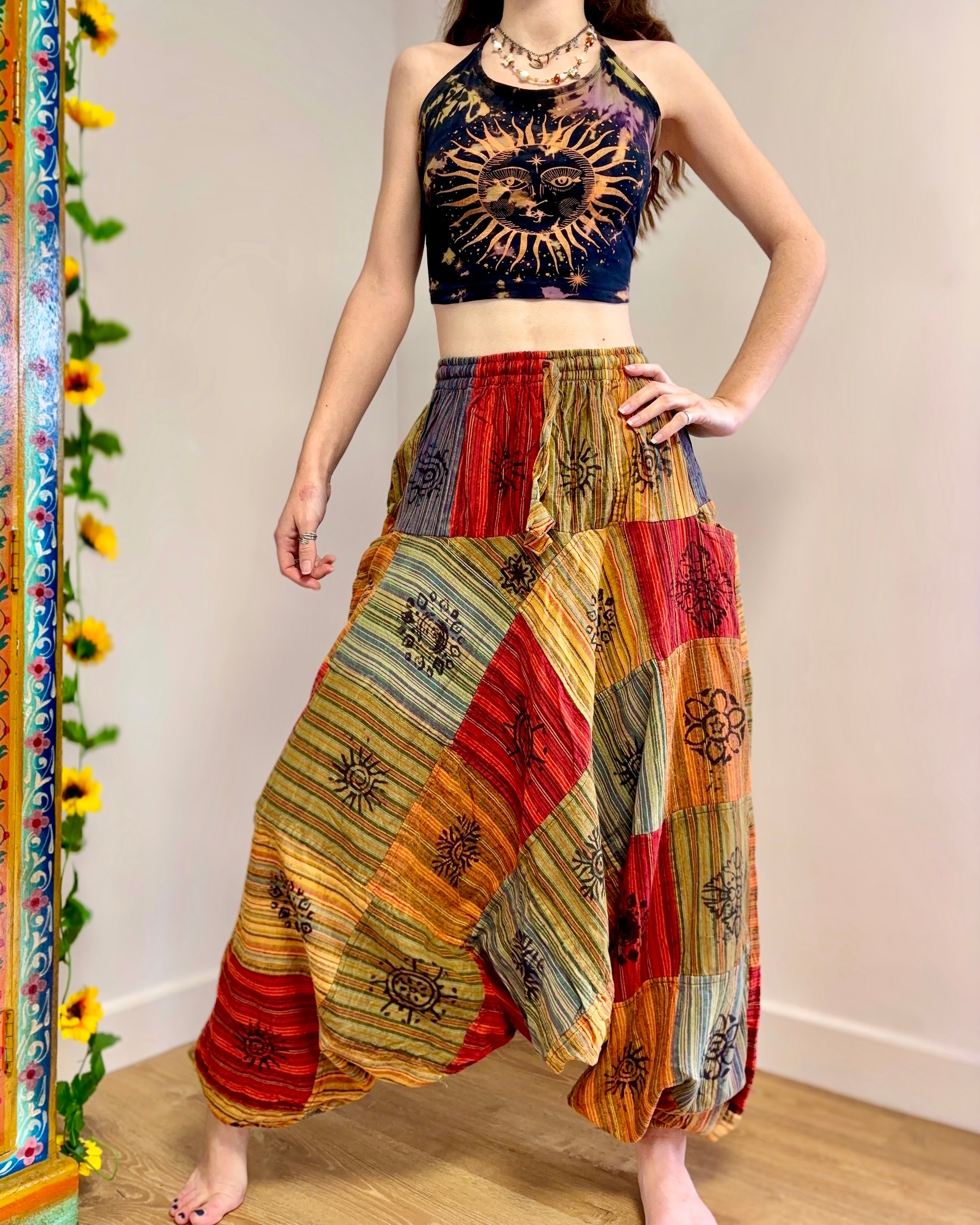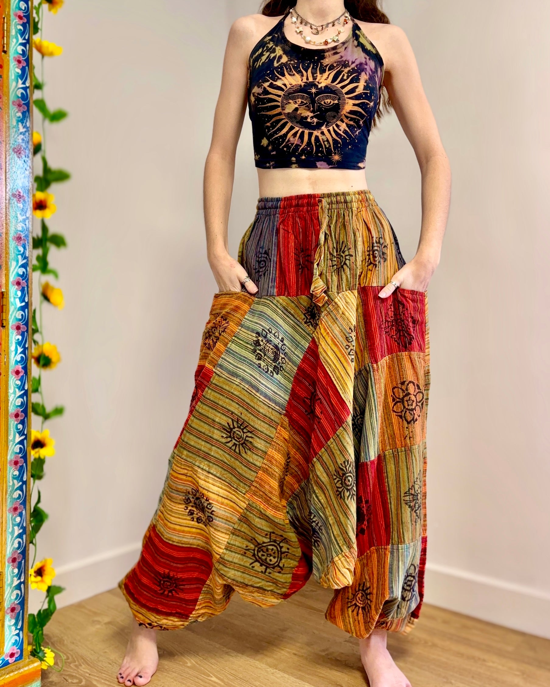 These beautiful Afghani-style harem pants are made from patches of fabric in warm earthy colours, and decorated with block-printed symbols.