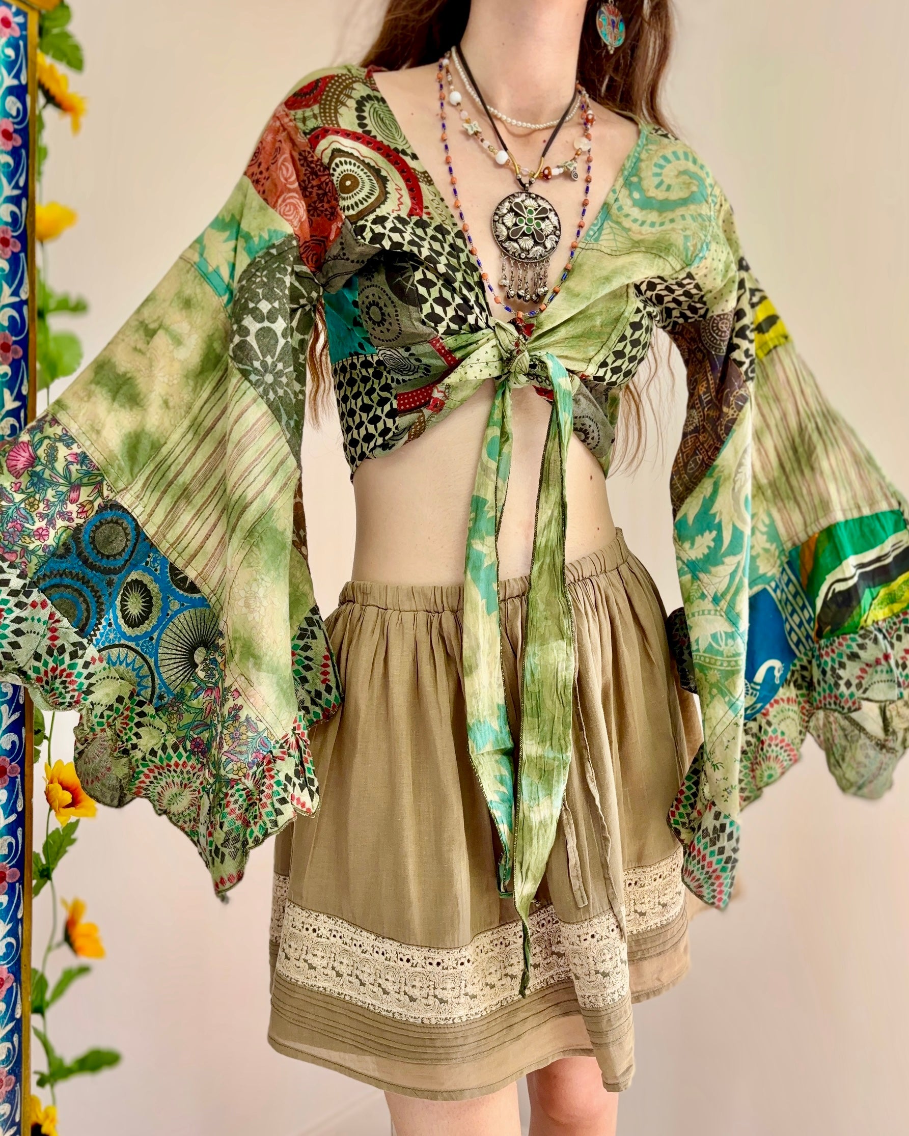 These beautiful tops are made from patches of fabric in a earthy green colour. With pixie-style sleeves & ties at the front, they can be worn in a variety of ways.