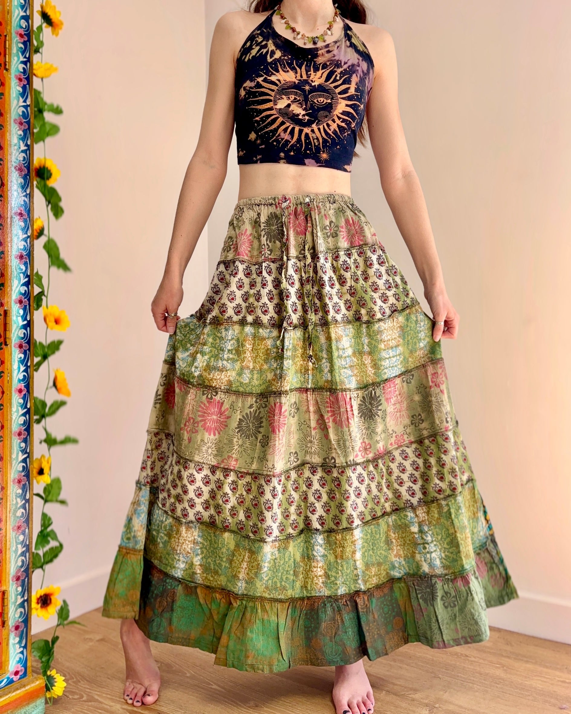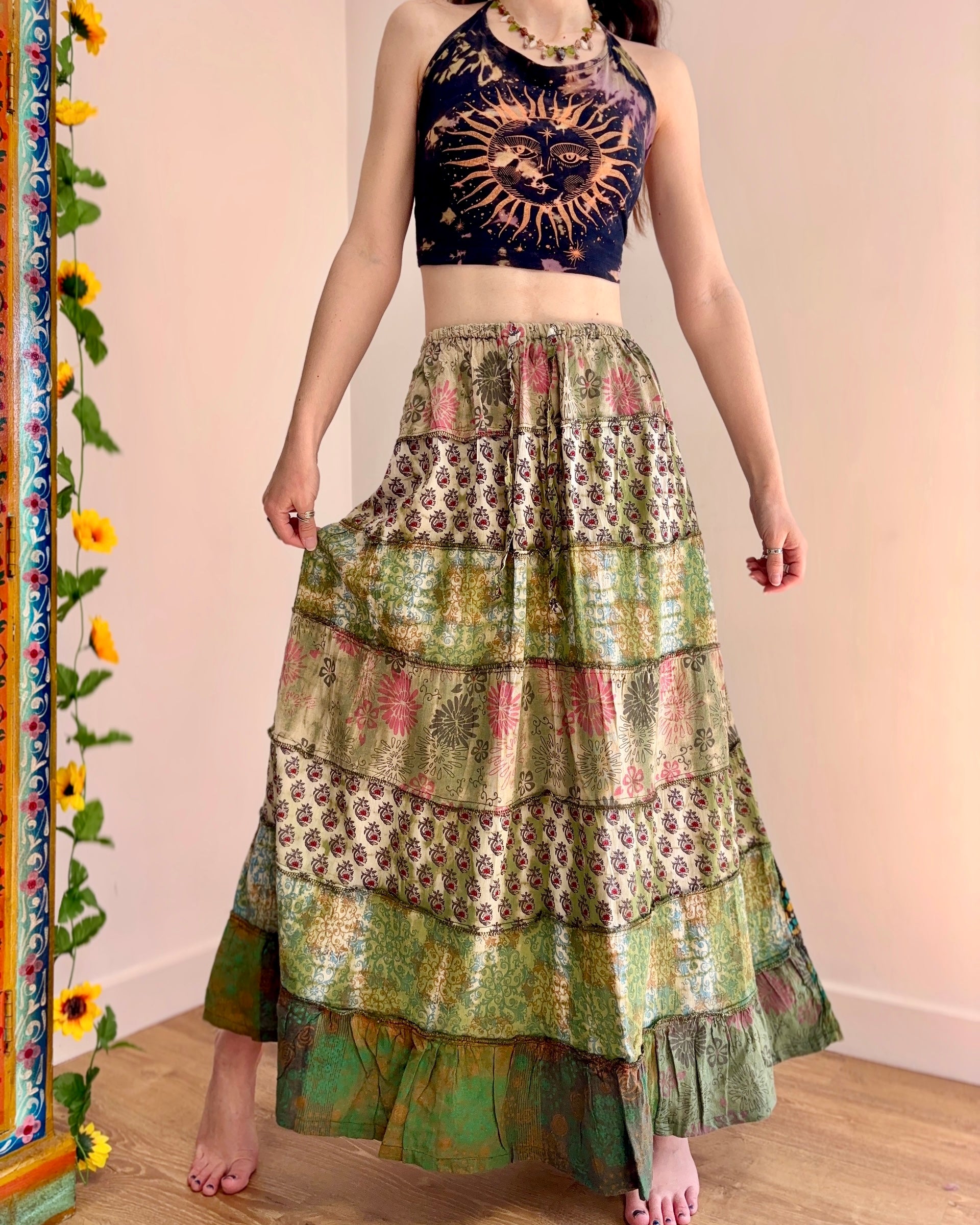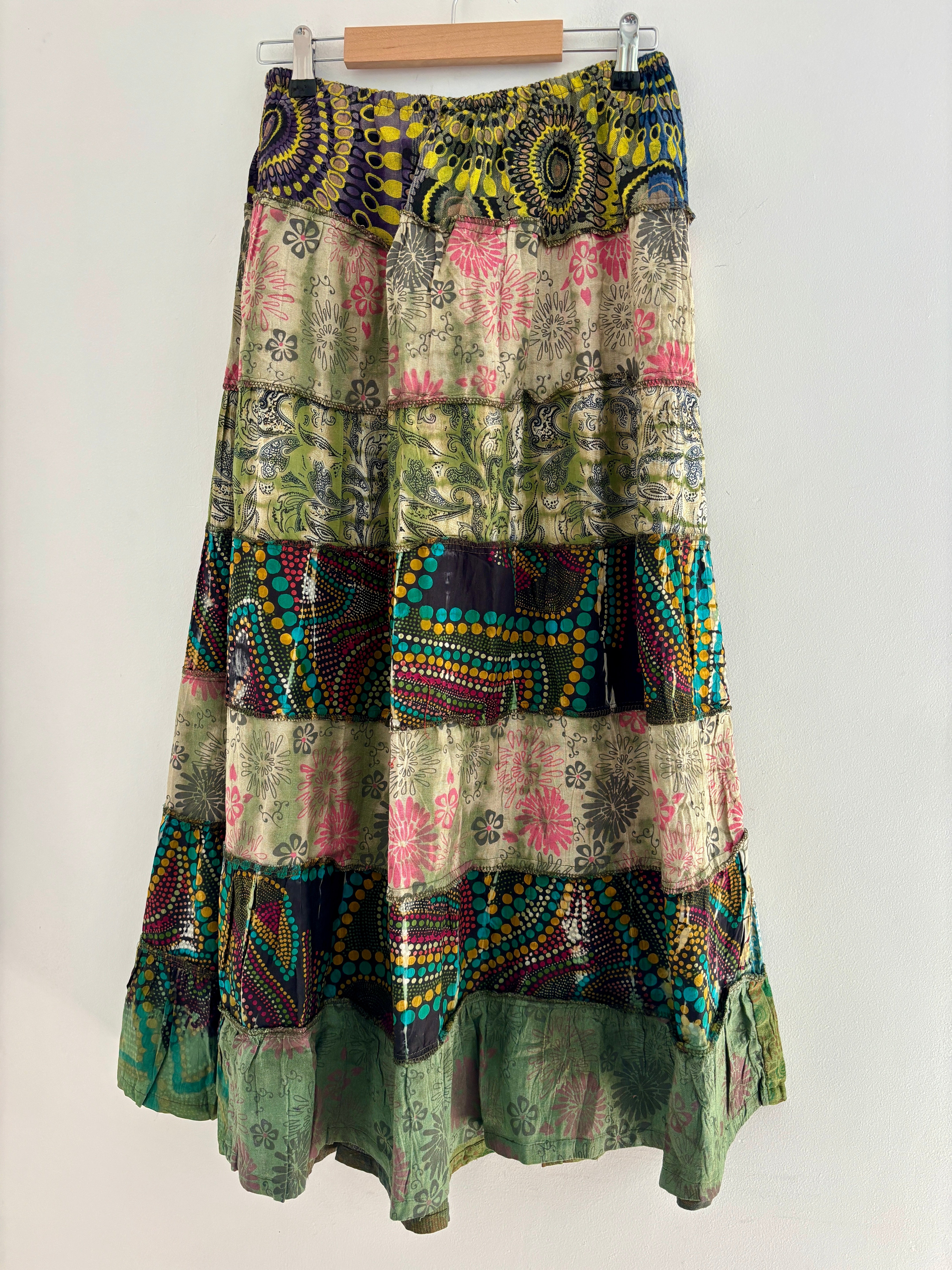These beautiful skirts are made from patches of green earthy fabric made in a variety of designs and using different dye techniques.