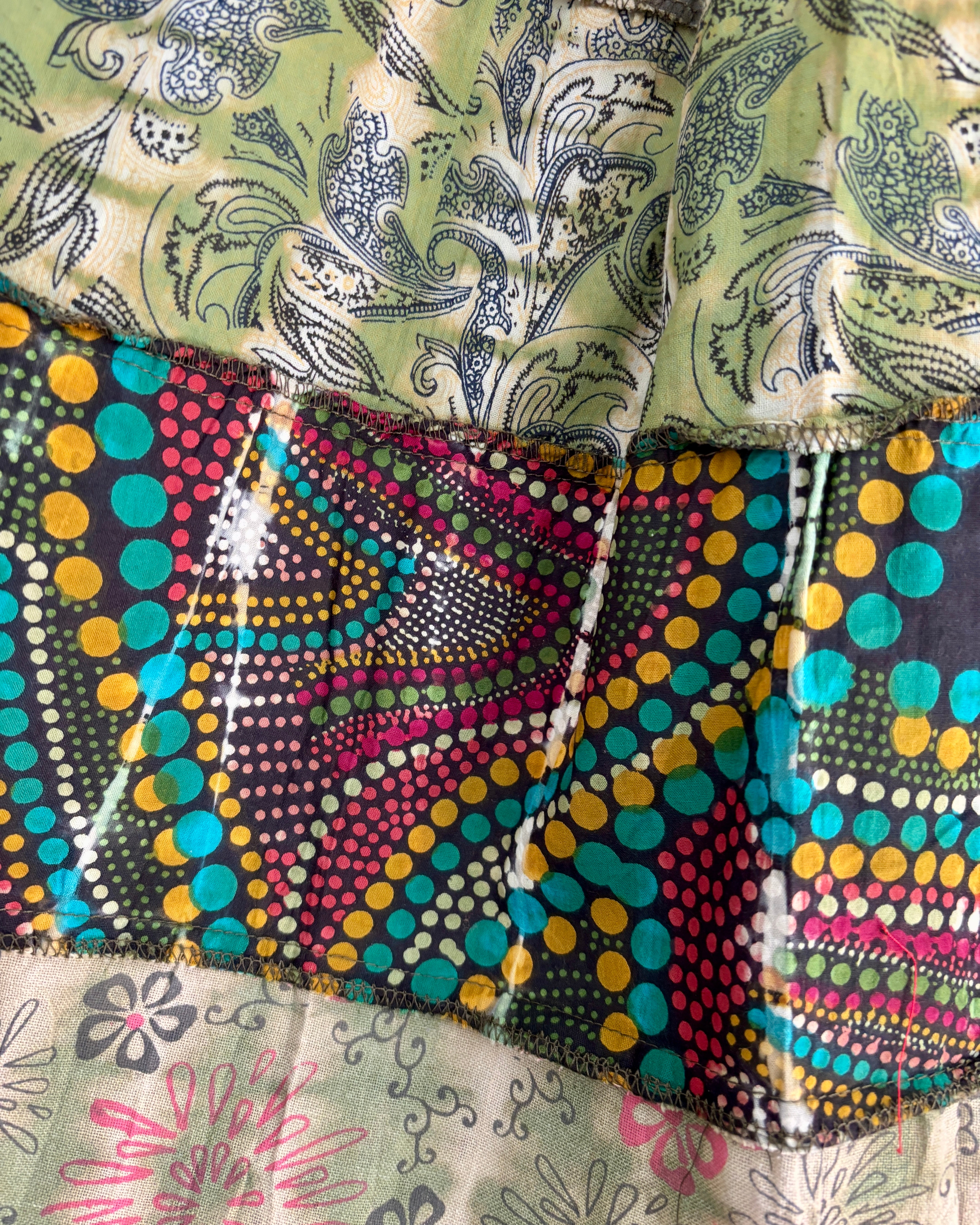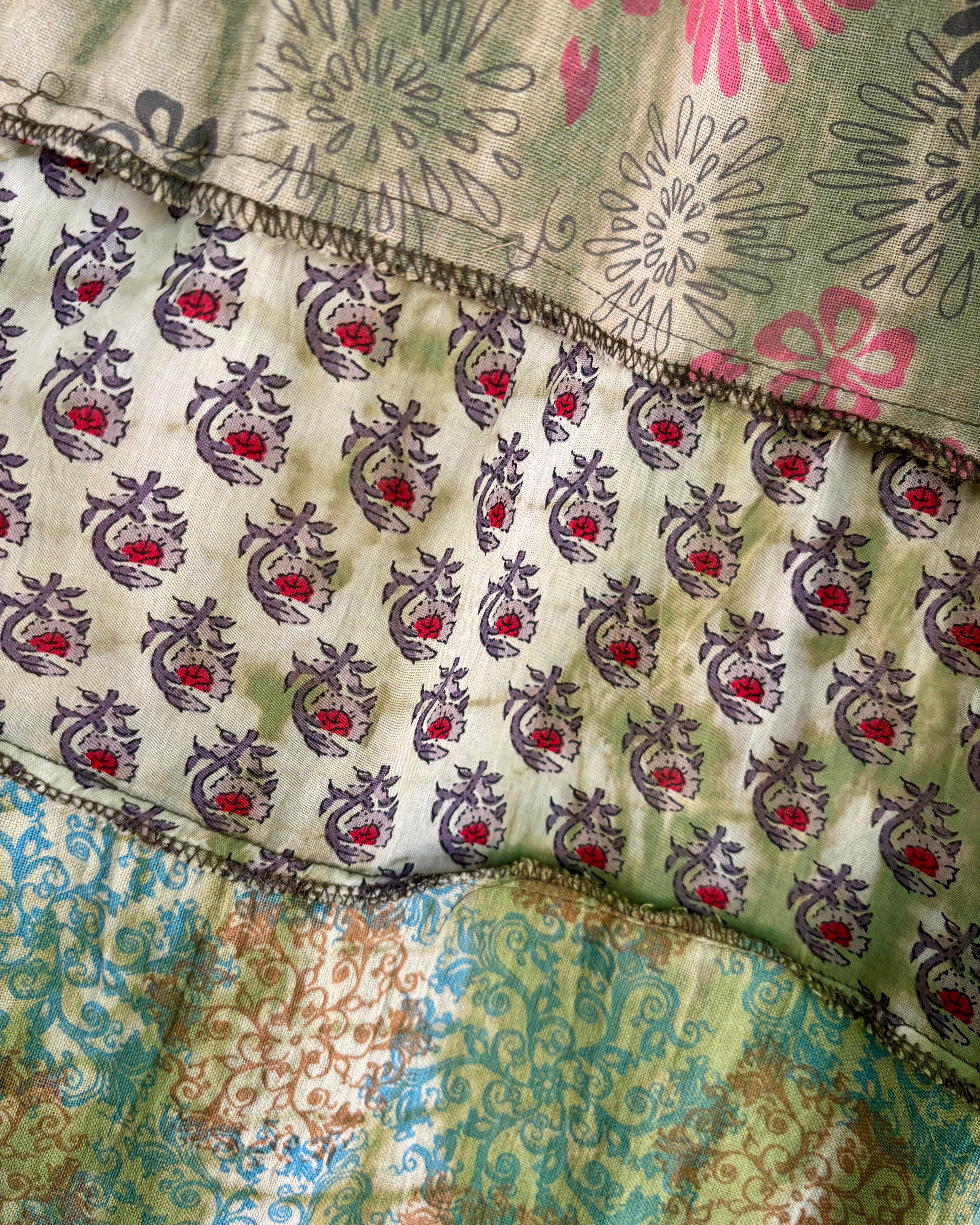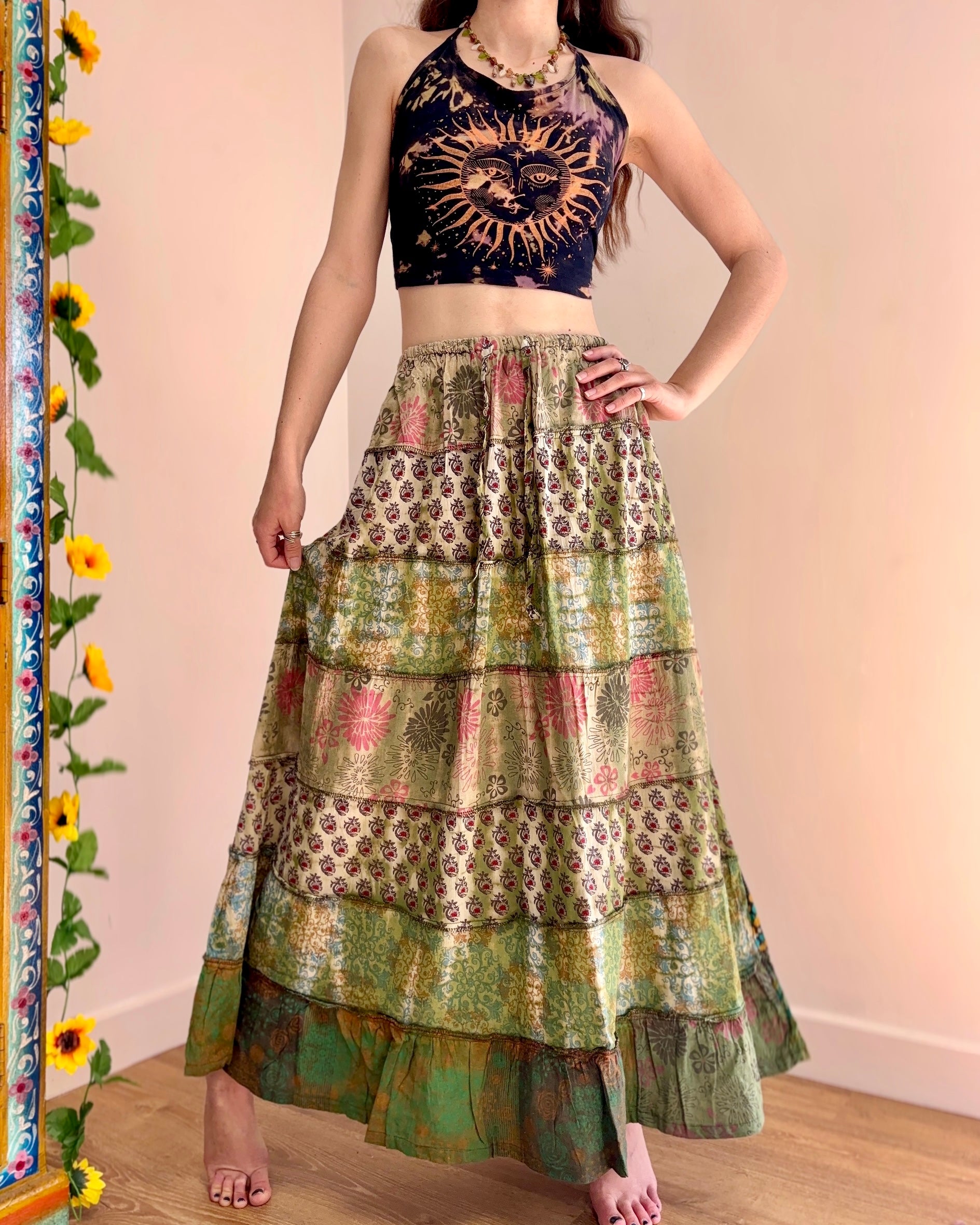 These beautiful skirts are made from patches of green earthy fabric made in a variety of designs and using different dye techniques.