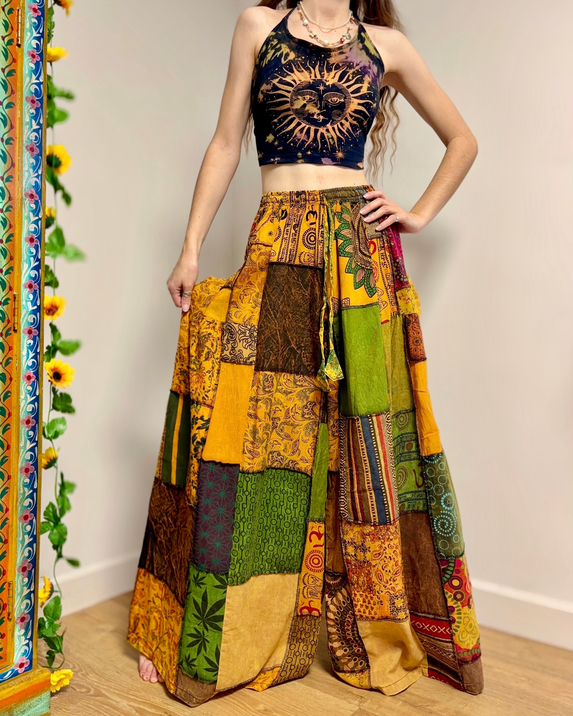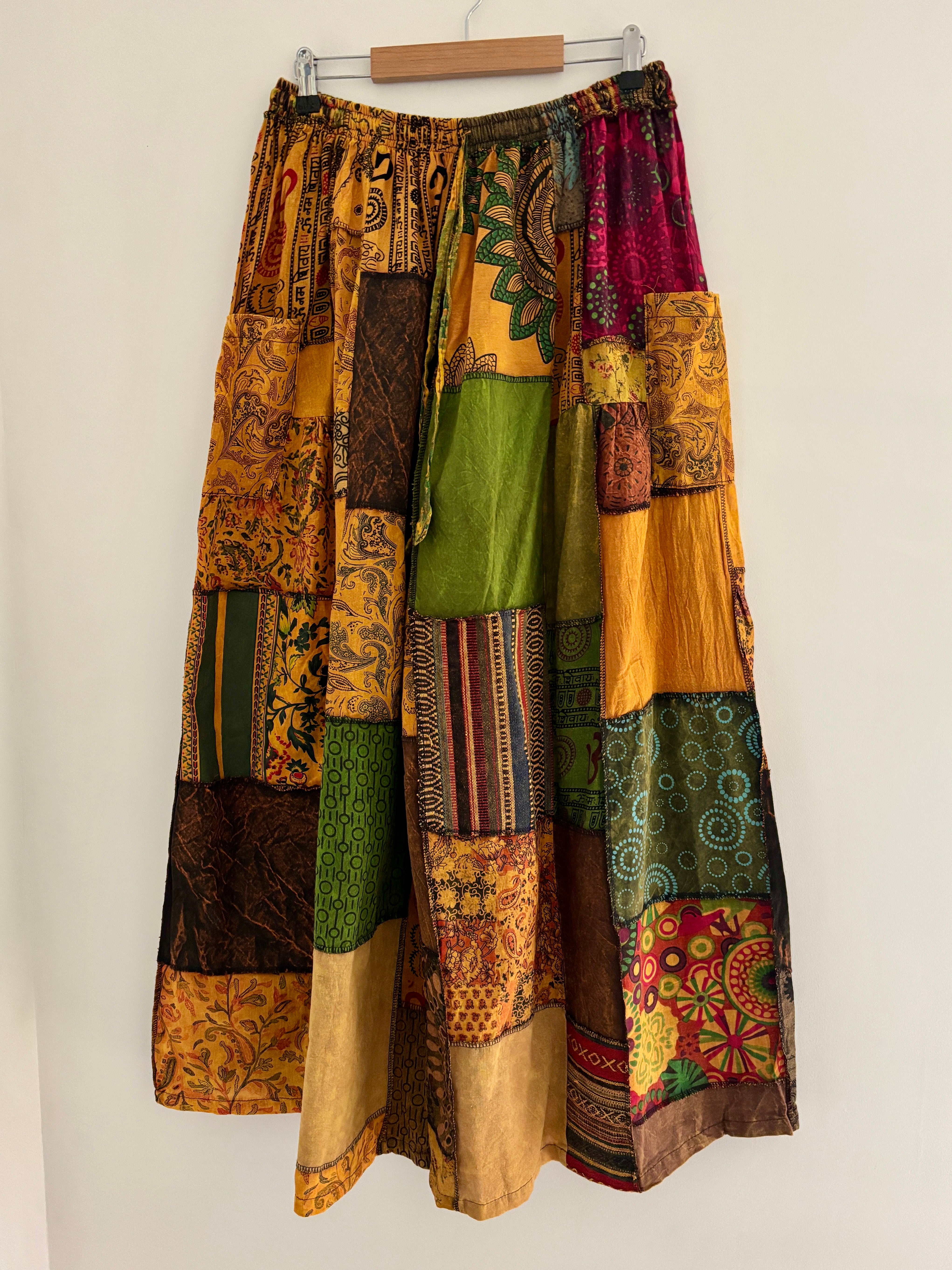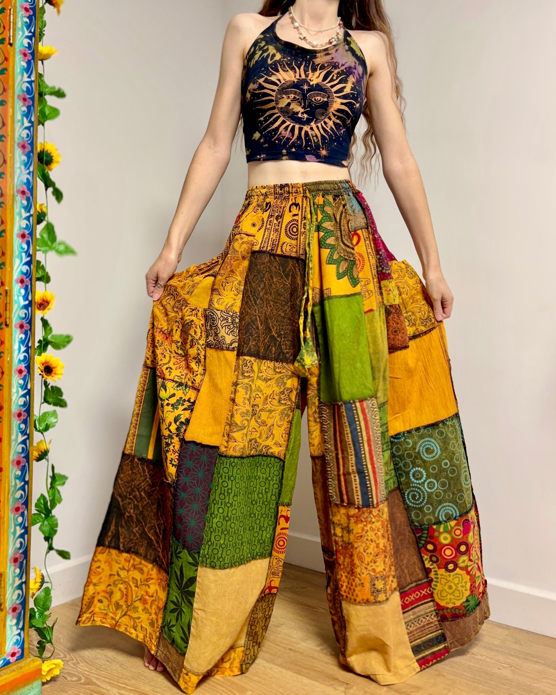 These palazzo trousers are made from patches of earthy green fabric. They have wide legs, have an elasticated waist and two front pockets for a comfortable fit. Colours of patches vary.