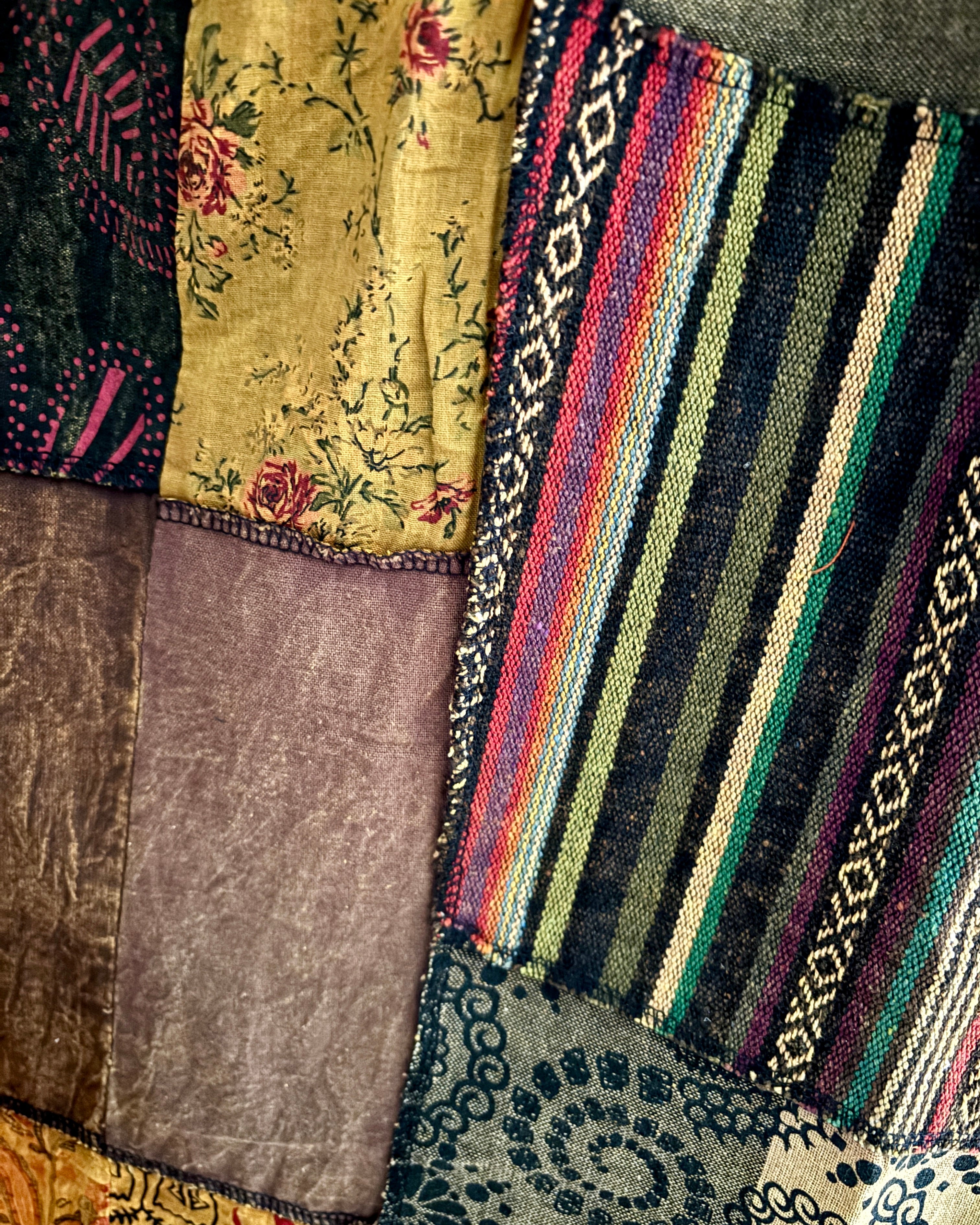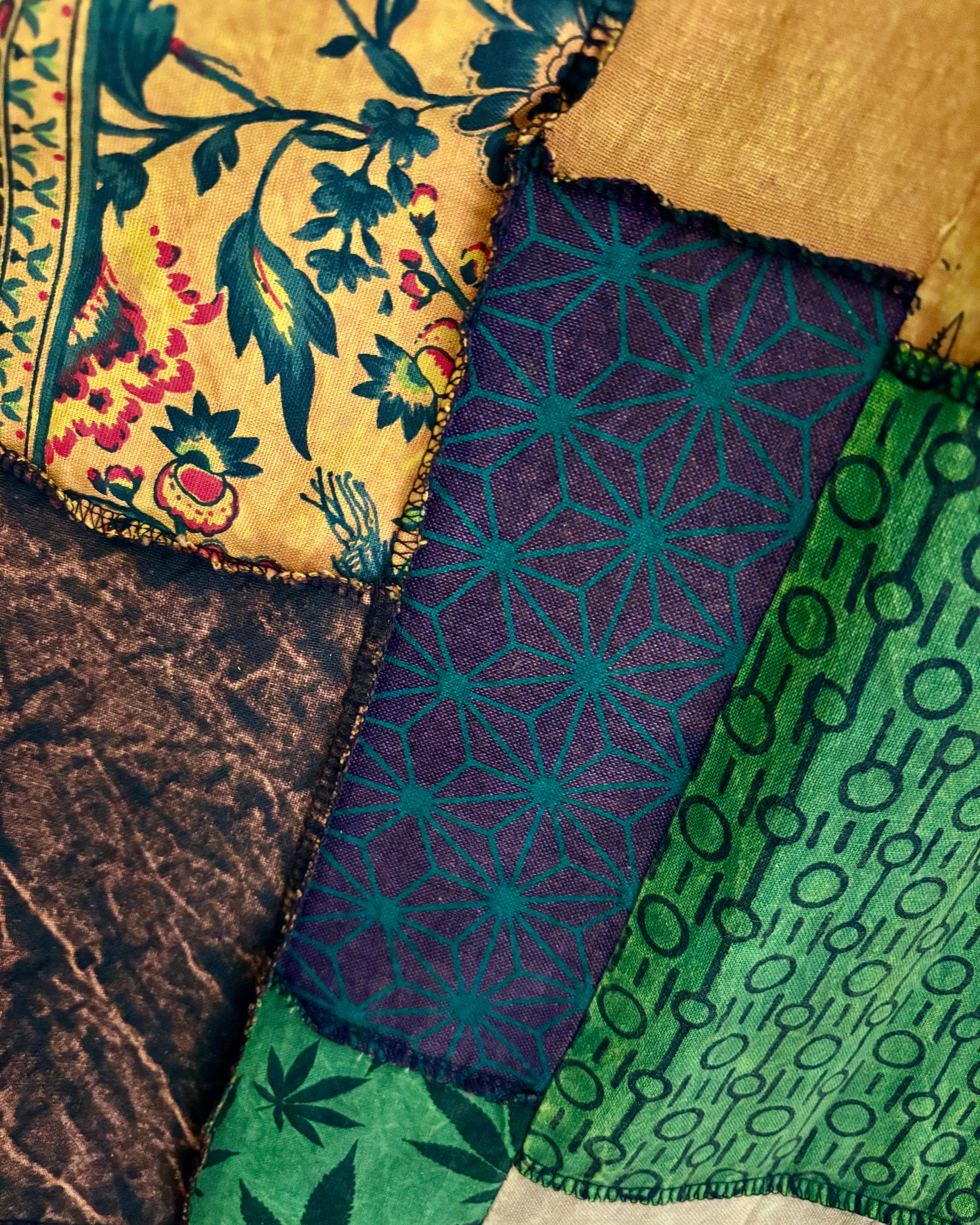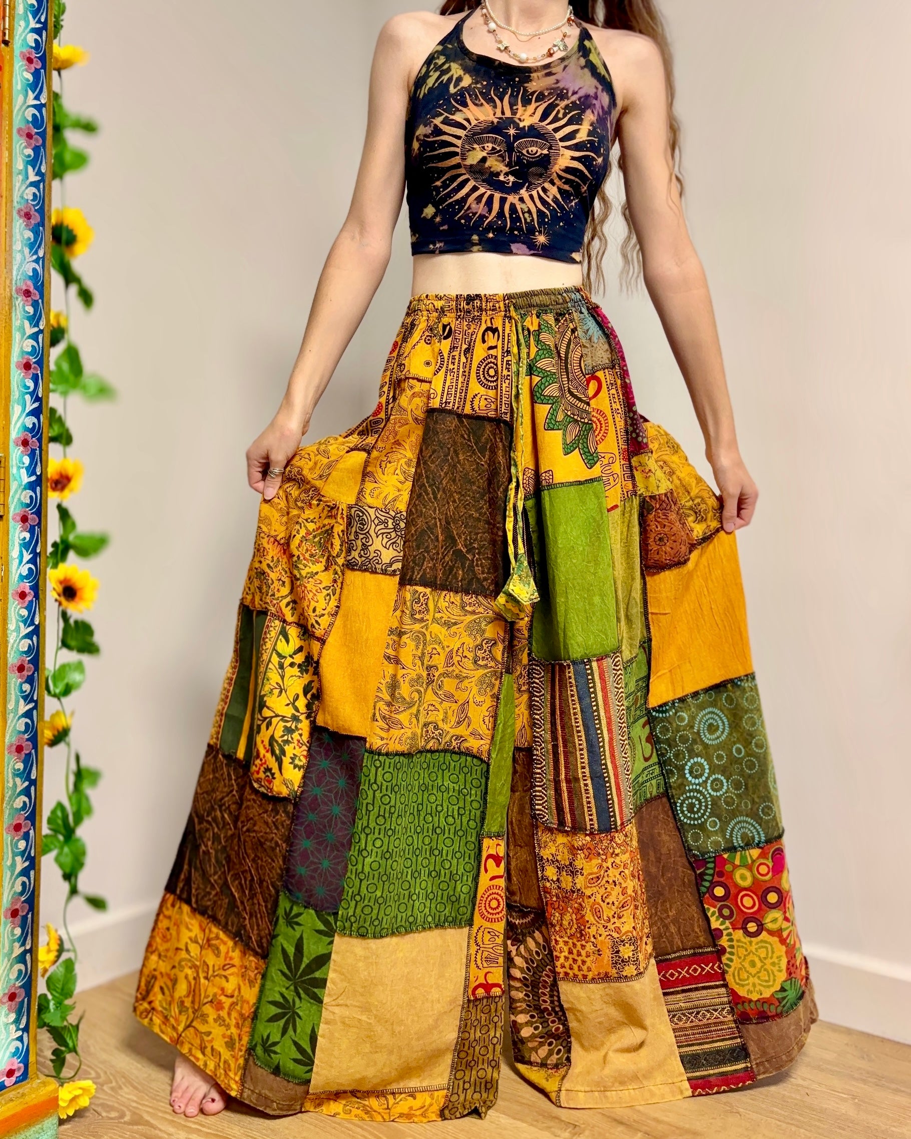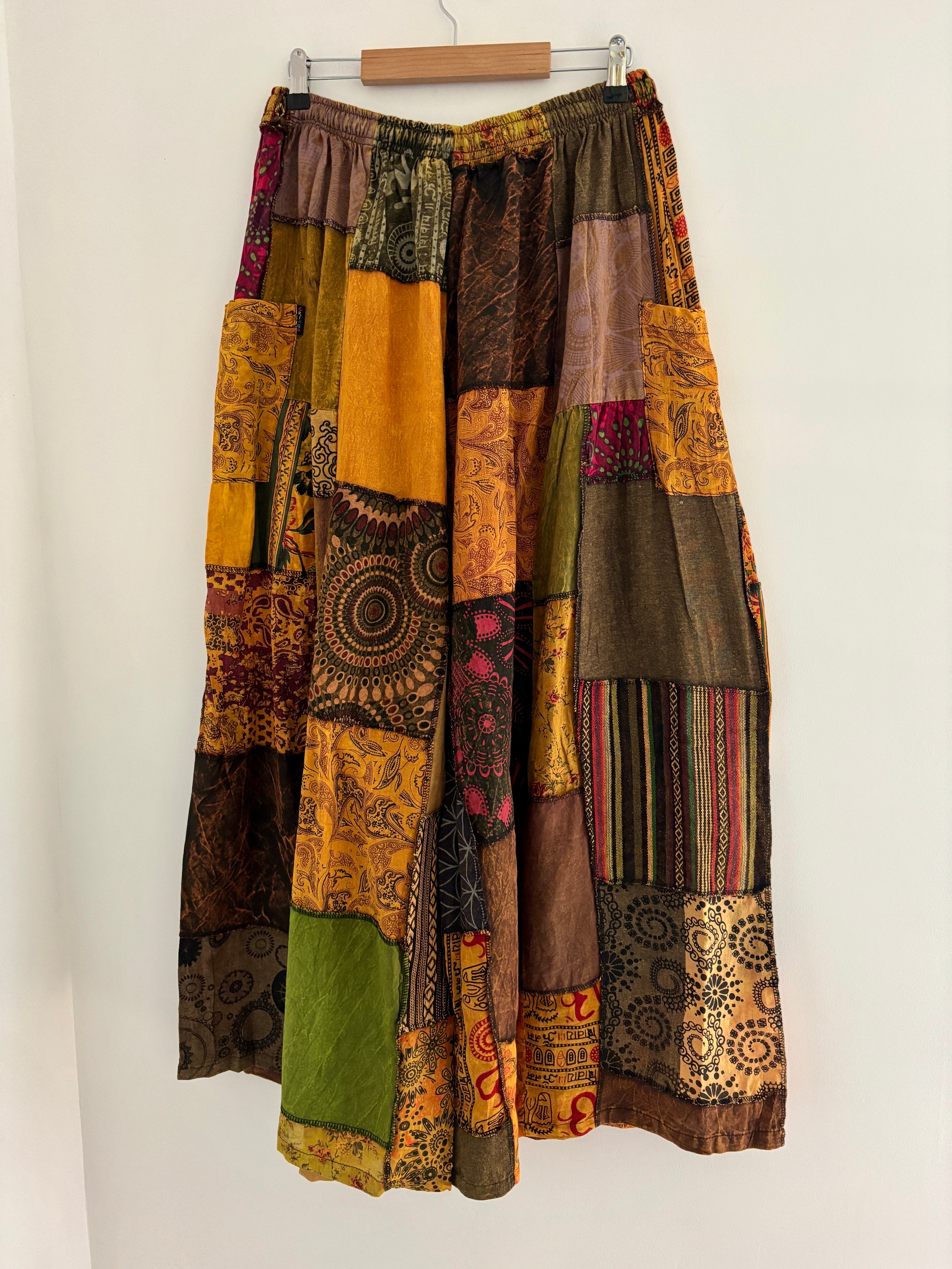 These palazzo trousers are made from patches of earthy green fabric. They have wide legs, have an elasticated waist and two front pockets for a comfortable fit. Colours of patches vary.