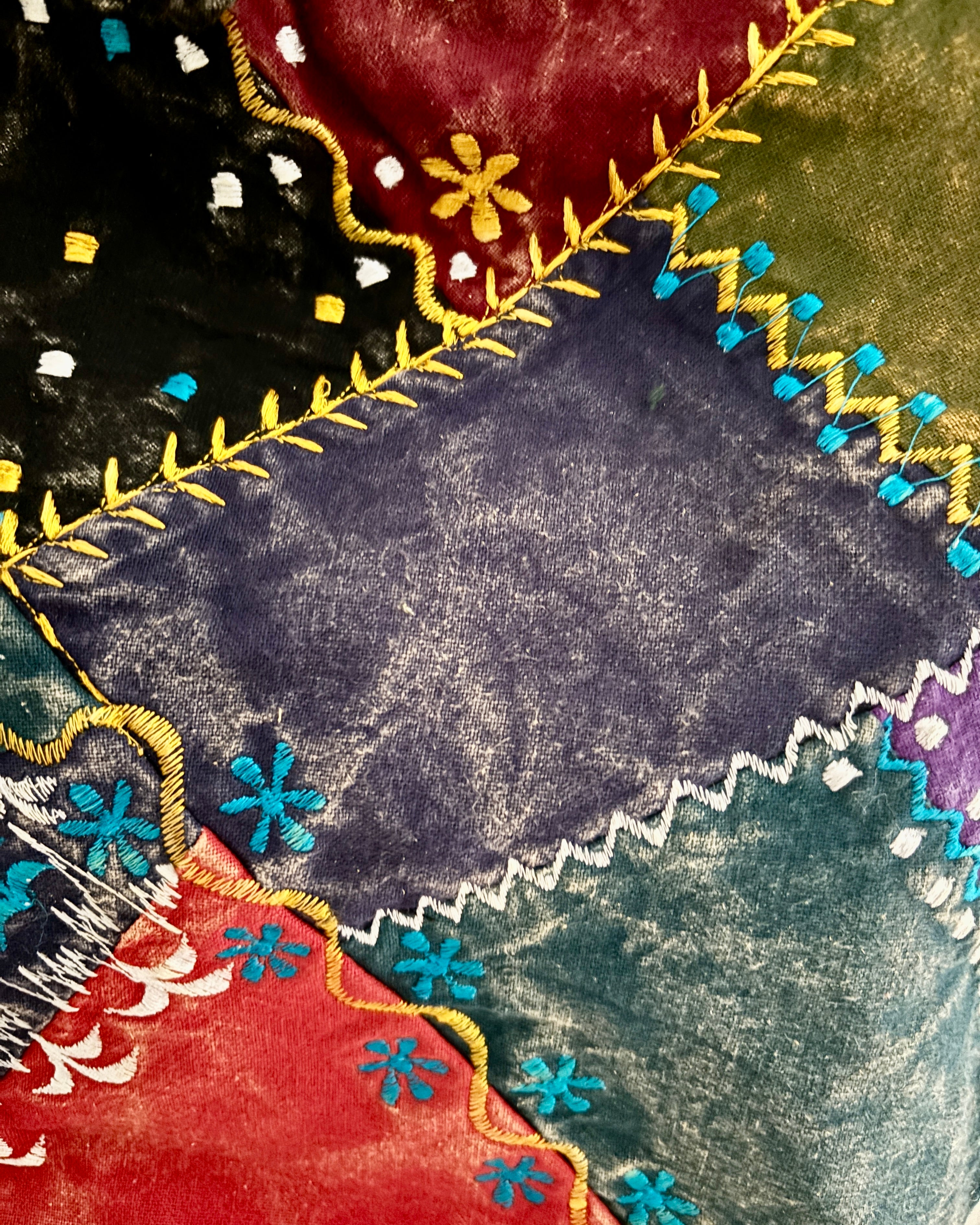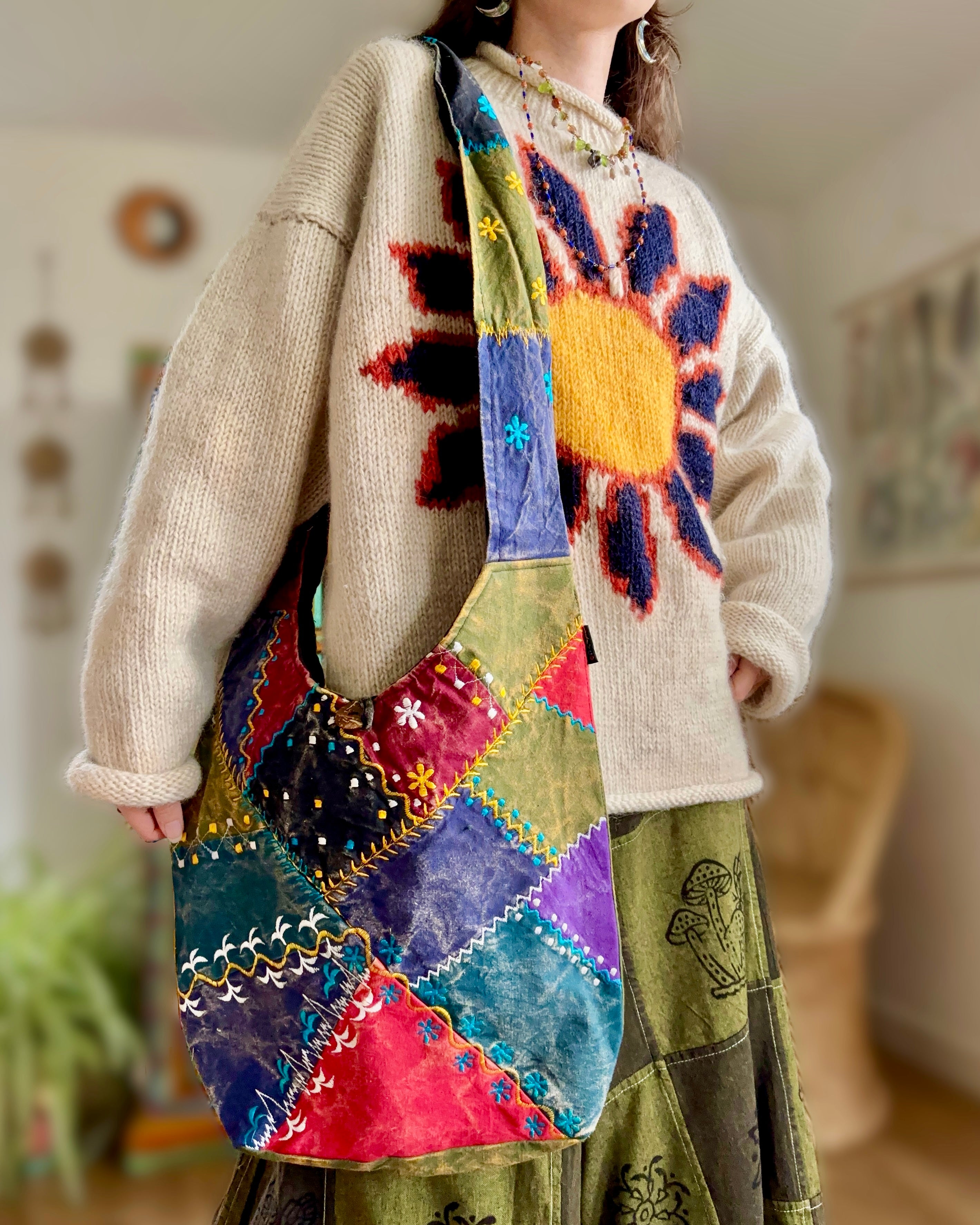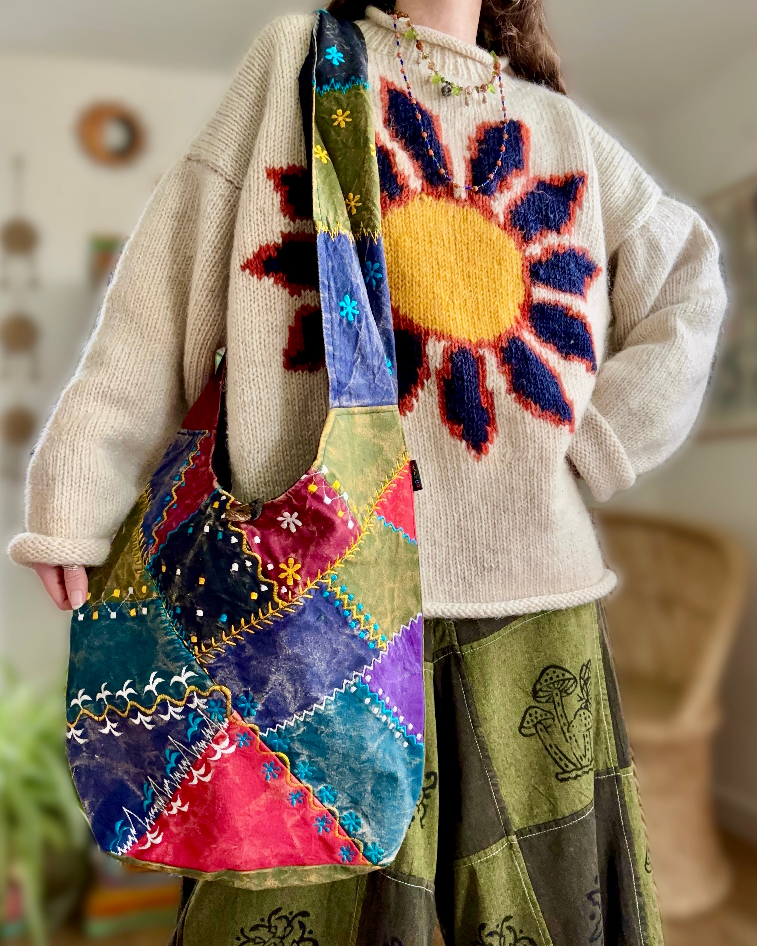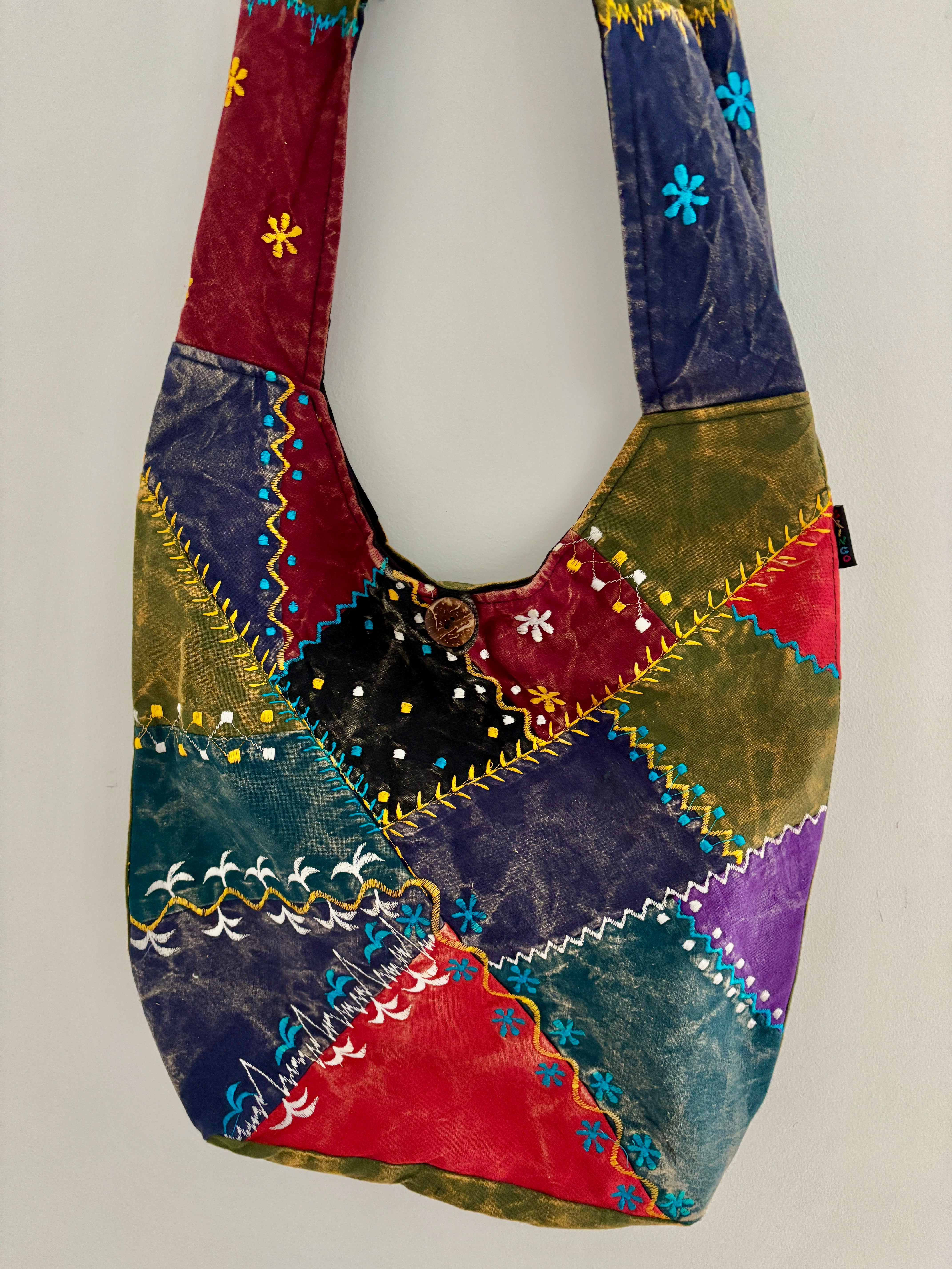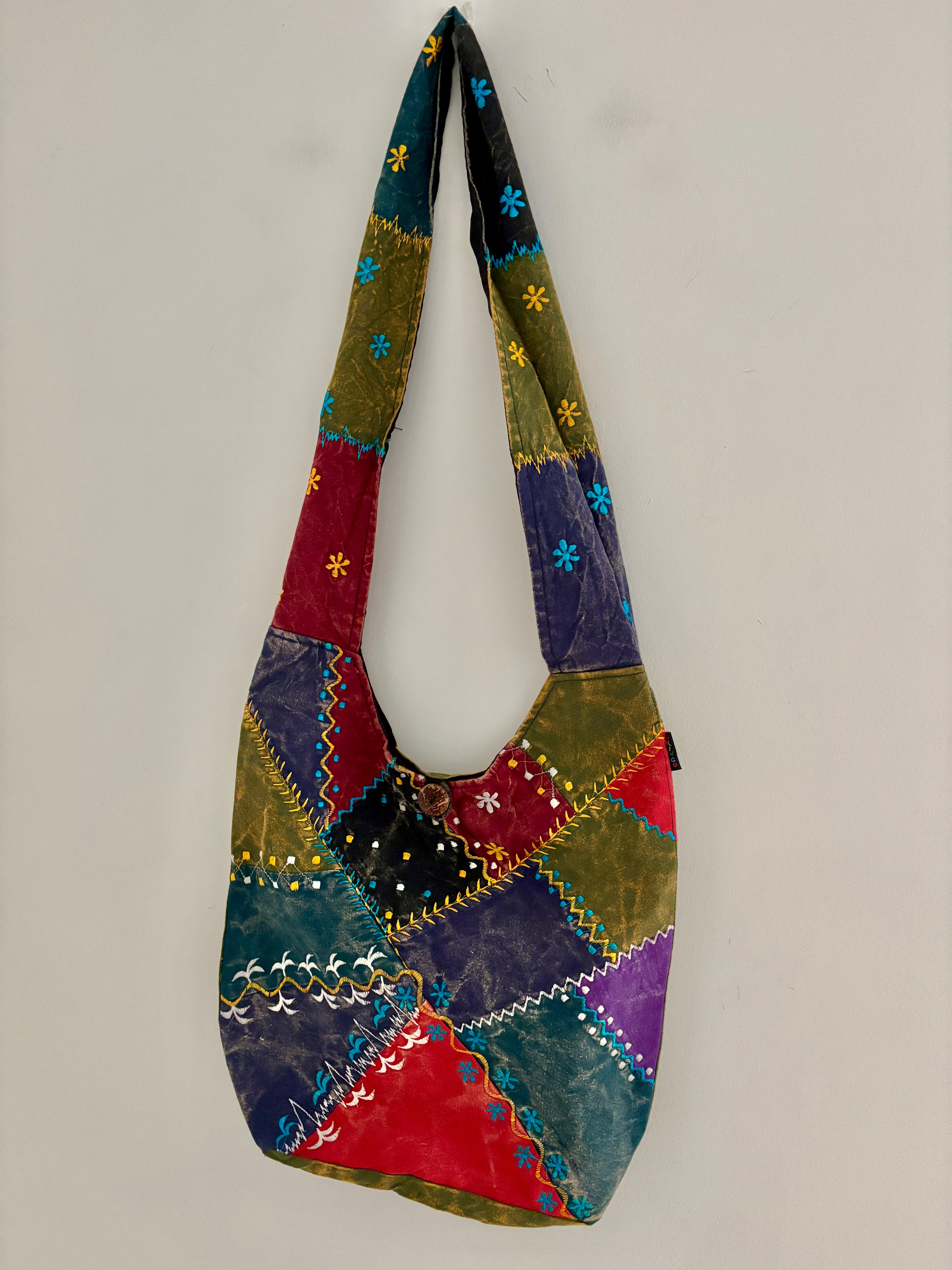This hippie shoulder bag is made from patches of colourful fabric decorated with embroidery and stitching on the front. Bag measures 36x33cm, 80cm in full length.