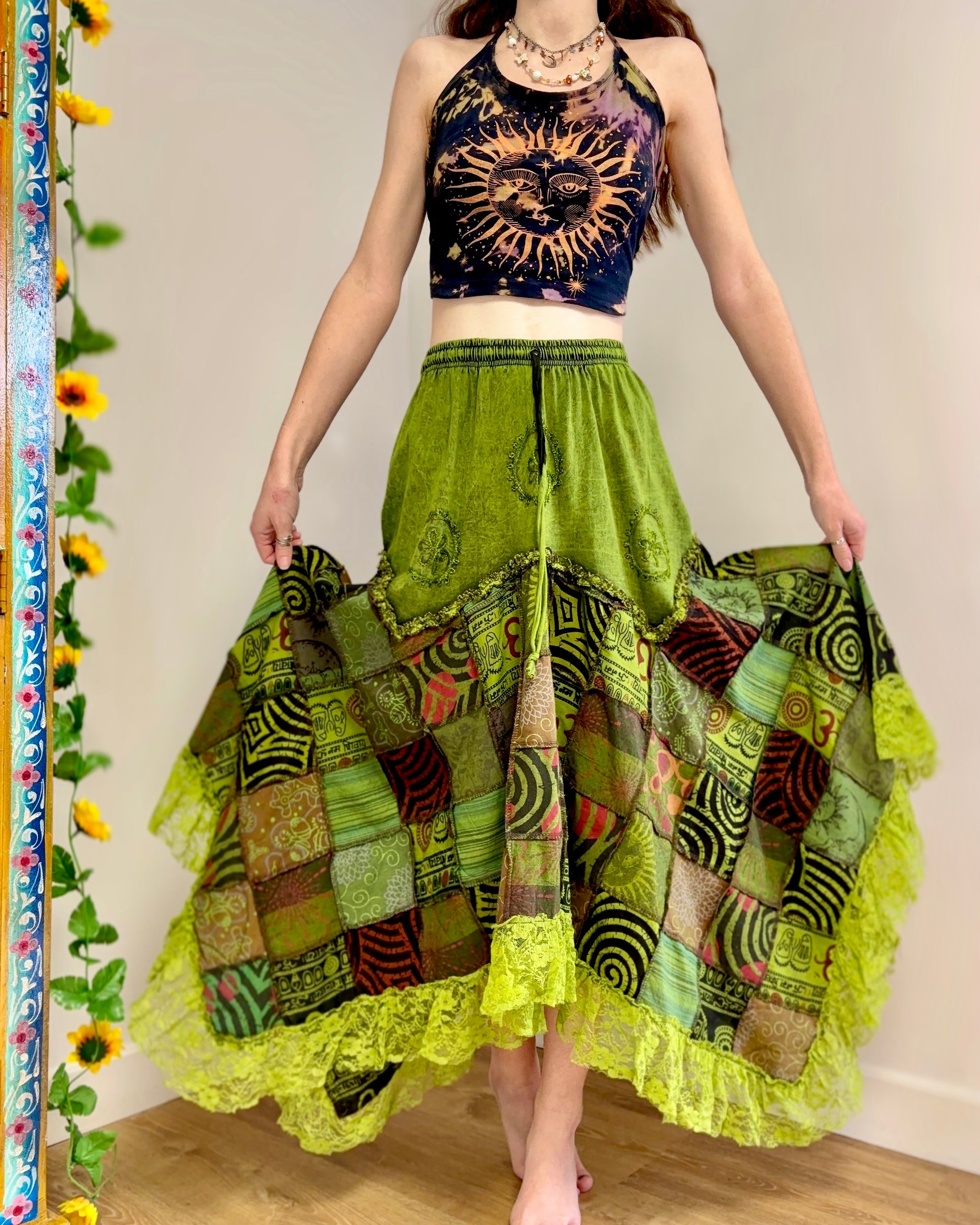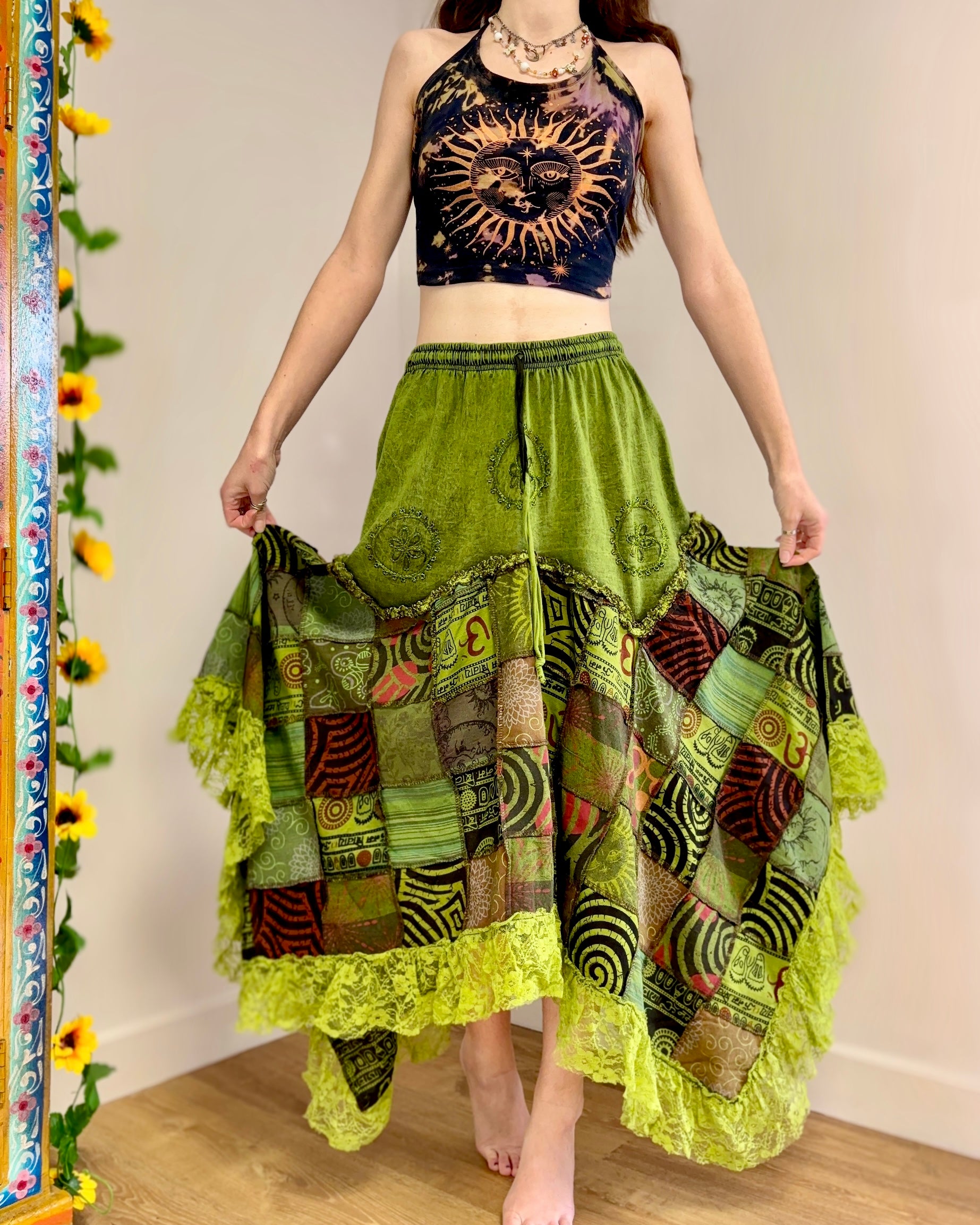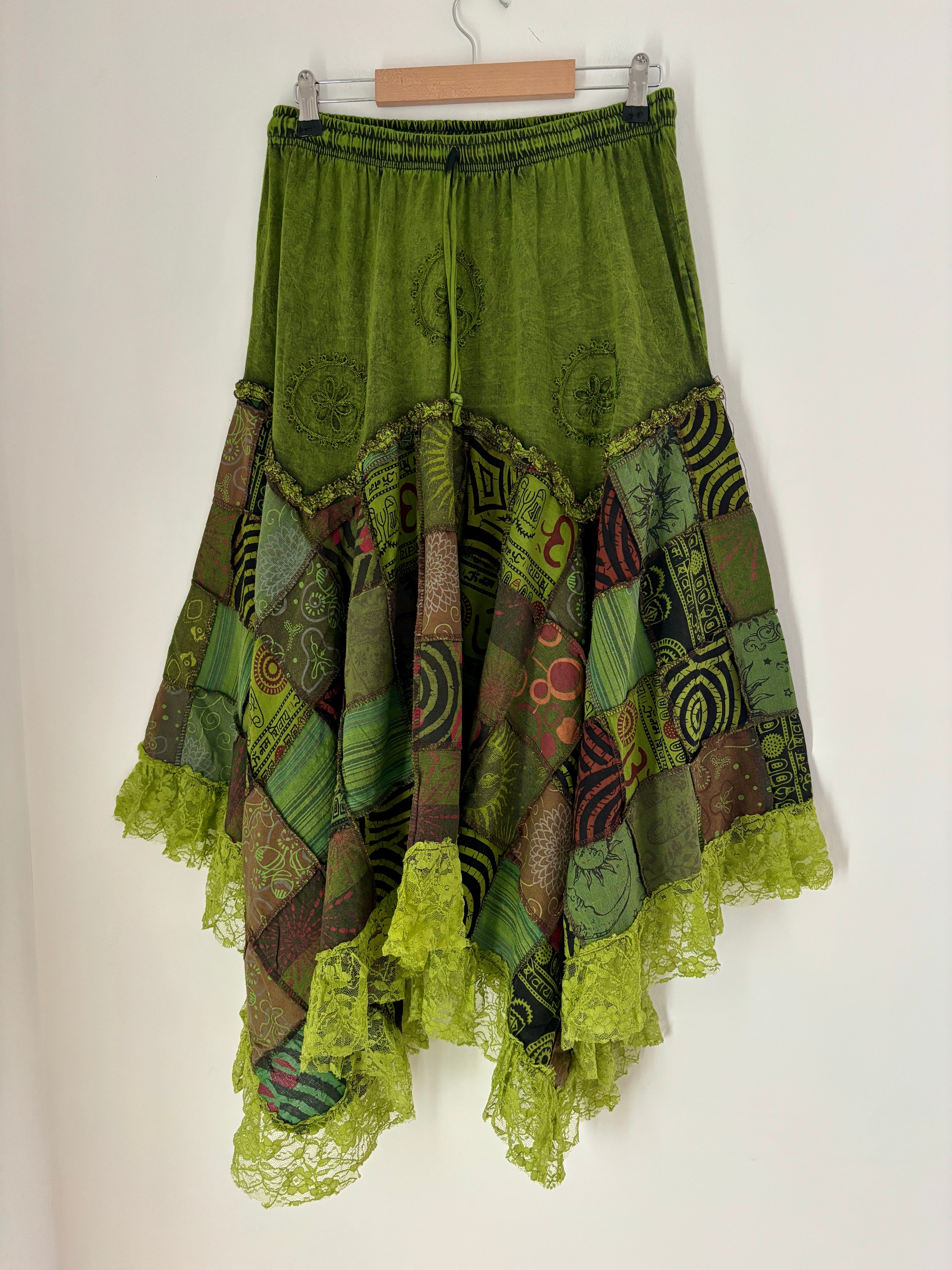 This magical green skirt features earthy celestial patchwork and lace, with an asymmetric style bottom giving a fairy hippie look.