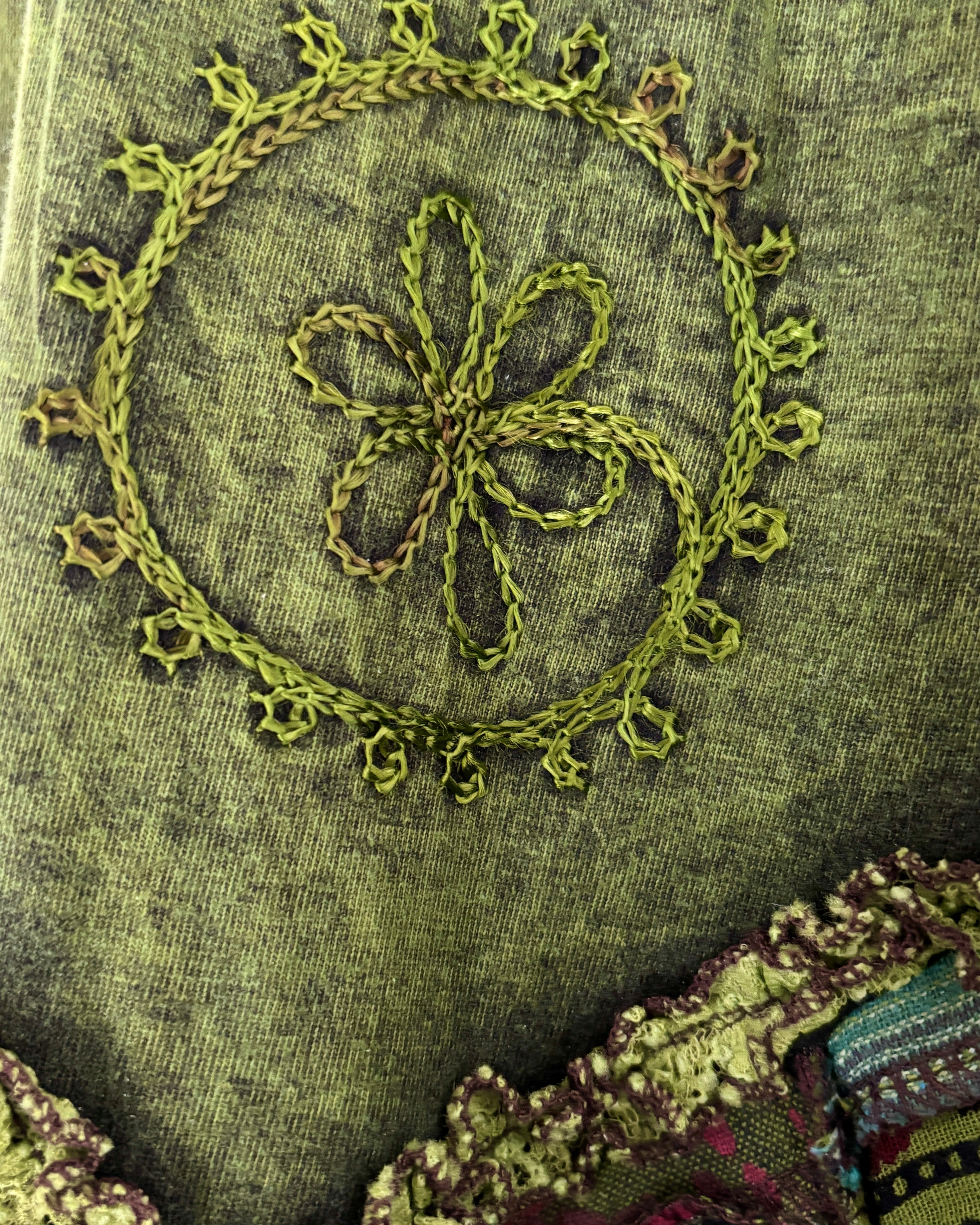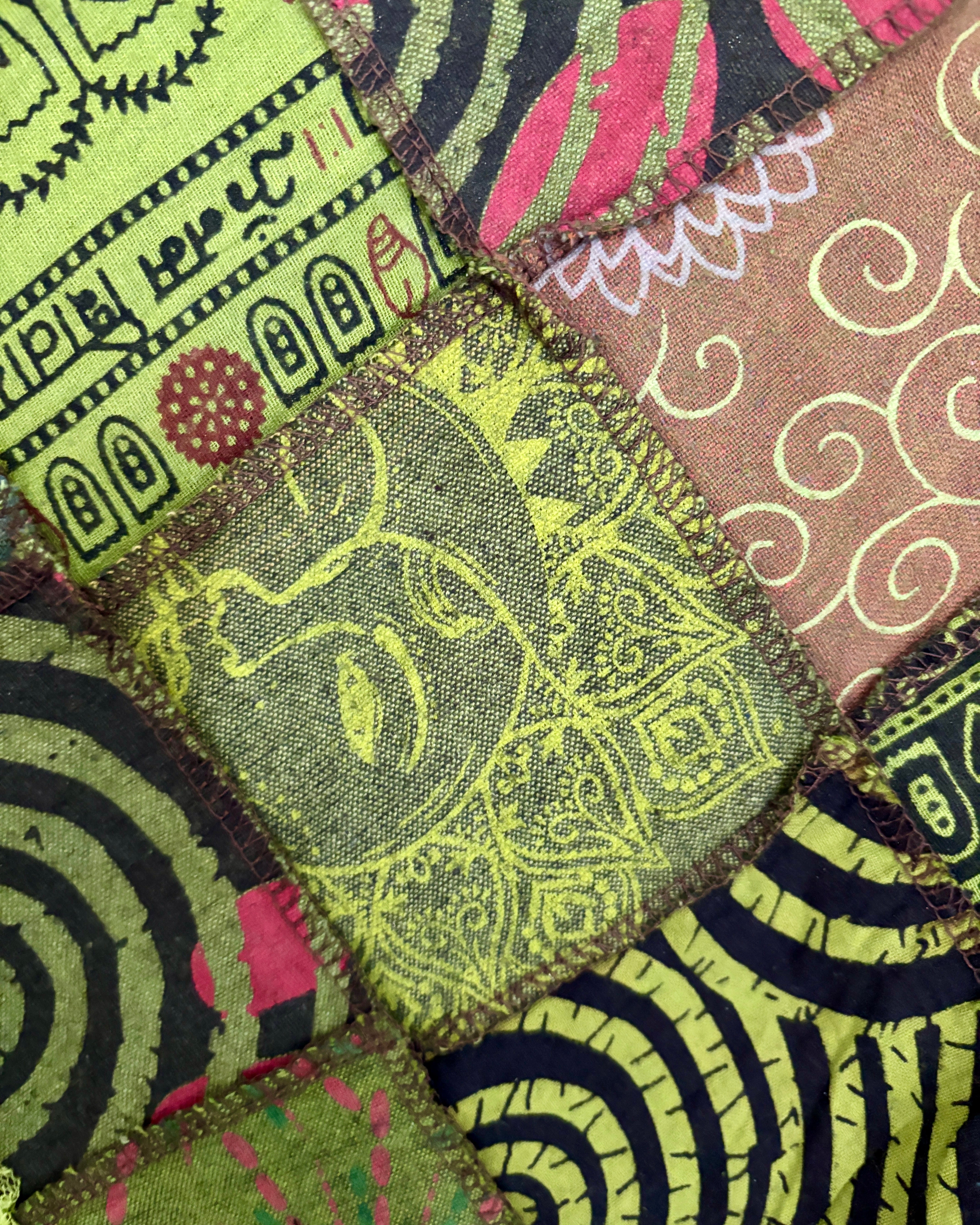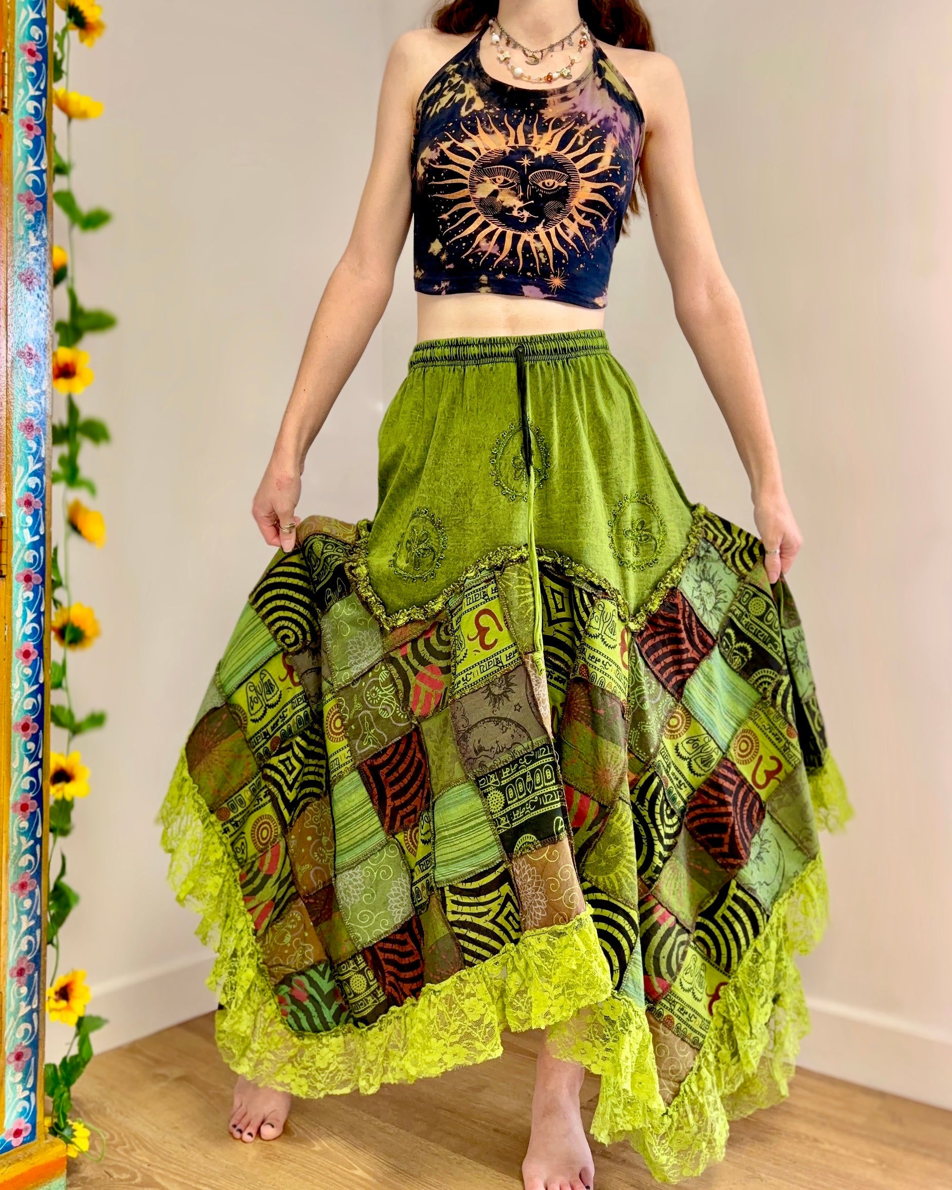 This magical green skirt features earthy celestial patchwork and lace, with an asymmetric style bottom giving a fairy hippie look.
