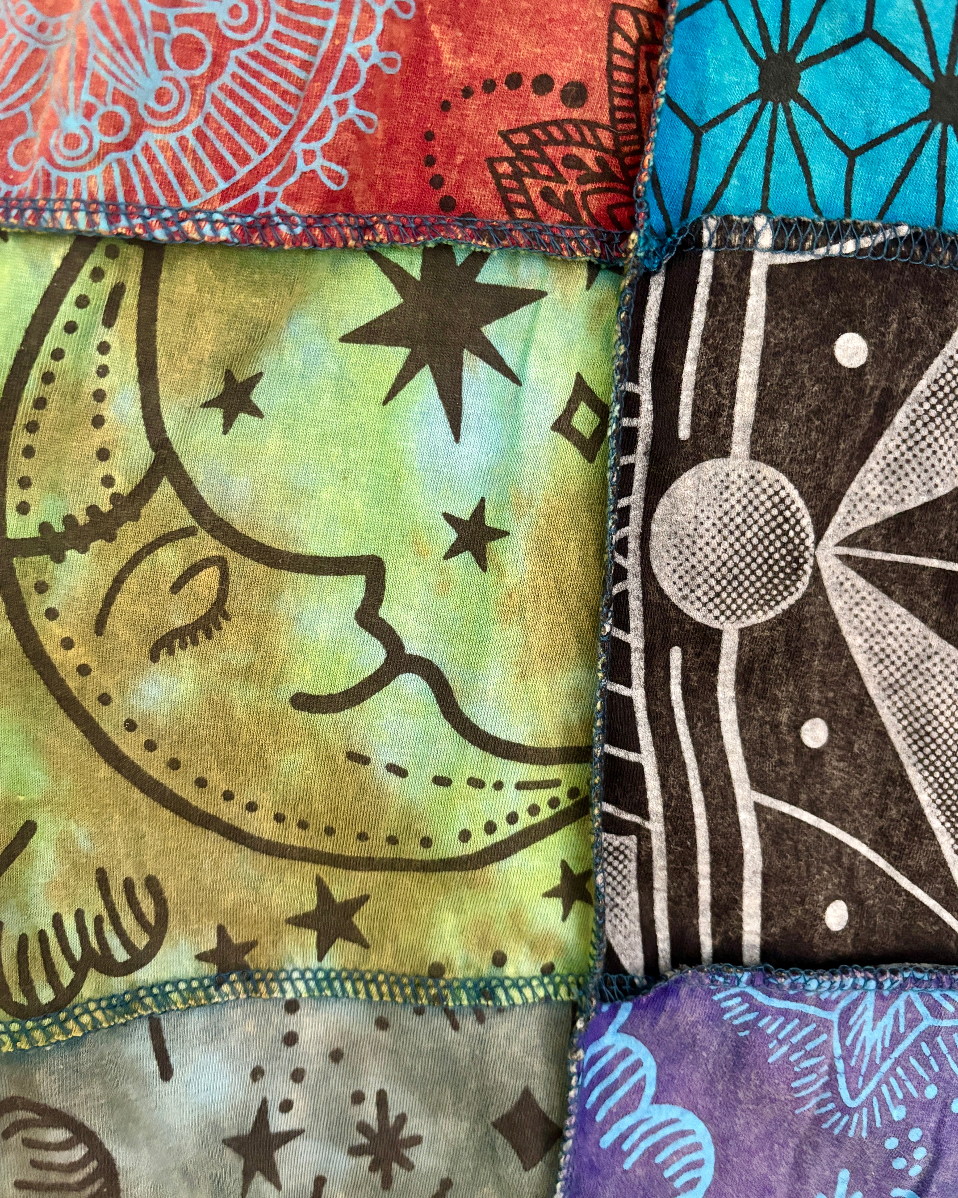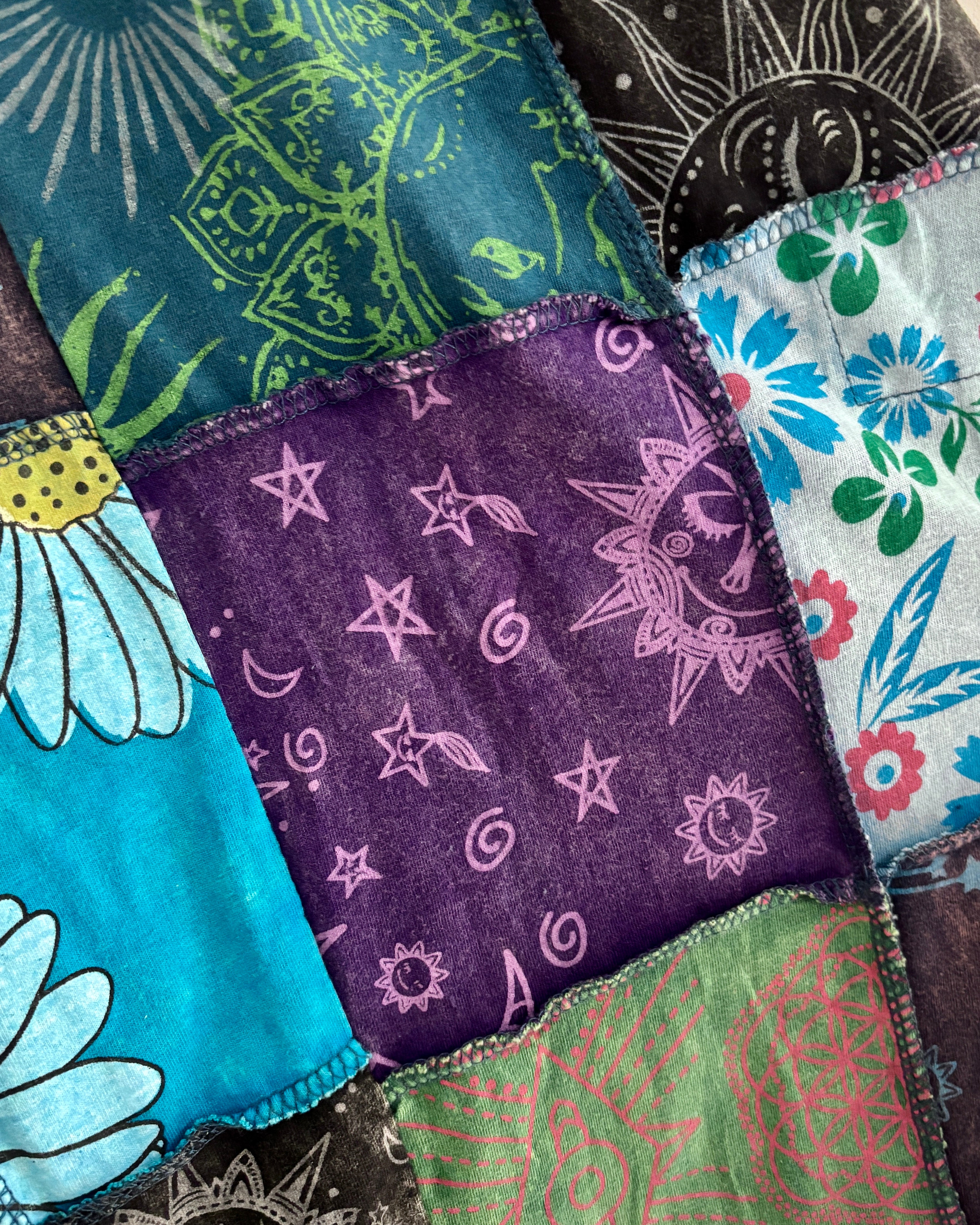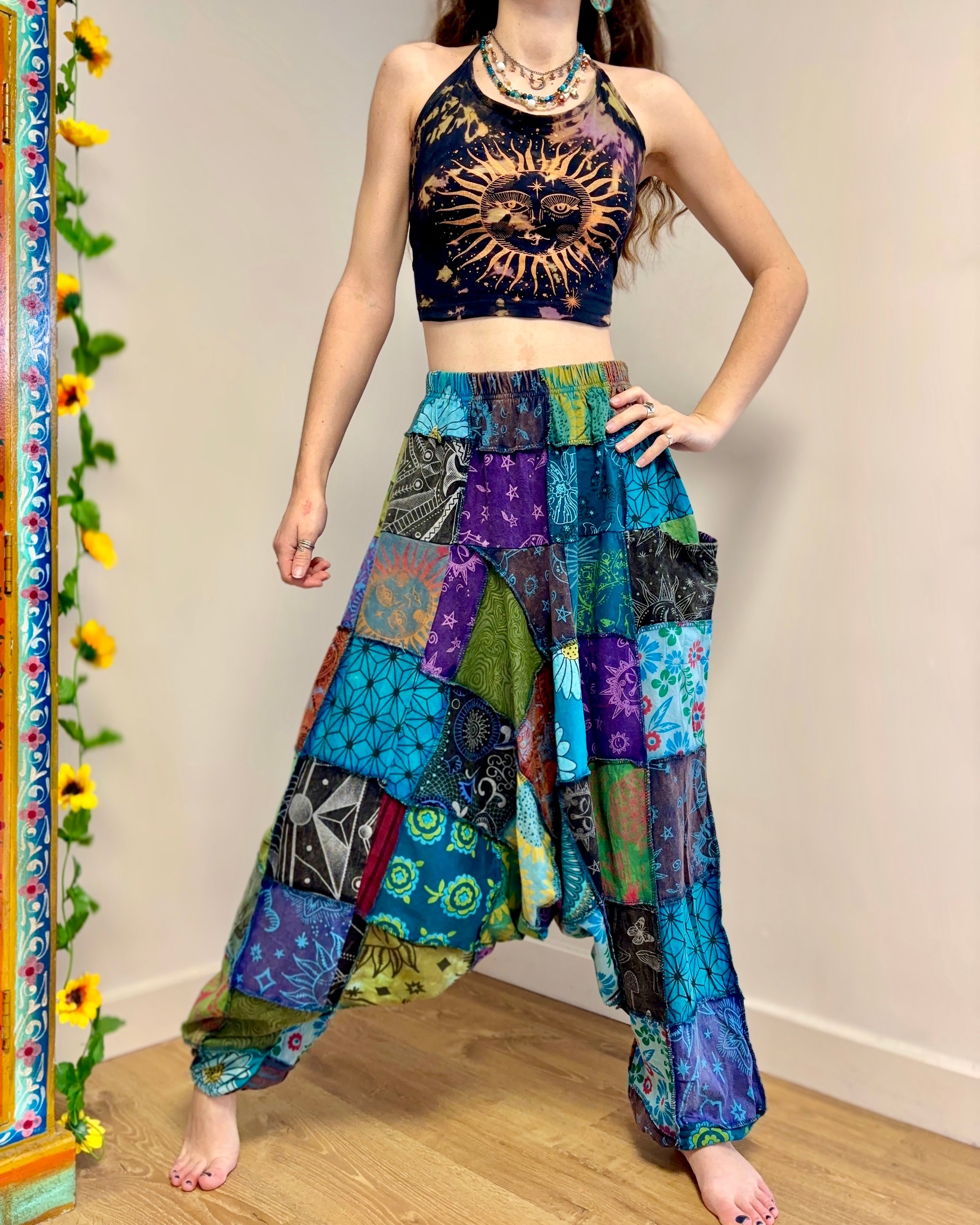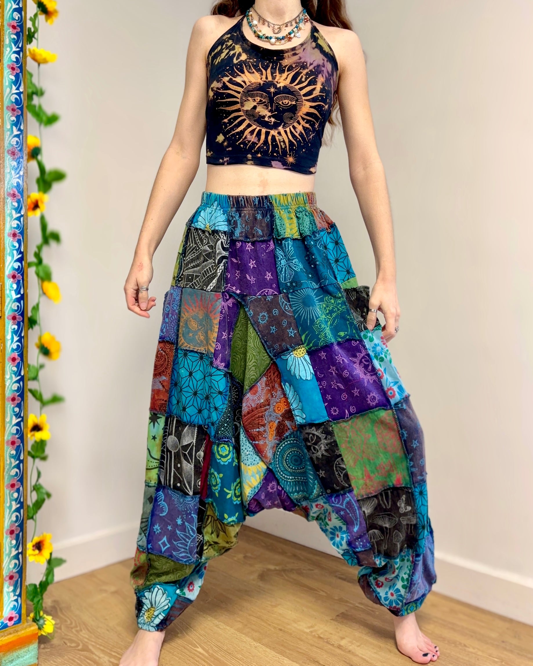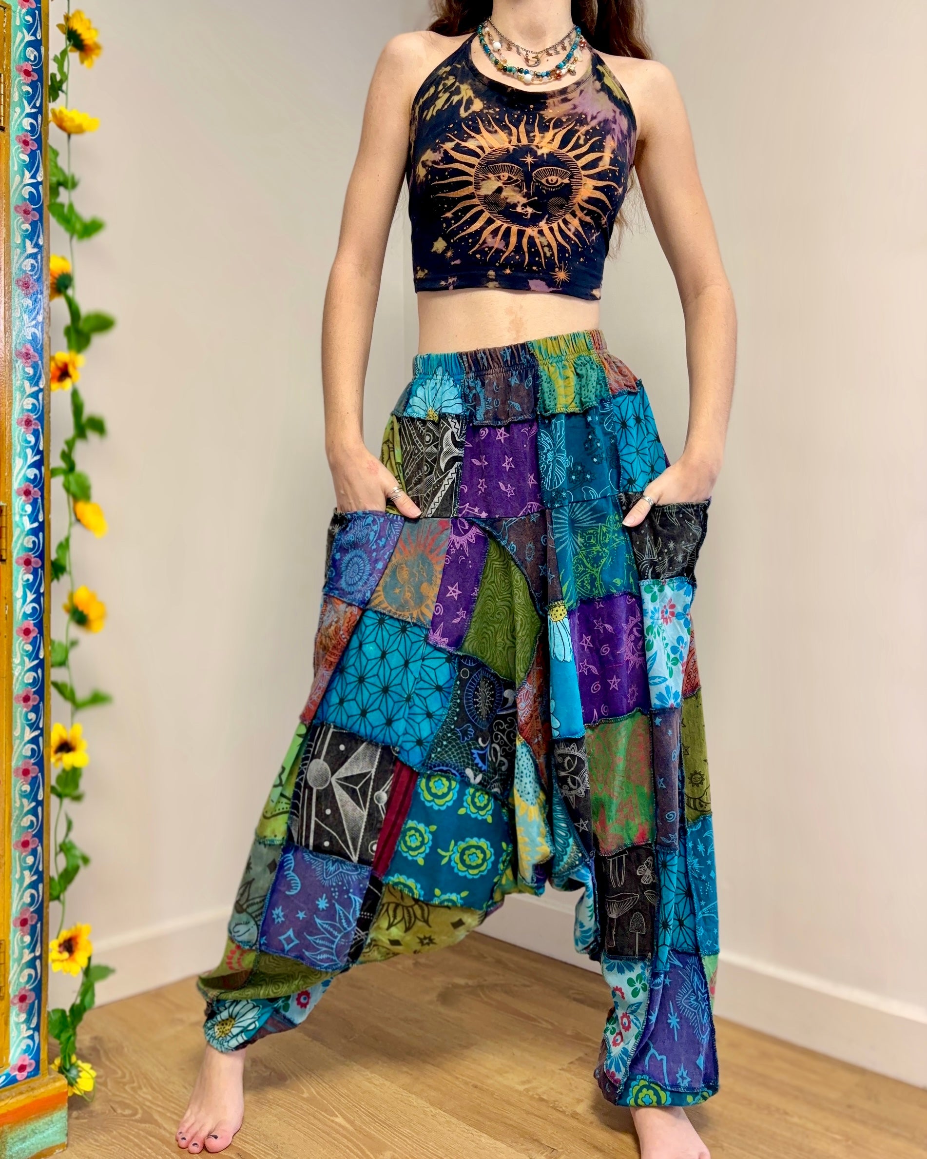 These Afghani-style harem pants are made from patches of fabric in a range of funky patterns. They have a low crocth, elasticated waist and two side pockets.