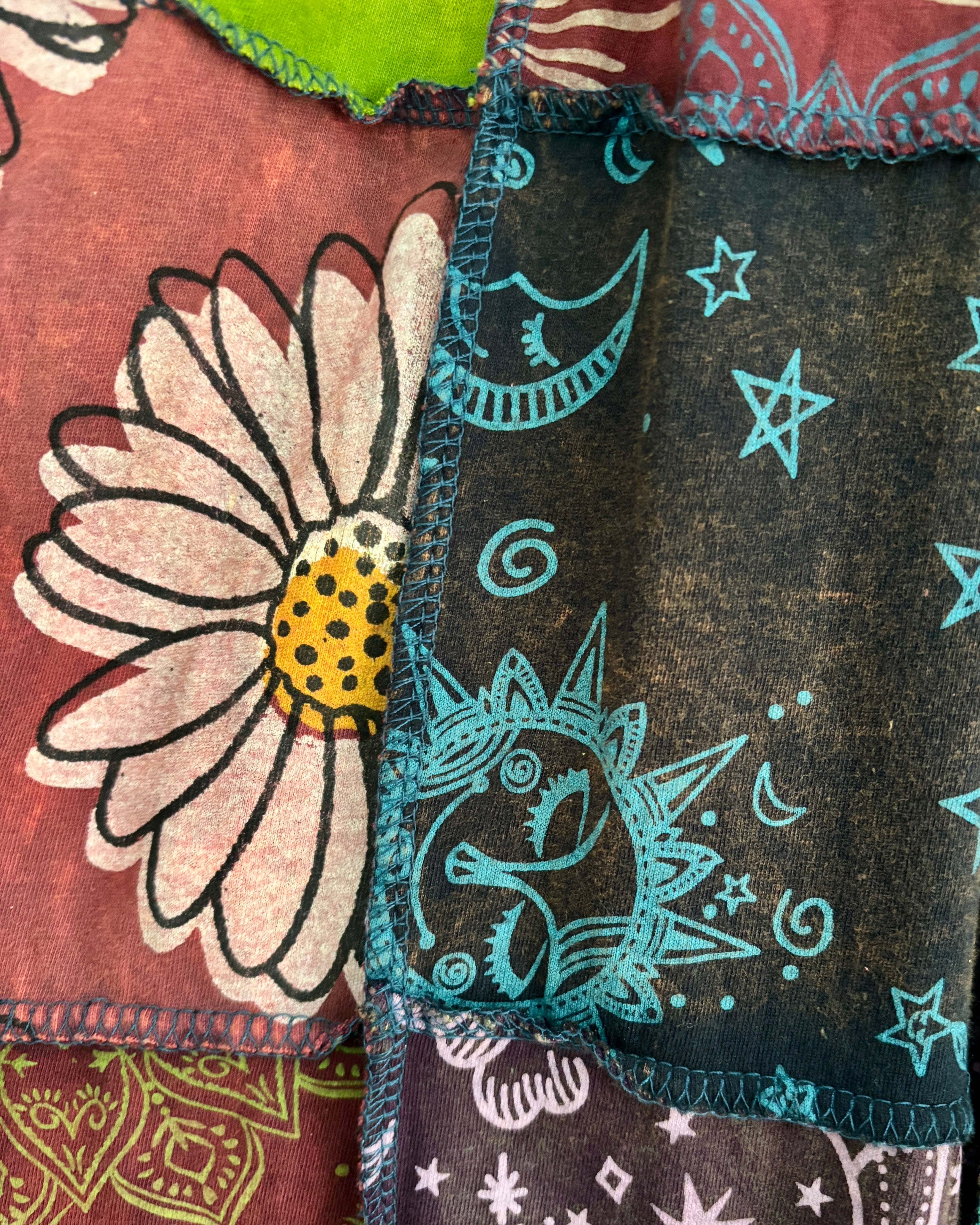 These new harem pants are made from patches of fabric in a range of funky patterns. They have an elasticated waist and two side pockets.