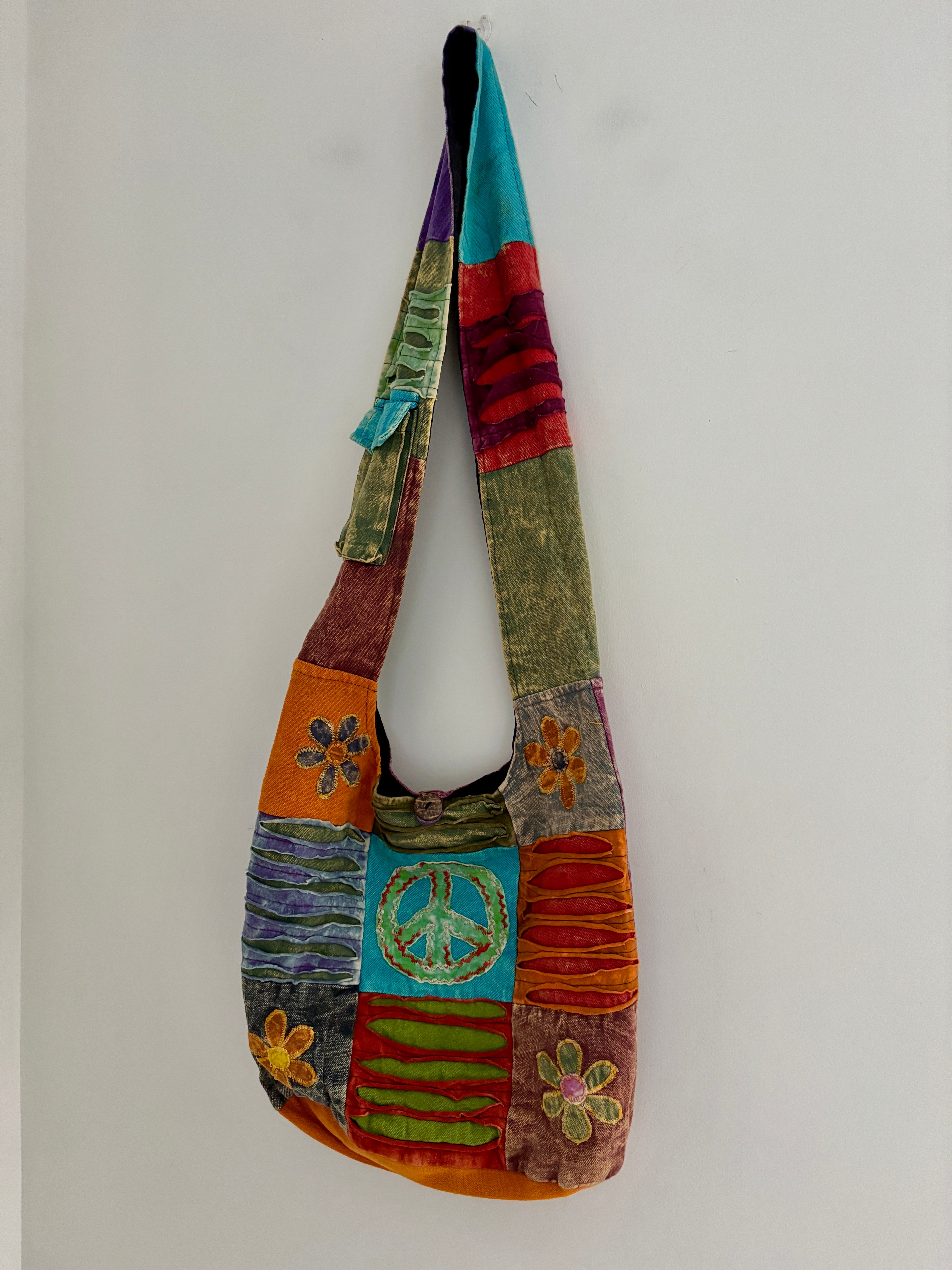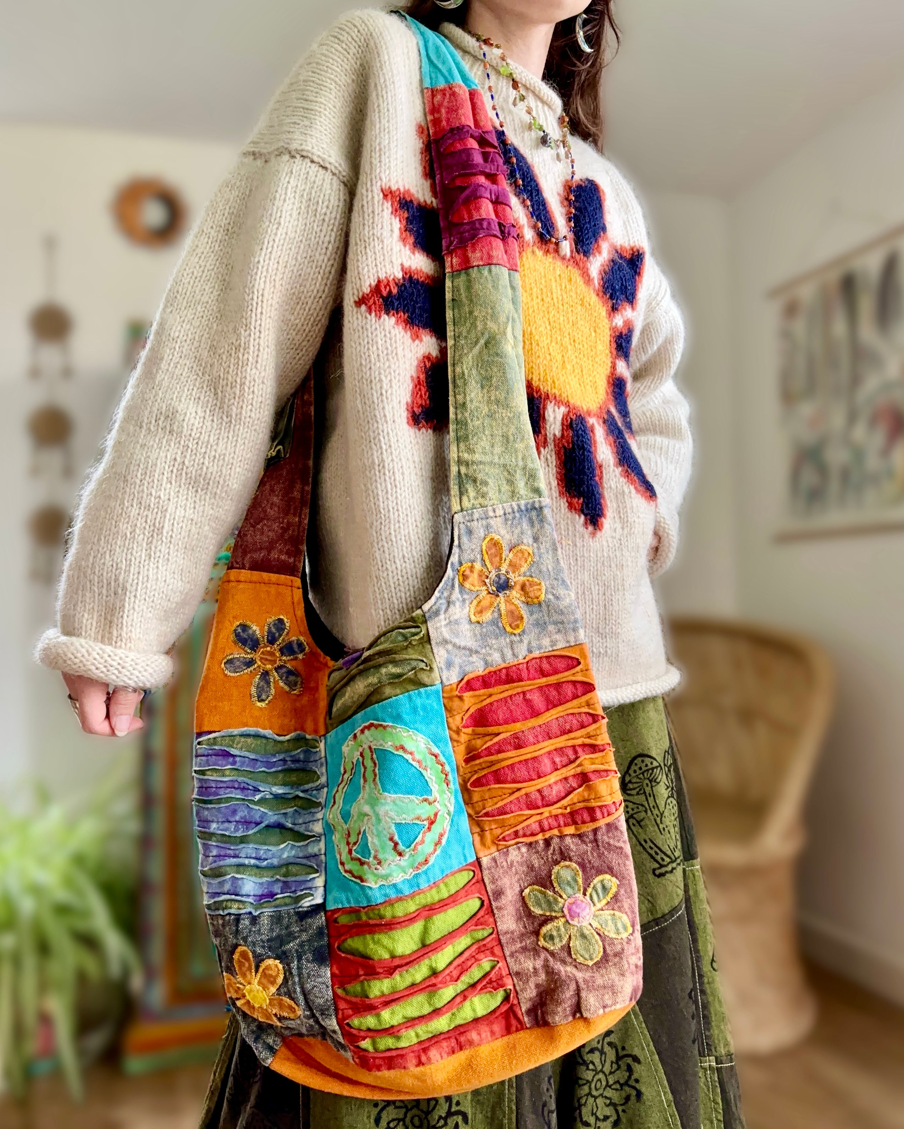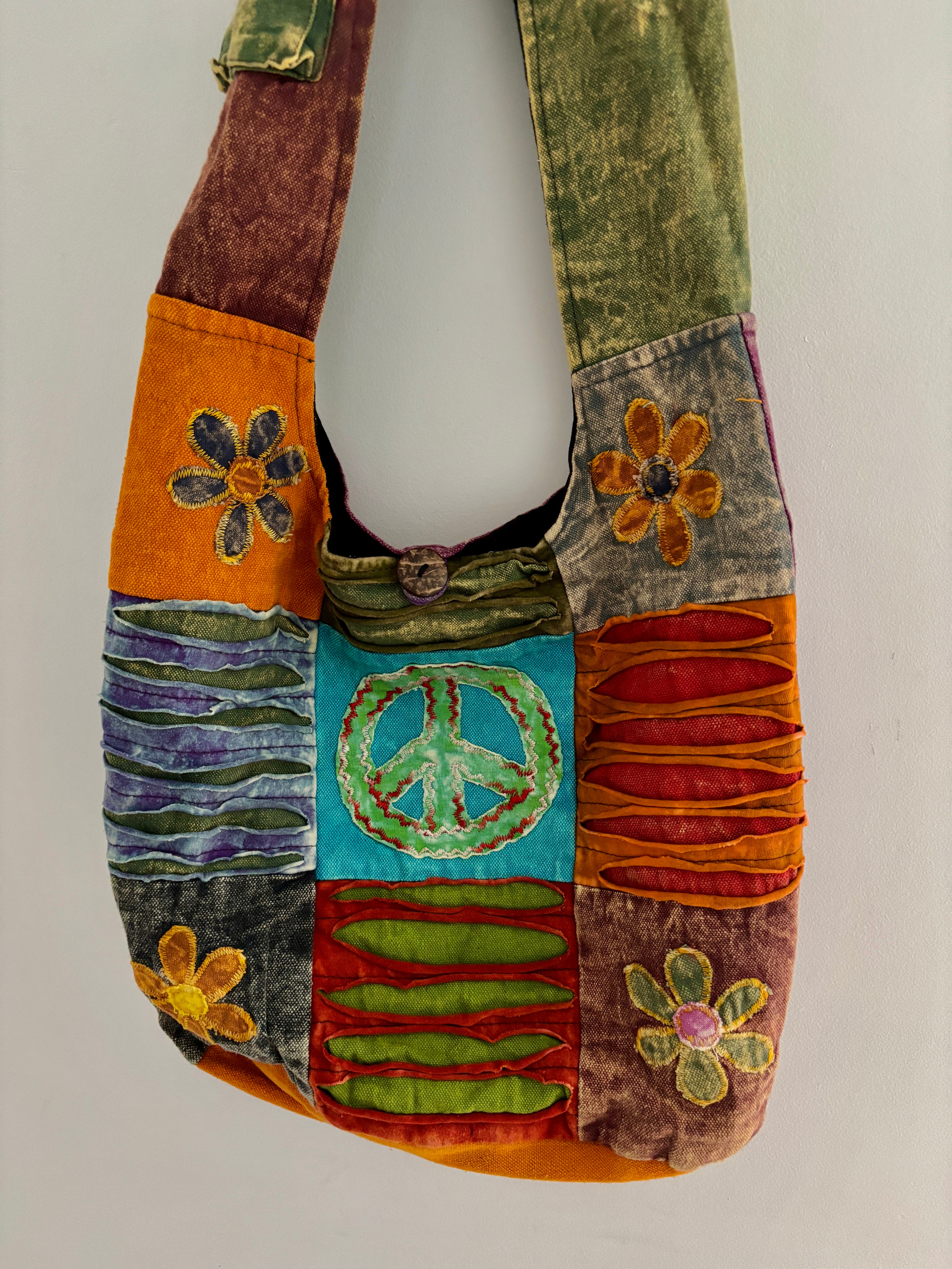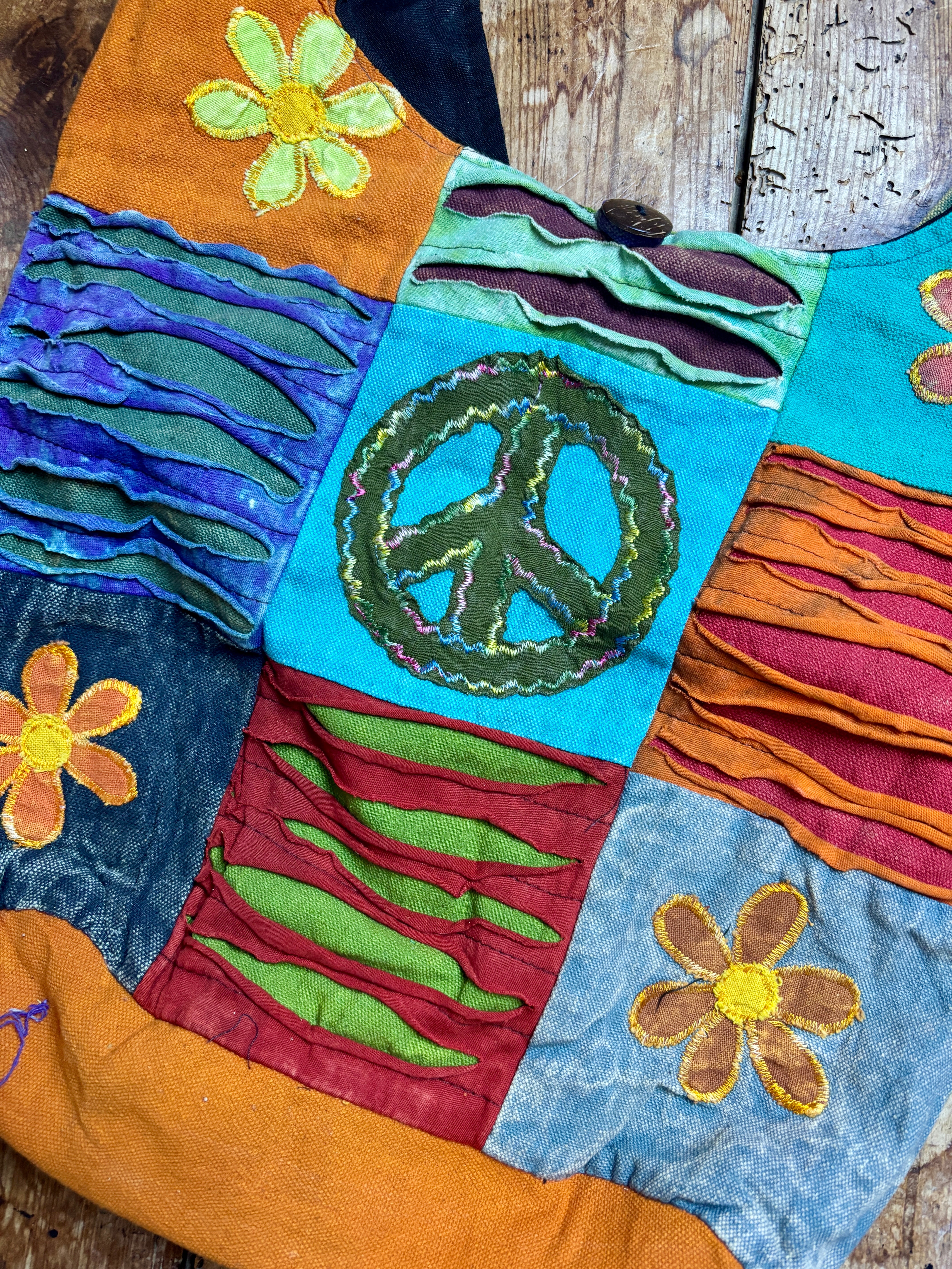 This patchwork hippie bag is adorned with a peace design surrounded by flowers. It is made using up scraps of fabric that would otherwise be wasted, making each one unique. It closes with a zip and has pockets inside with plenty of space for your trinkets!