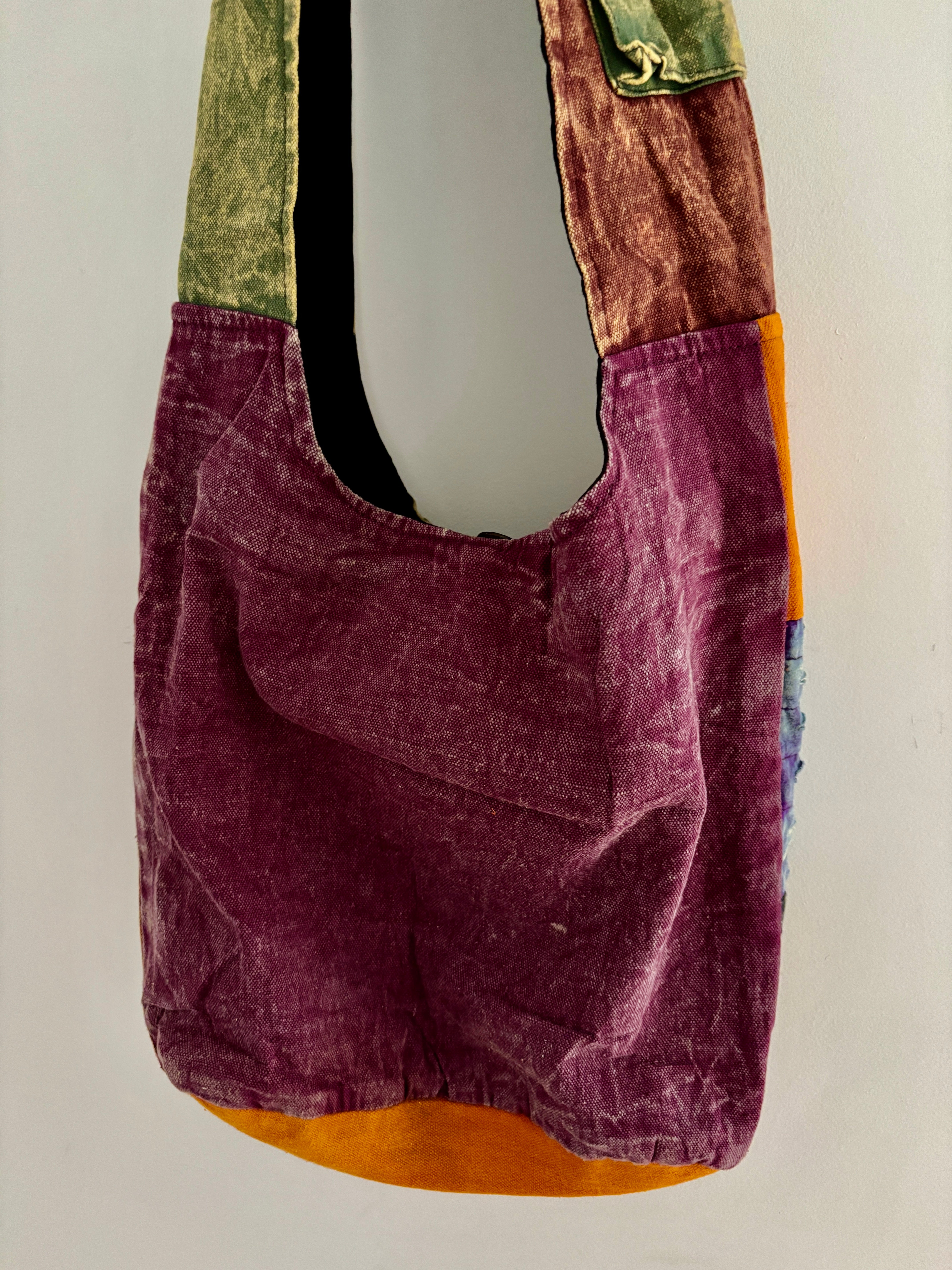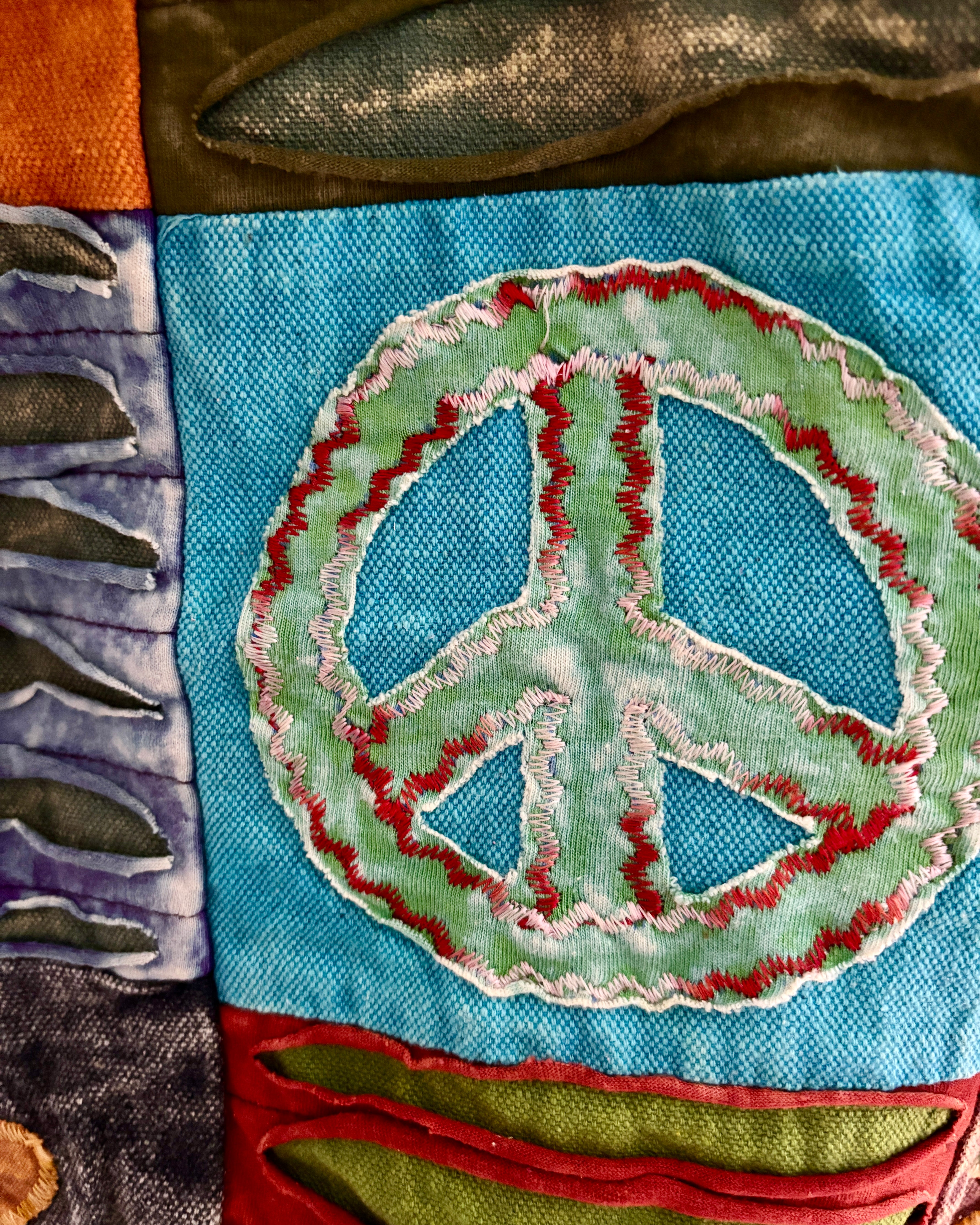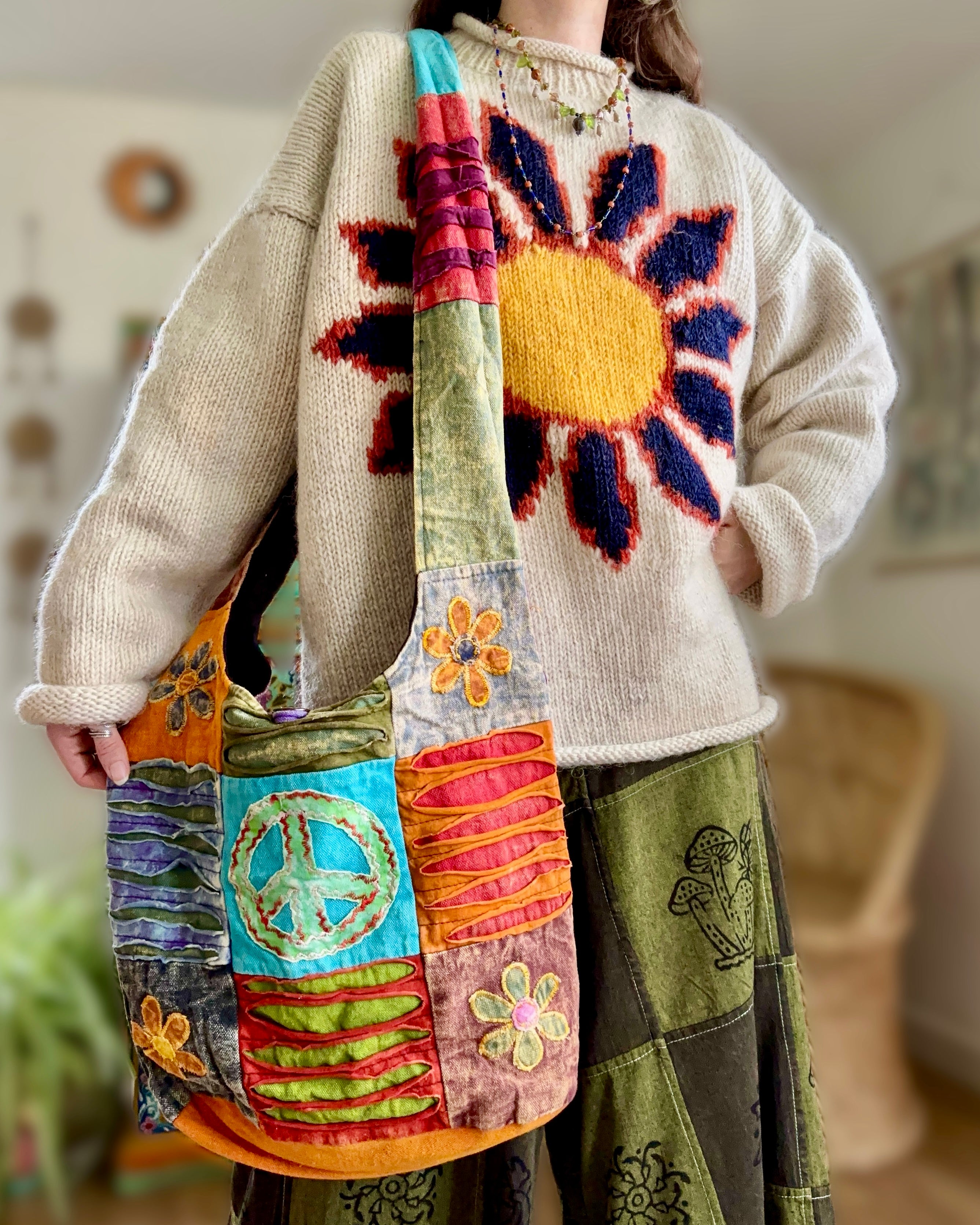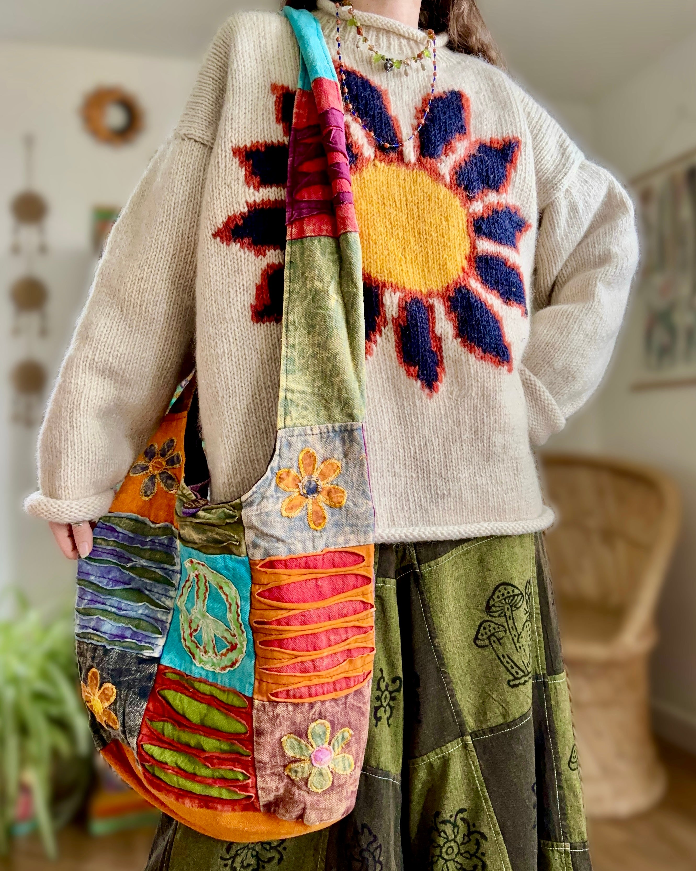 This patchwork hippie bag is adorned with a peace design surrounded by flowers. It is made using up scraps of fabric that would otherwise be wasted, making each one unique. It closes with a zip and has pockets inside with plenty of space for your trinkets!