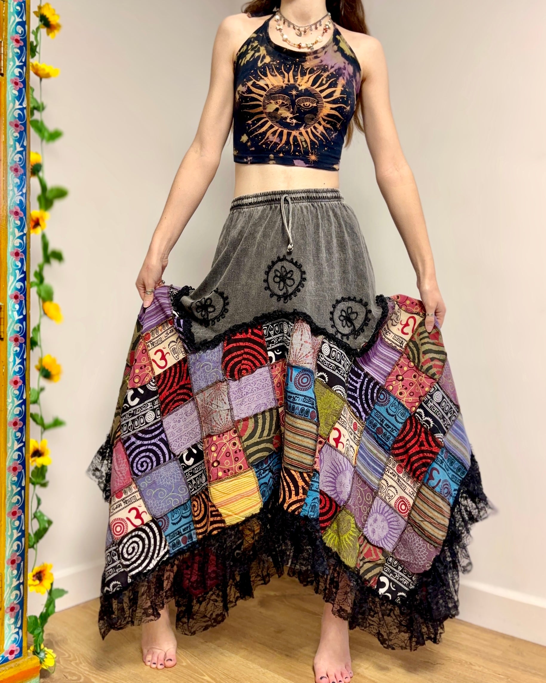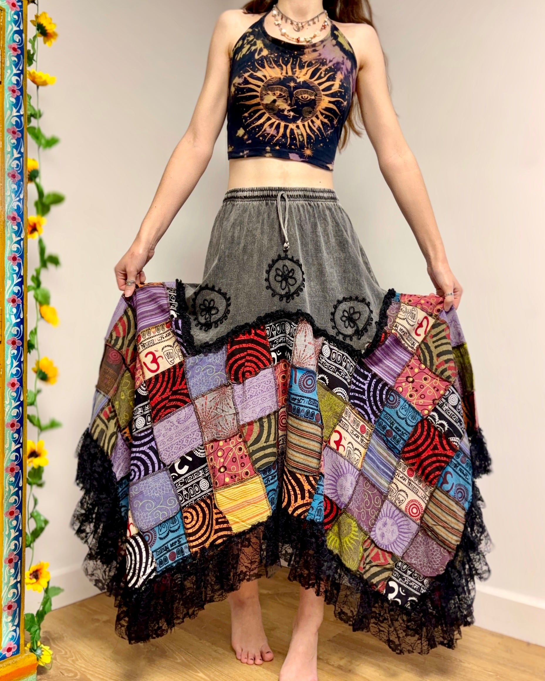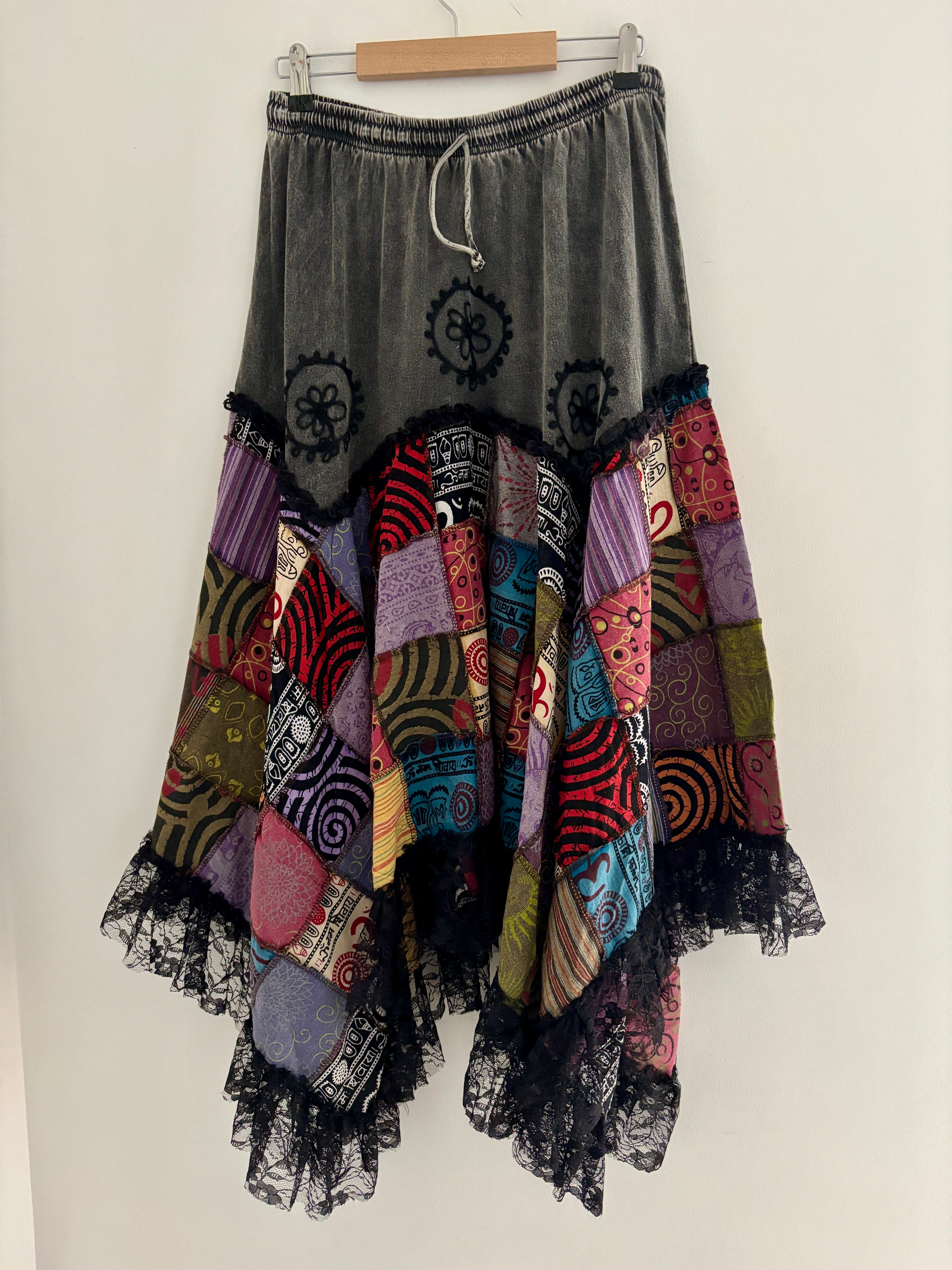 This magical purple skirt features patchwork and lace, with an asymmetric style bottom giving a fairy hippie look.