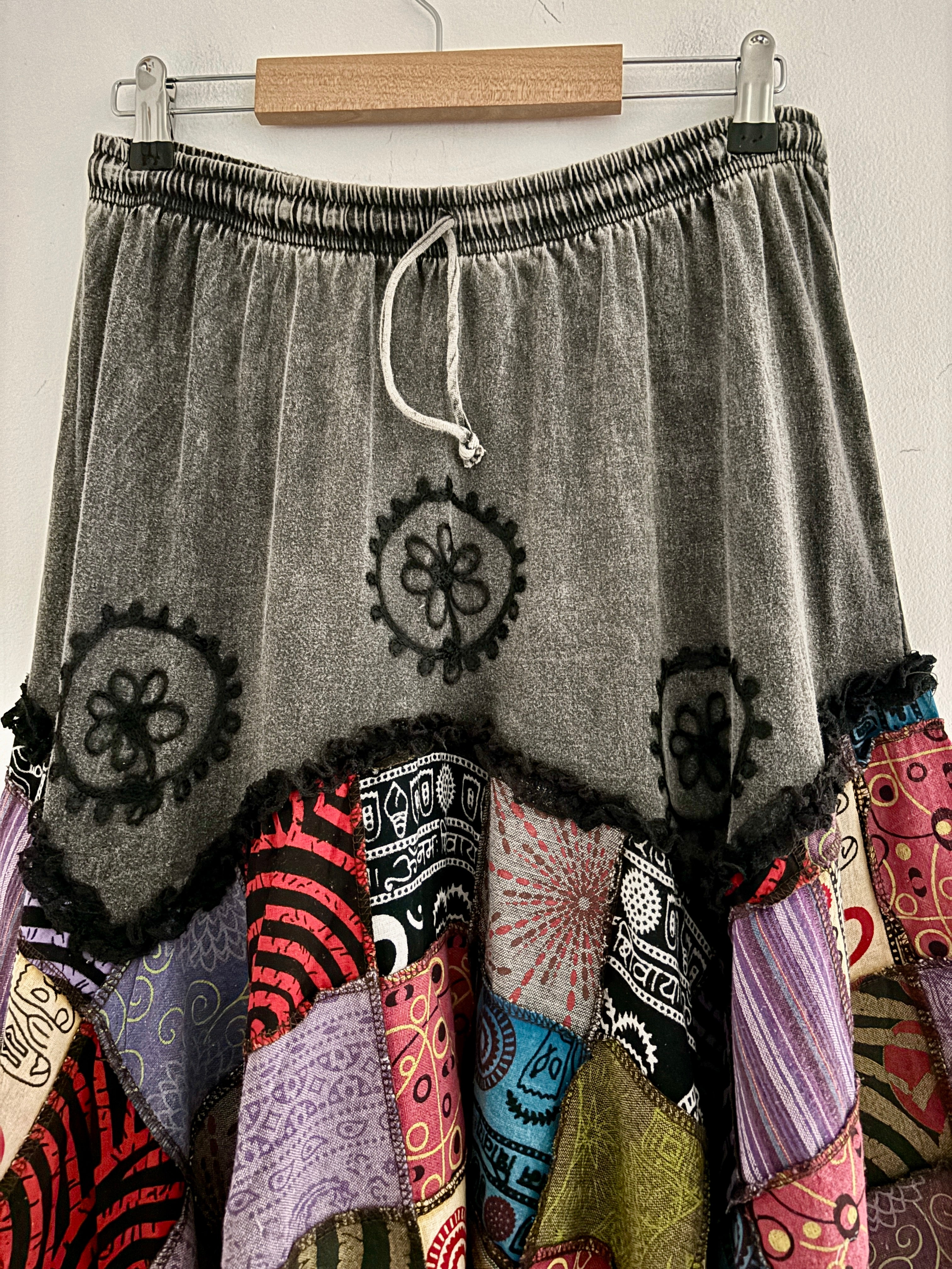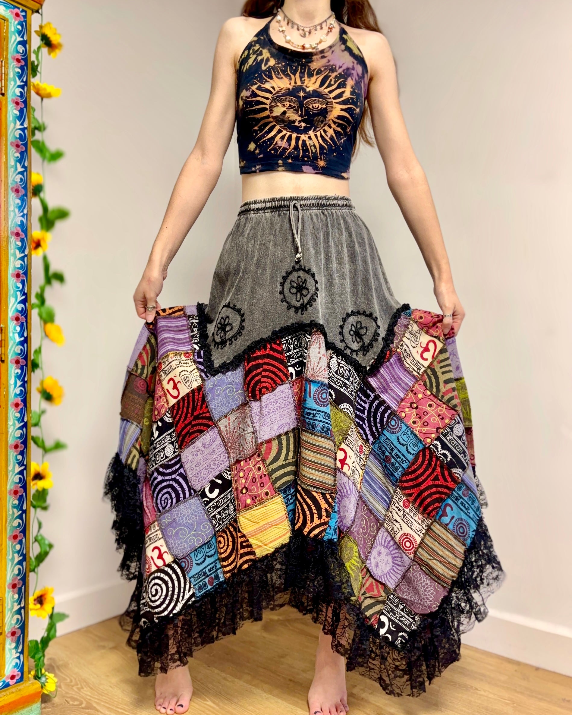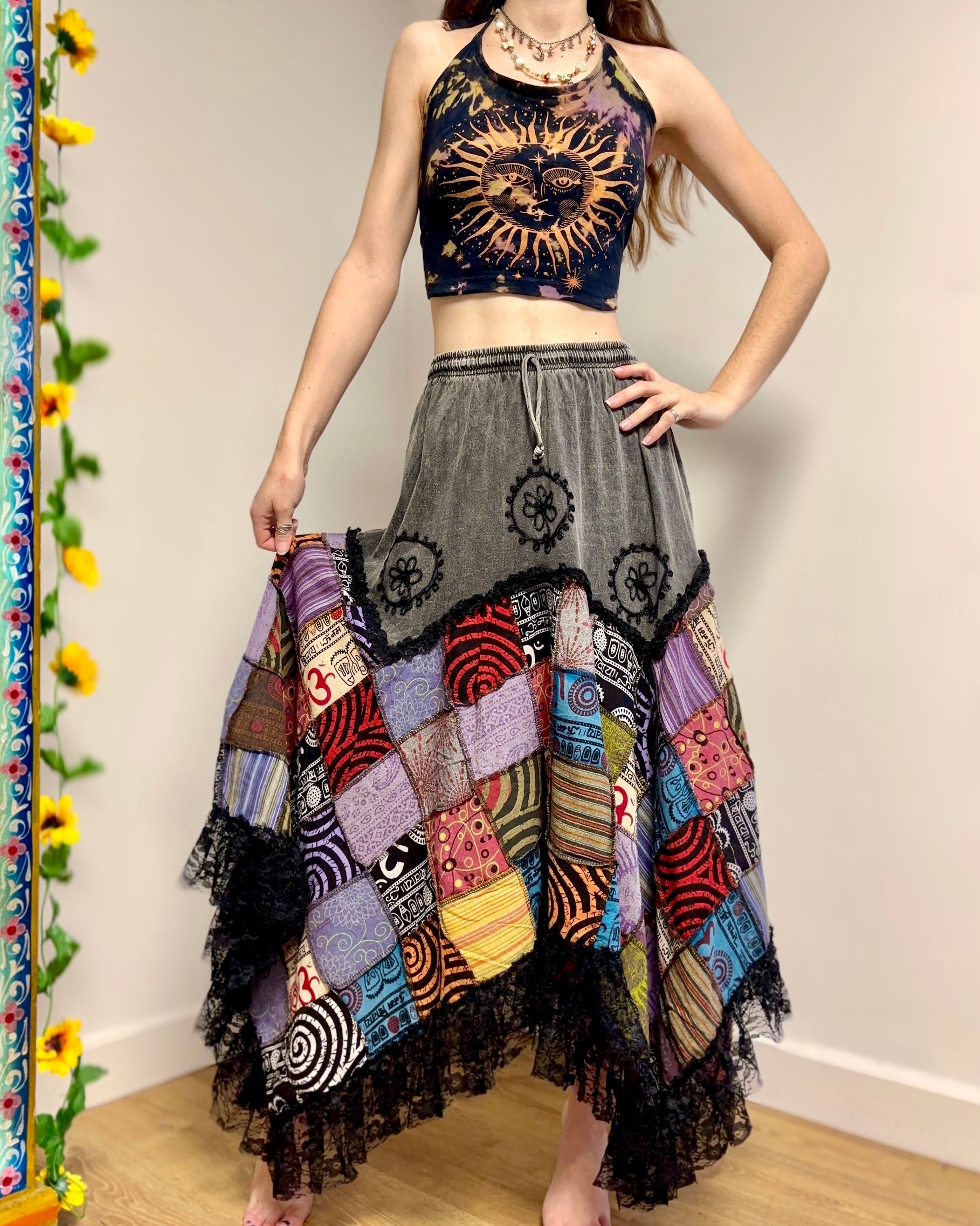 This magical purple skirt features patchwork and lace, with an asymmetric style bottom giving a fairy hippie look.