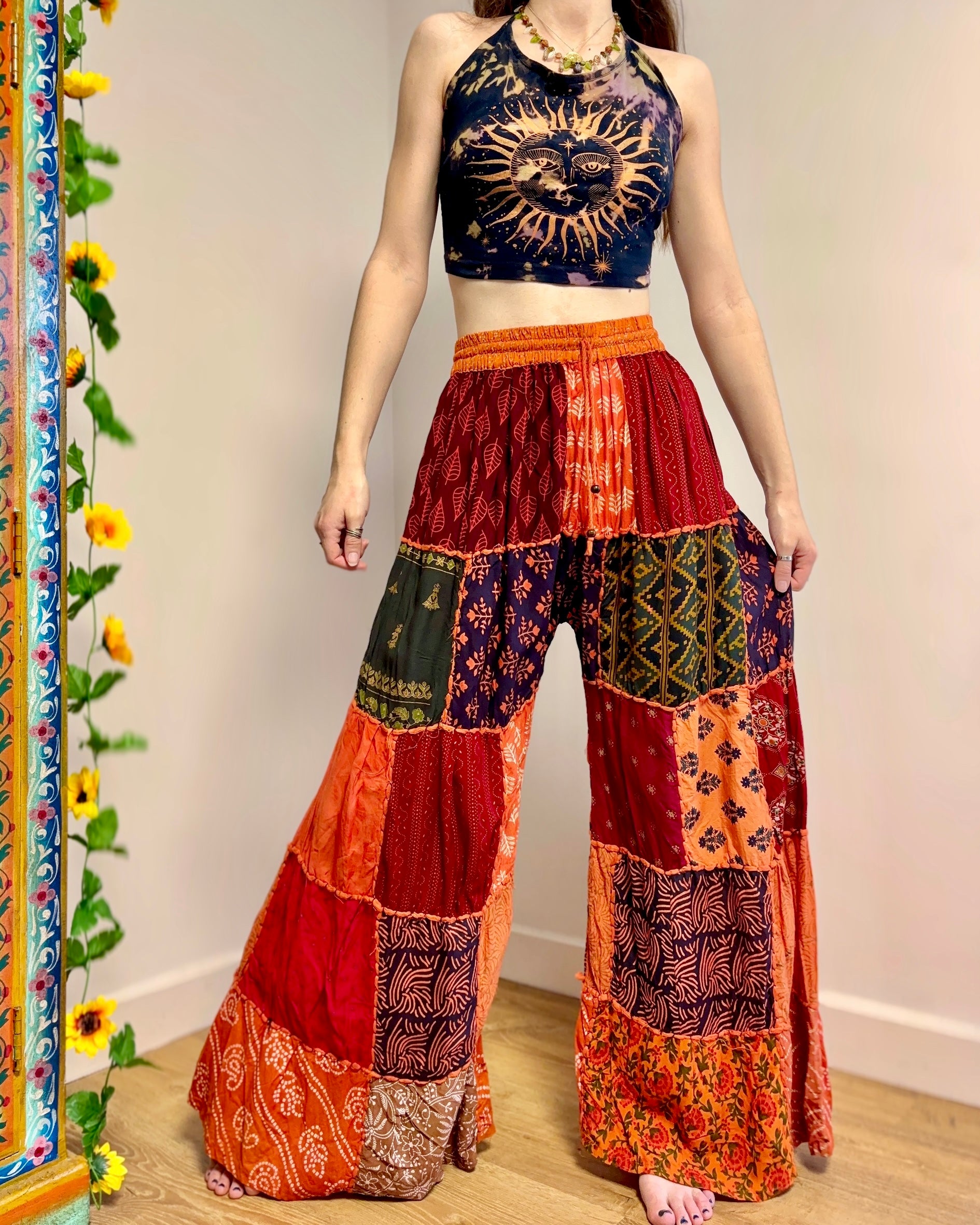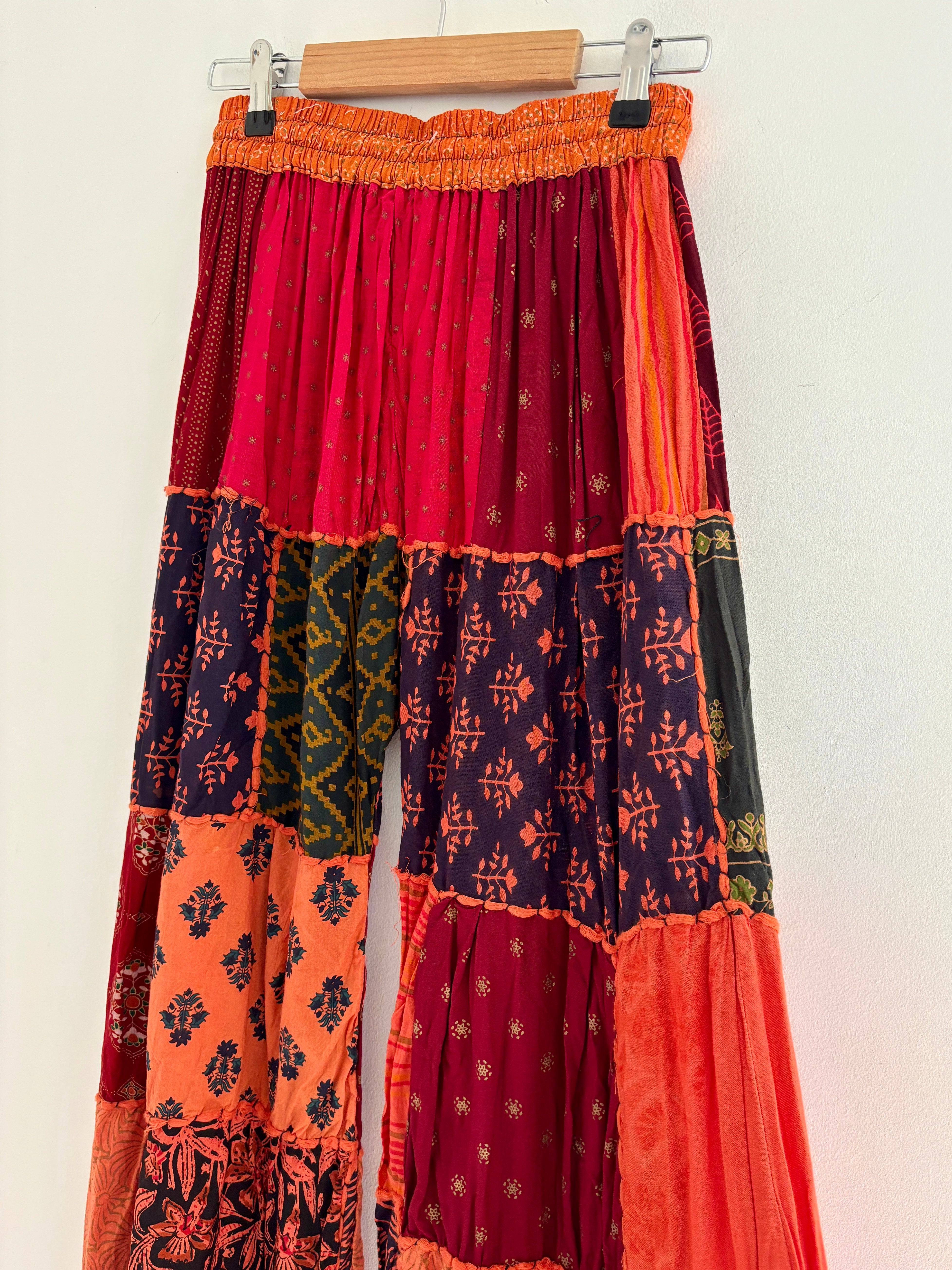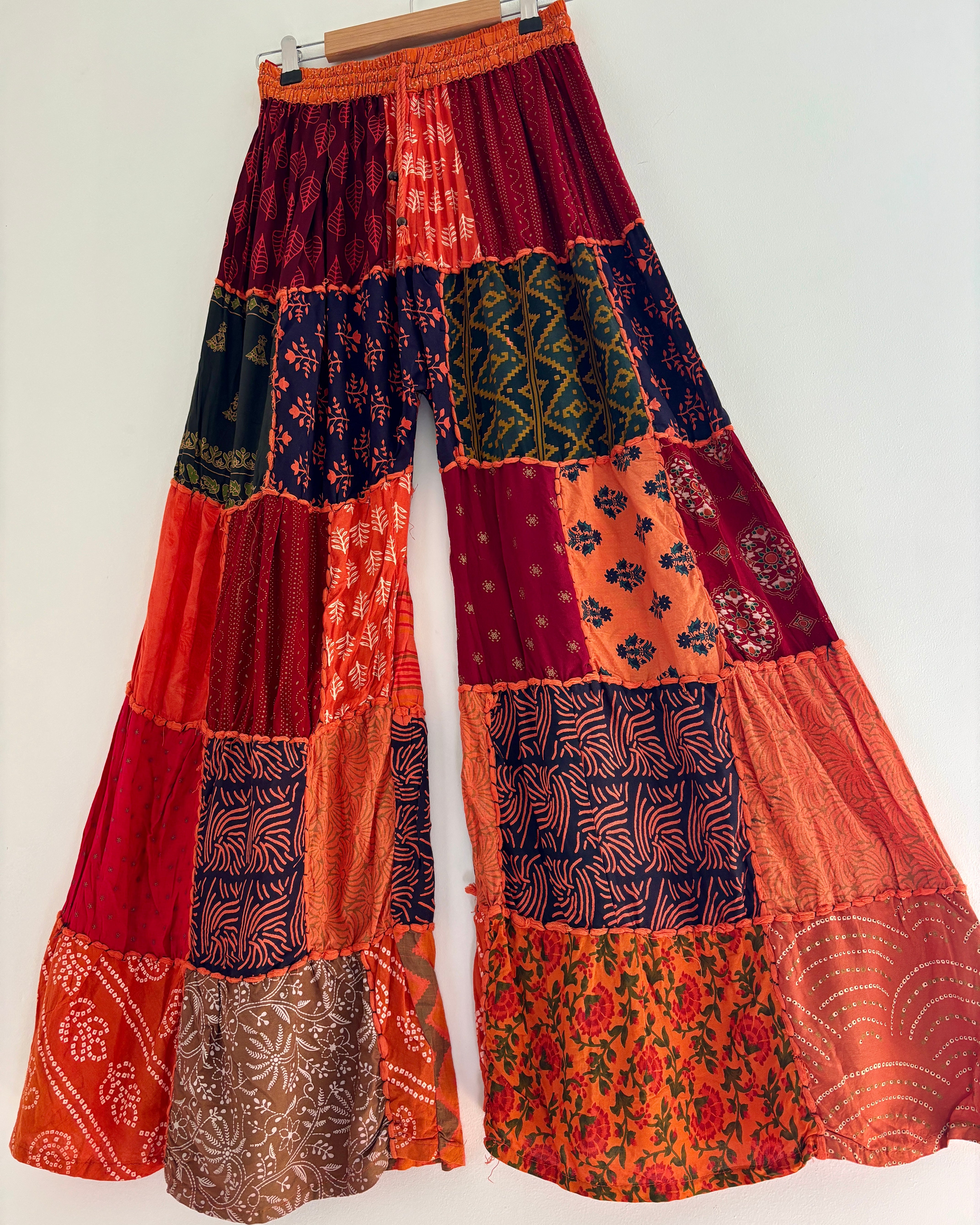 These palazzo trousers are made from patches of orange fabric. They have wide legs, have an elasticated waist and two front pockets for a comfortable fit.