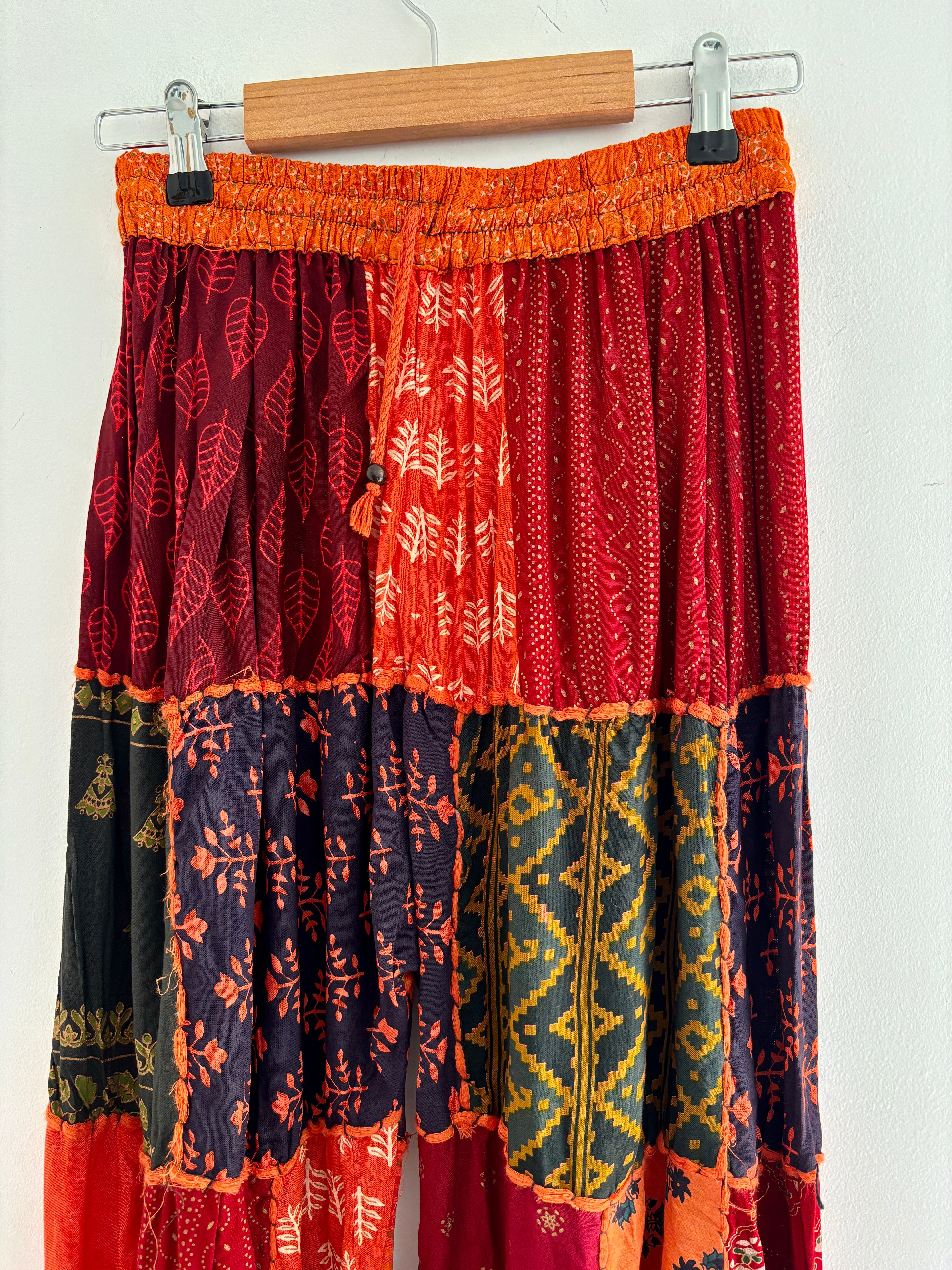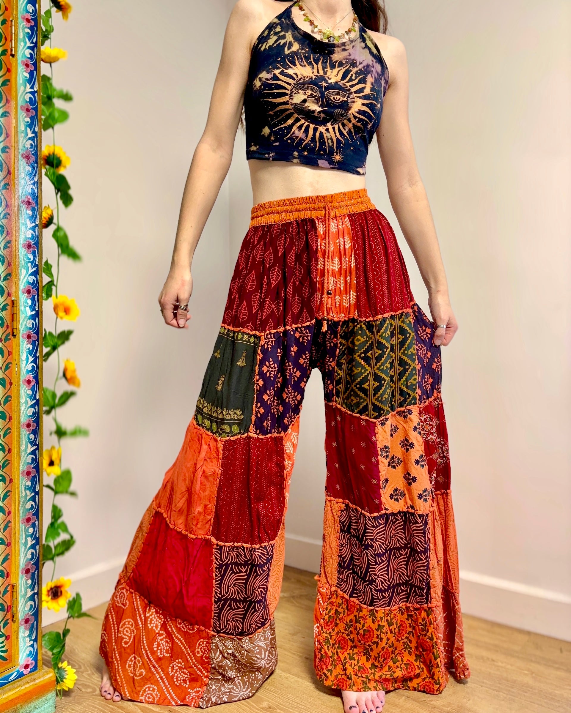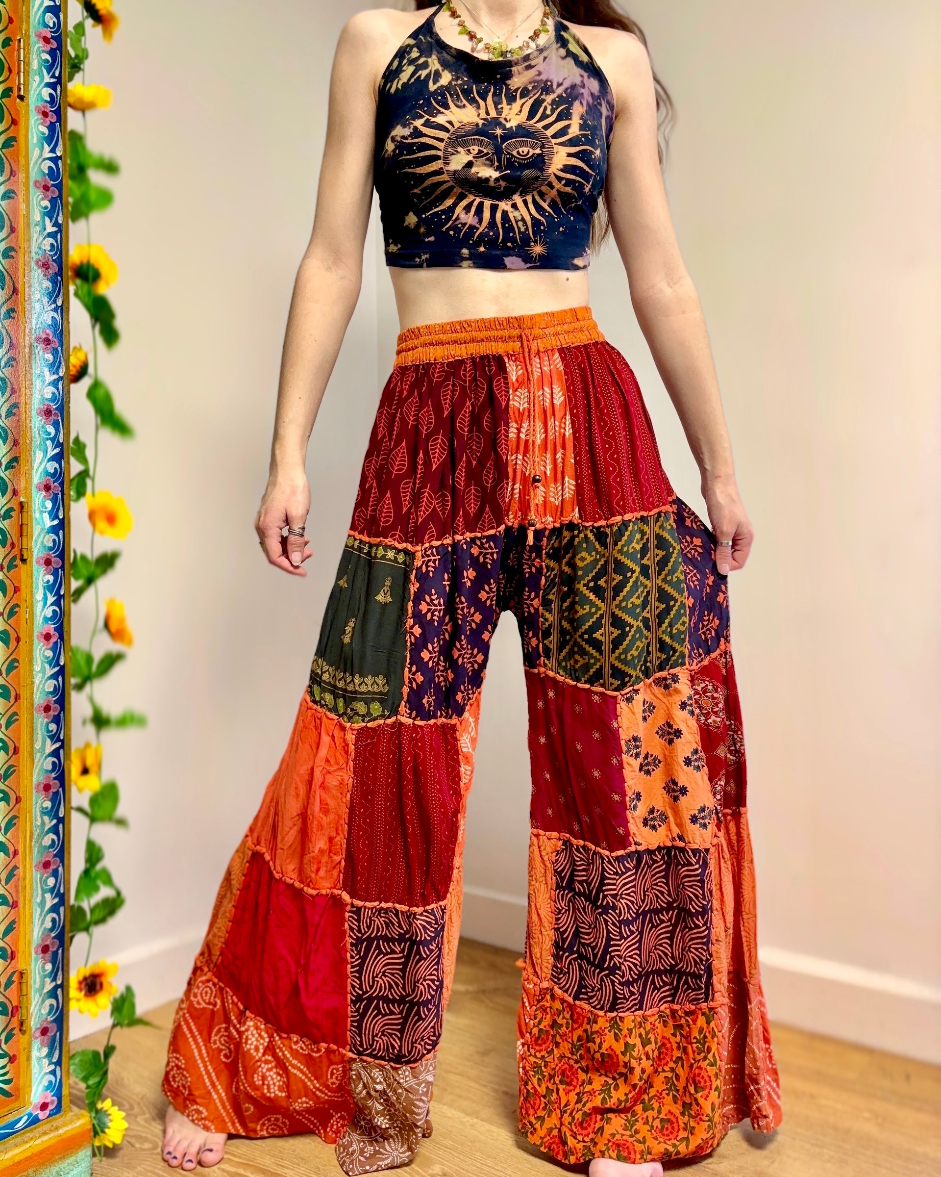 These palazzo trousers are made from patches of orange fabric. They have wide legs, have an elasticated waist and two front pockets for a comfortable fit.