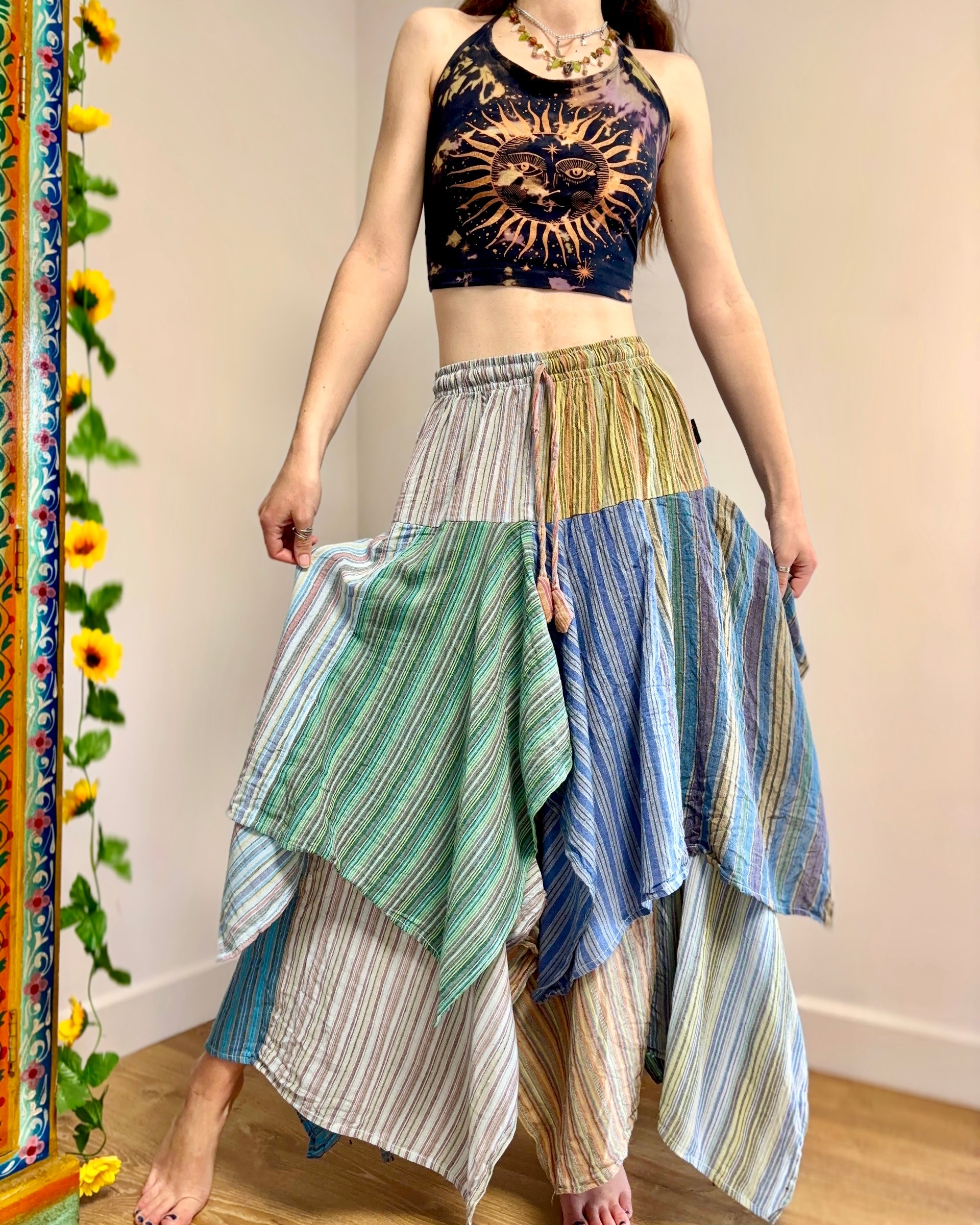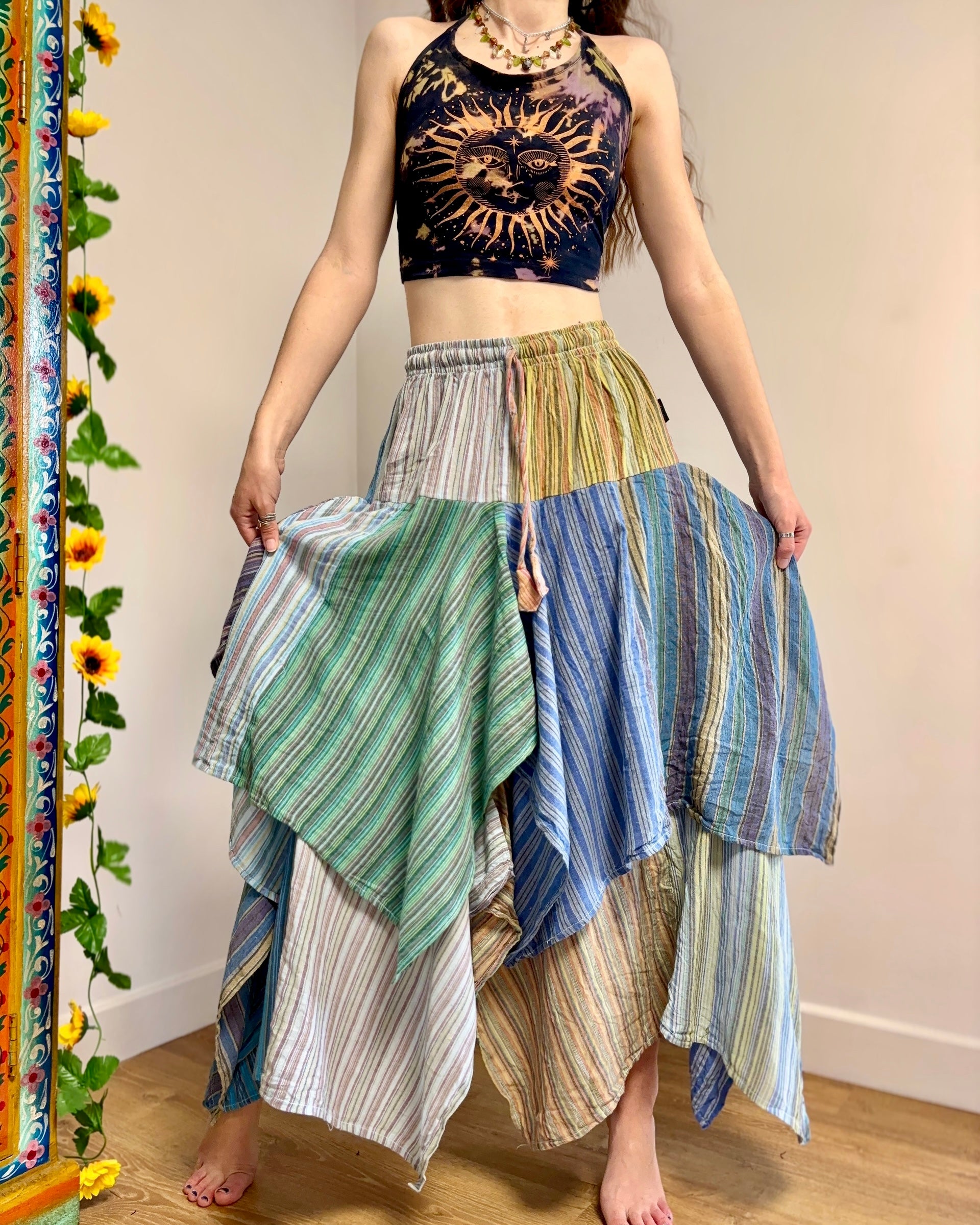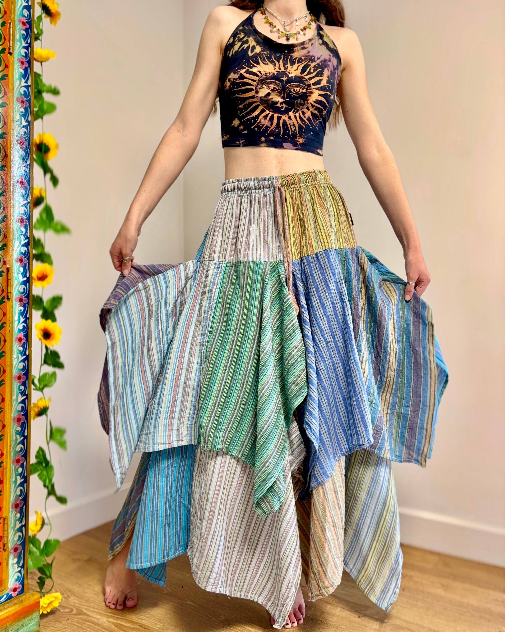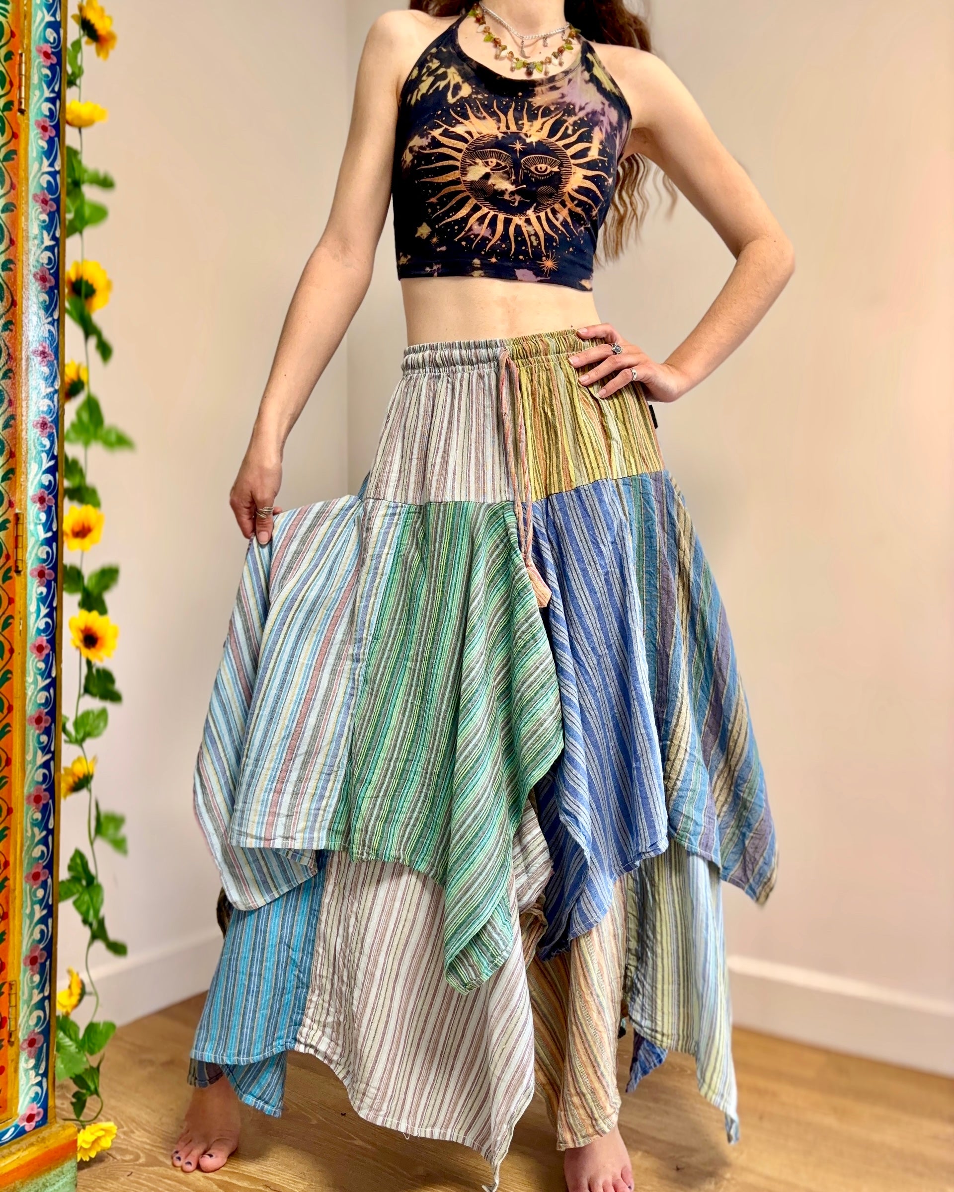 This beautiful skirt is made from patches of striped cotton with an asymmetrical bottom for a fairy look.