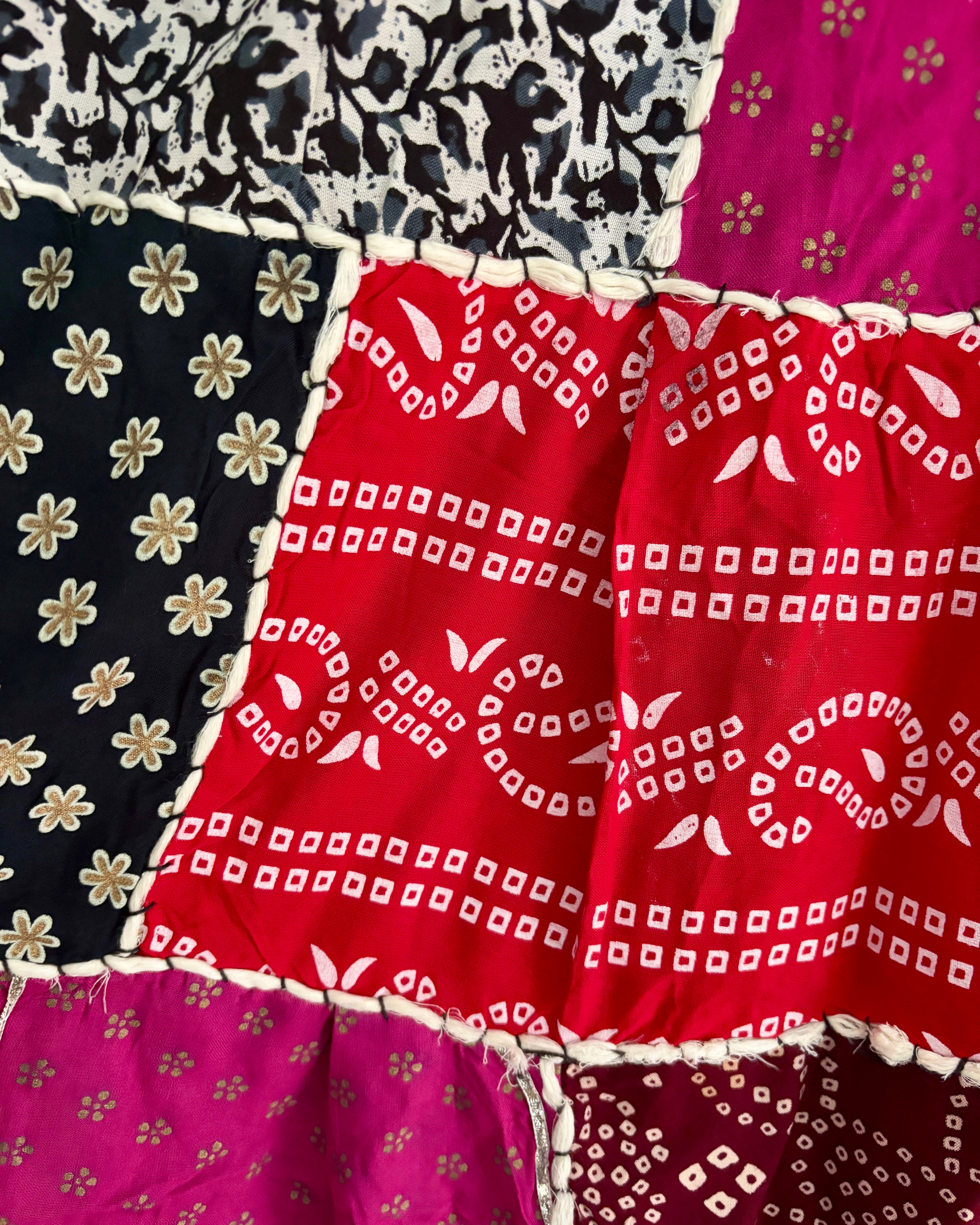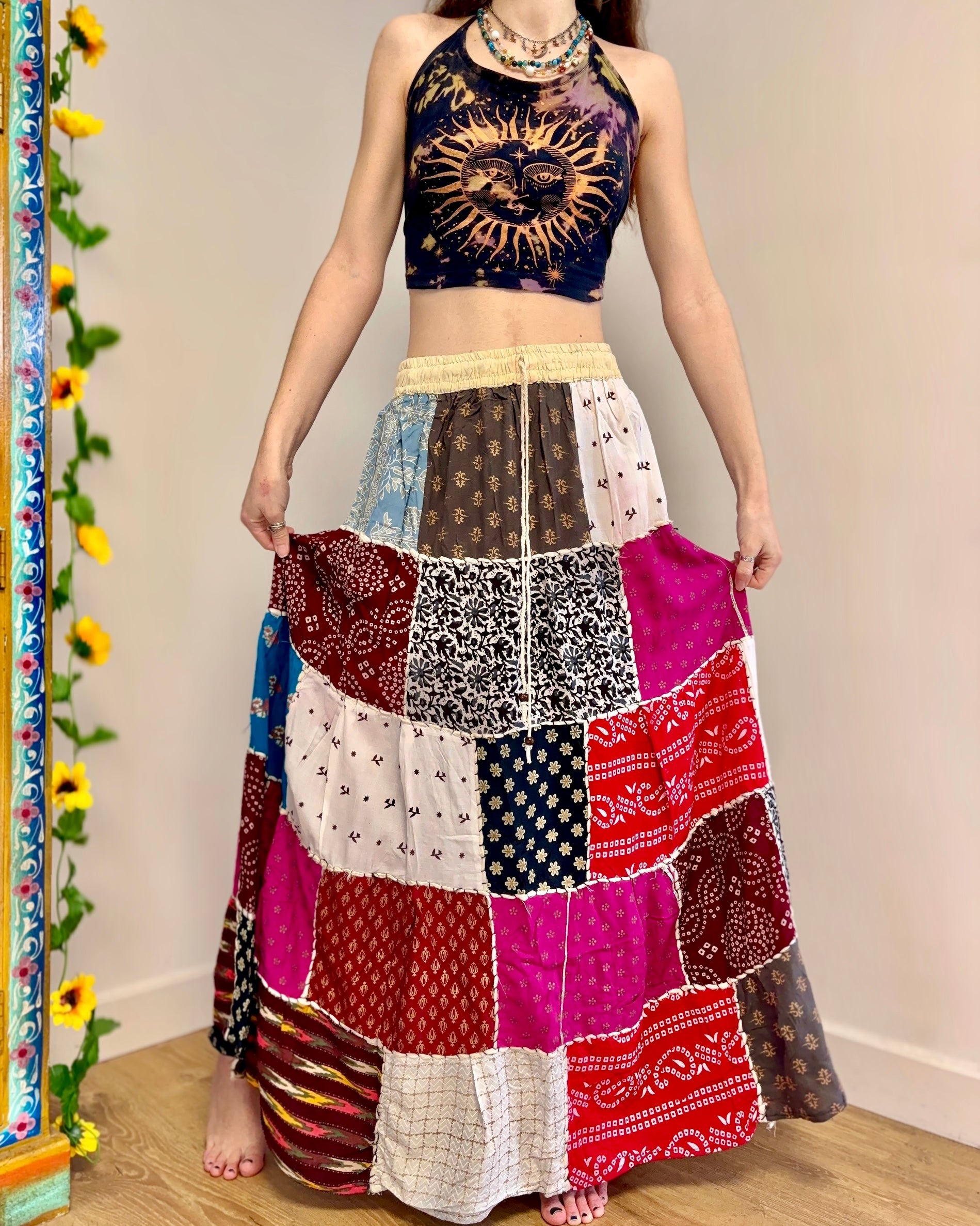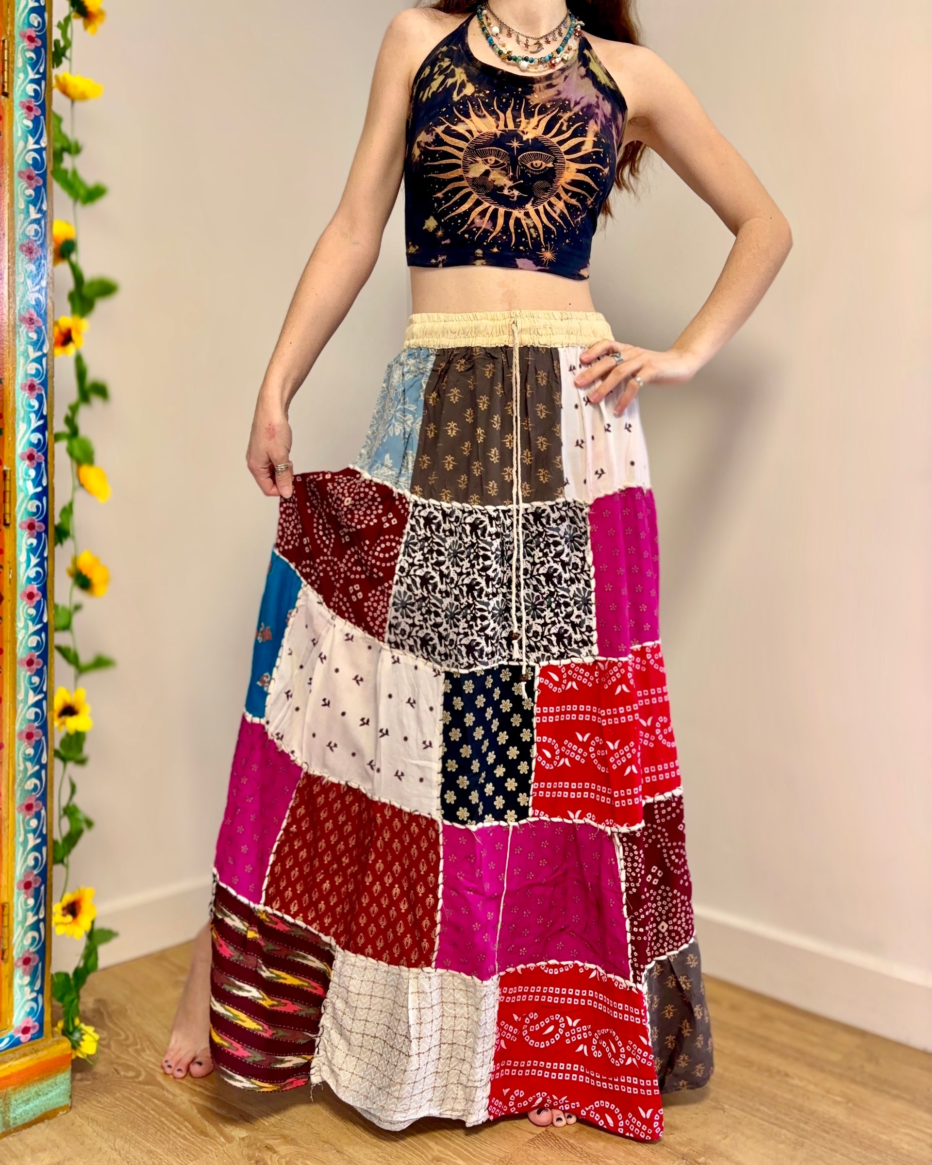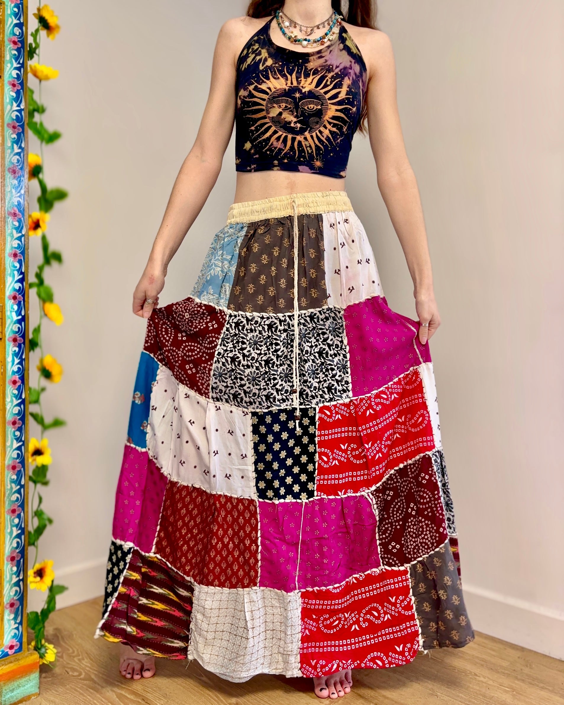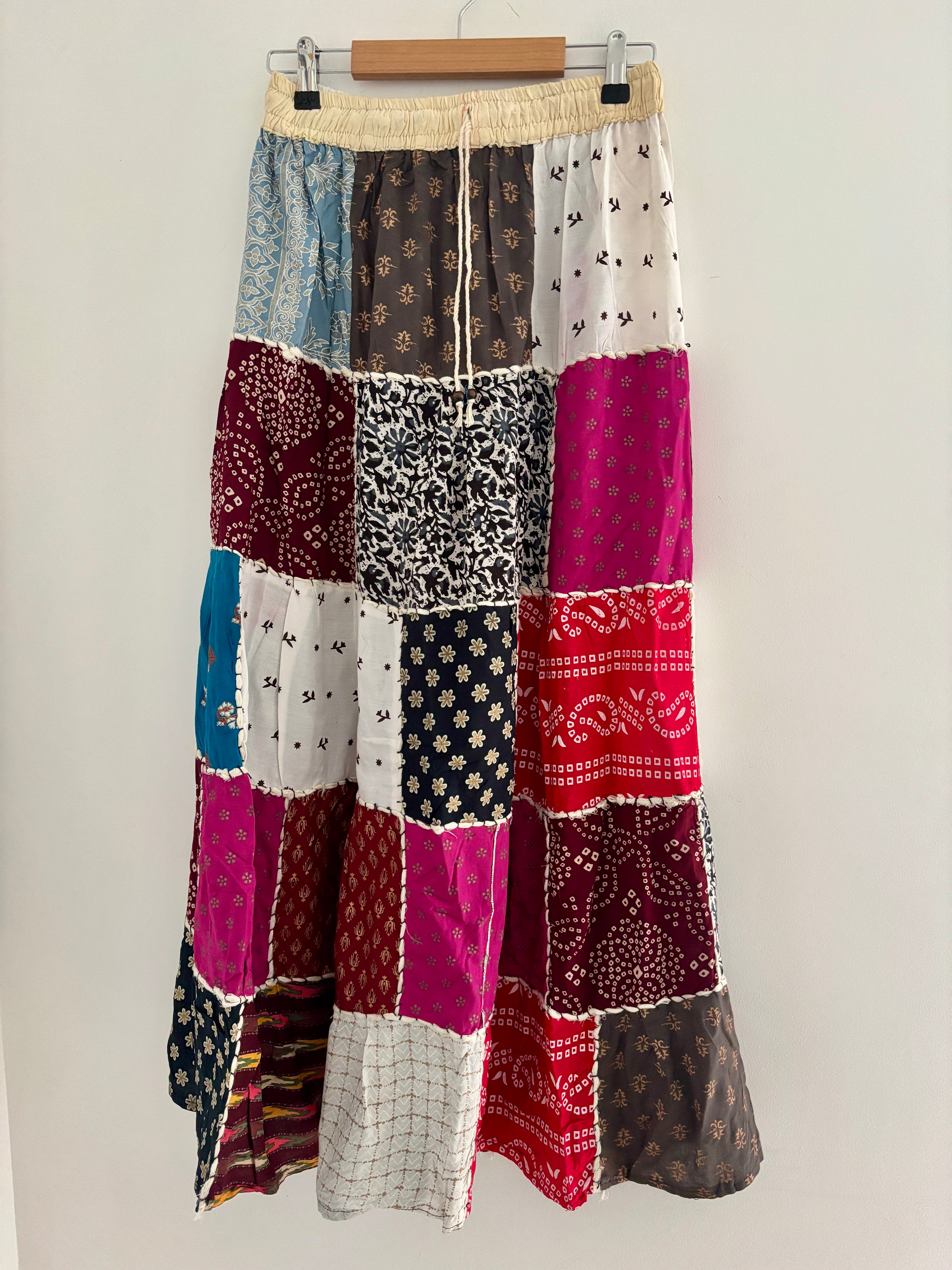 This beautiful maxi skirt features patches of fabric in multi colours.