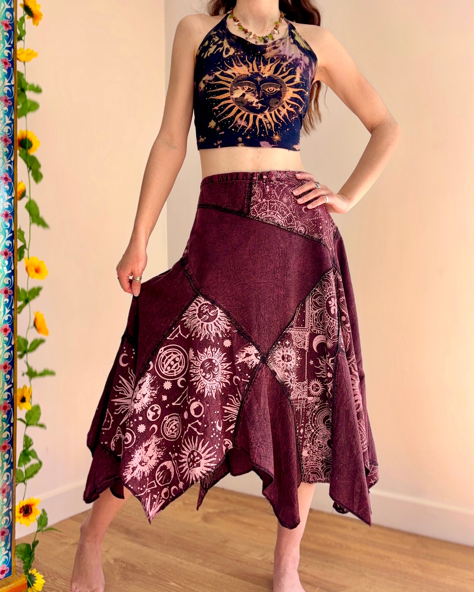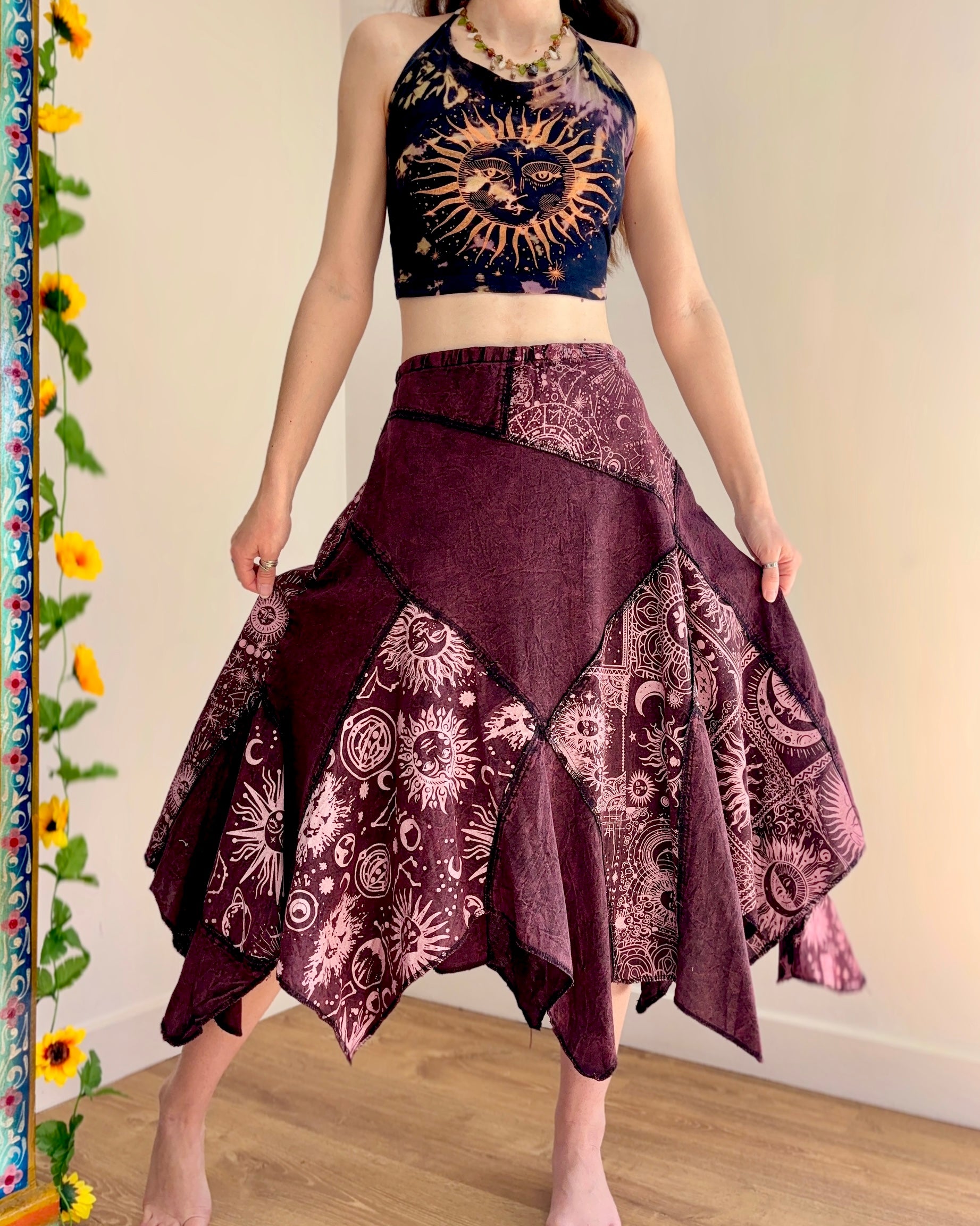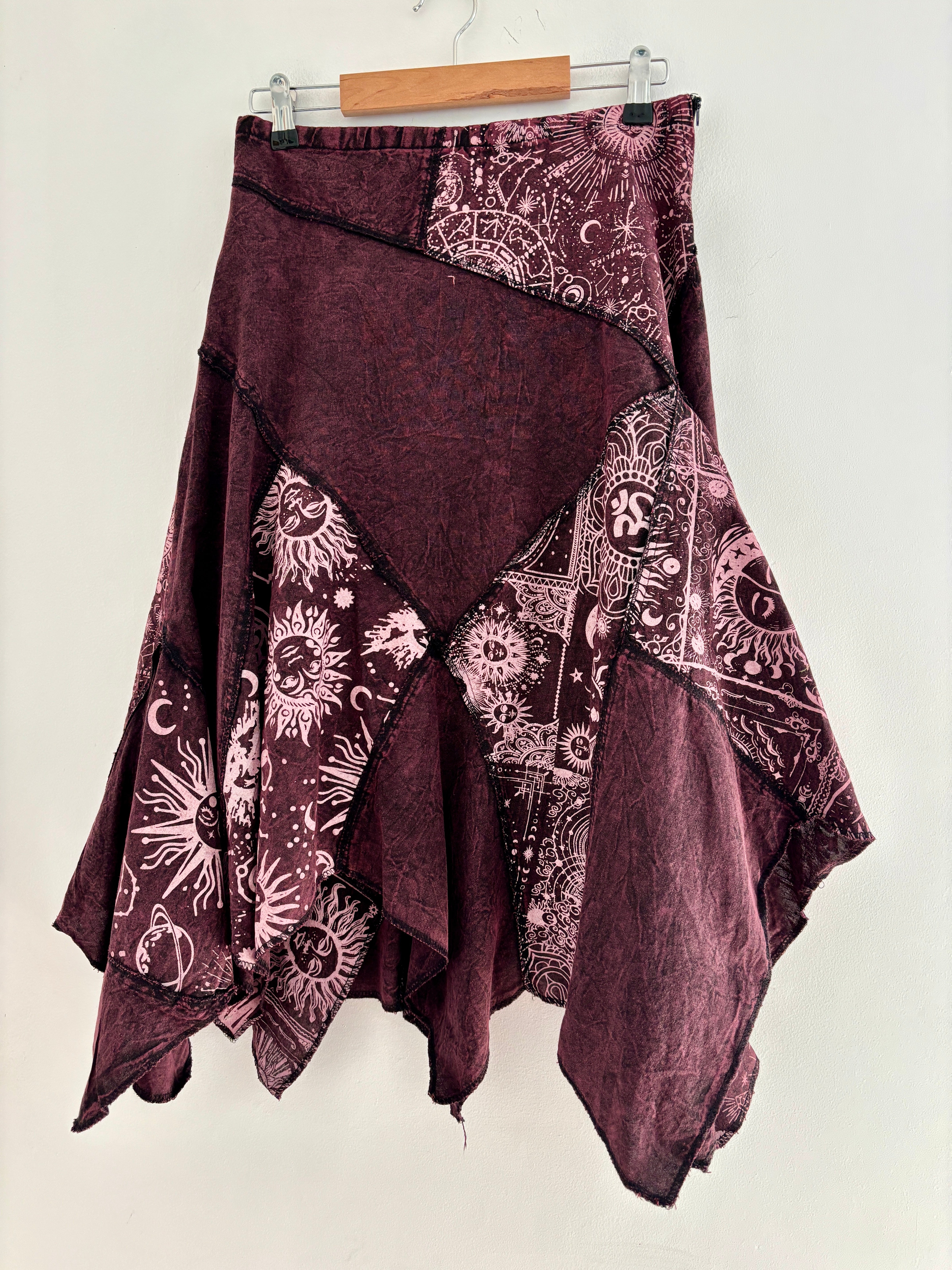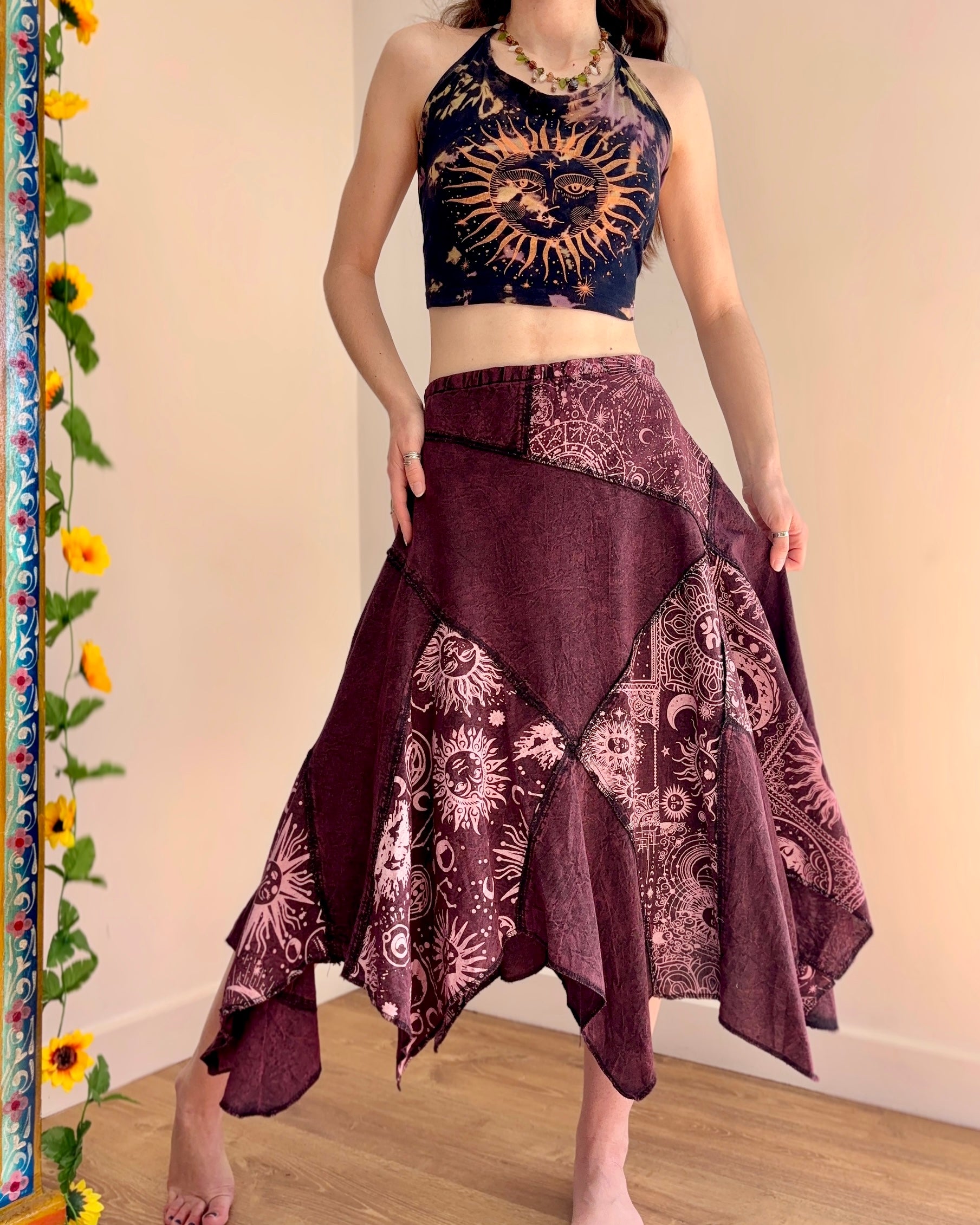 This magical pink skirt features patches of celestial fabric, with an asymmetric style bottom giving a fairy hippie look.