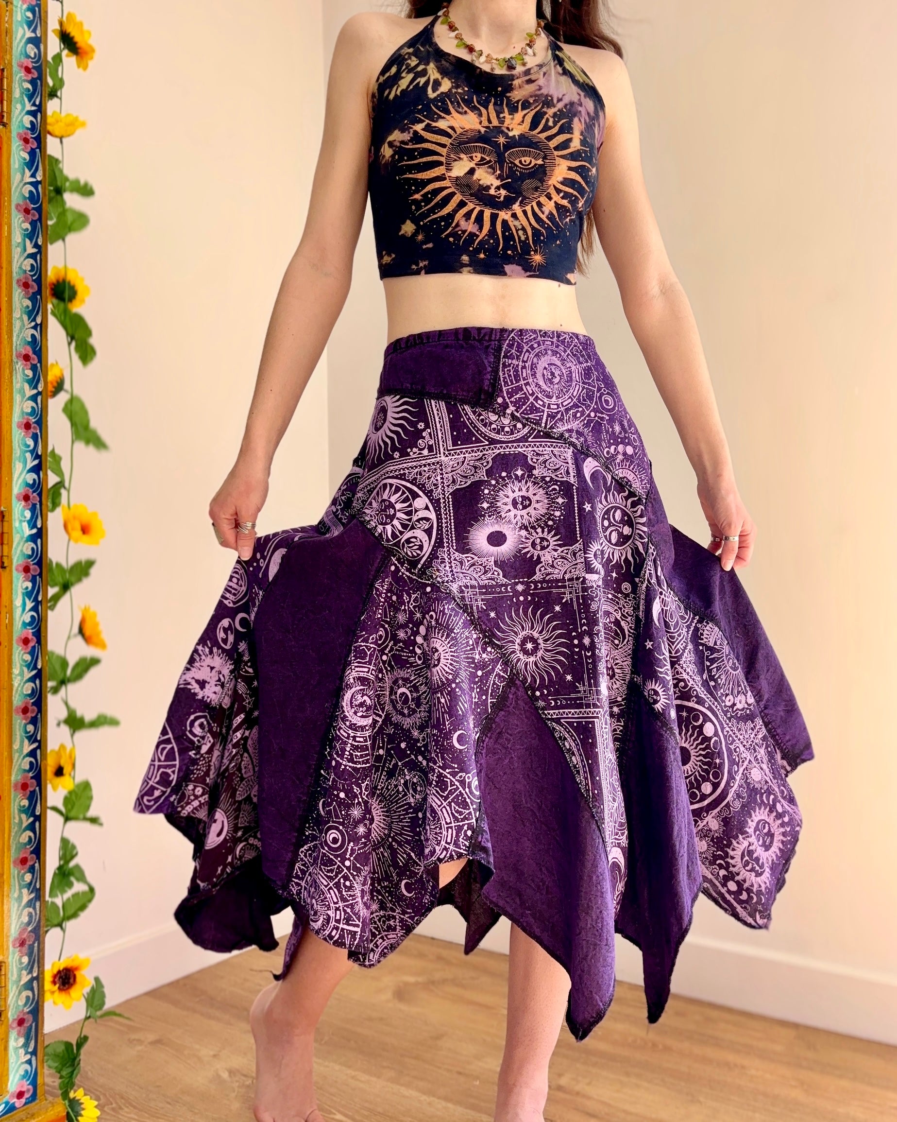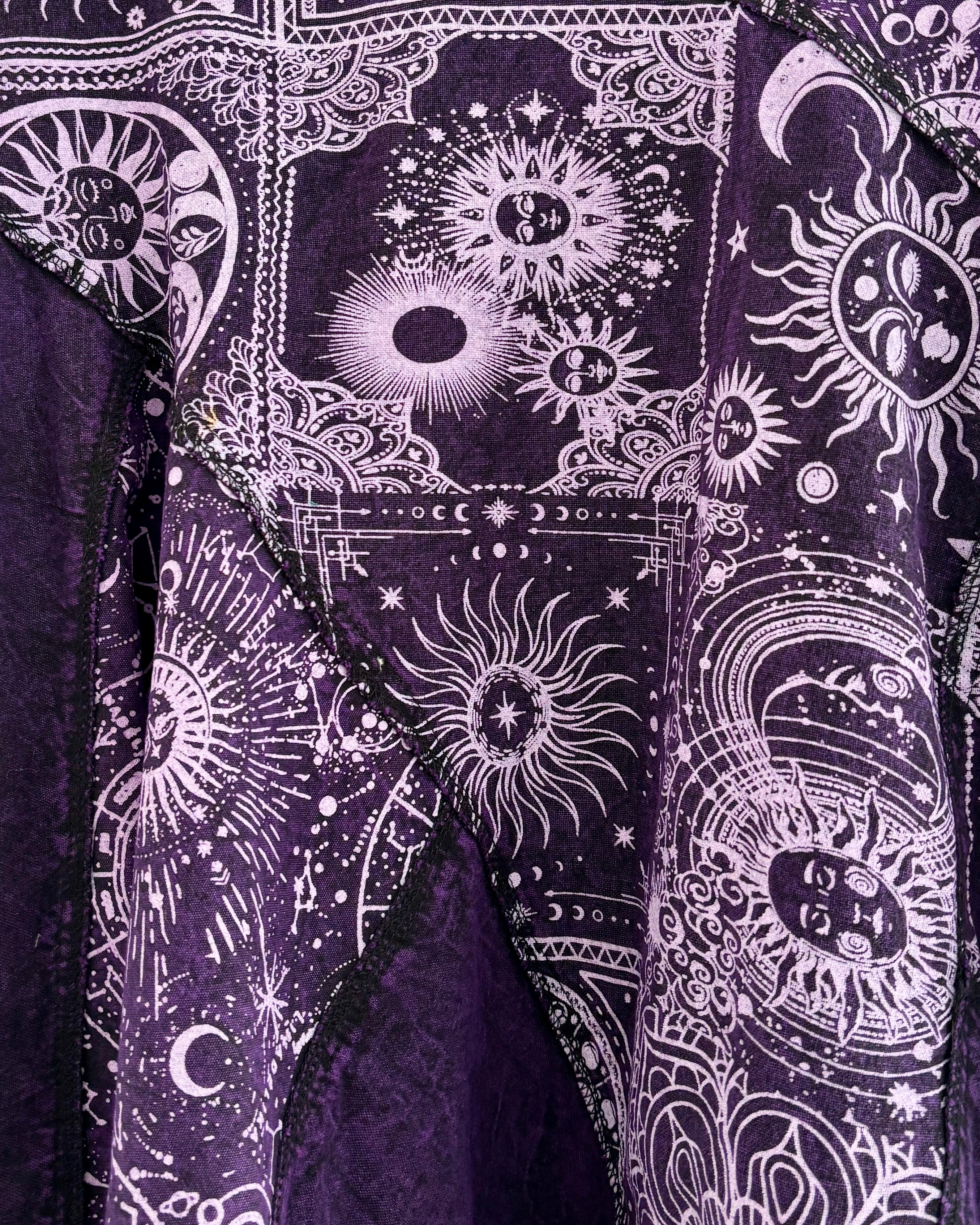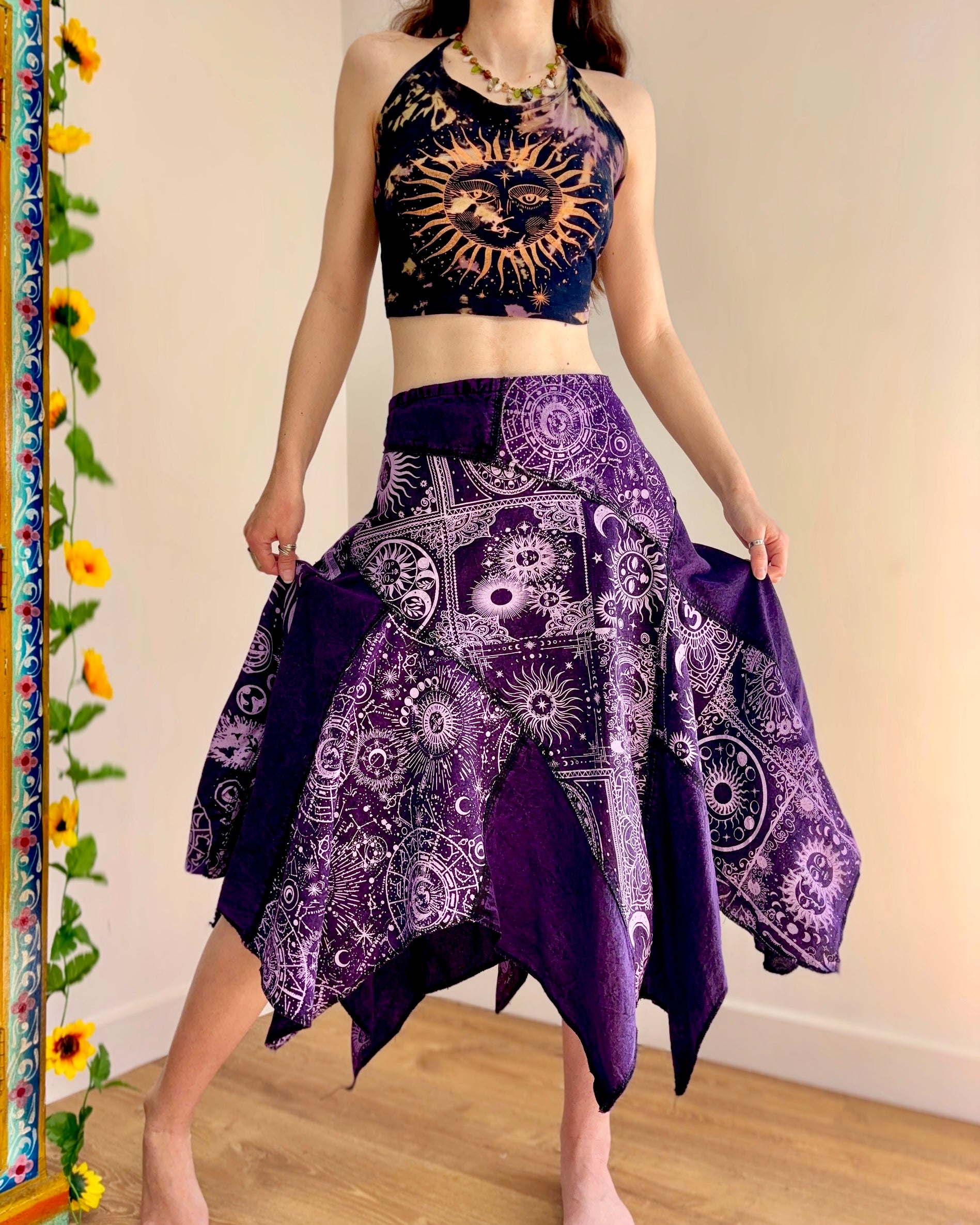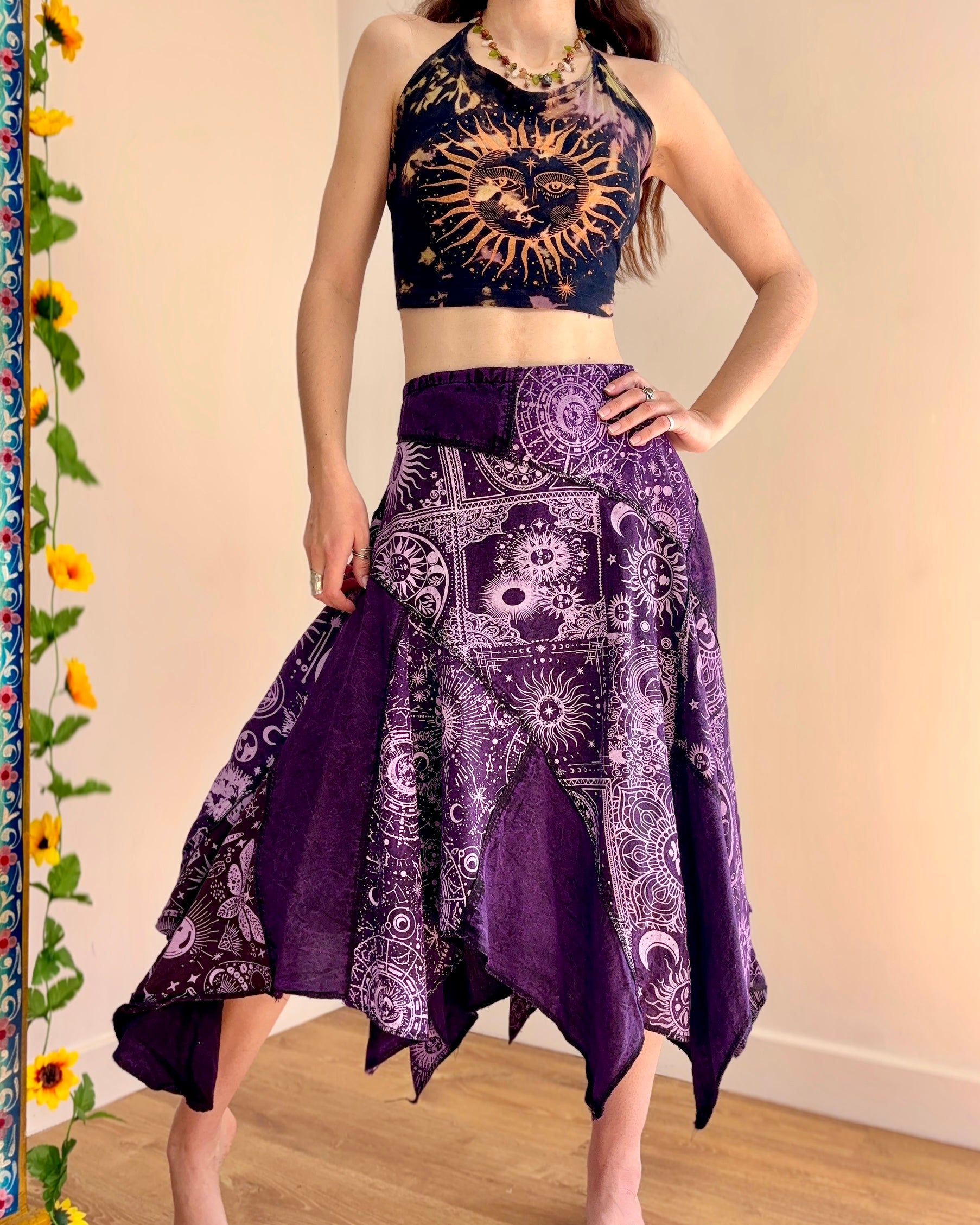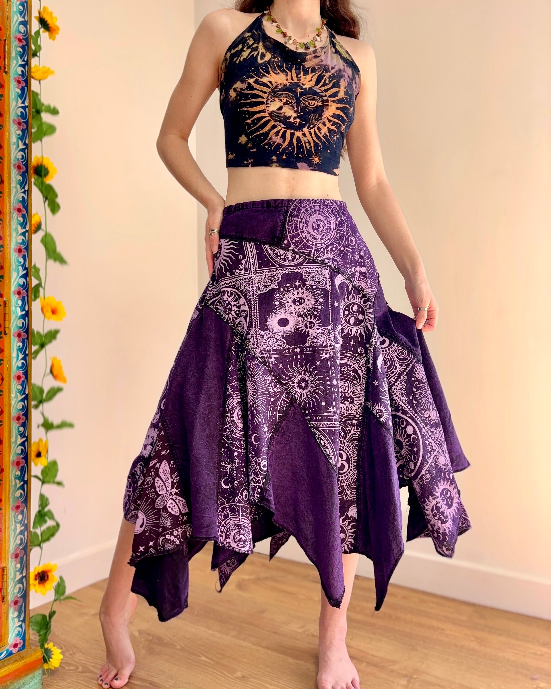 This magical purple skirt features patches of celestial fabric, with an asymmetric style bottom giving a fairy hippie look.