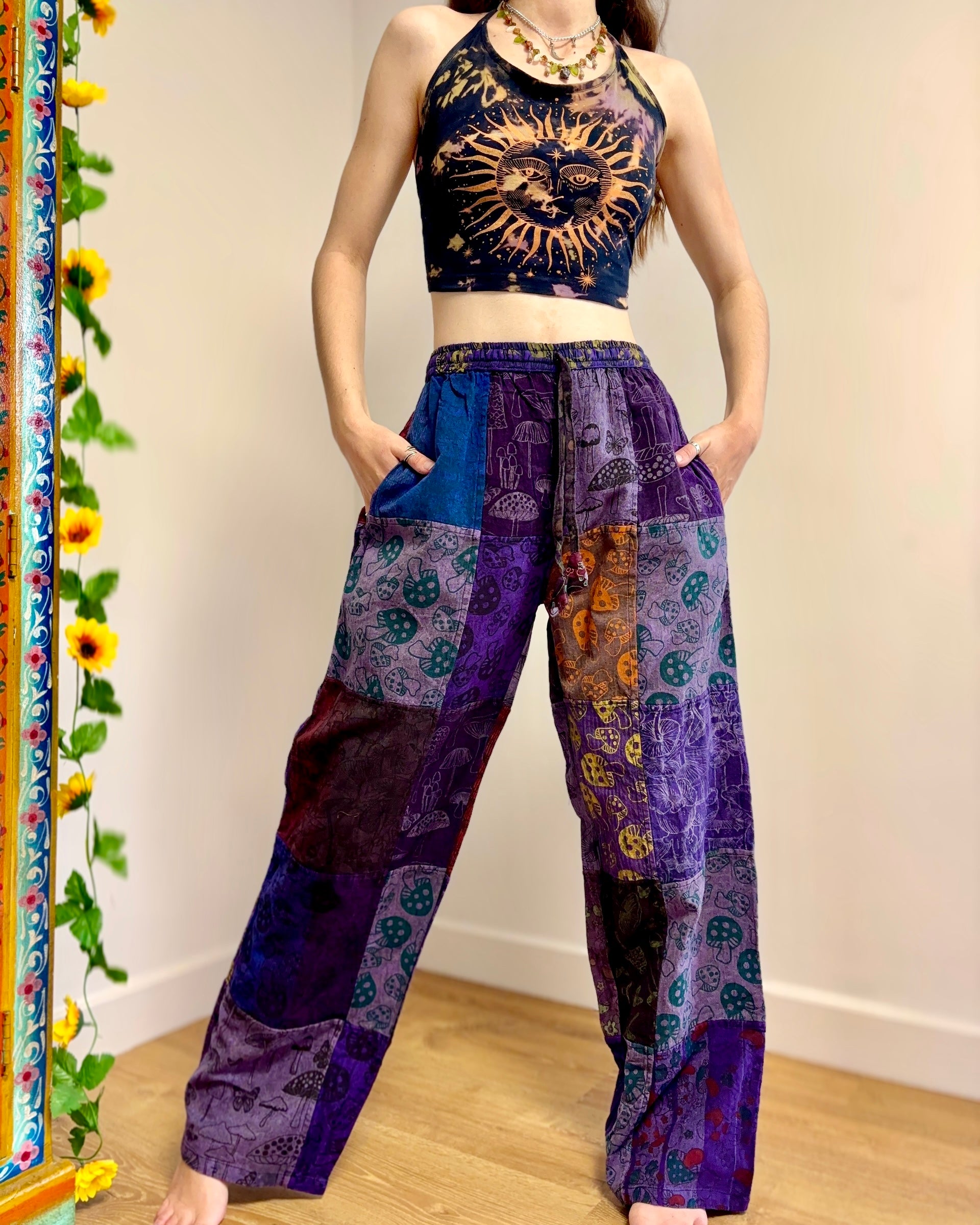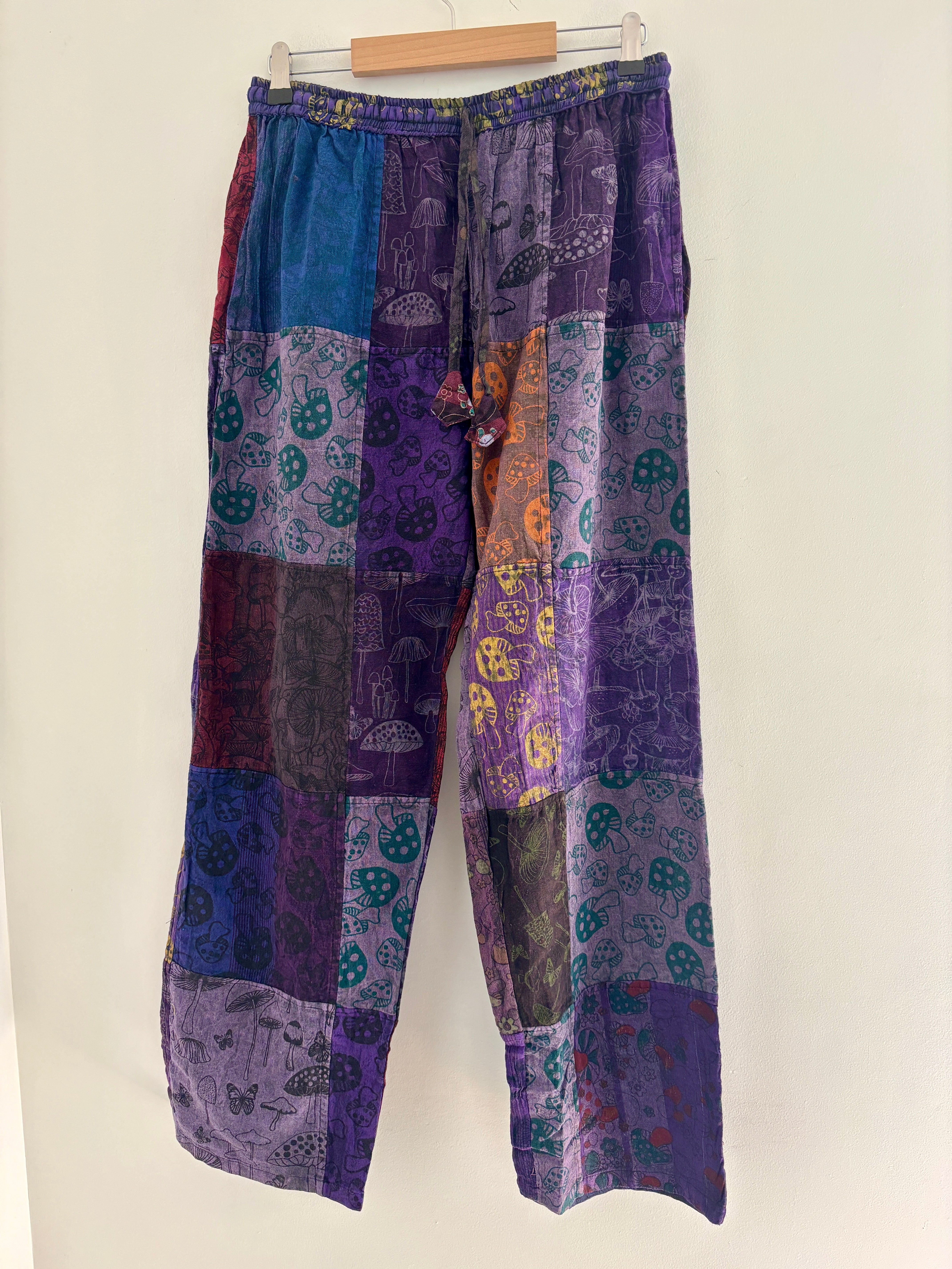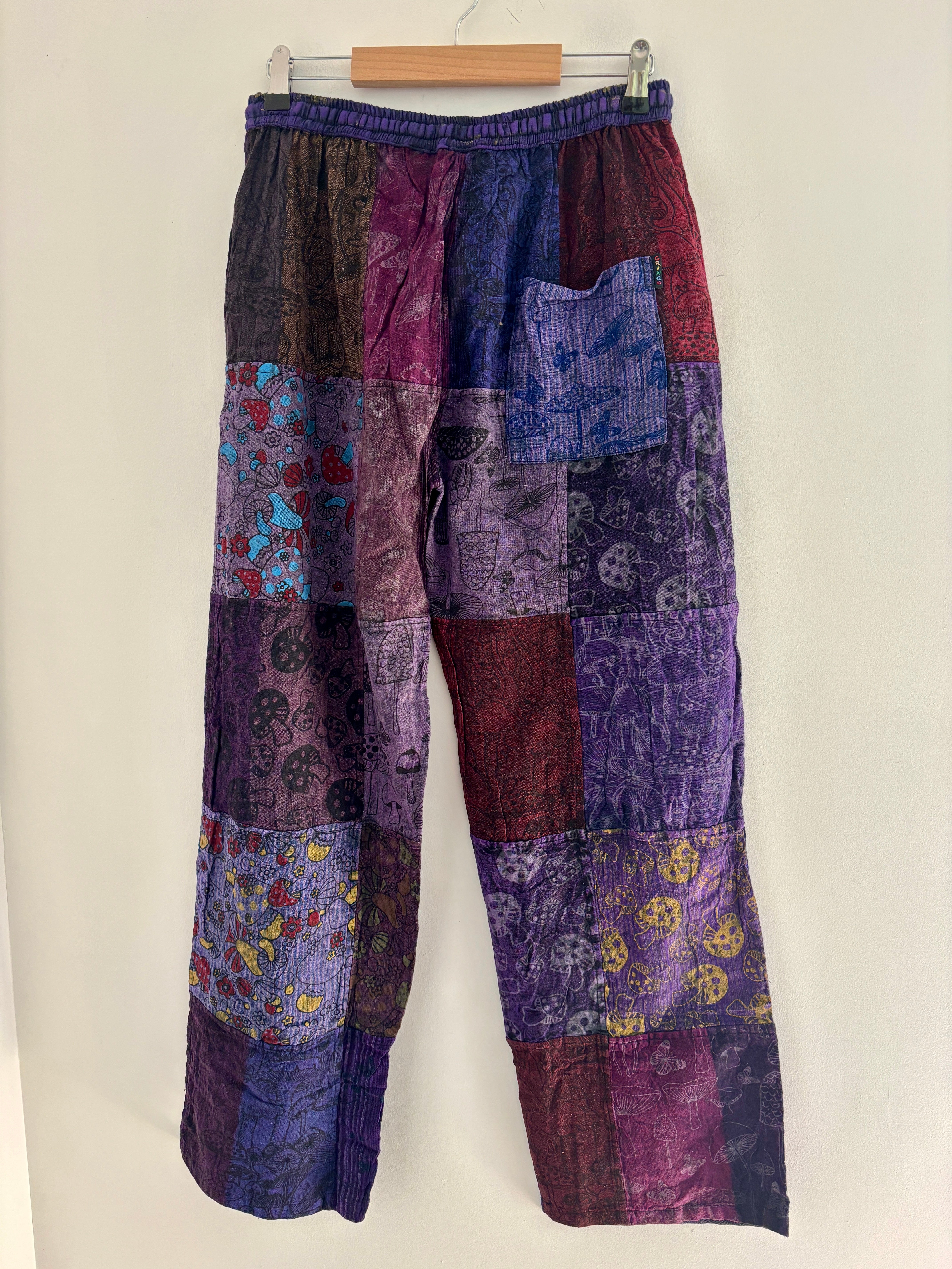 Patchwork trousers, featuring fabric decorated with mushrooms in purple tones. They have an elasticated waist and two front pockets.