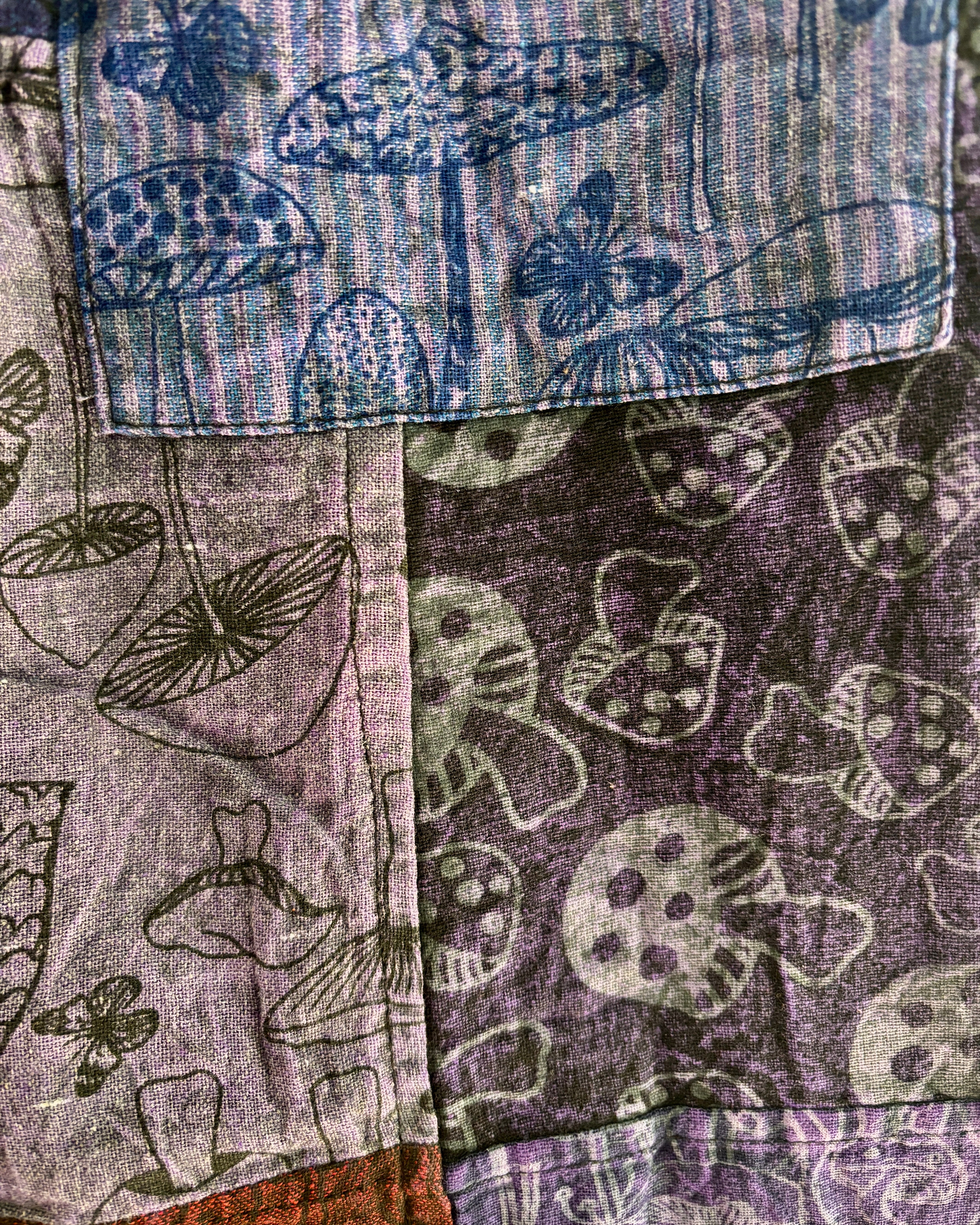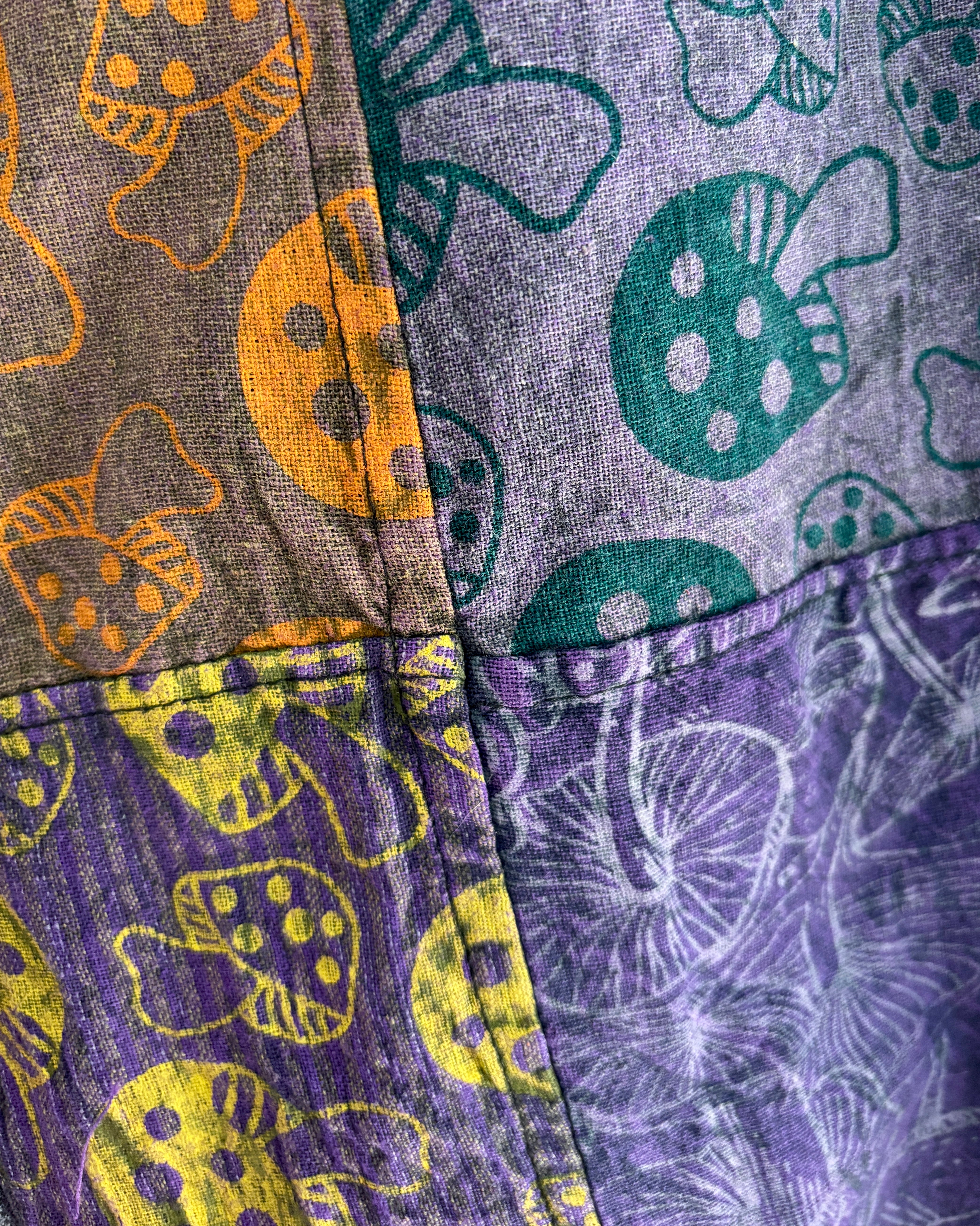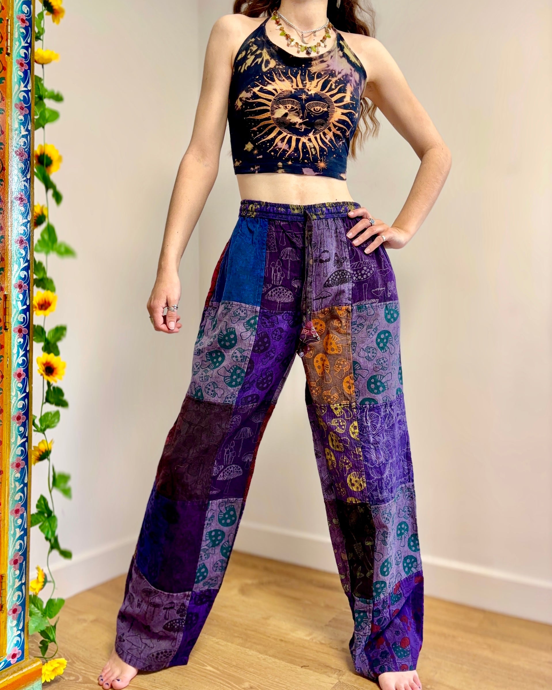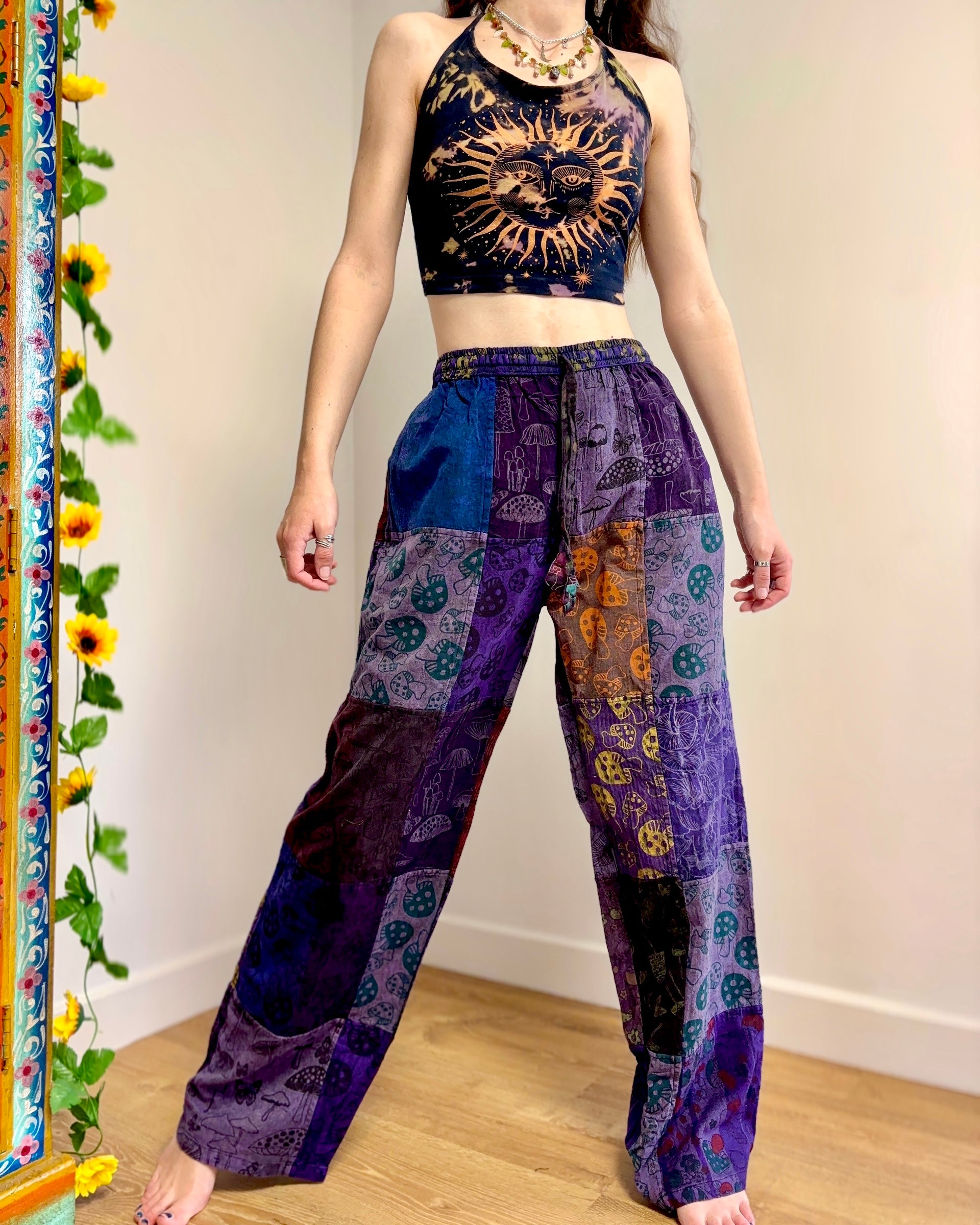Patchwork trousers, featuring fabric decorated with mushrooms in purple tones. They have an elasticated waist and two front pockets.