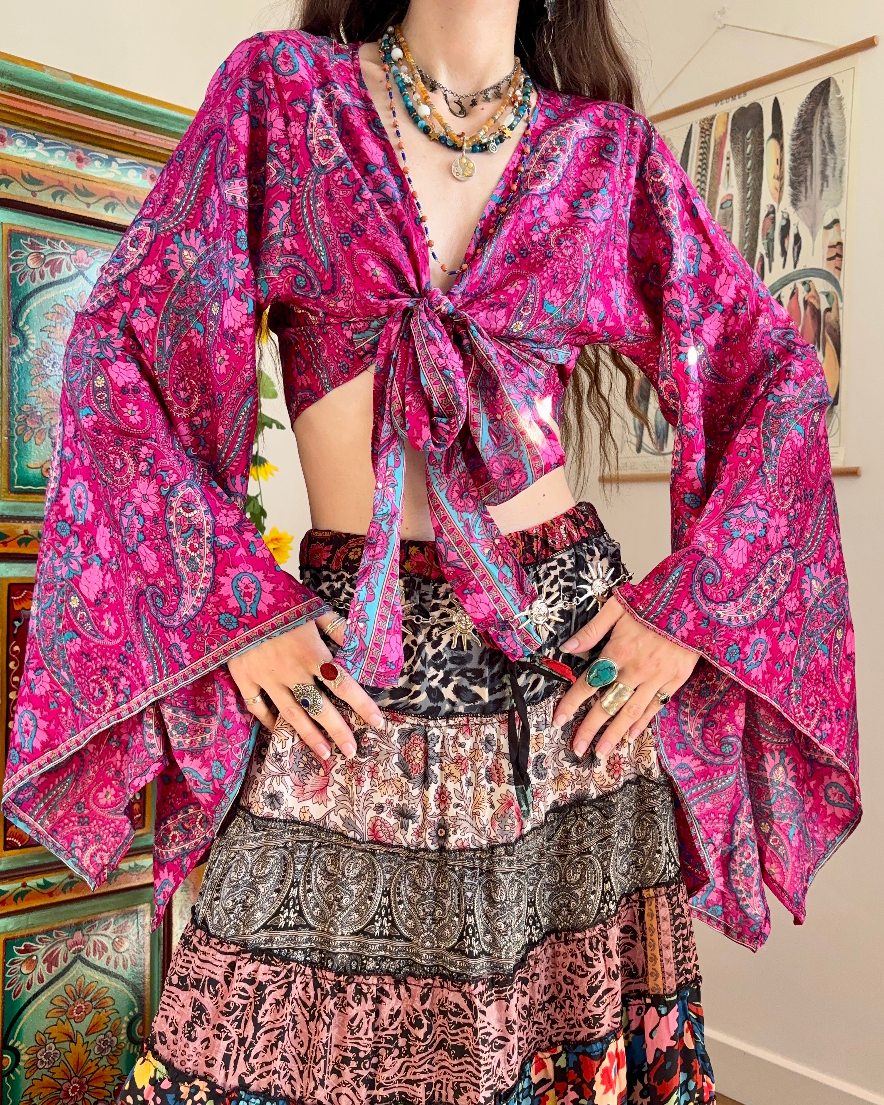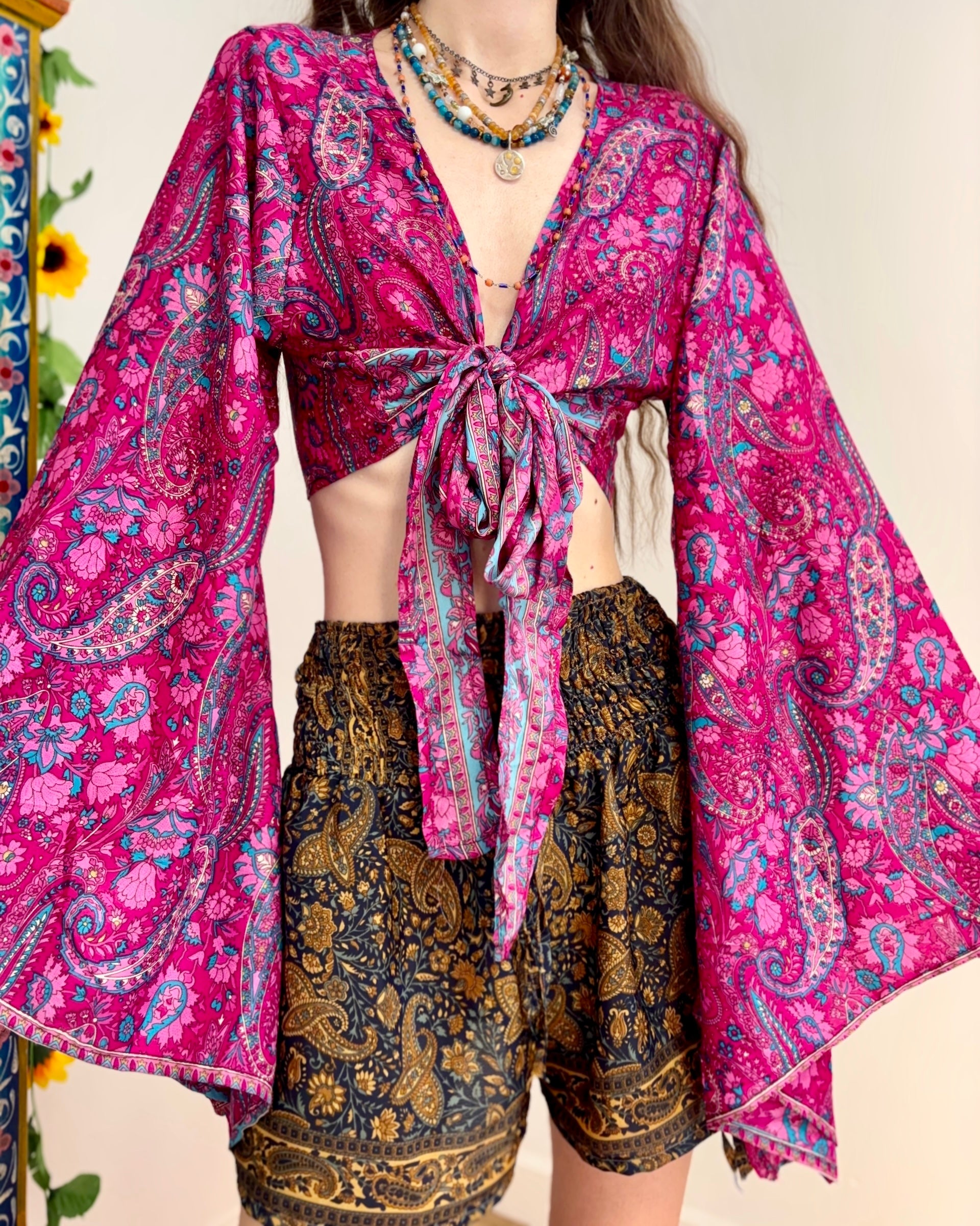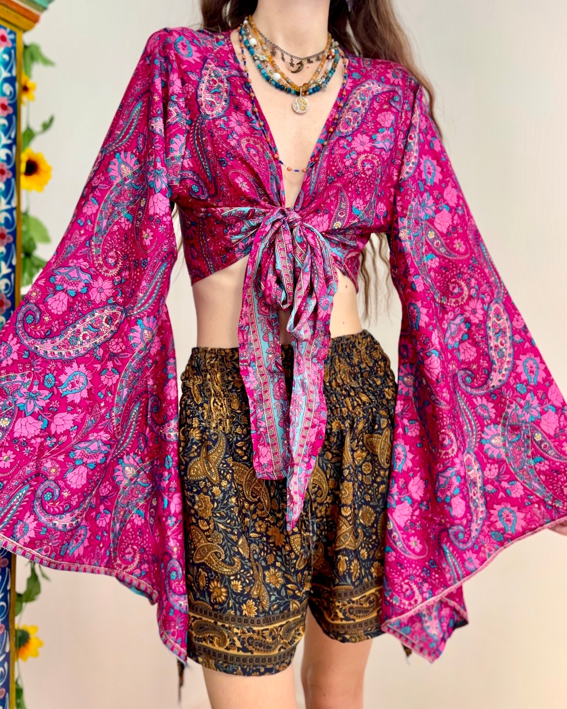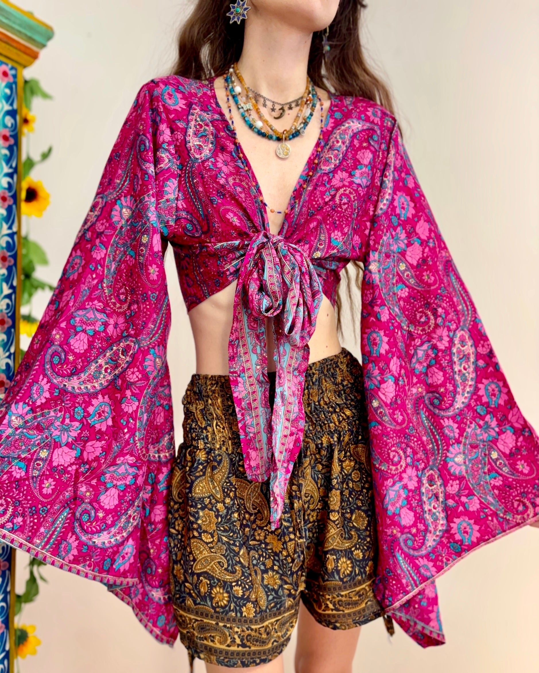 These beautiful bell sleeve tops are made from recycled Sari silk, that would have otherwise gone to waste! With flared sleeves & large ties, they can be worn in a variety of ways.