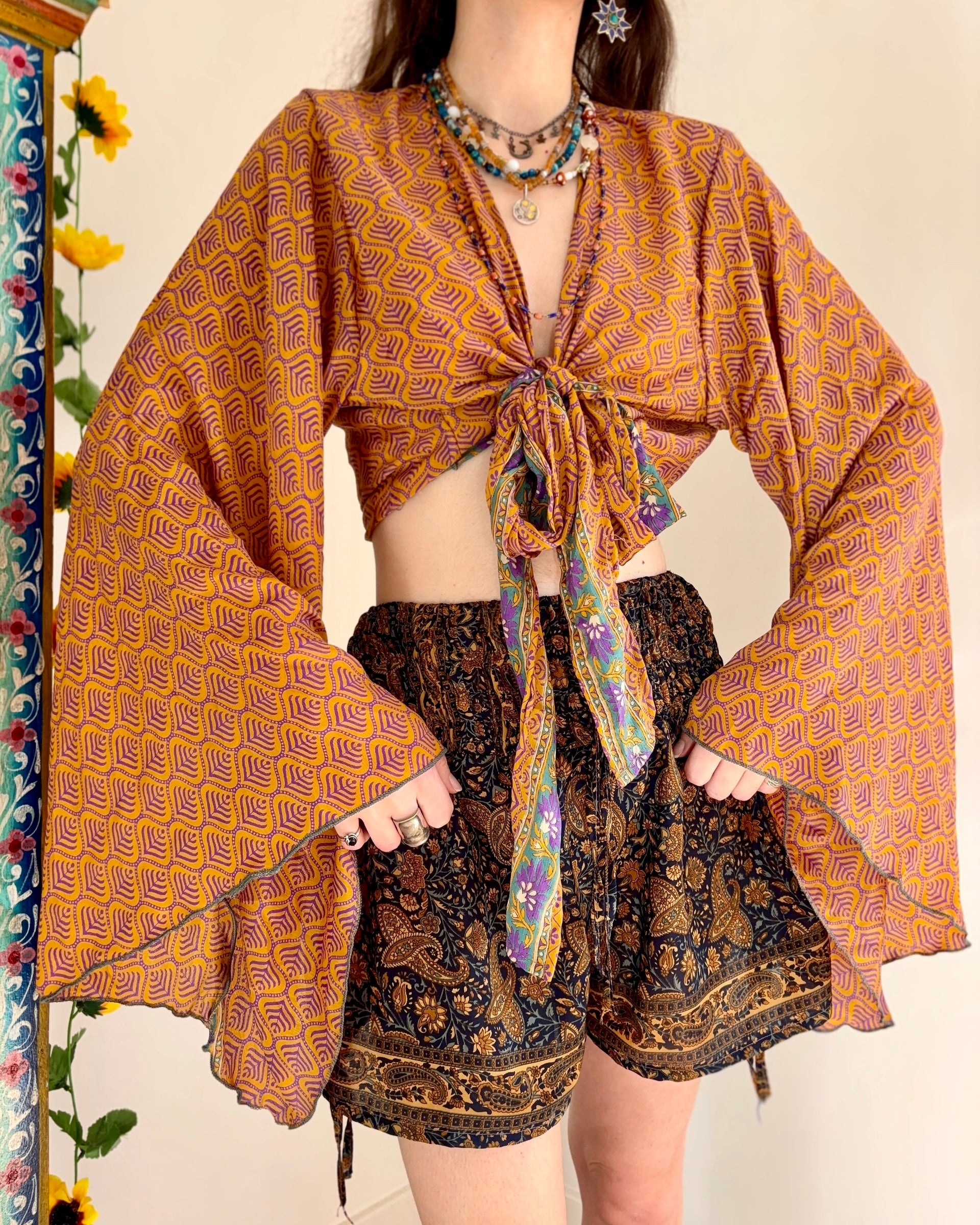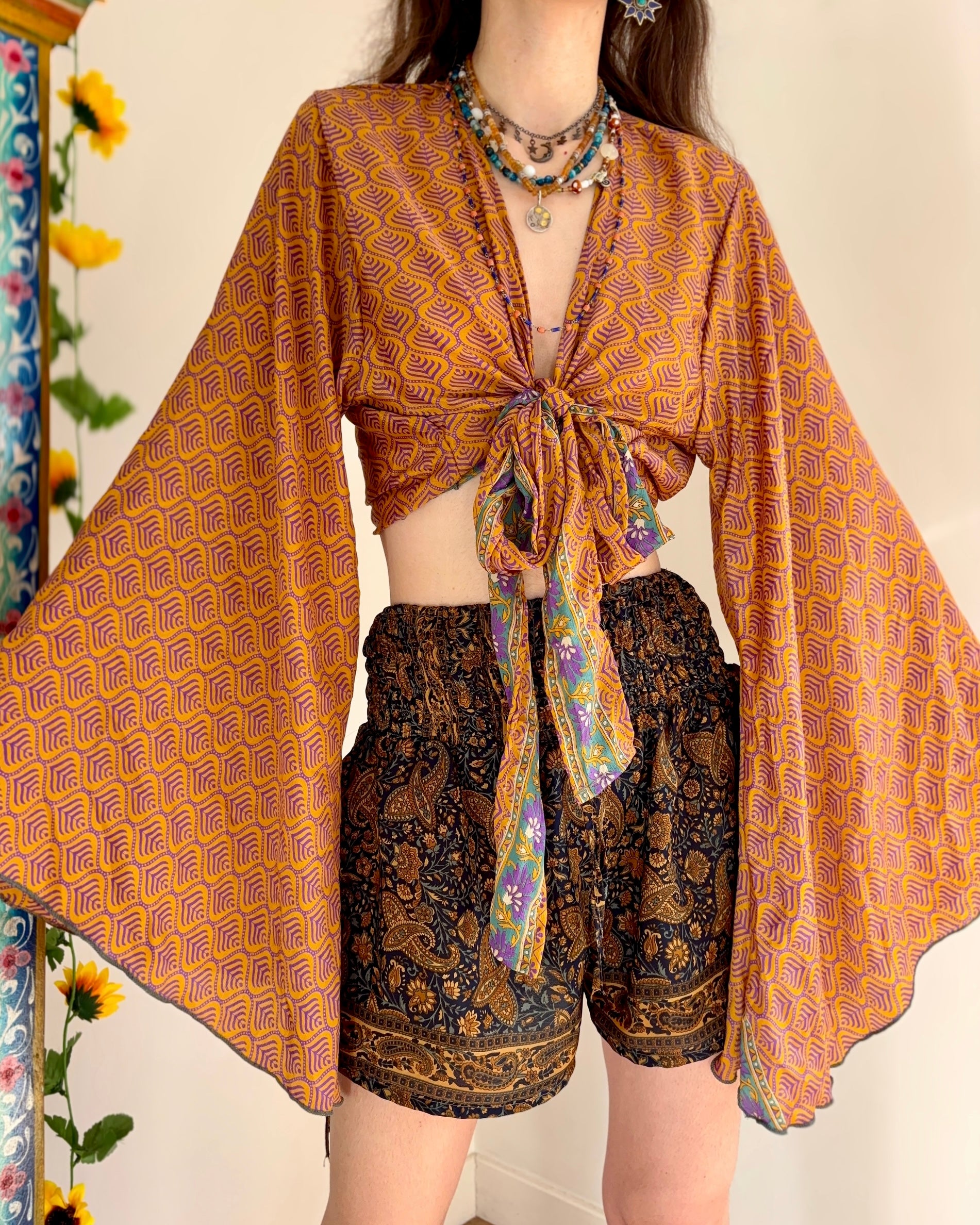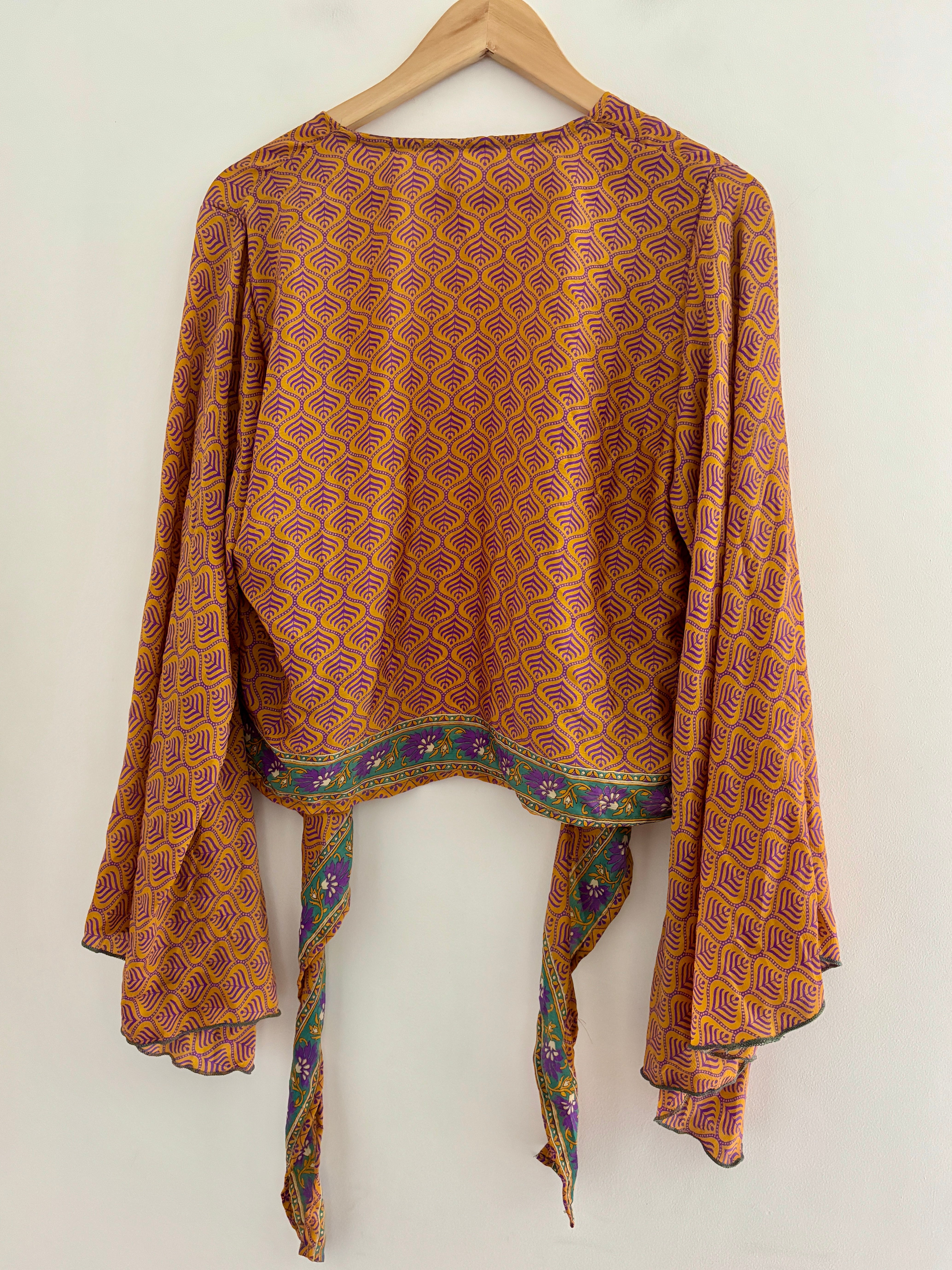 These beautiful bell sleeve tops are made from recycled Sari silk, that would have otherwise gone to waste! With flared sleeves & large ties, they can be worn in a variety of ways.