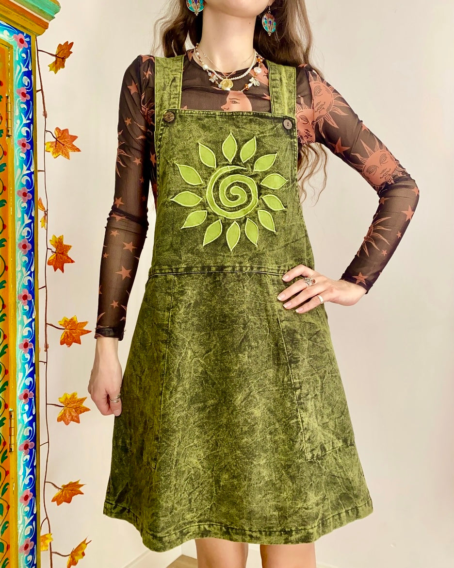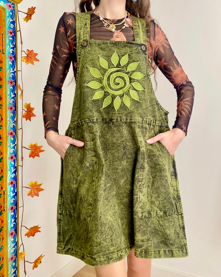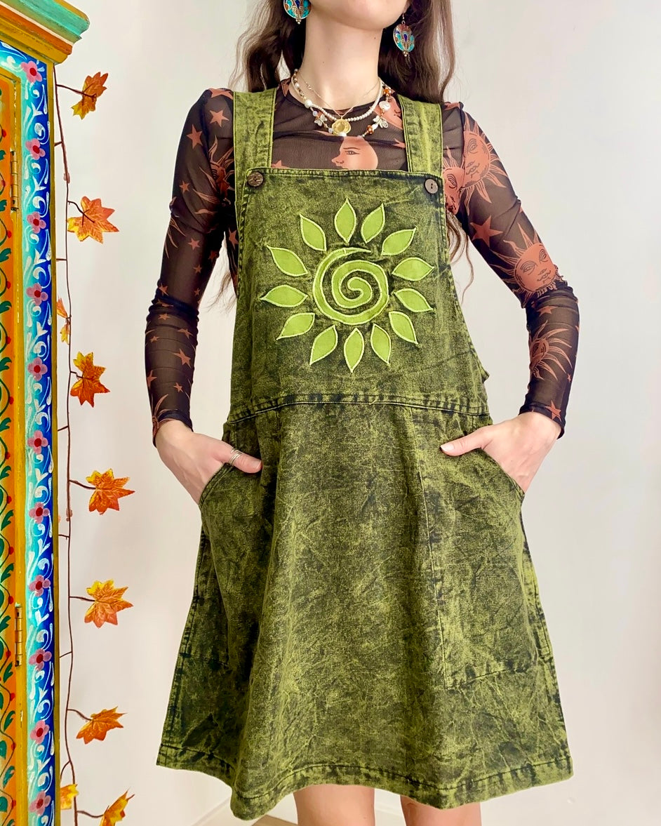 This earthy green pinafore dress features a sun spiral design. Each dress has adjustable straps & two front pockets. Looks magical with chunky boots and tights!