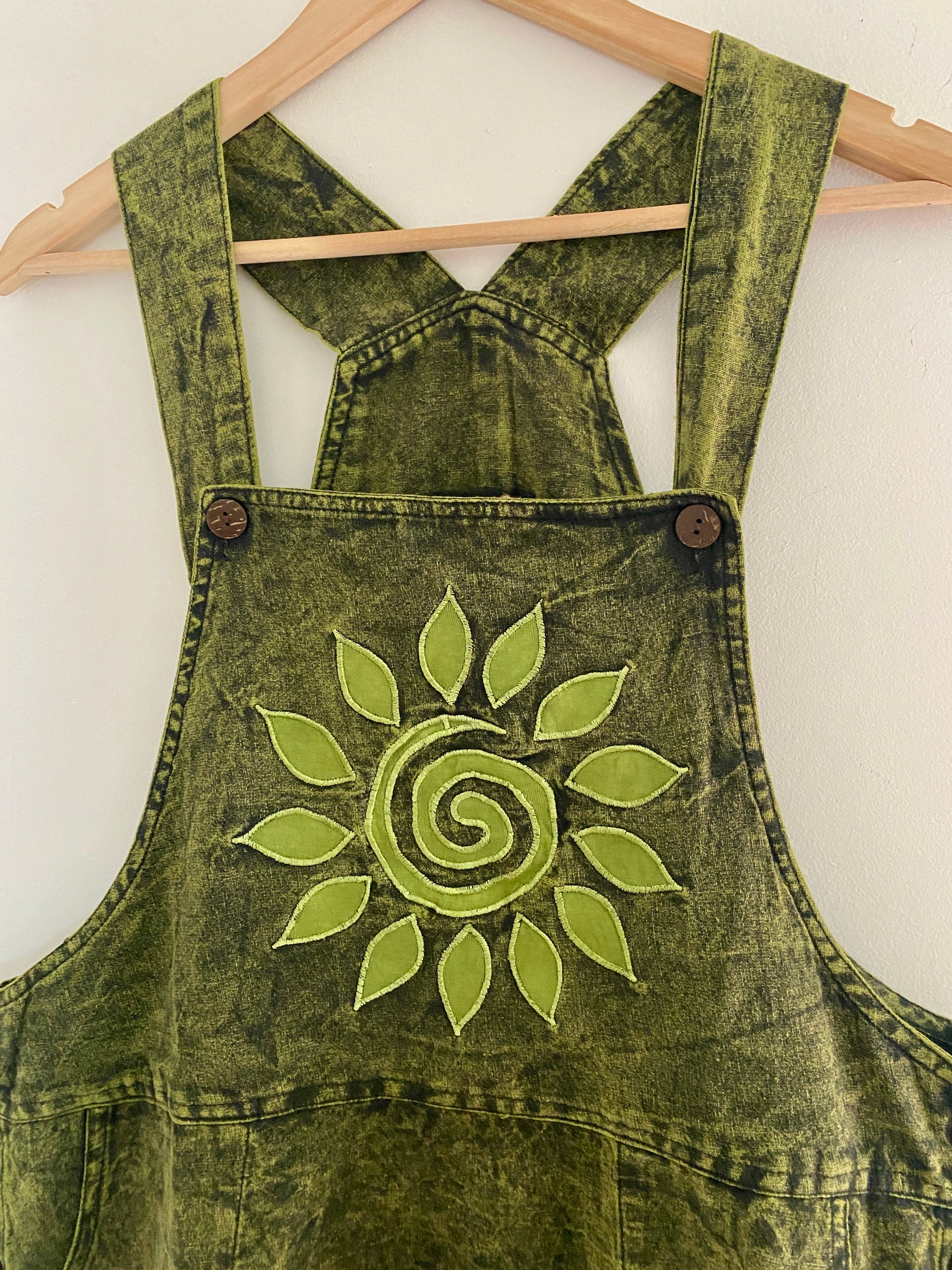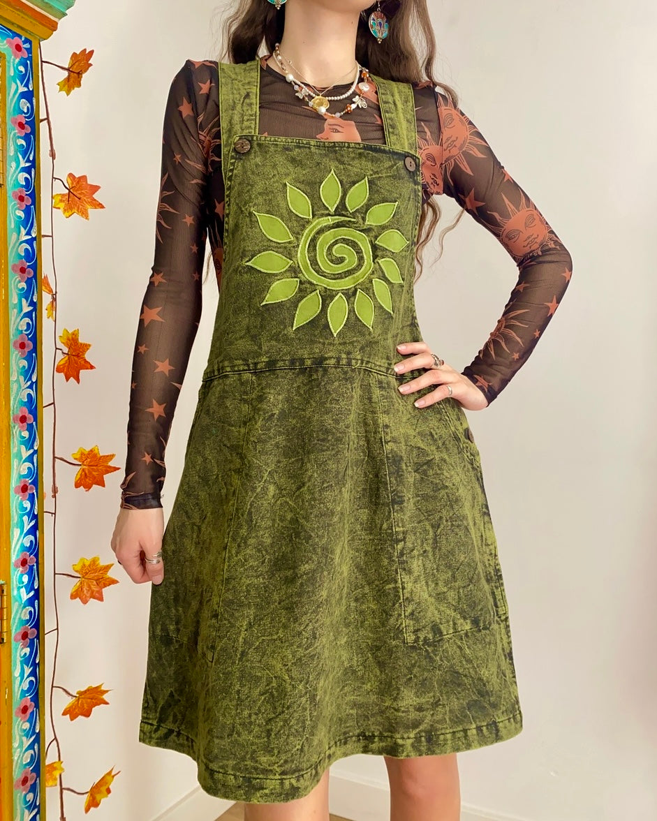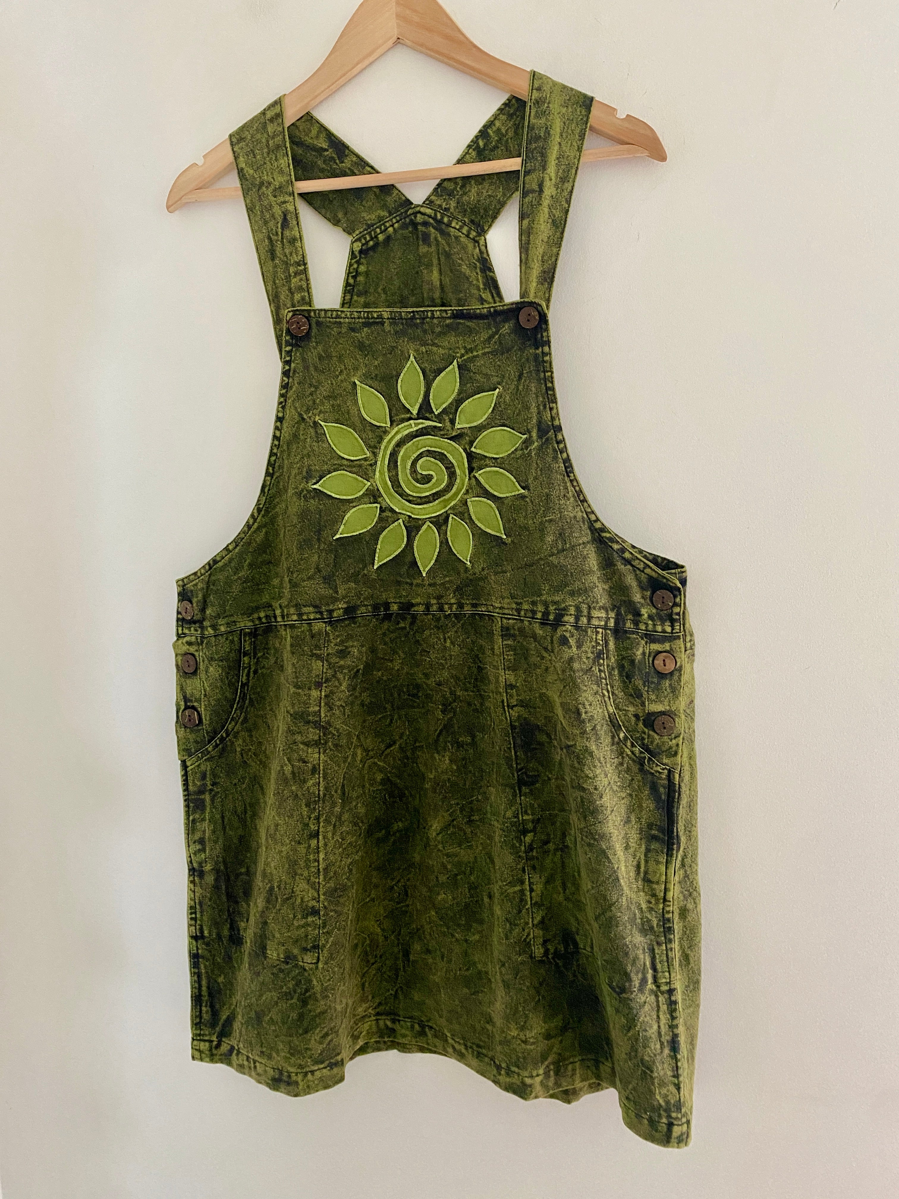 This earthy green pinafore dress features a sun spiral design. Each dress has adjustable straps & two front pockets. Looks magical with chunky boots and tights!