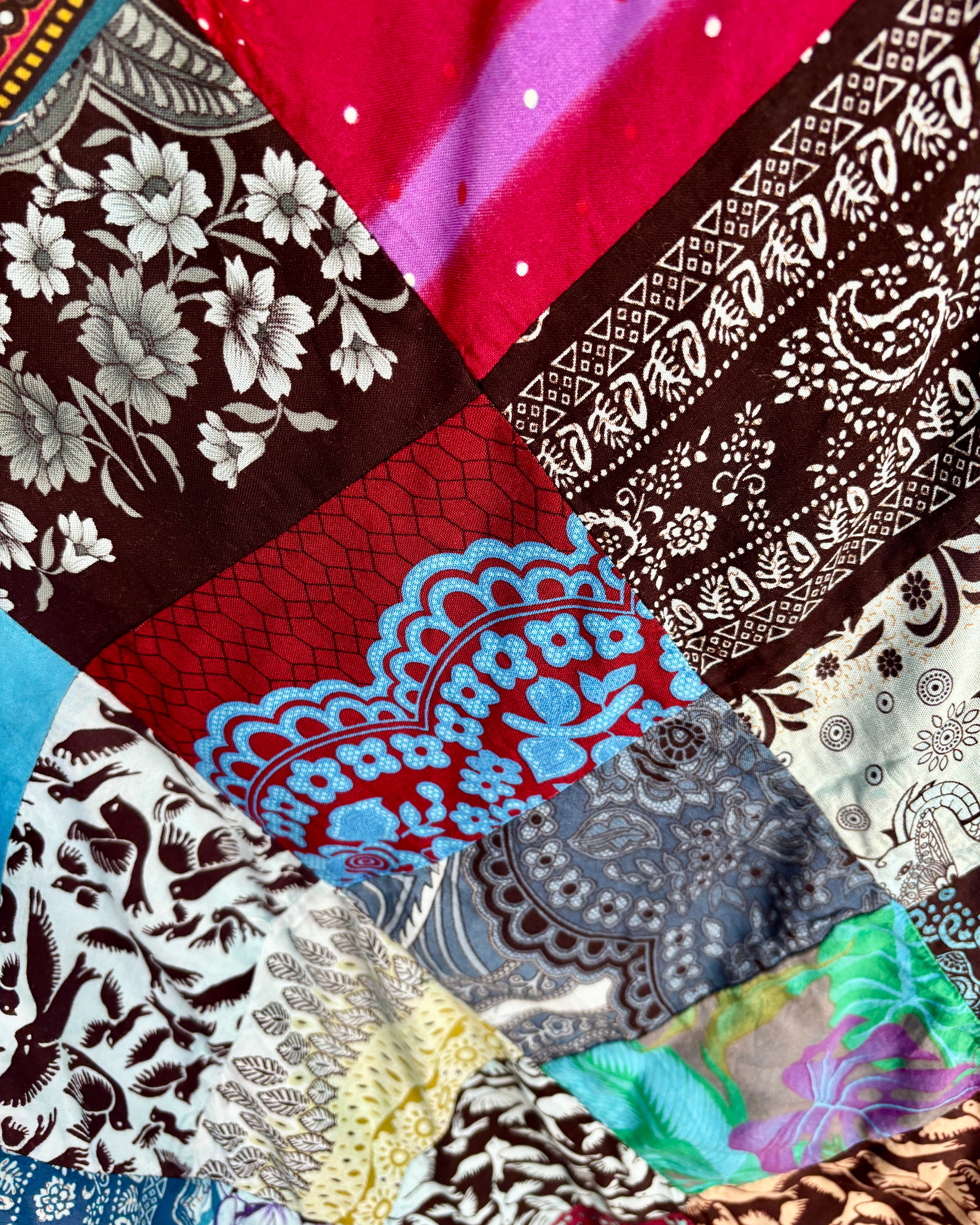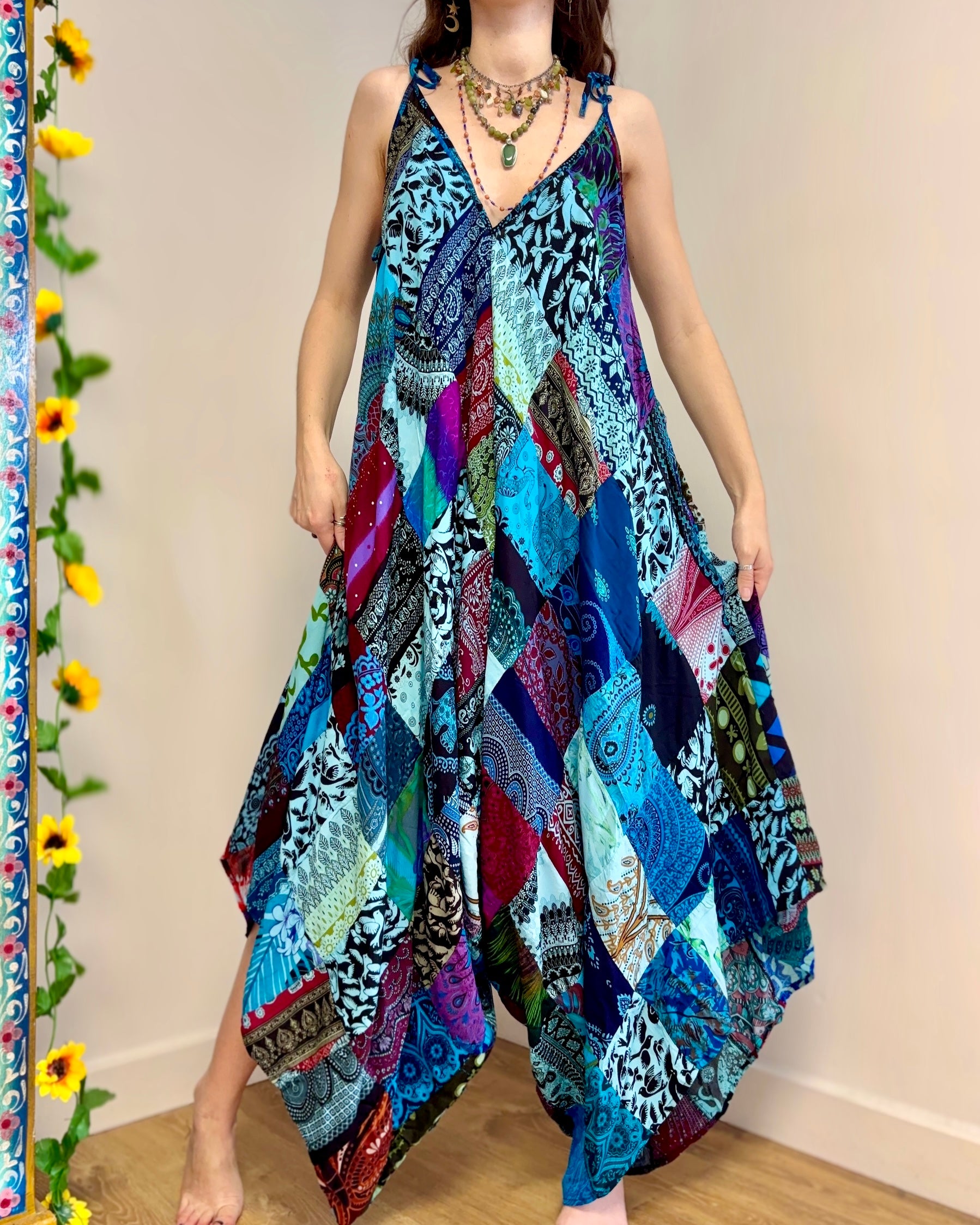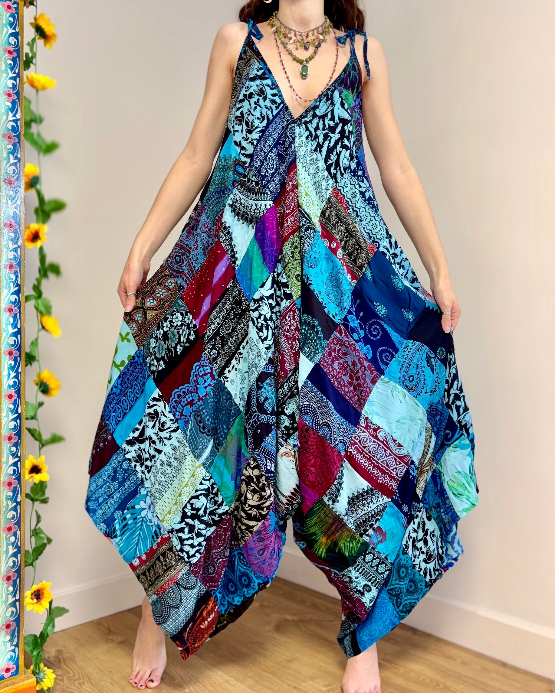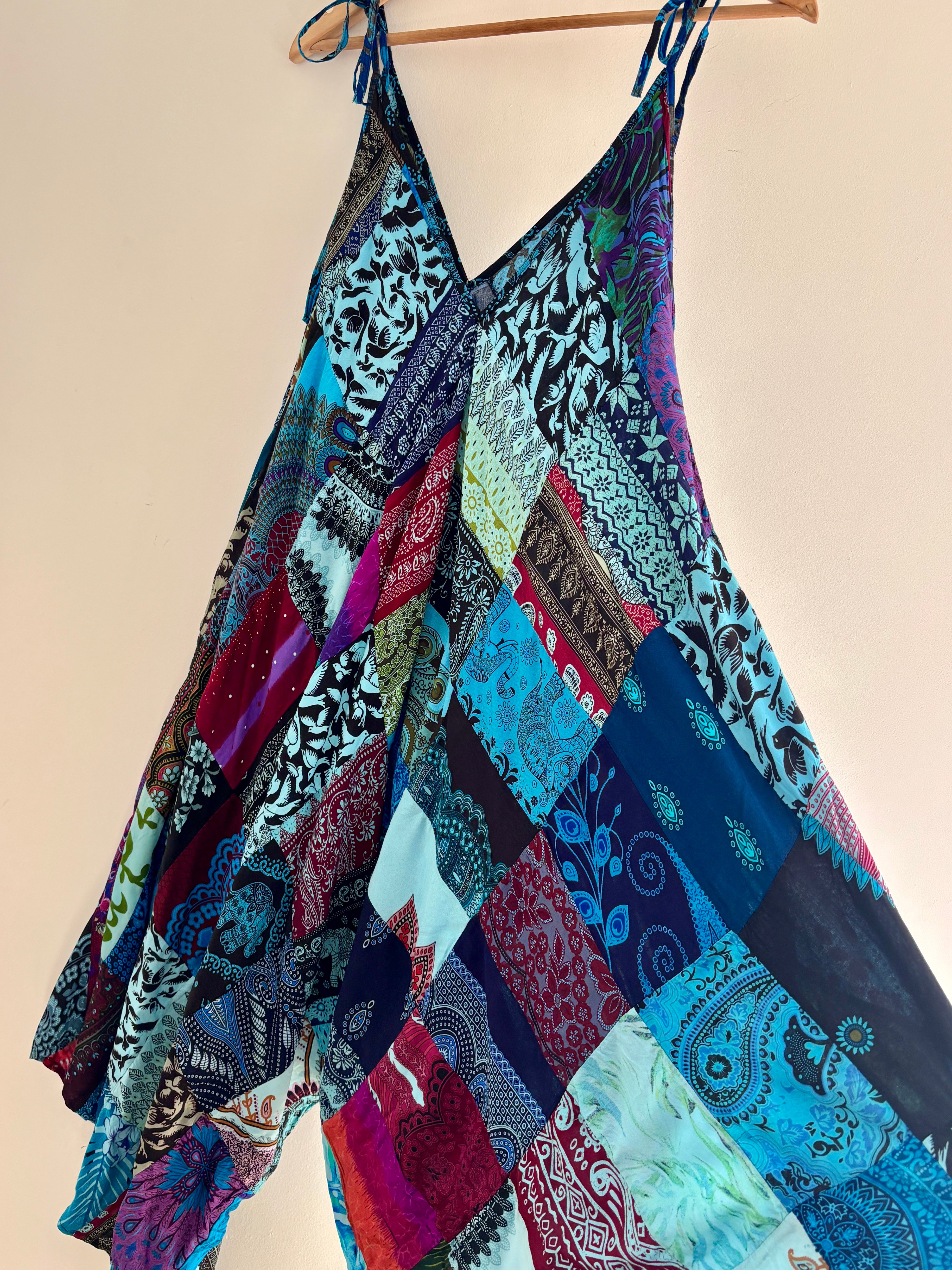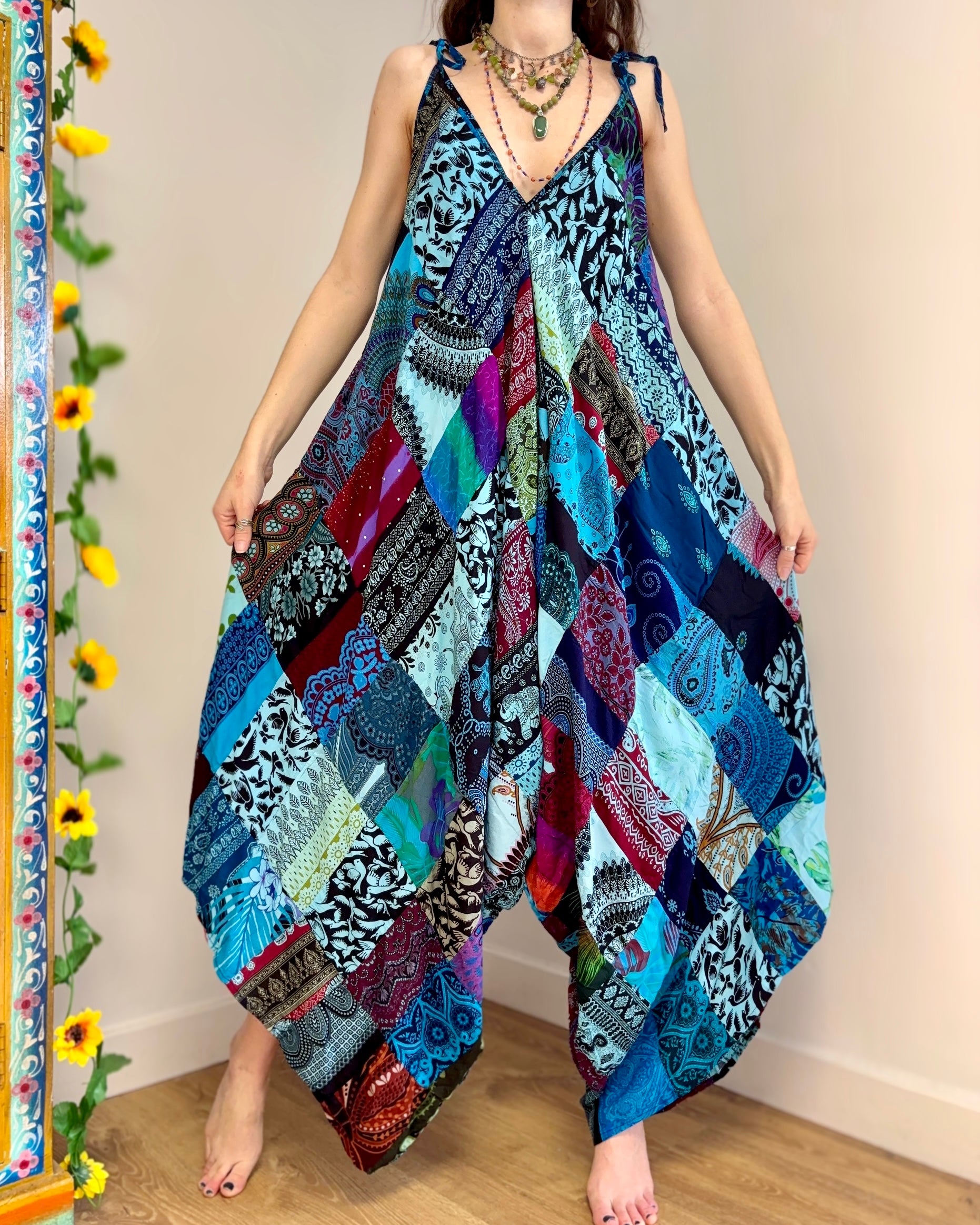 These jumpsuits are made from beautiful purple patchwork Thai fabric. They tie at the back and neck, with wide legs for a comfortable fit.