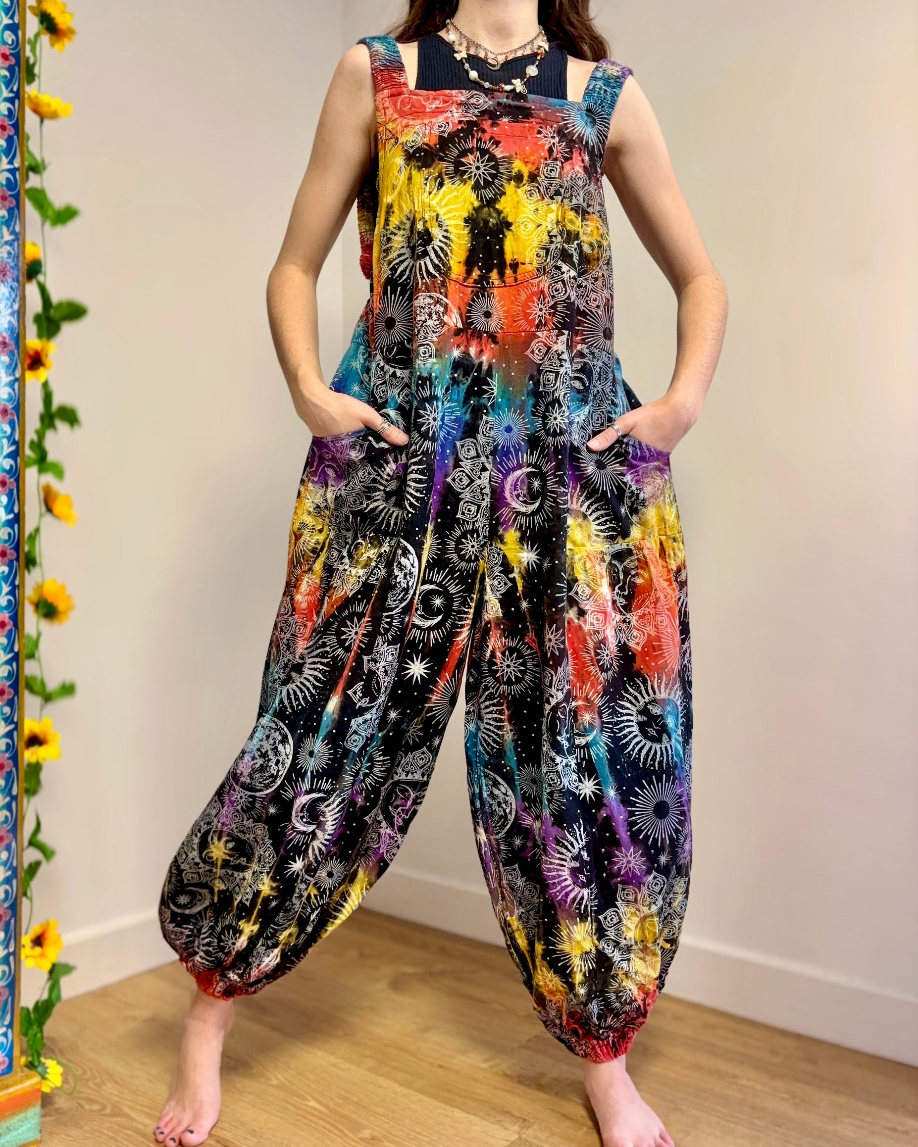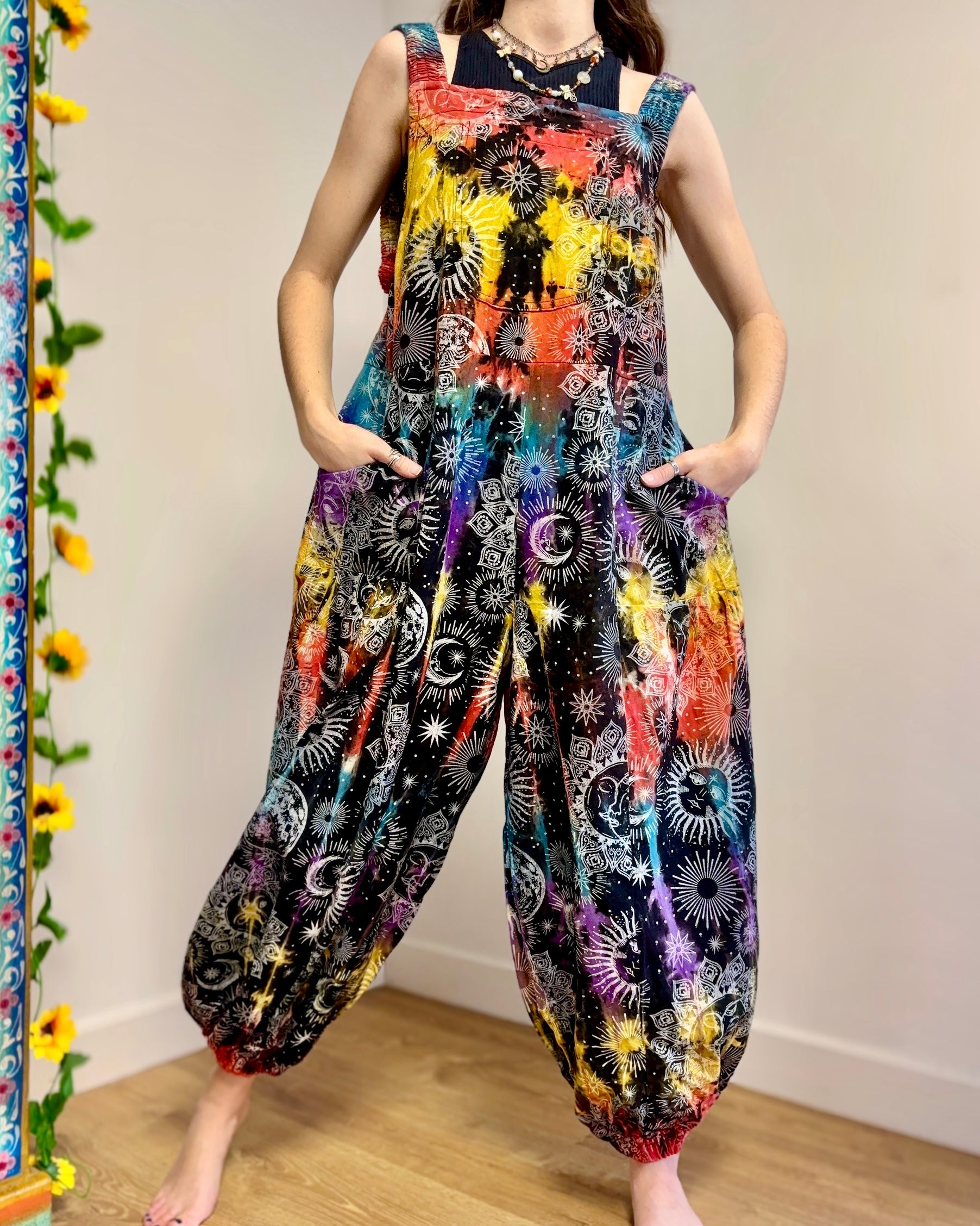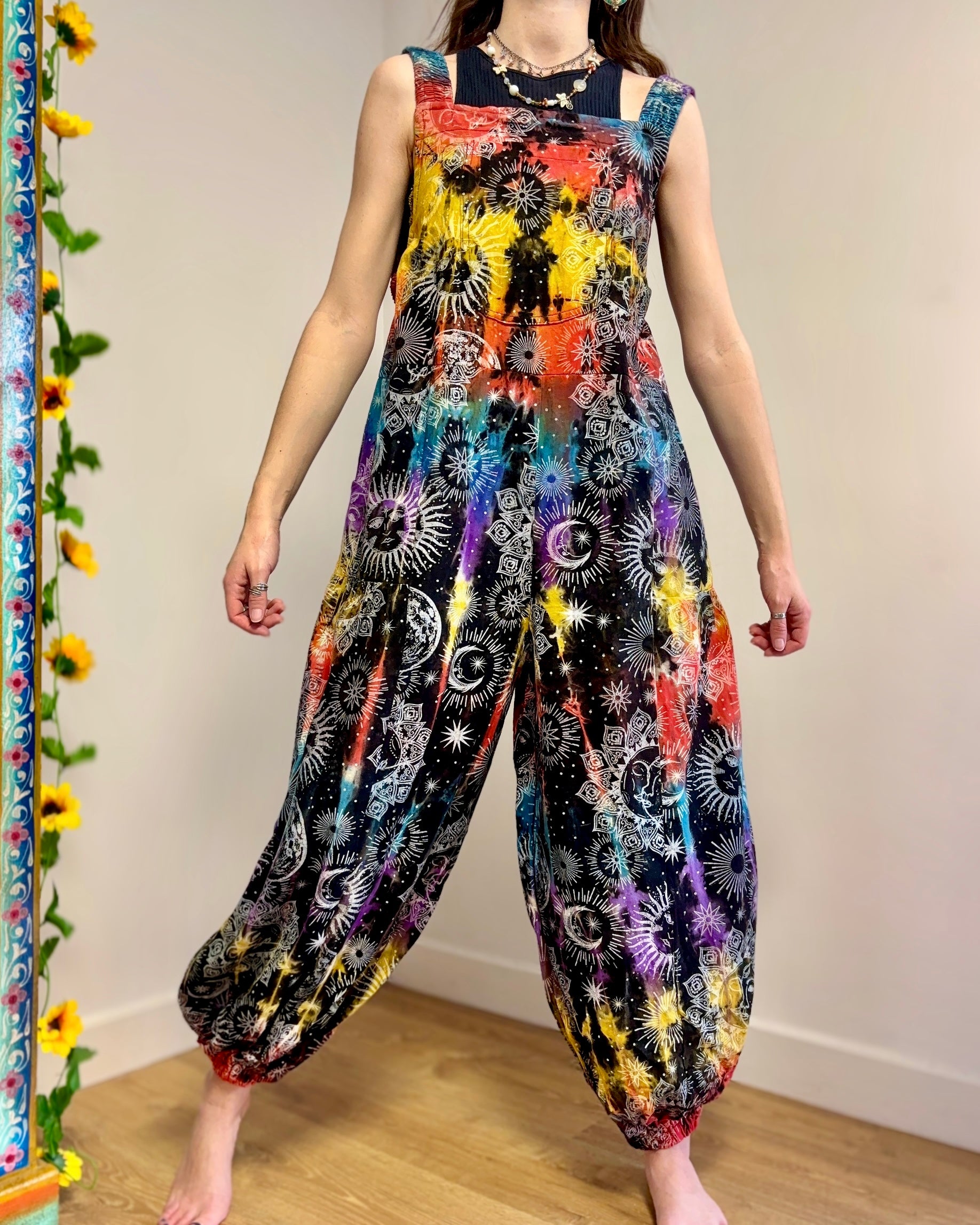 Super funky overalls made from celestial print tie-dye fabric. Made from 100% cotton, with adjustable straps, 2 side pockets and harem bottoms.