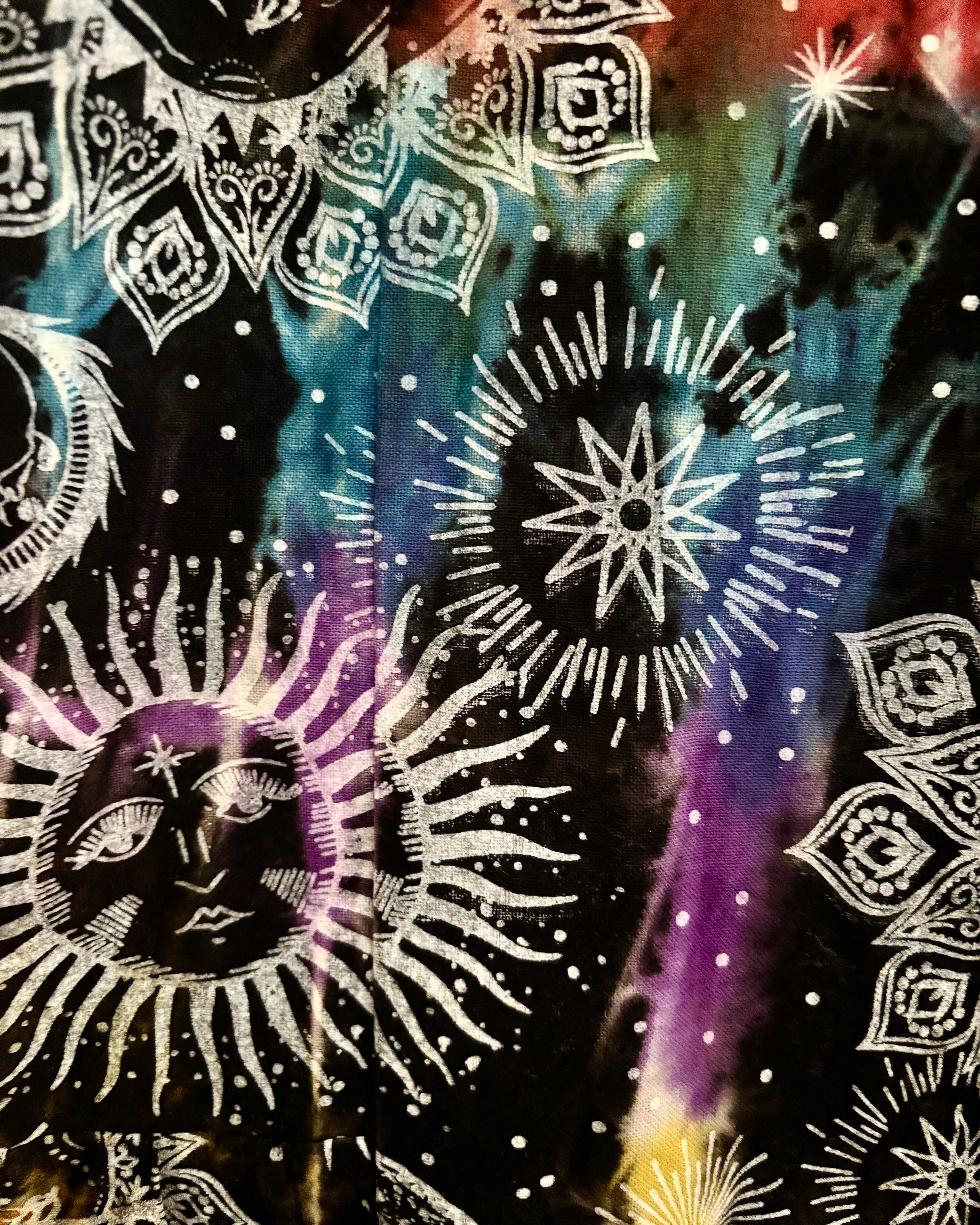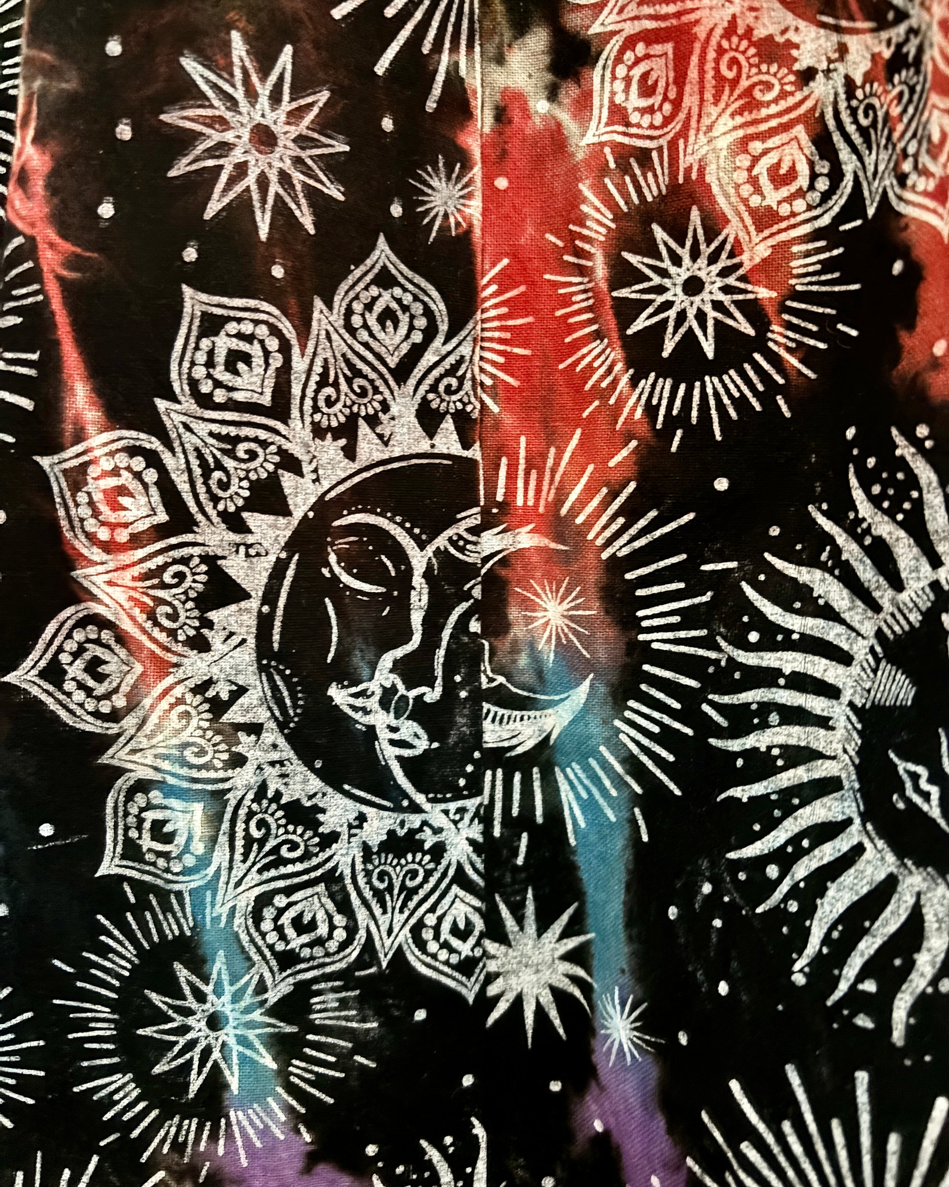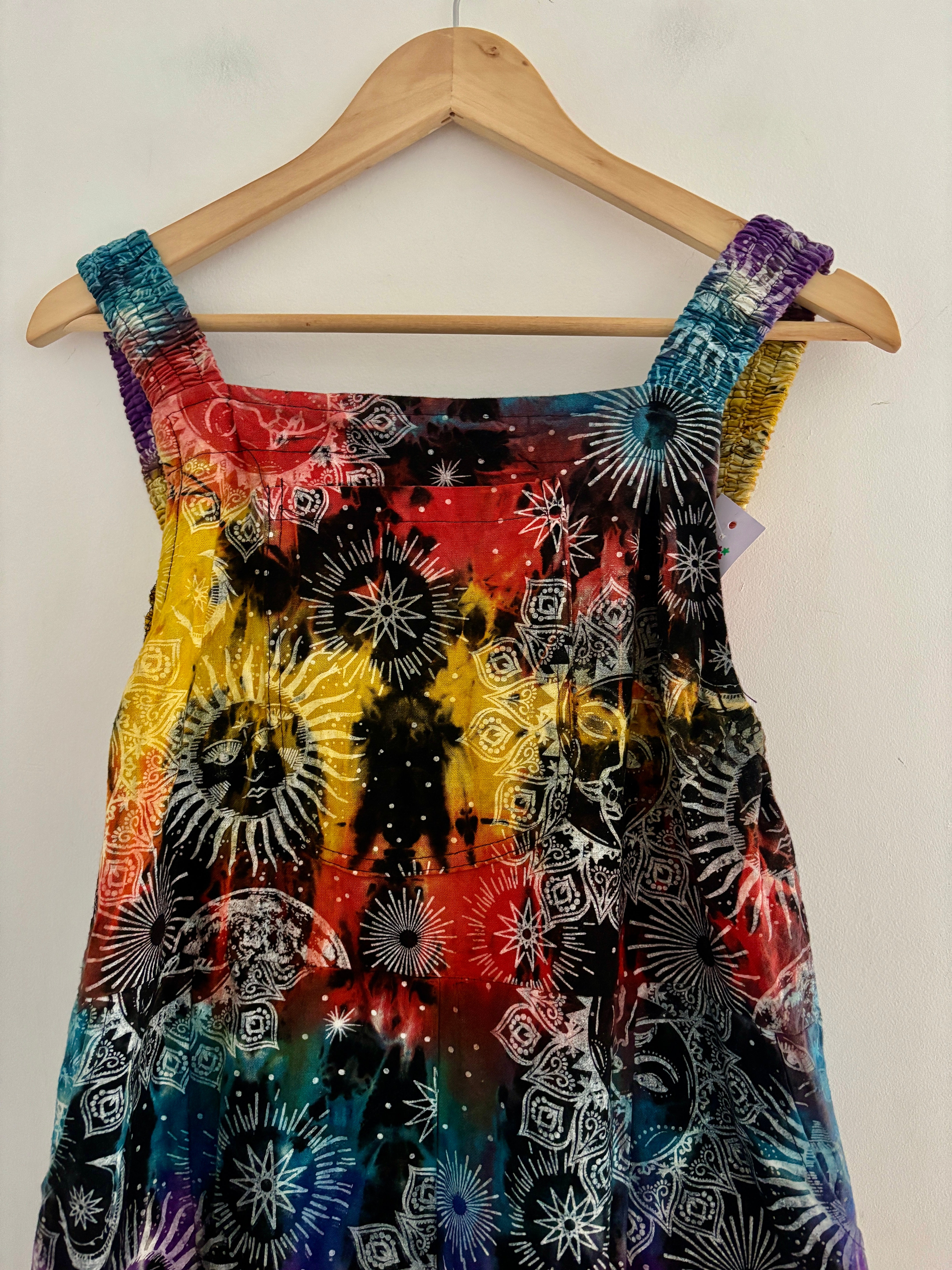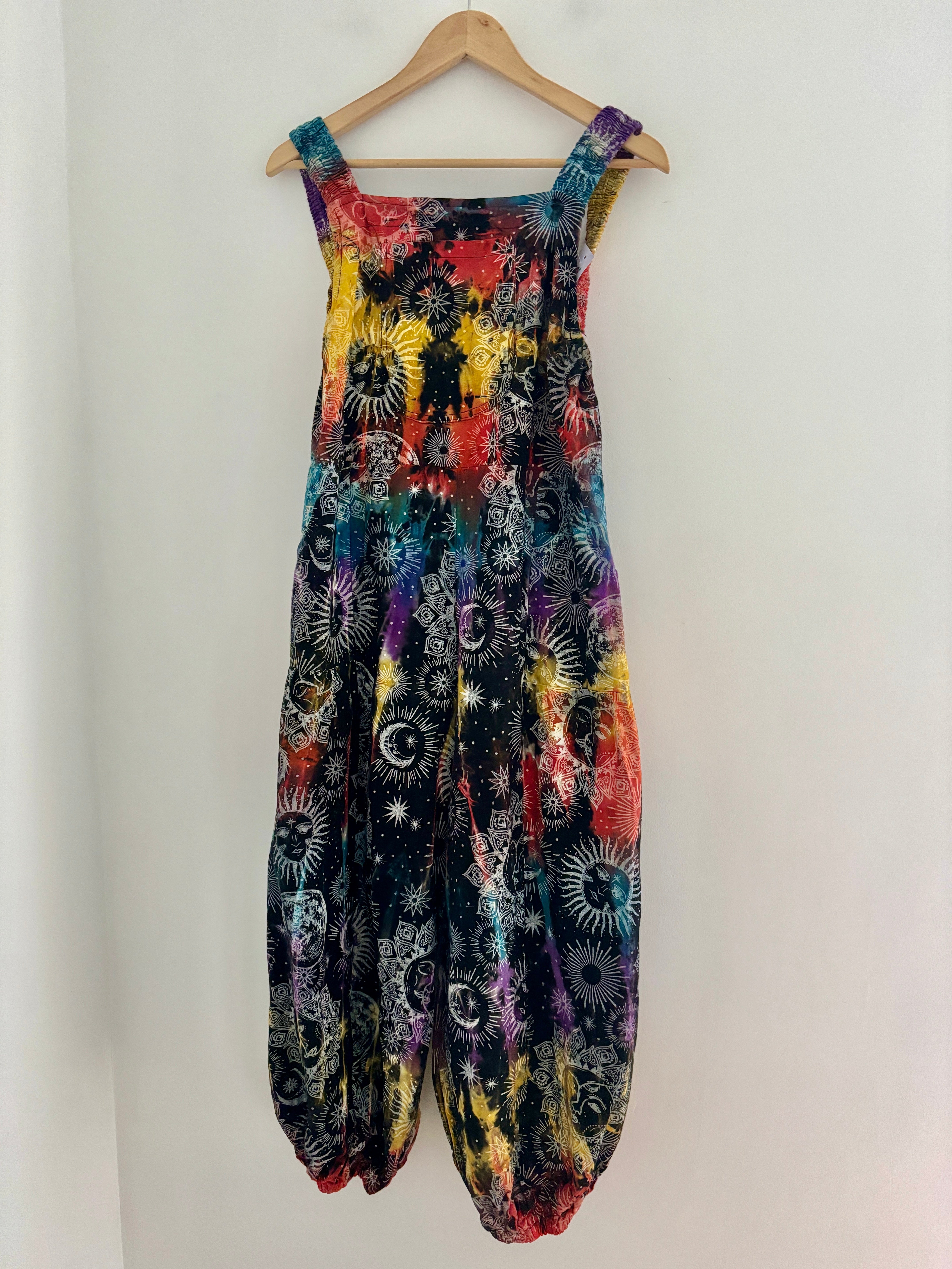 Super funky overalls made from celestial print tie-dye fabric. Made from 100% cotton, with adjustable straps, 2 side pockets and harem bottoms.
