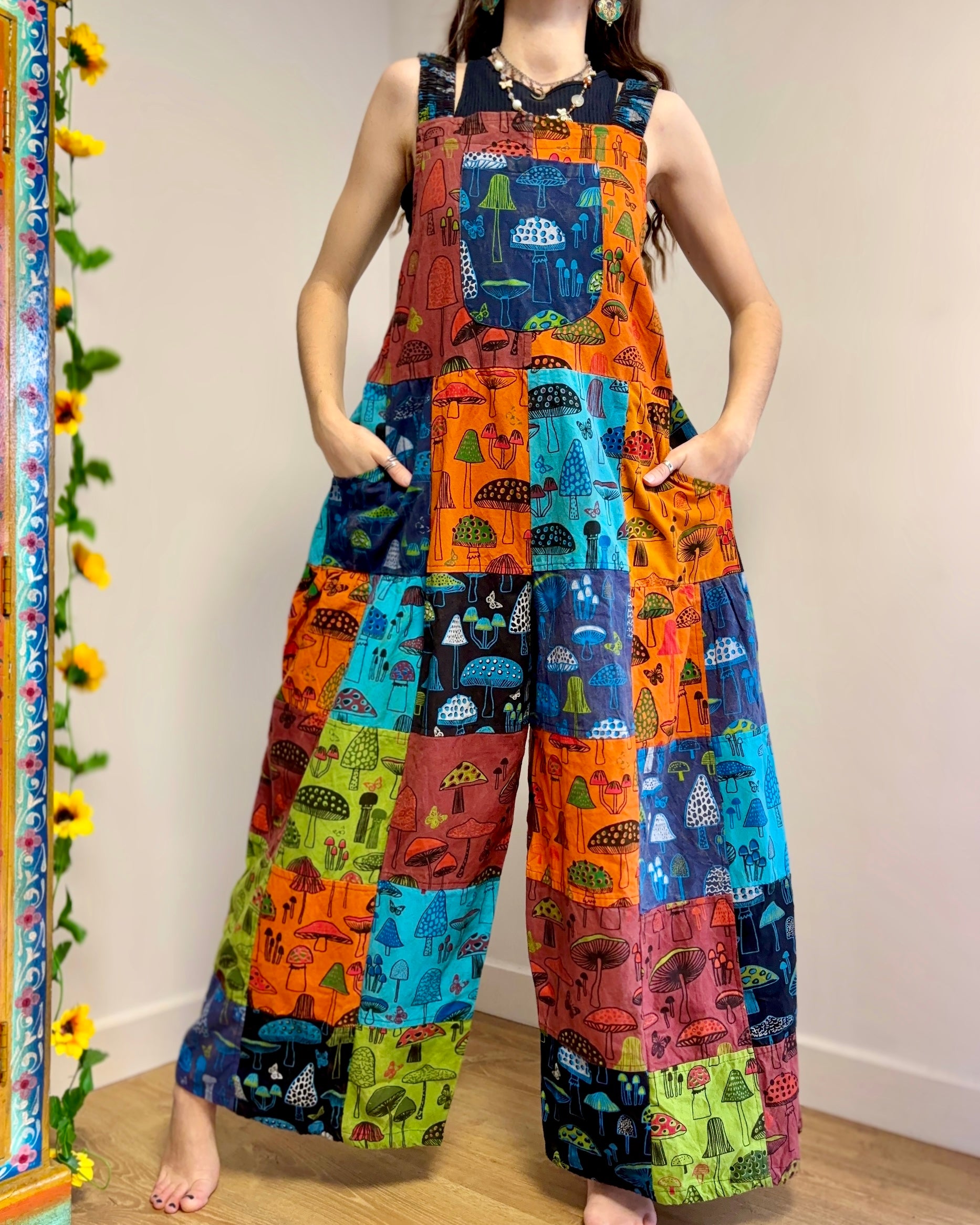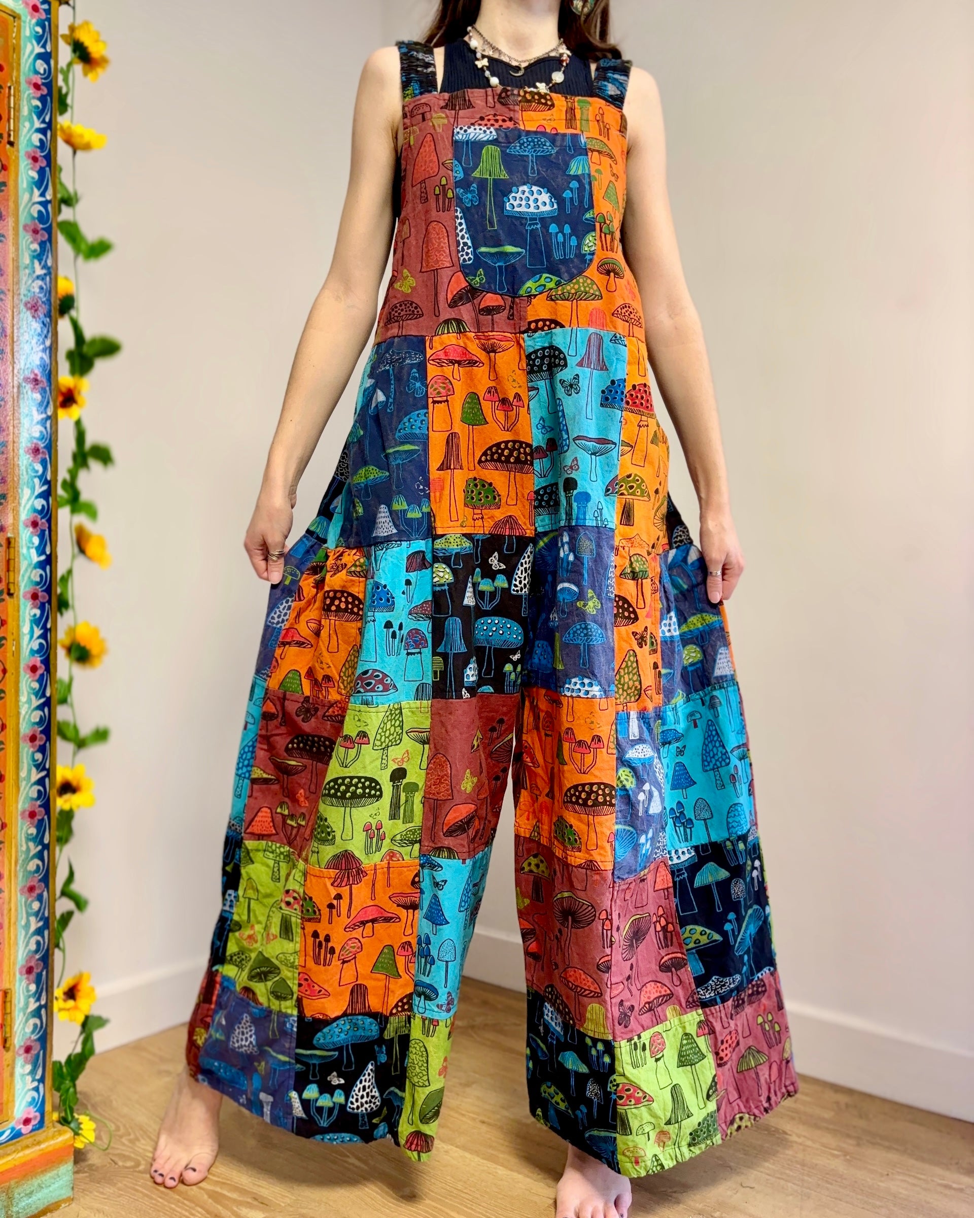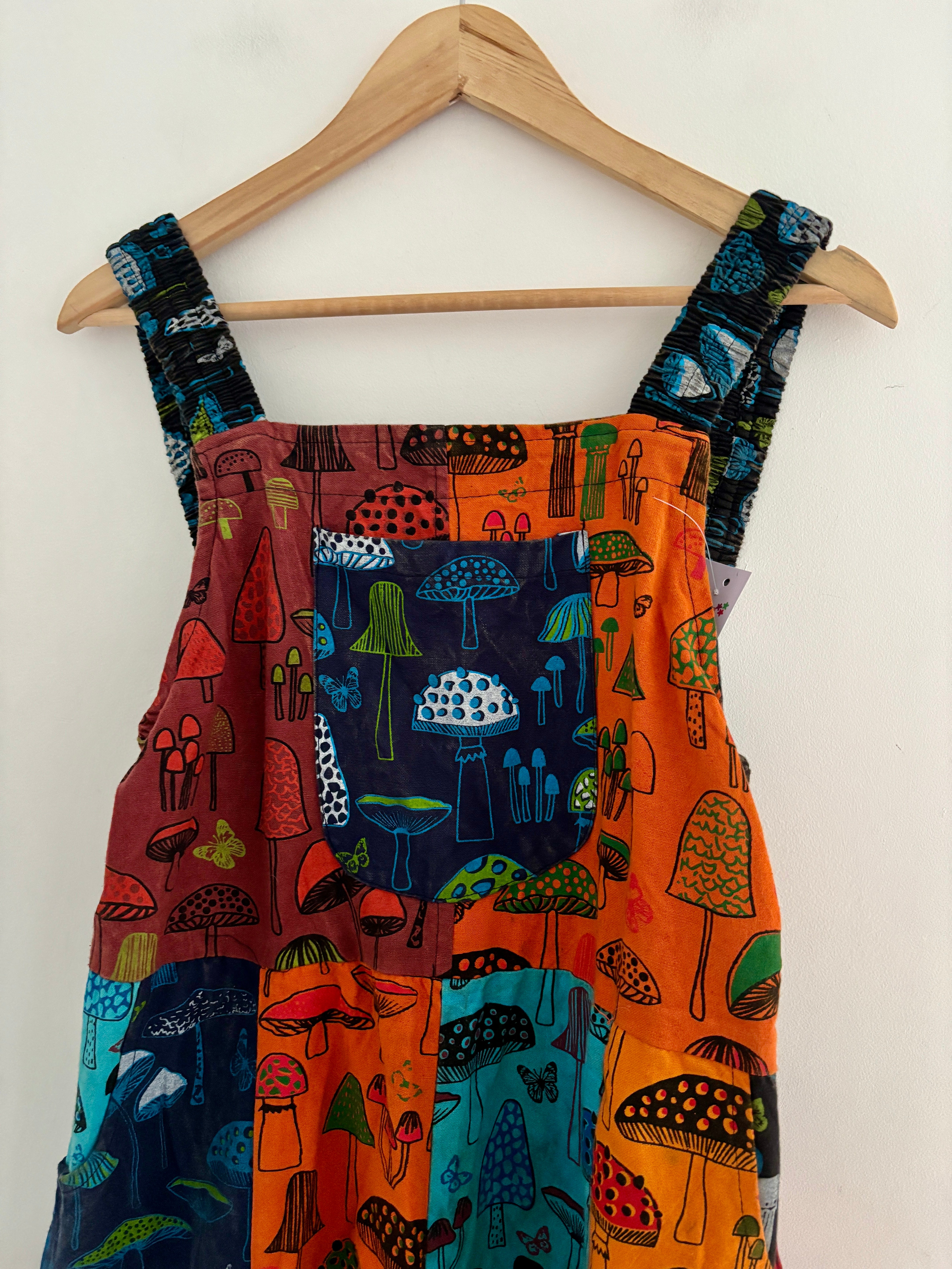 Super funky overalls made from colourful patchwork mushroom-print fabric. Made from 100% cotton, with adjustable straps, 2 side pockets and wide leg bottoms.