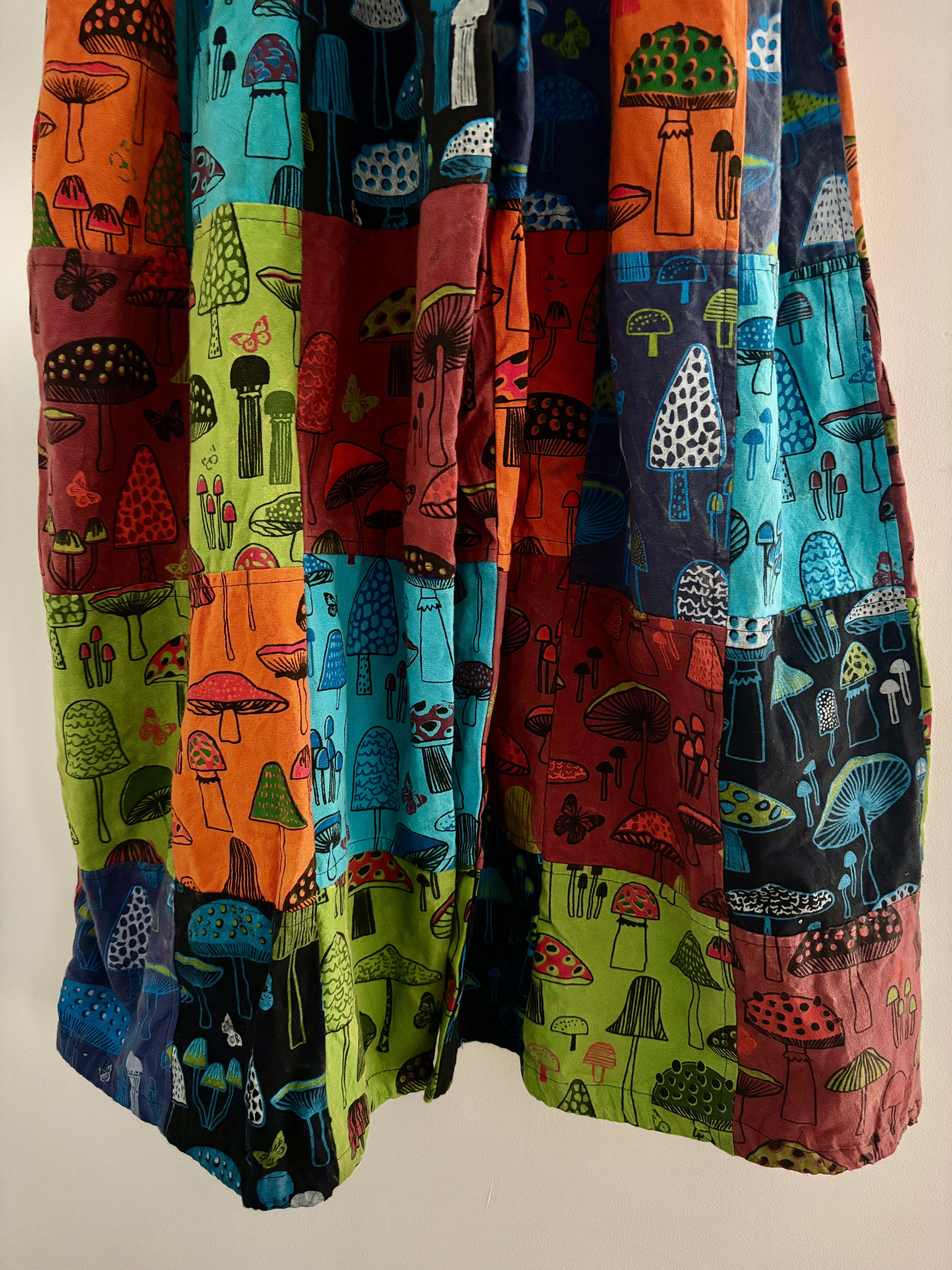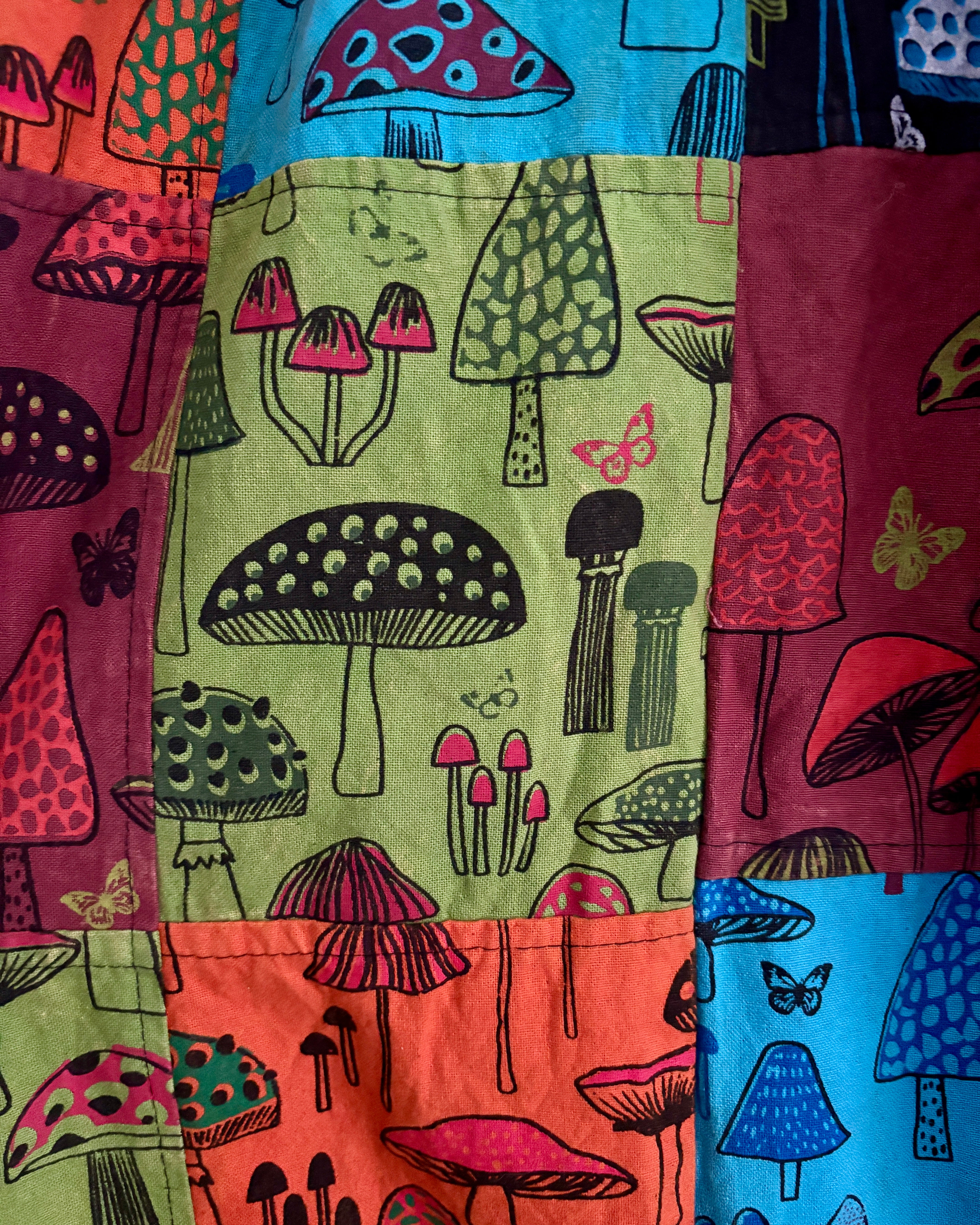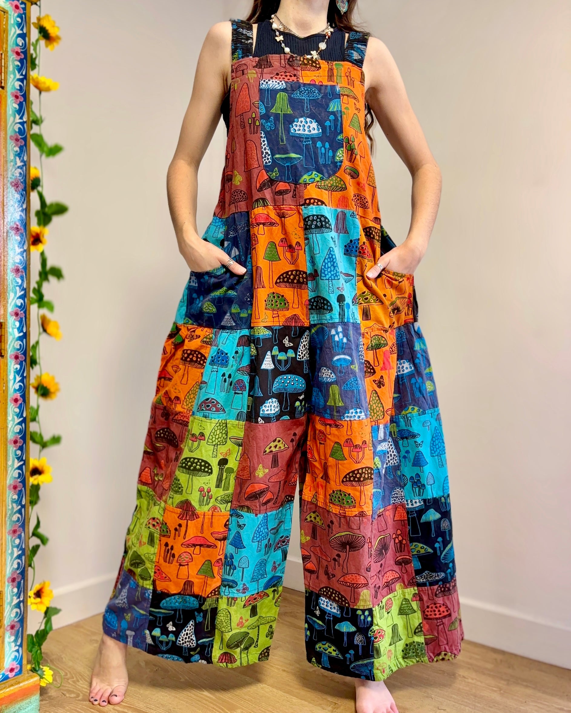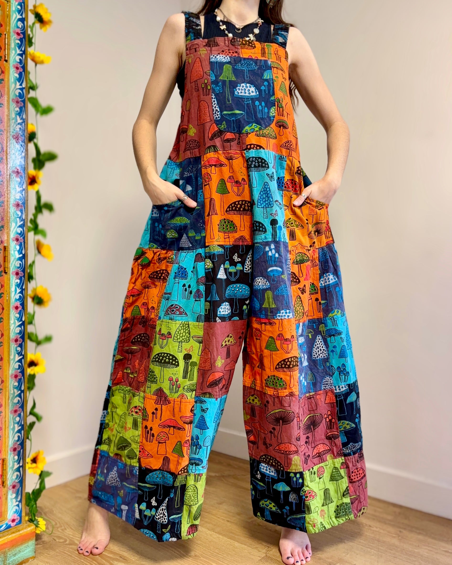 Super funky overalls made from colourful patchwork mushroom-print fabric. Made from 100% cotton, with adjustable straps, 2 side pockets and wide leg bottoms.