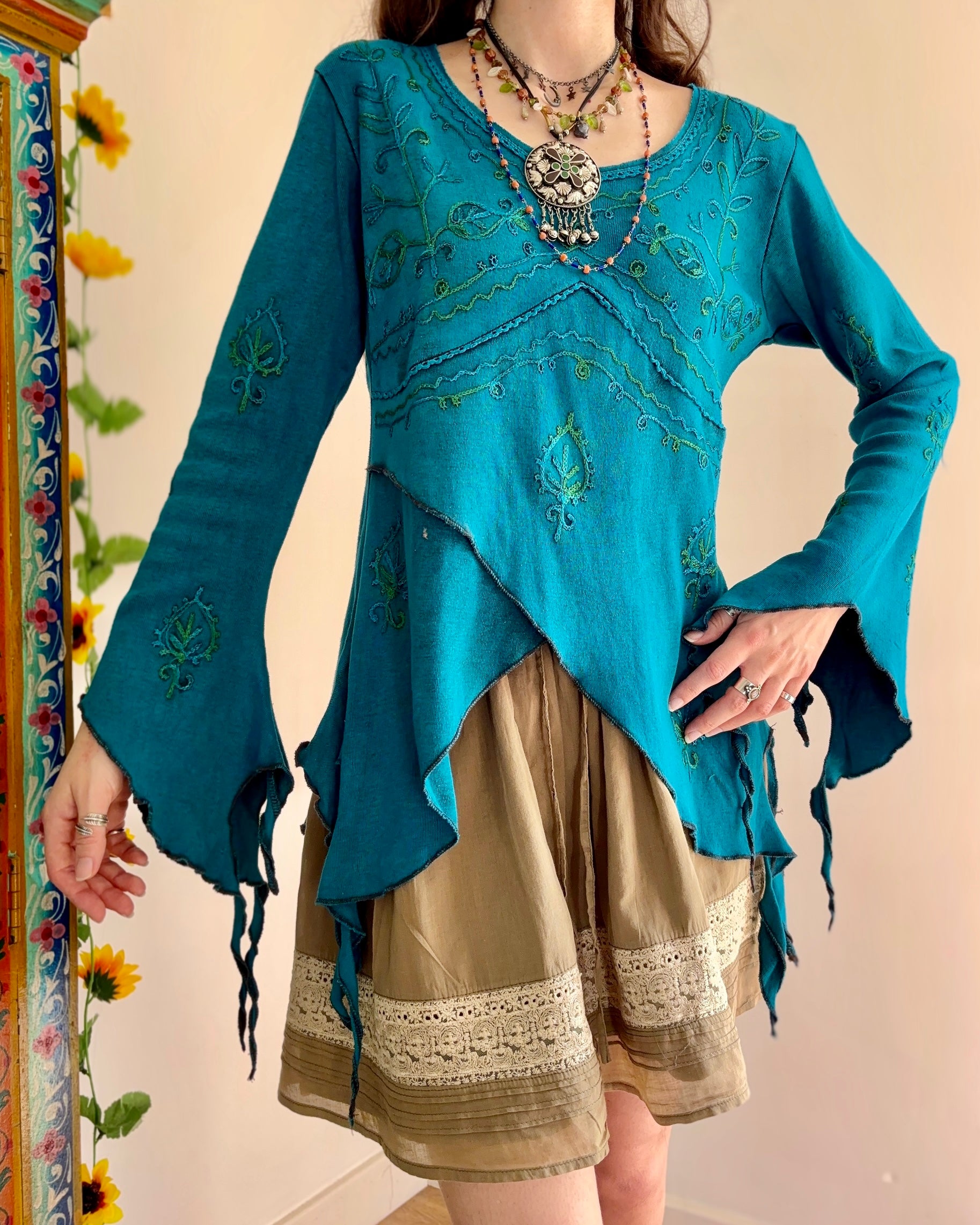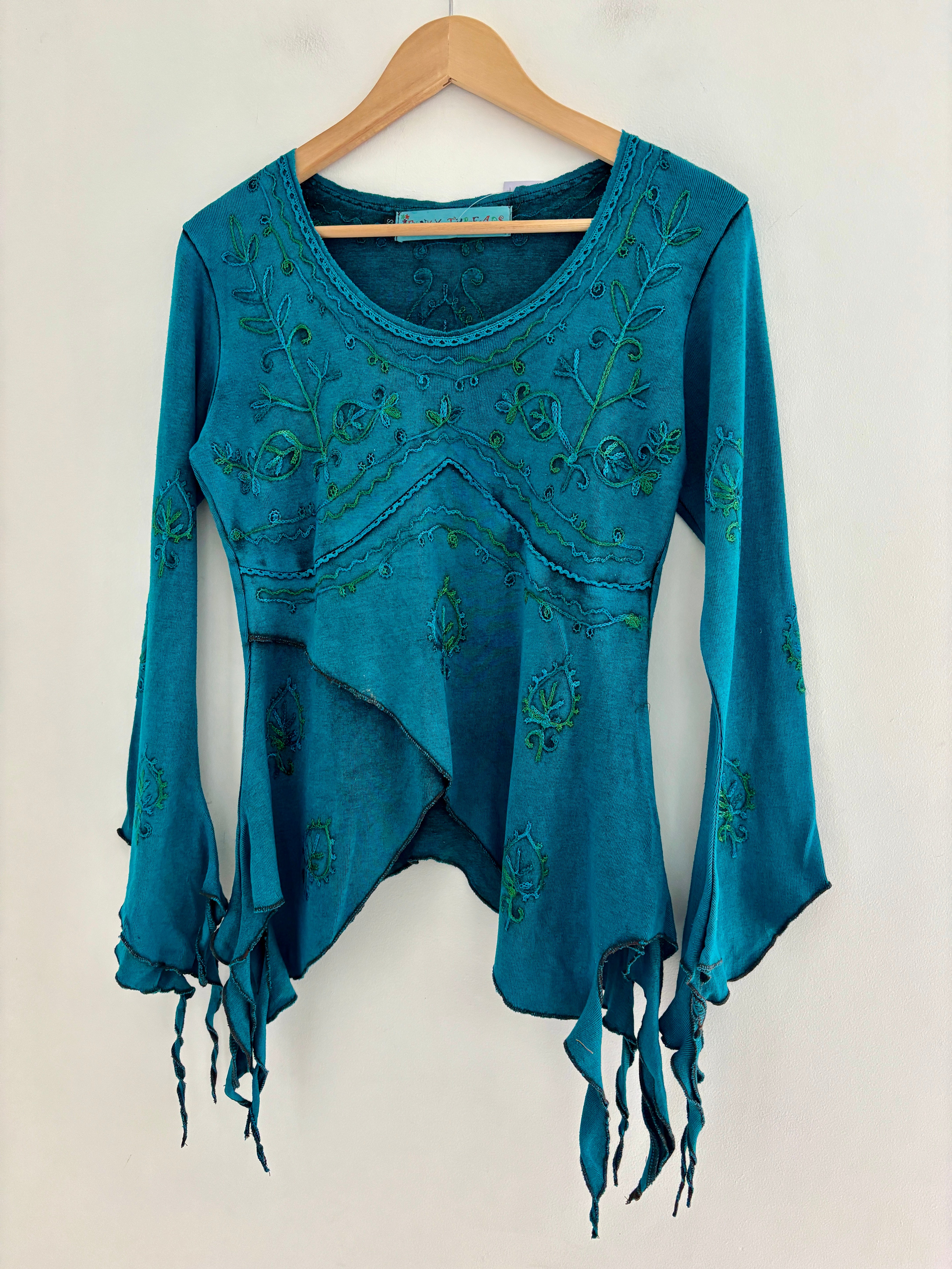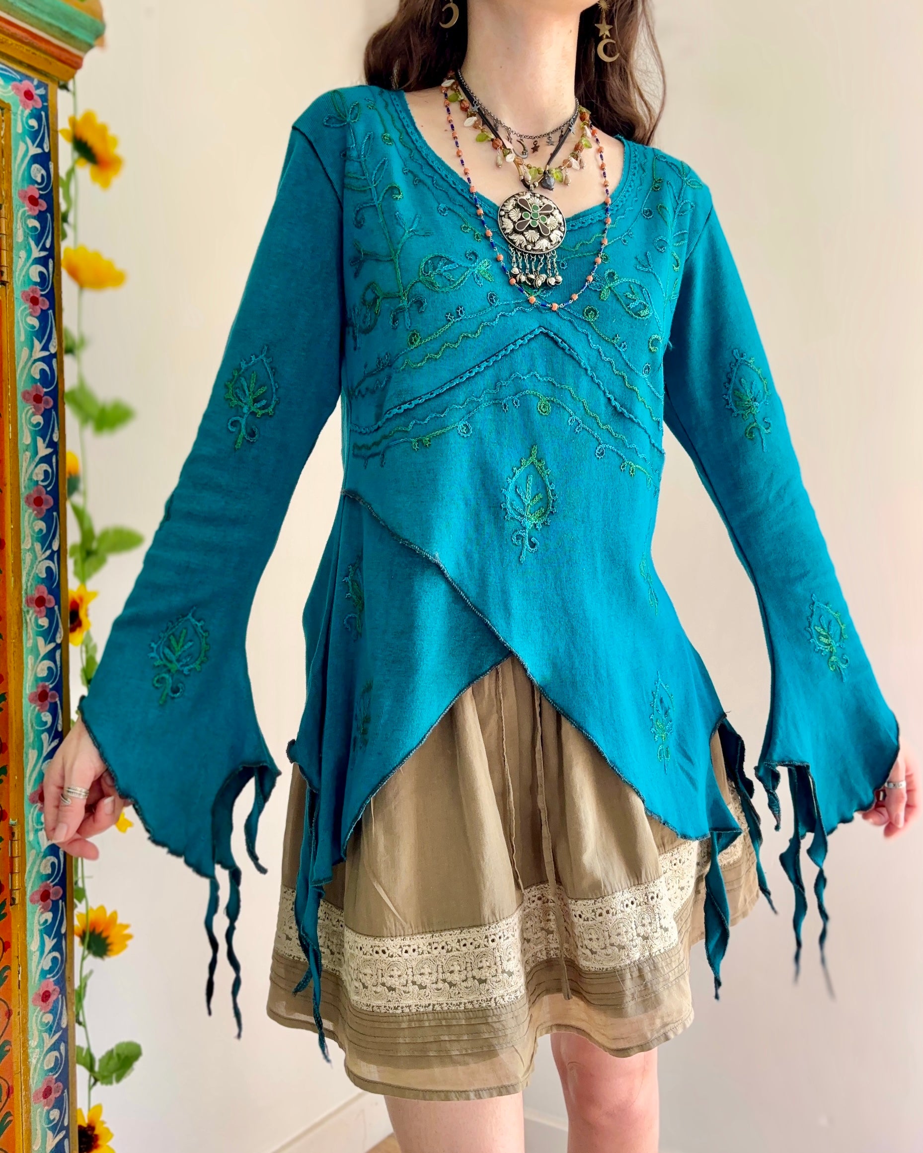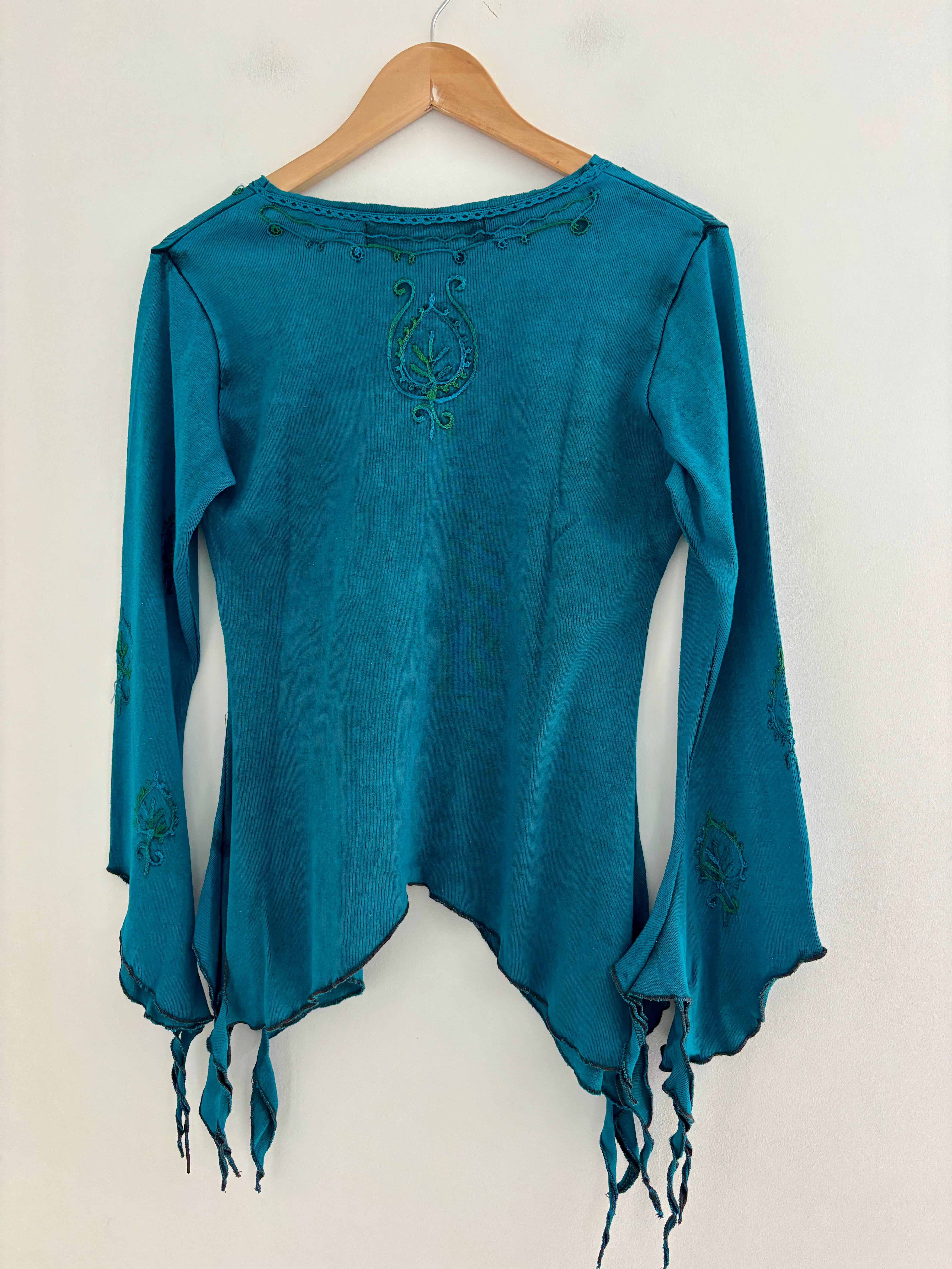 These beautiful long-sleeve tops are made from purple fabric, featuring embroidery and pointed sleeves to give a whimsical fairy look.