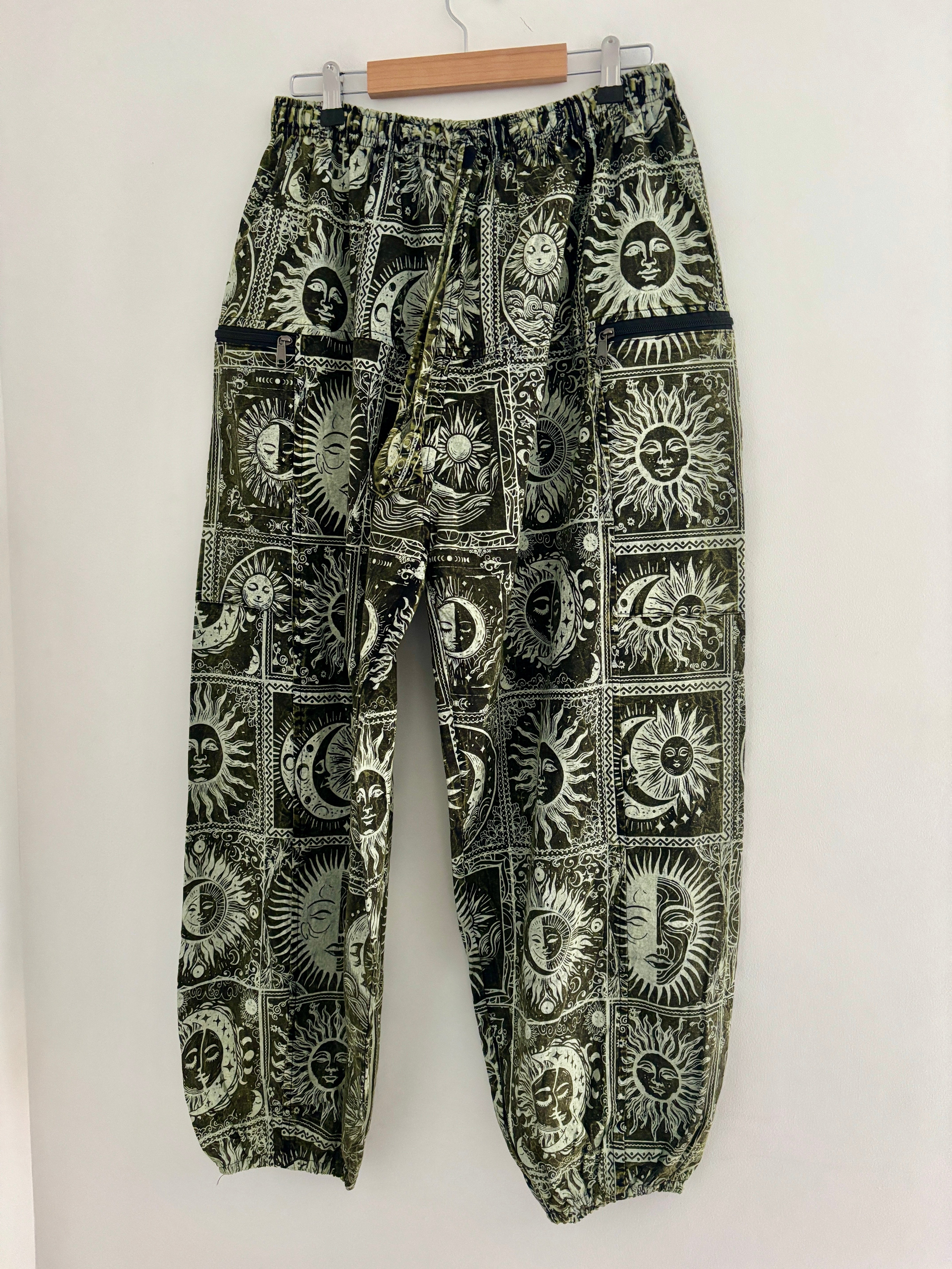 These magical palazzo harems are made from celestial fabric, decorated with moons, suns and stars. They have an elasticated waist and two zipped front pockets.