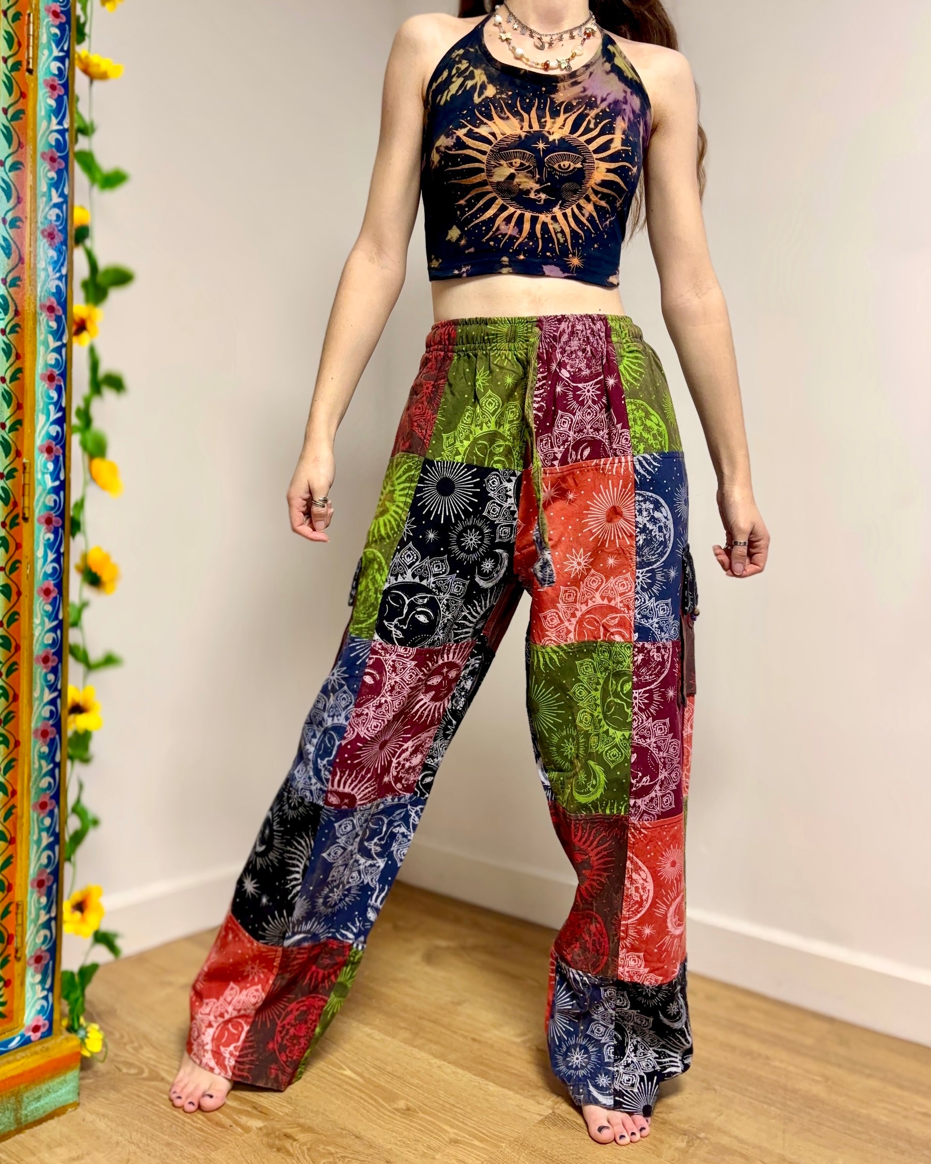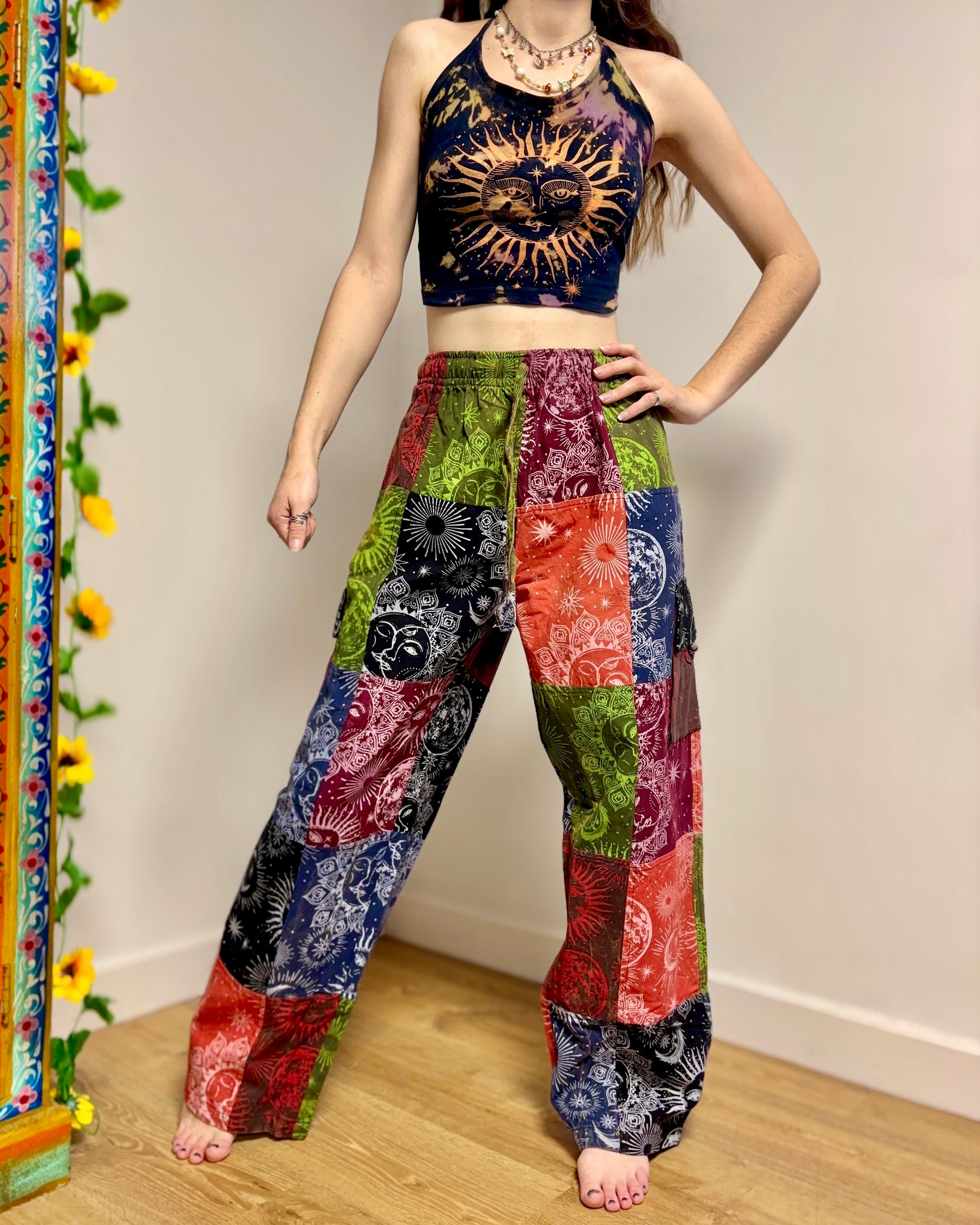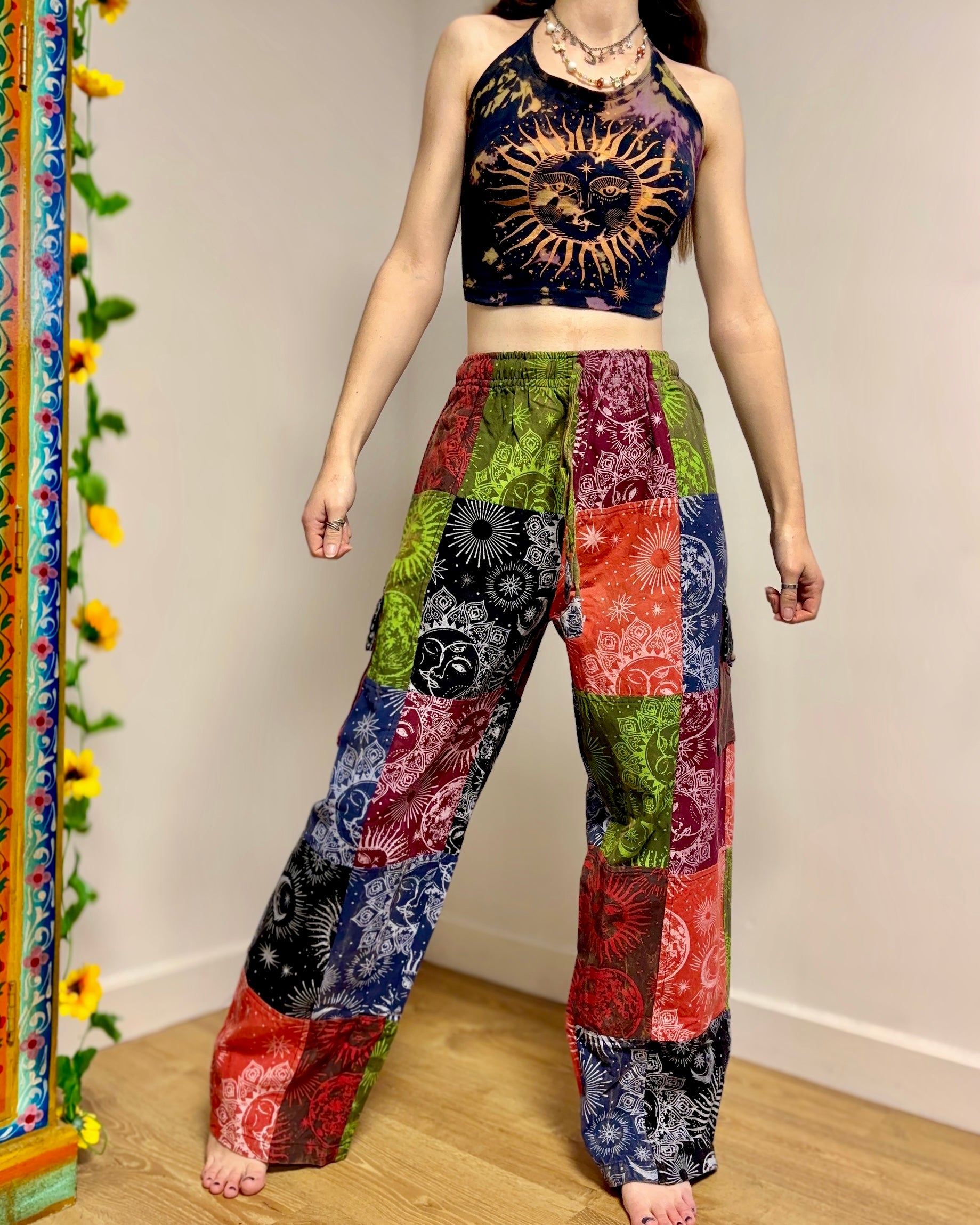 Celestial patchwork trousers, featuring fabric decorated with magical suns, moons and stars. Made from 100% cotton with 2 front pockets and an elastic waist.