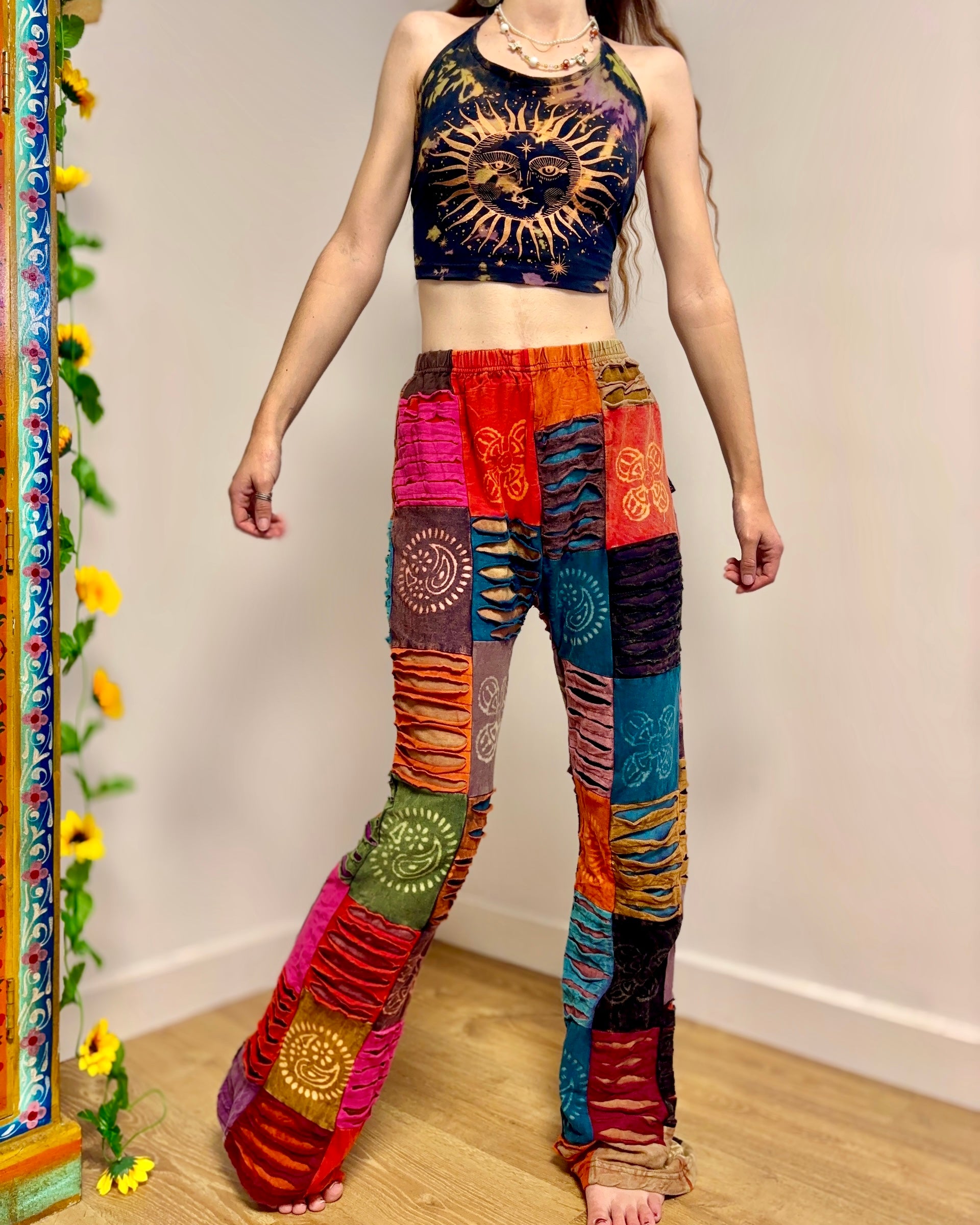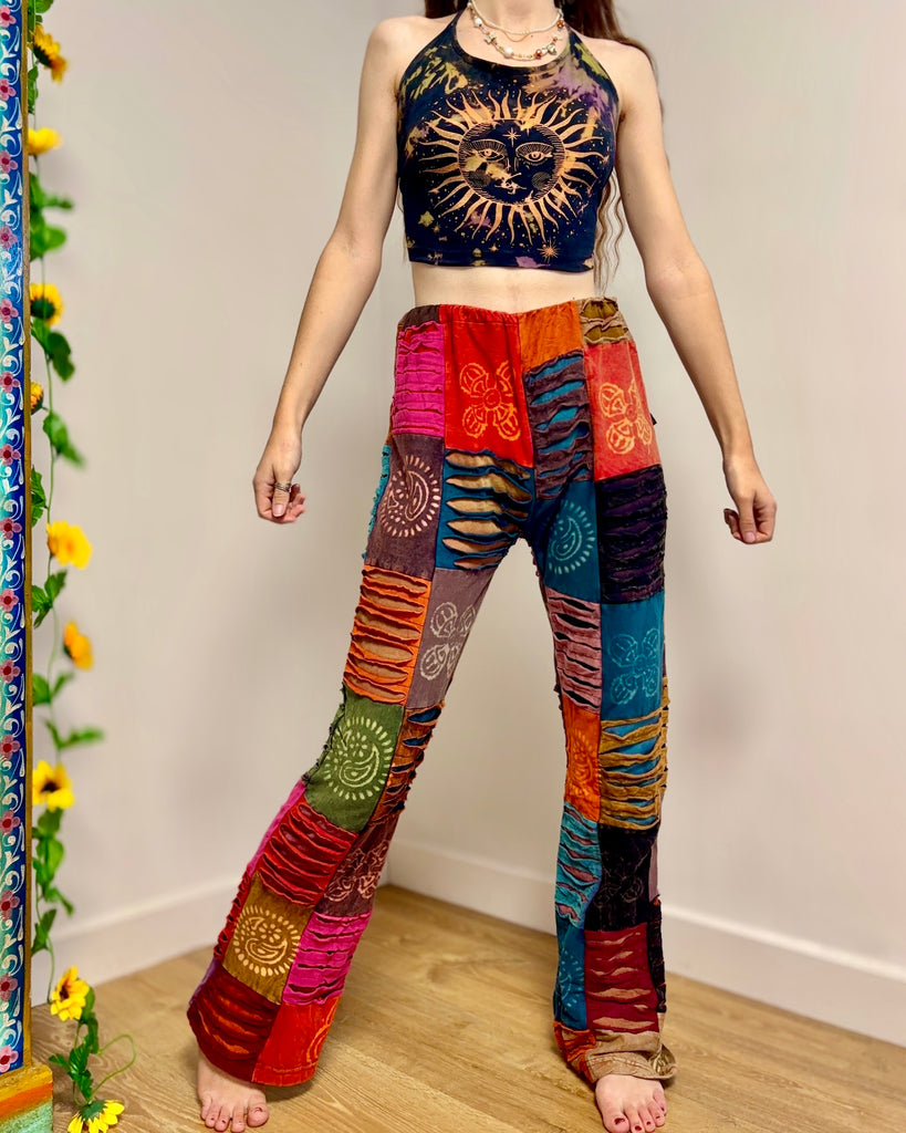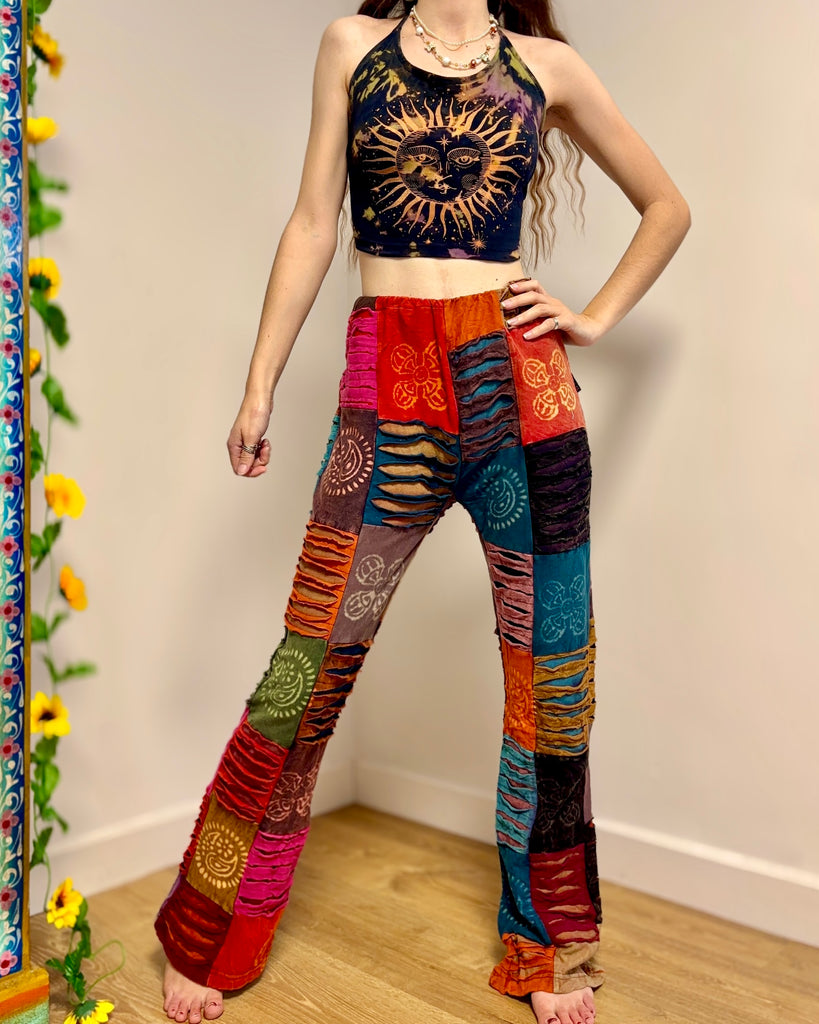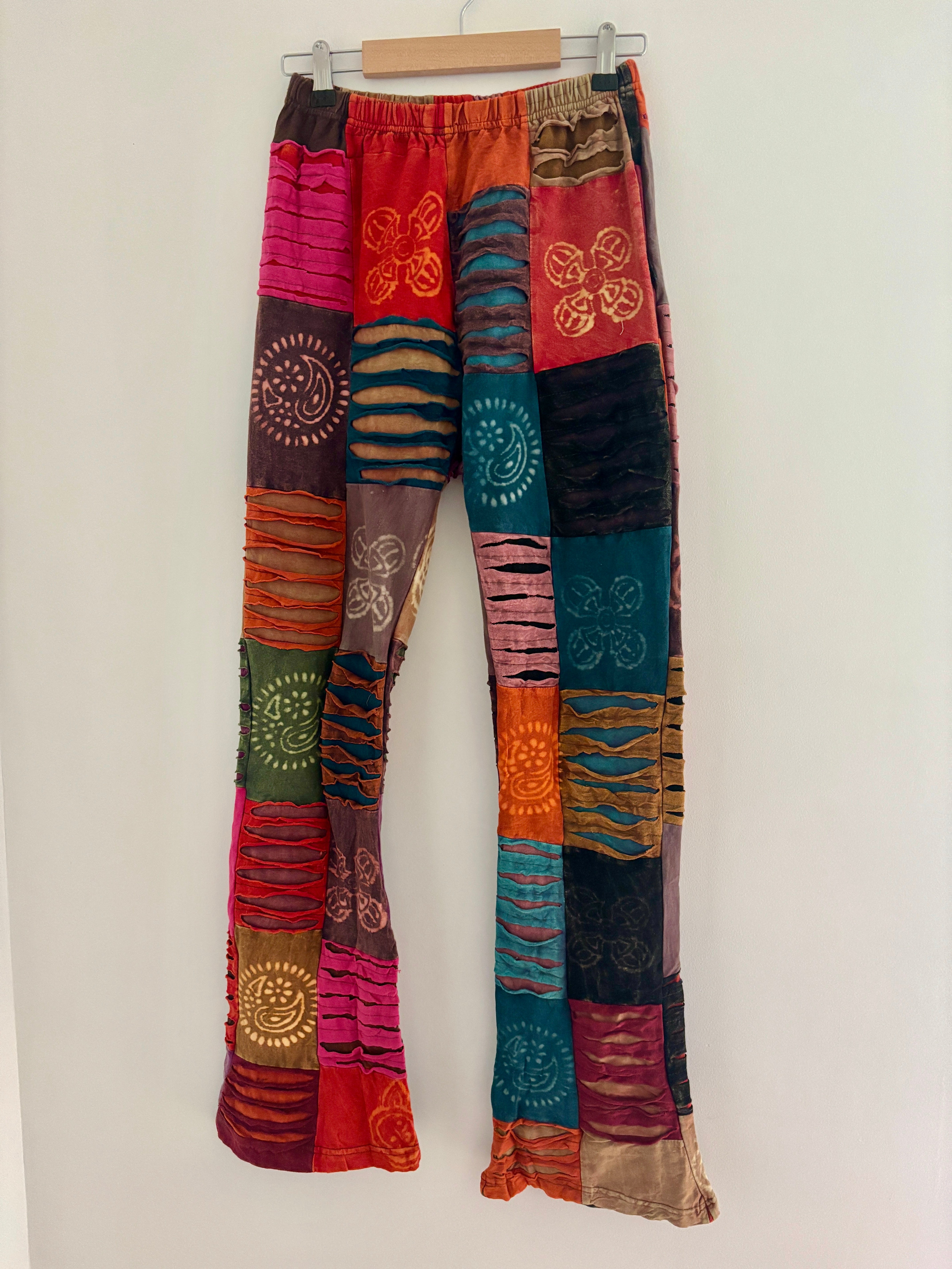 These hippie flares are made from patches of fabric in ripped designs decorated with block print symbols. They have an elasticated waist and two front pockets.