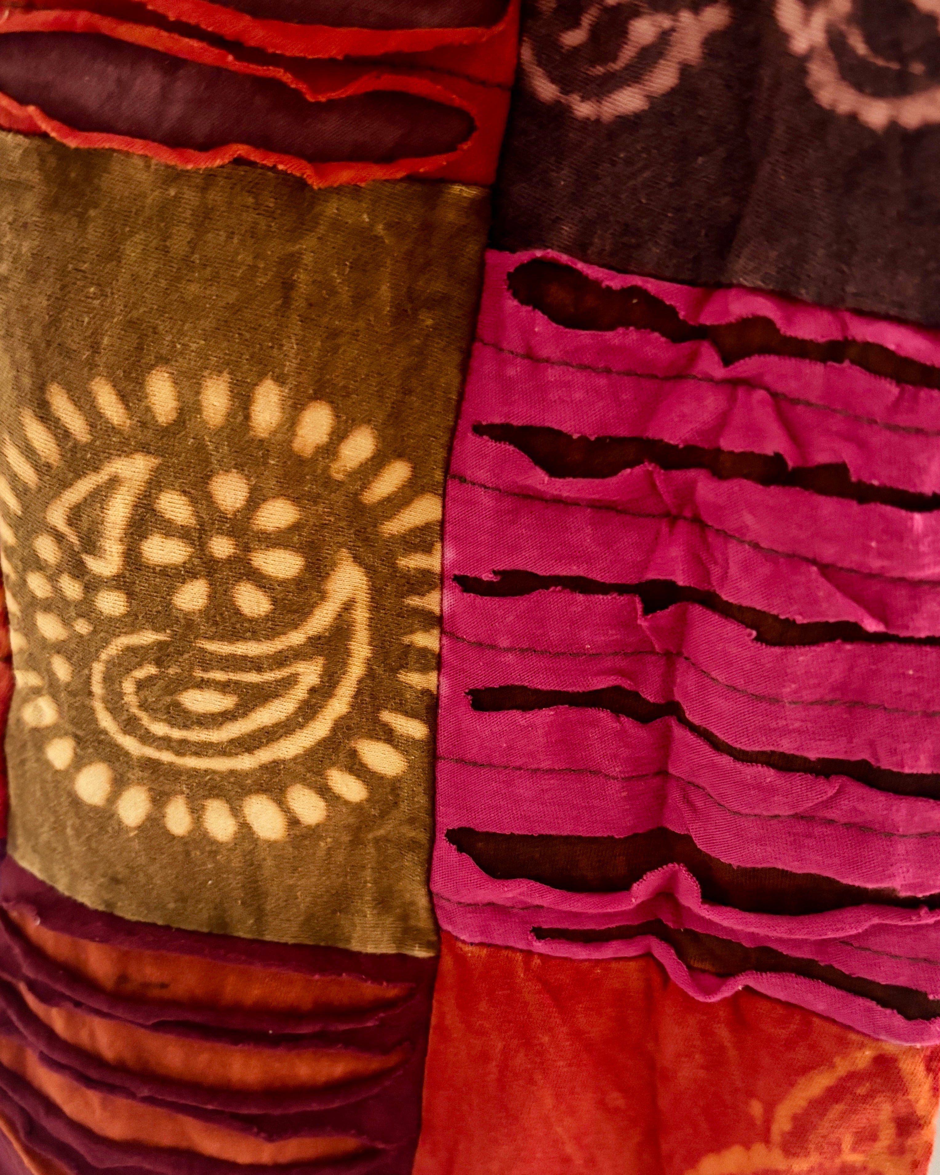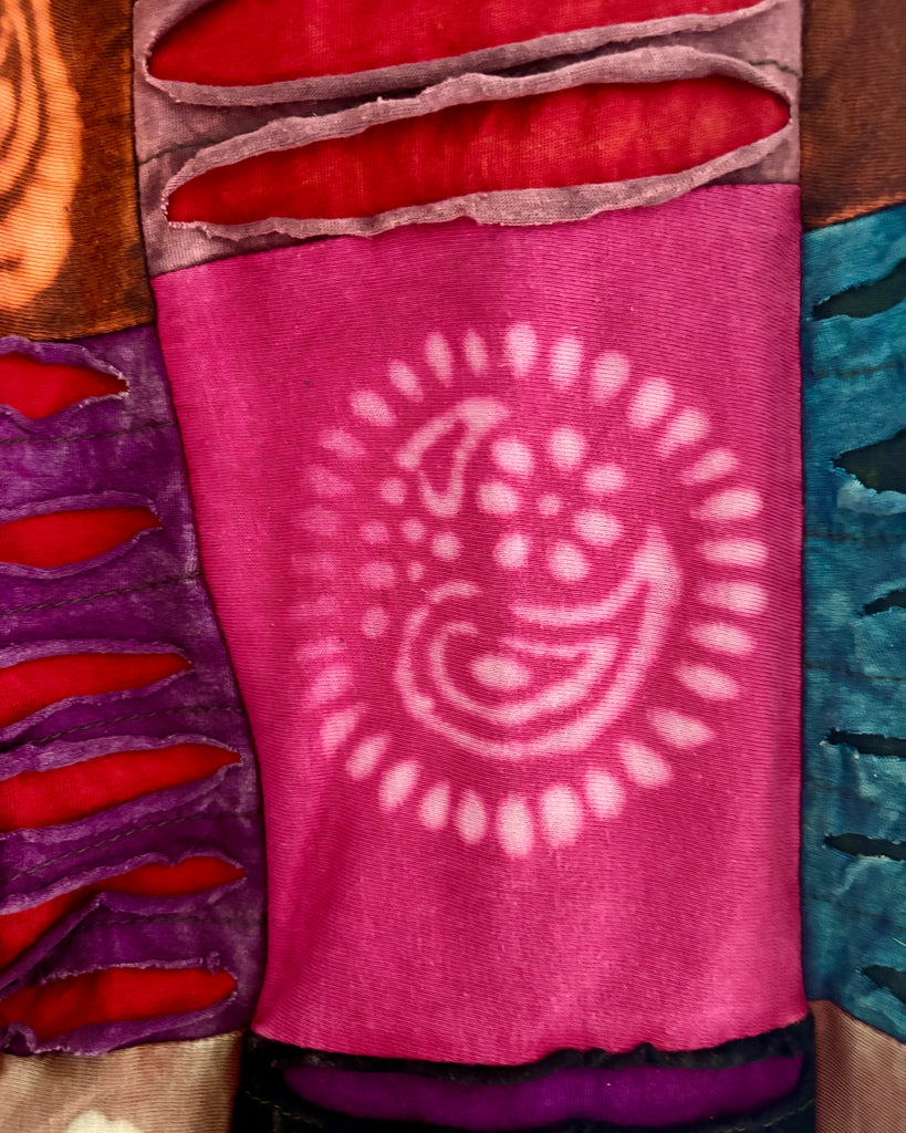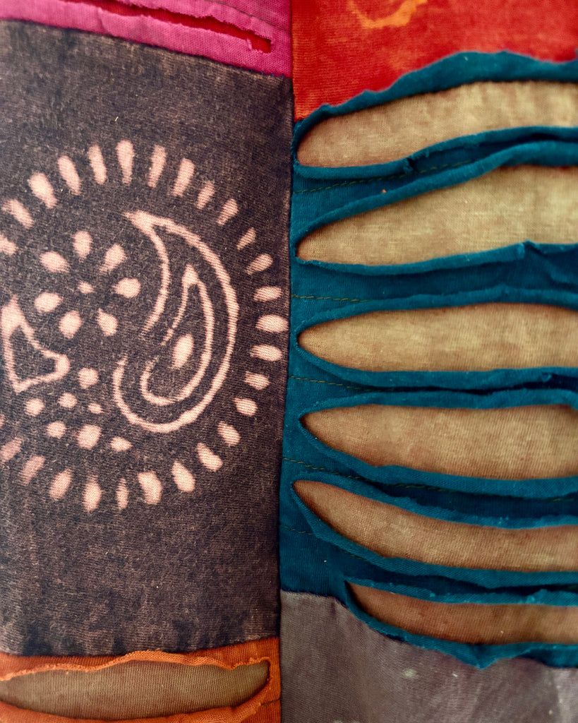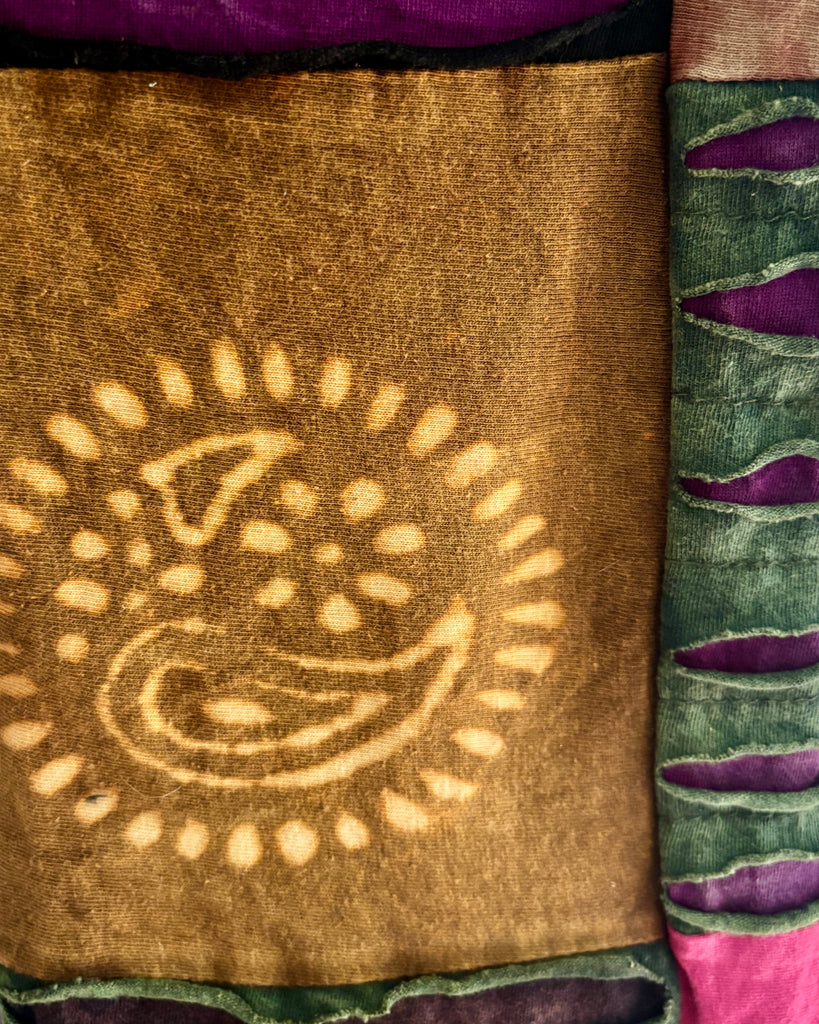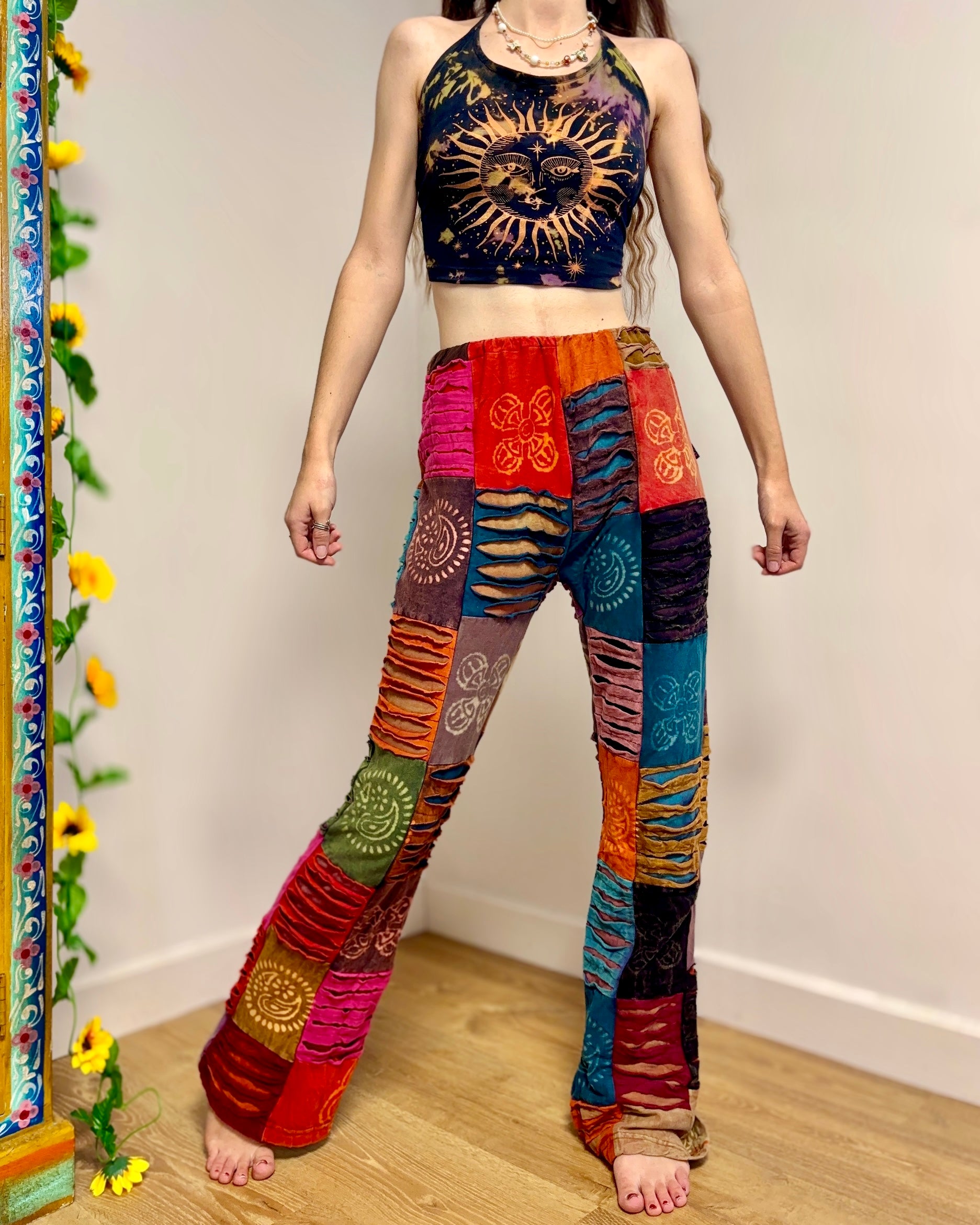 These hippie flares are made from patches of fabric in ripped designs decorated with block print symbols. They have an elasticated waist and two front pockets.