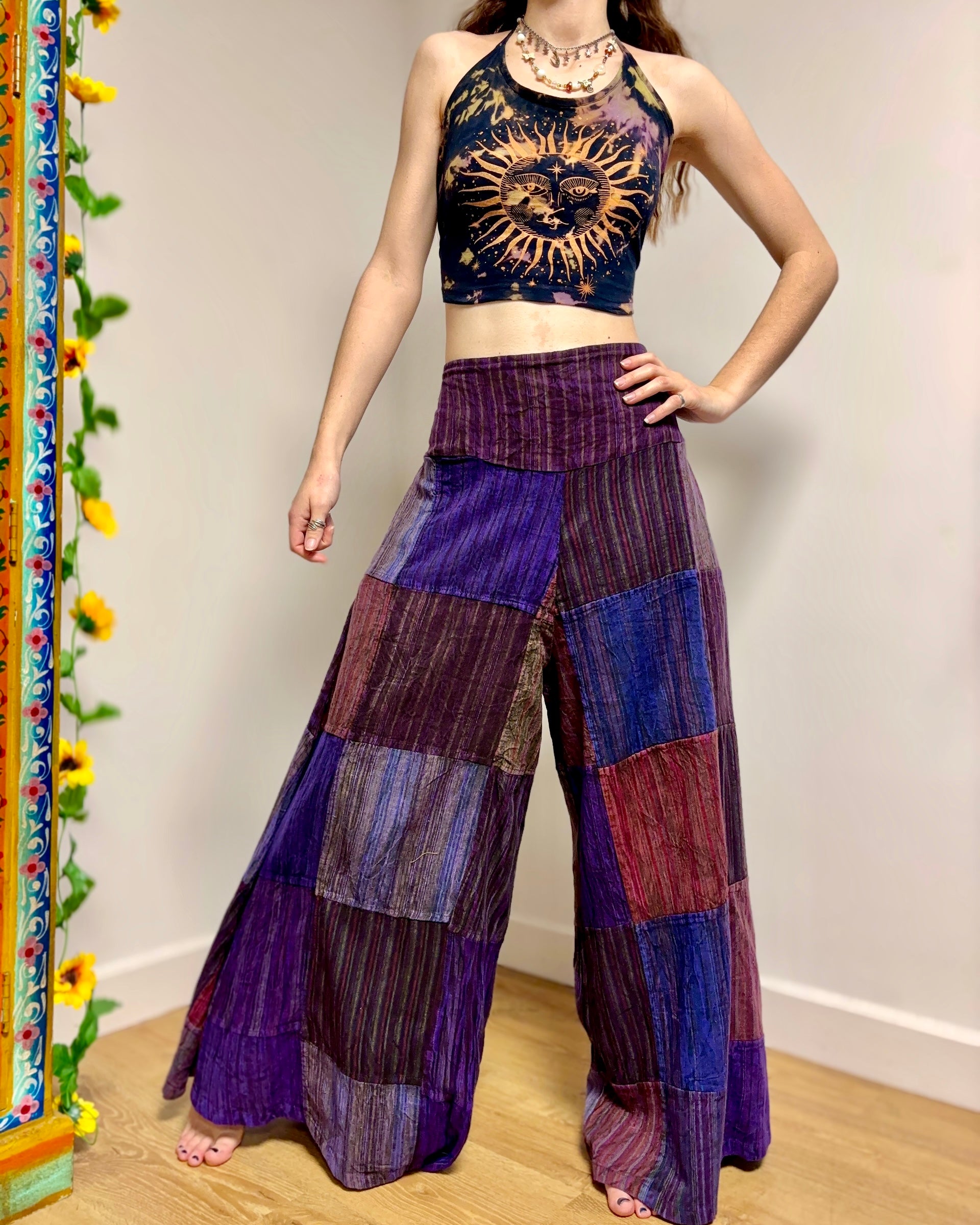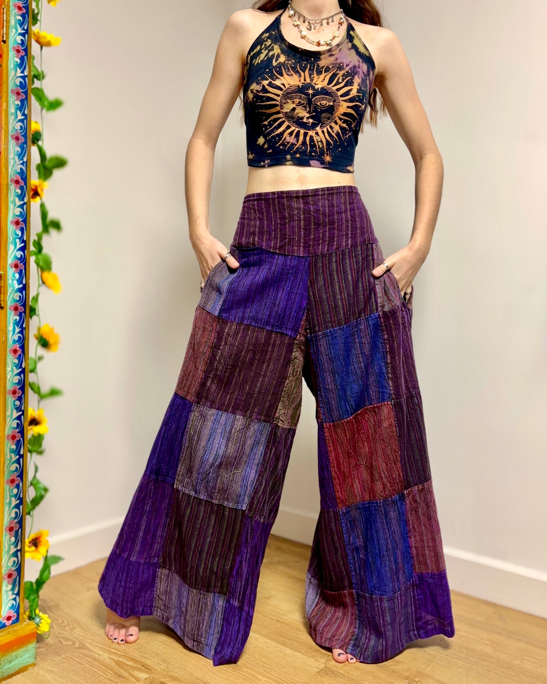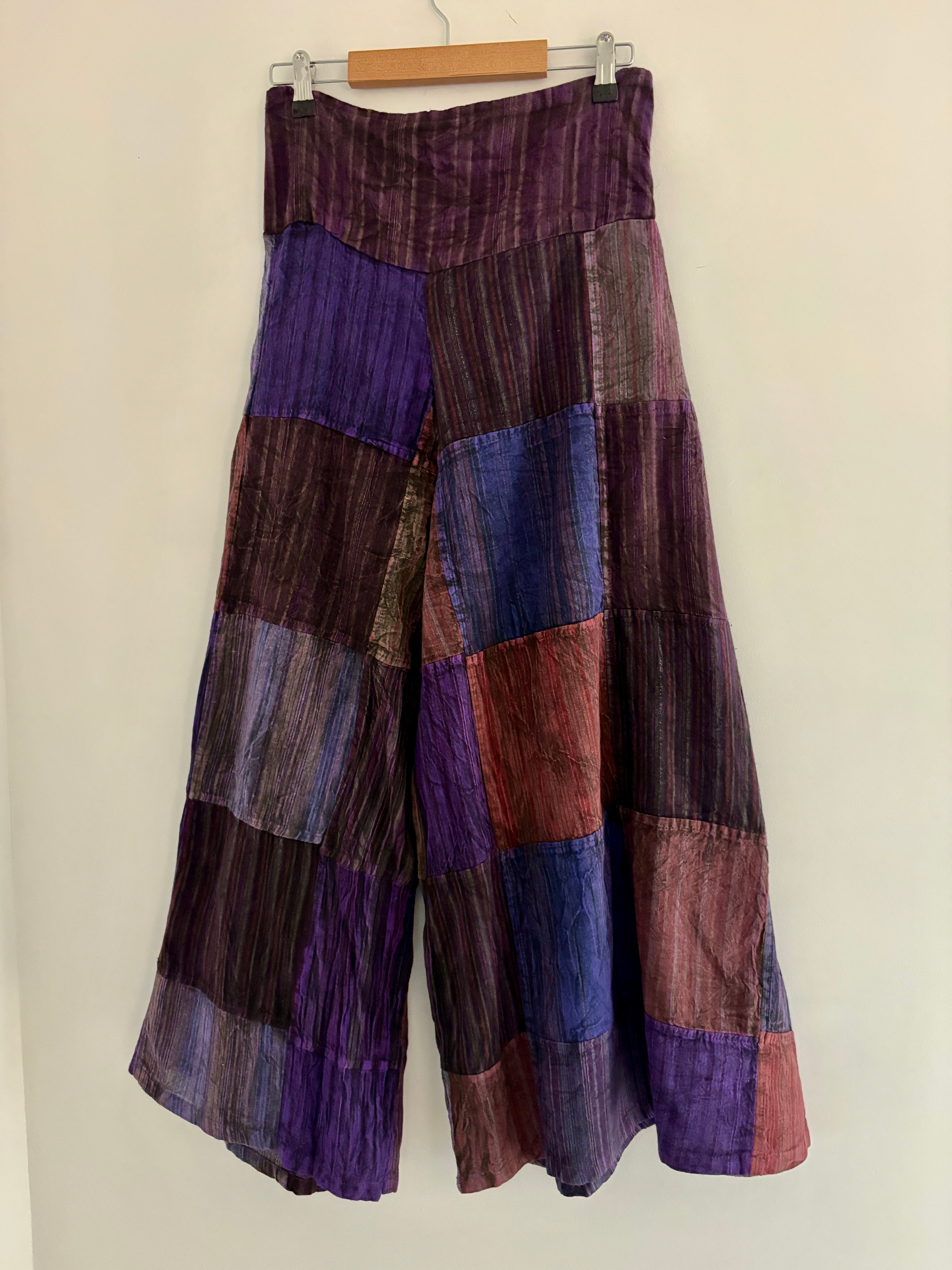 These palazzo trousers are made from patches of earthy purple 100% cotton fabric. They are lightweight and comfortable, with an elasticated waist and two front pockets.